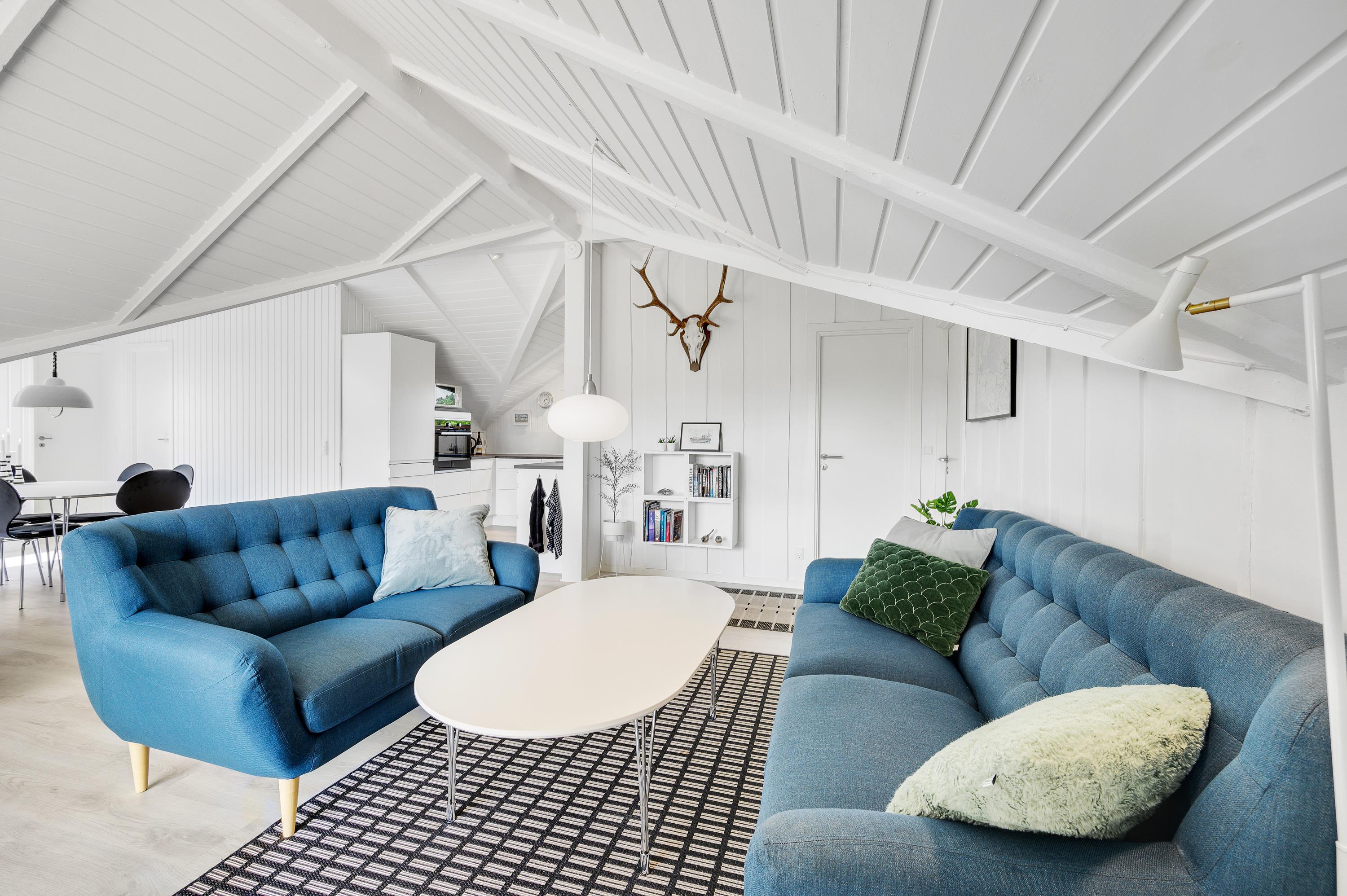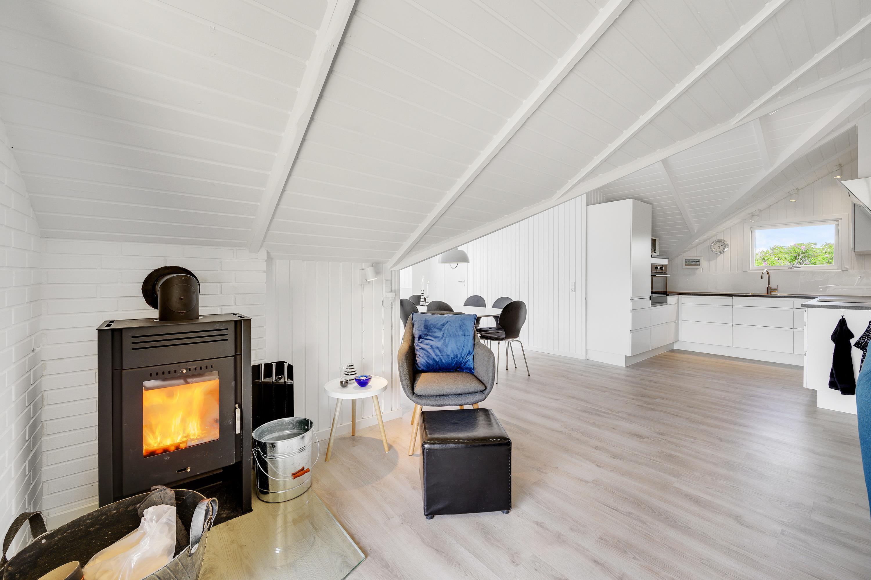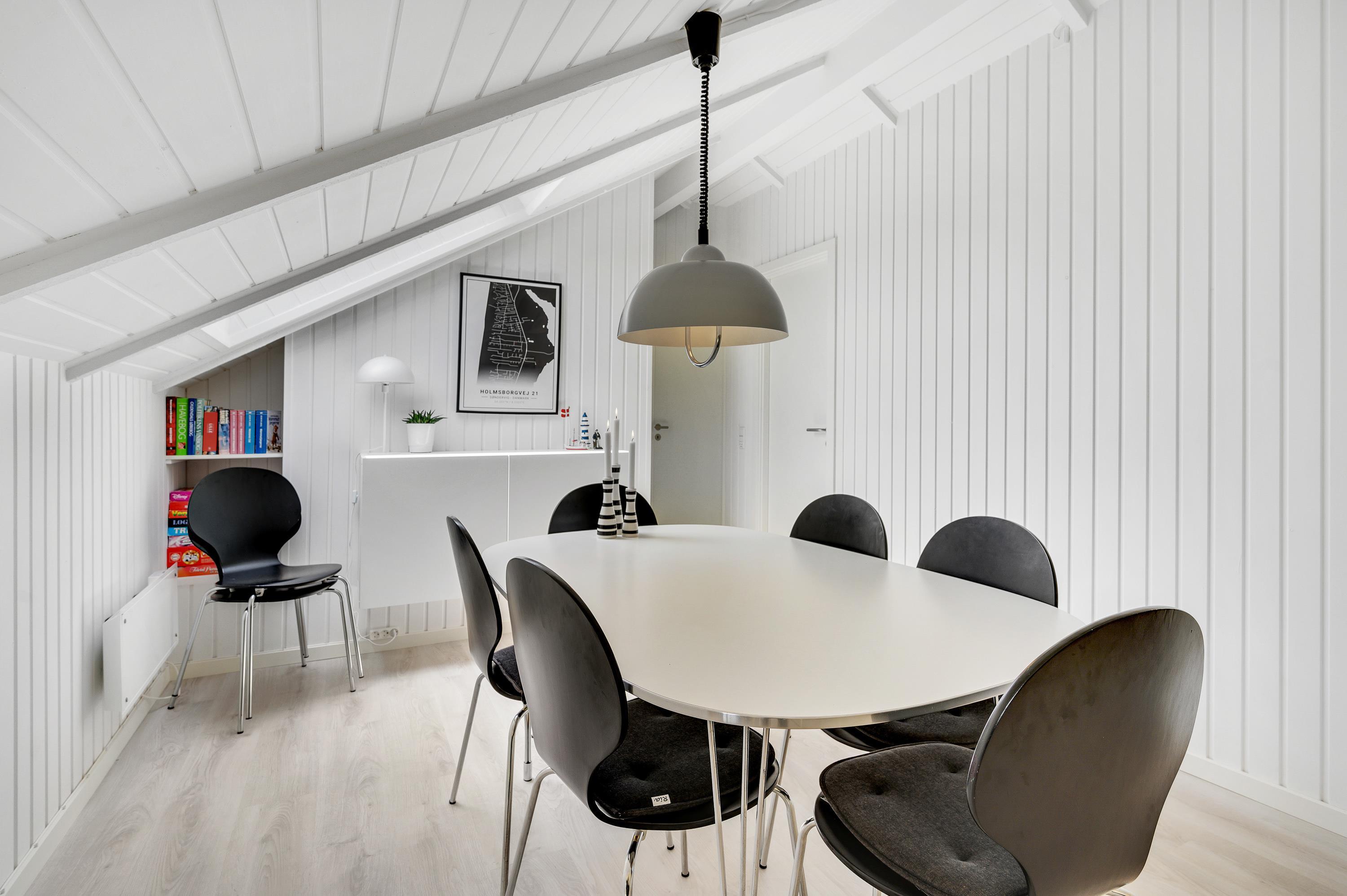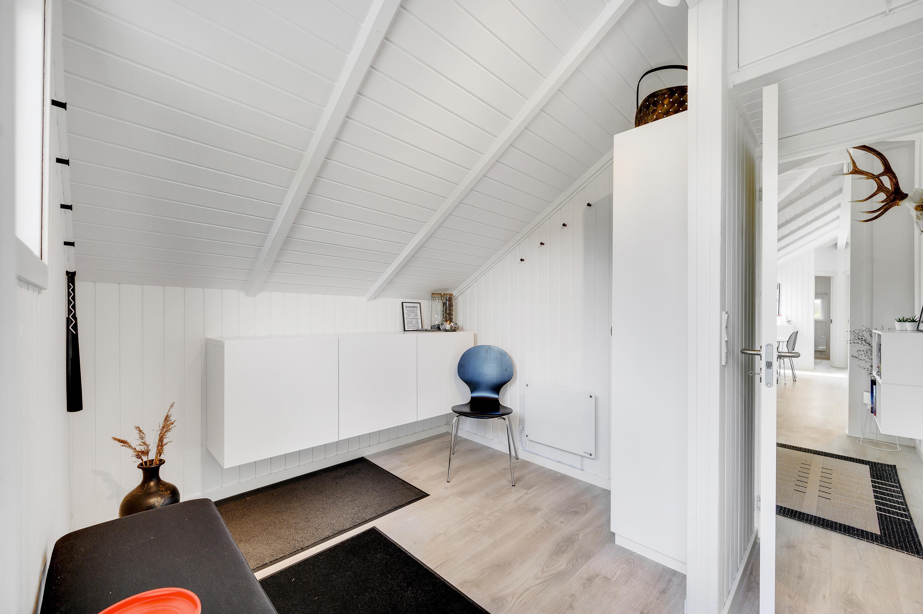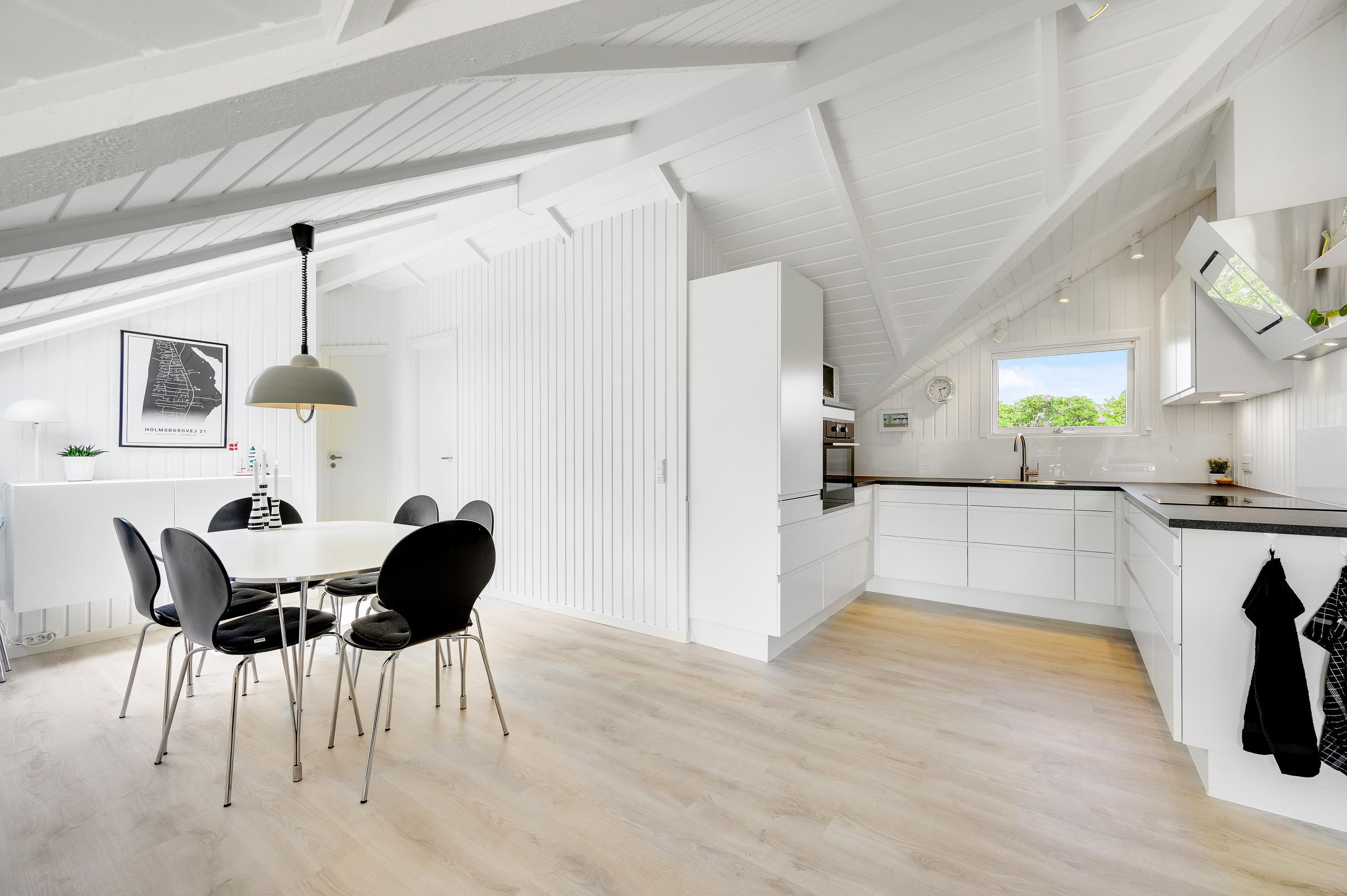 Det klassiske træhus på Holmsborgvej 21 har et komplet renoveret indre. Her er lyst og åbent, og indretningen emmer af feriestemning. Sommerhusets hjerte er alrummet, hvor stue, køkken og spiseafdeling er slået sammen til ét stort fællesrum – som med garanti kommer til at danne rammerne om masser af hyggelige ferieminder.