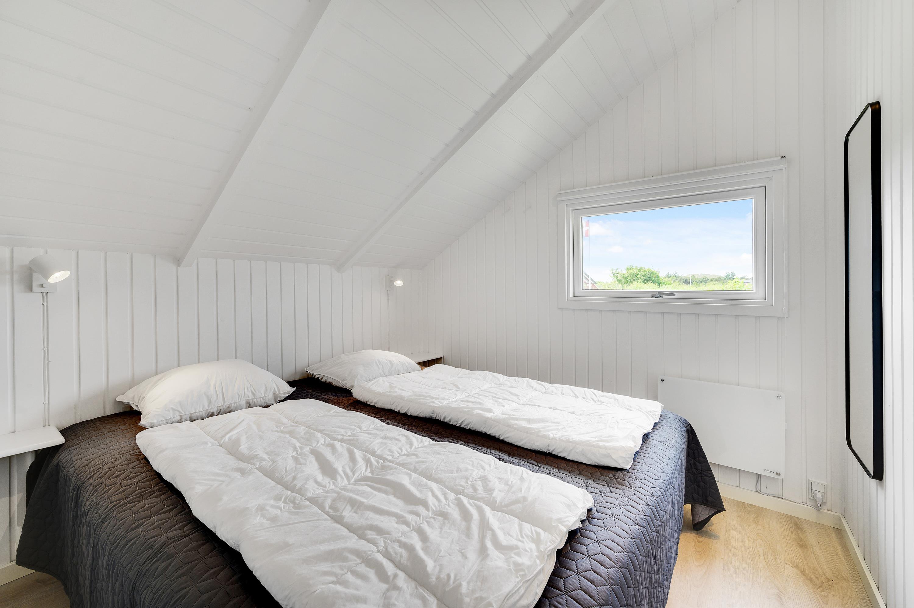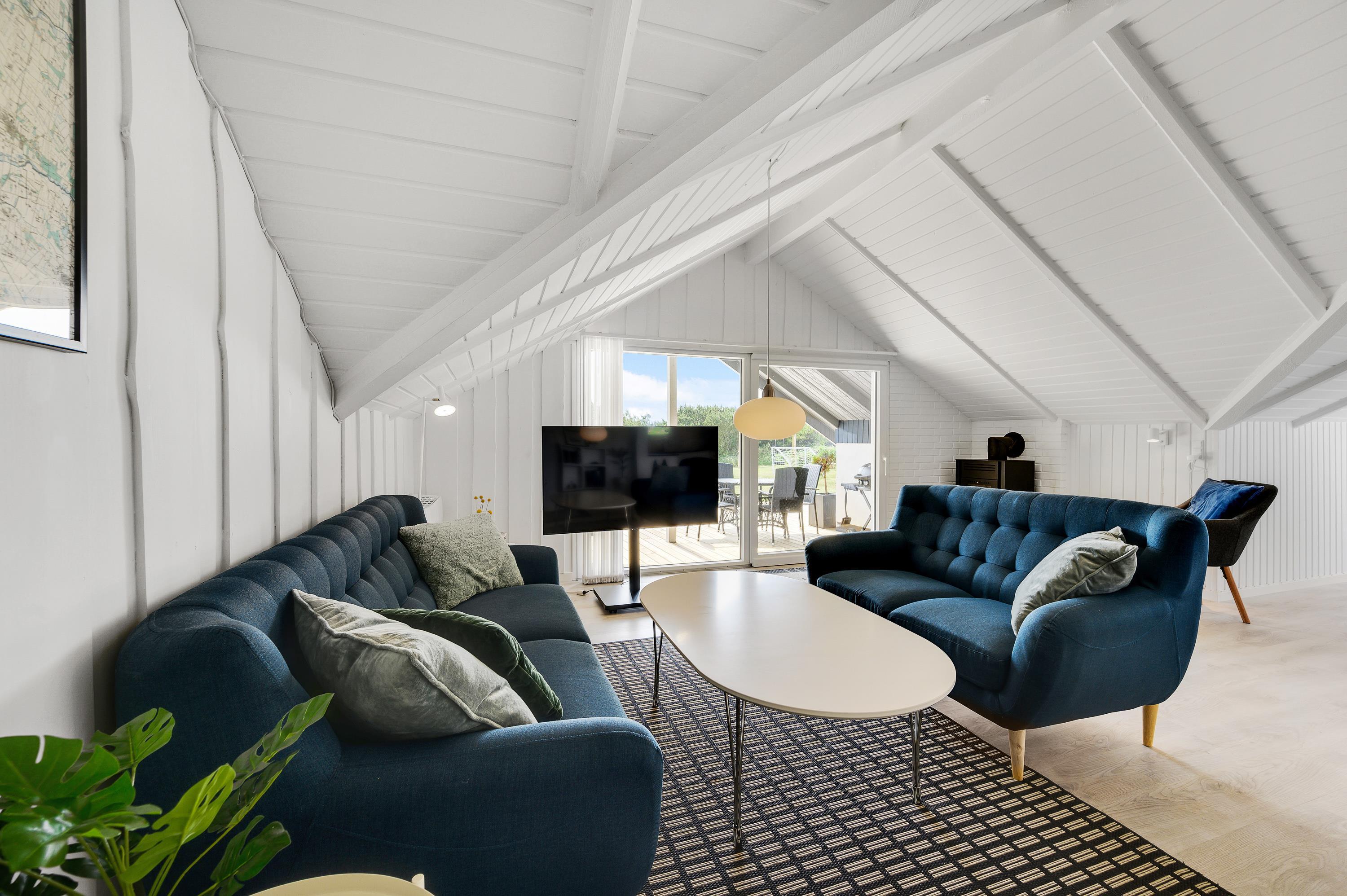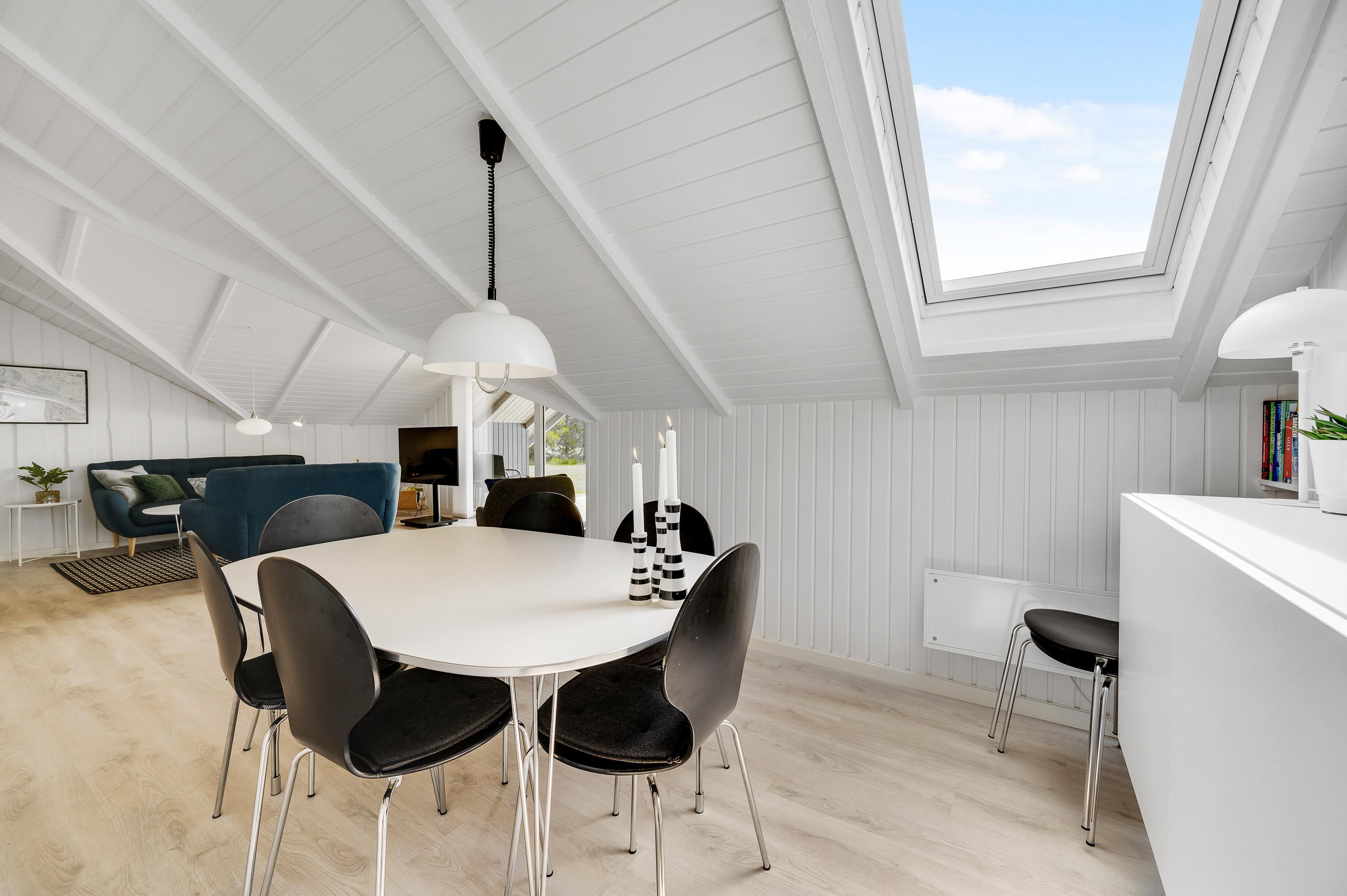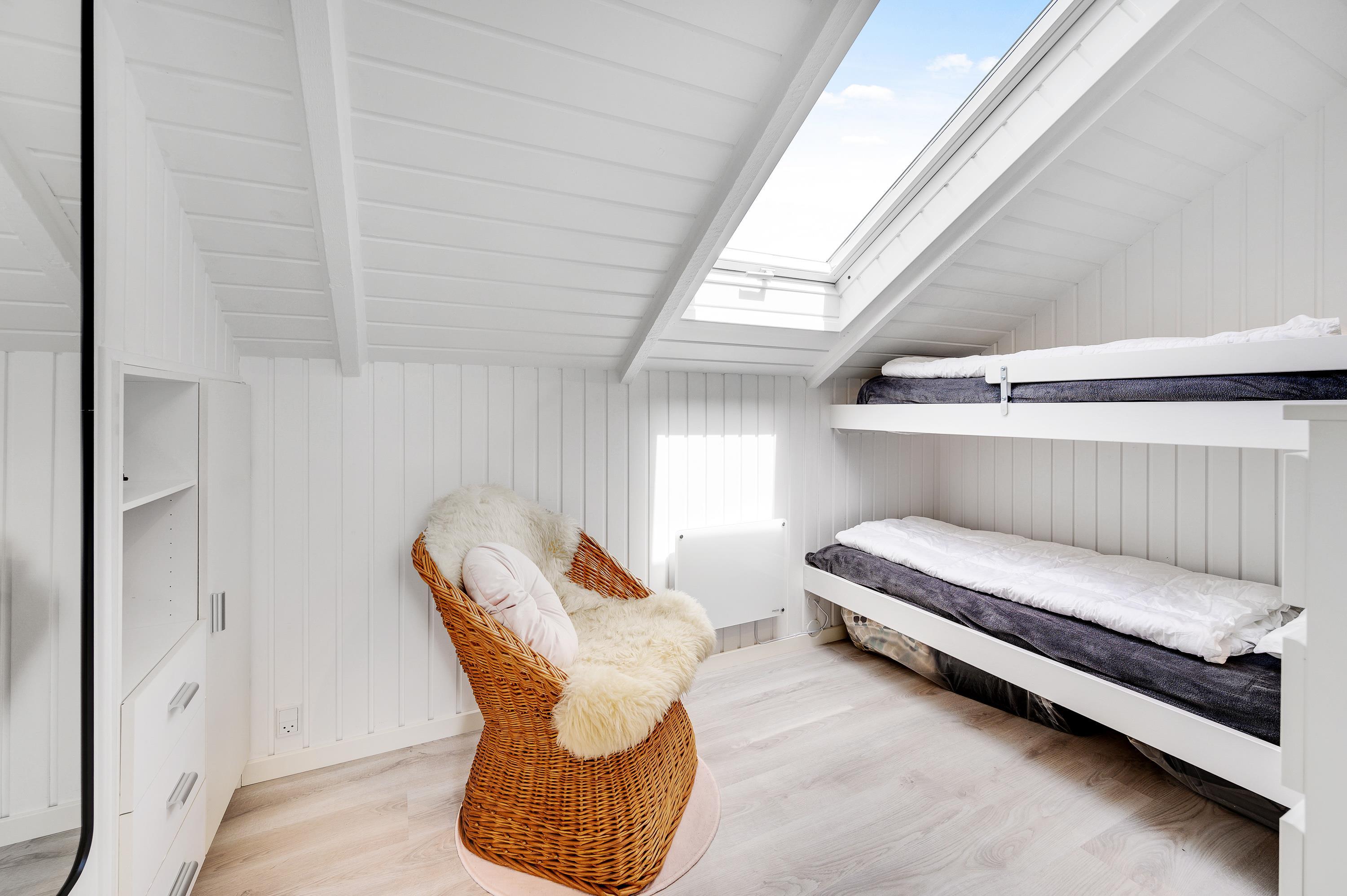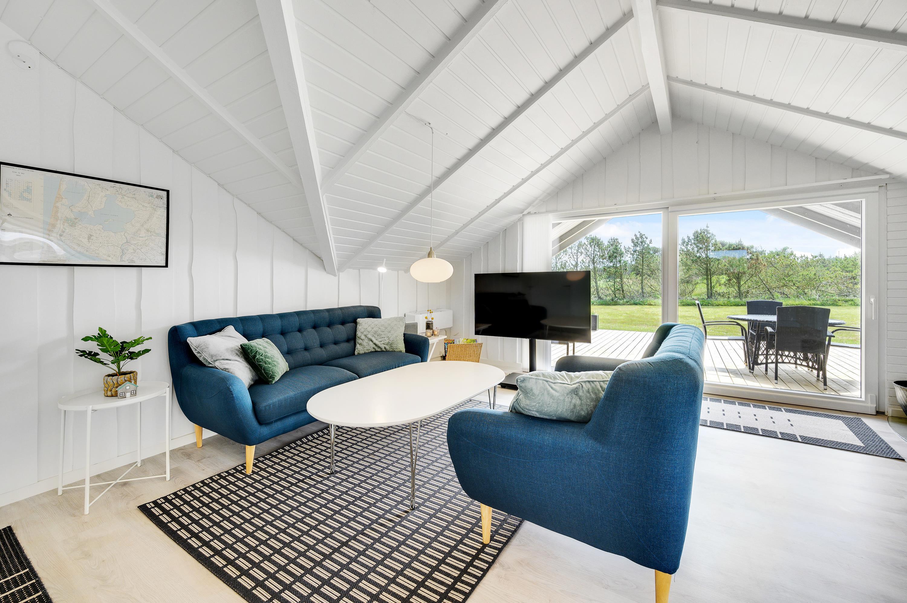 Det klassiske træhus på Holmsborgvej 21 har et komplet renoveret indre. Her er lyst og åbent, og indretningen emmer af feriestemning. Sommerhusets hjerte er alrummet, hvor stue, køkken og spiseafdeling er slået sammen til ét stort fællesrum – som med garanti kommer til at danne rammerne om masser af hyggelige ferieminder.