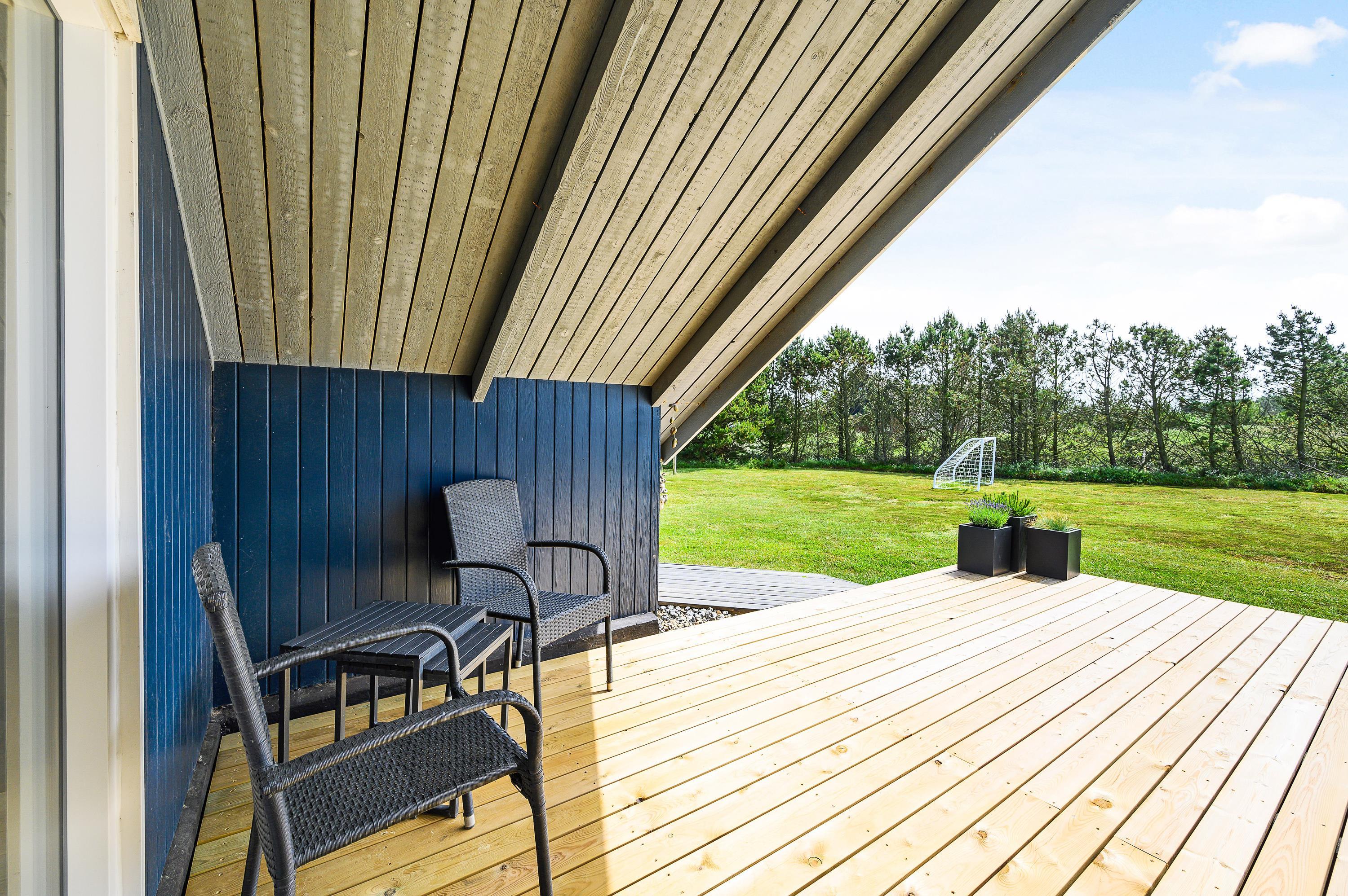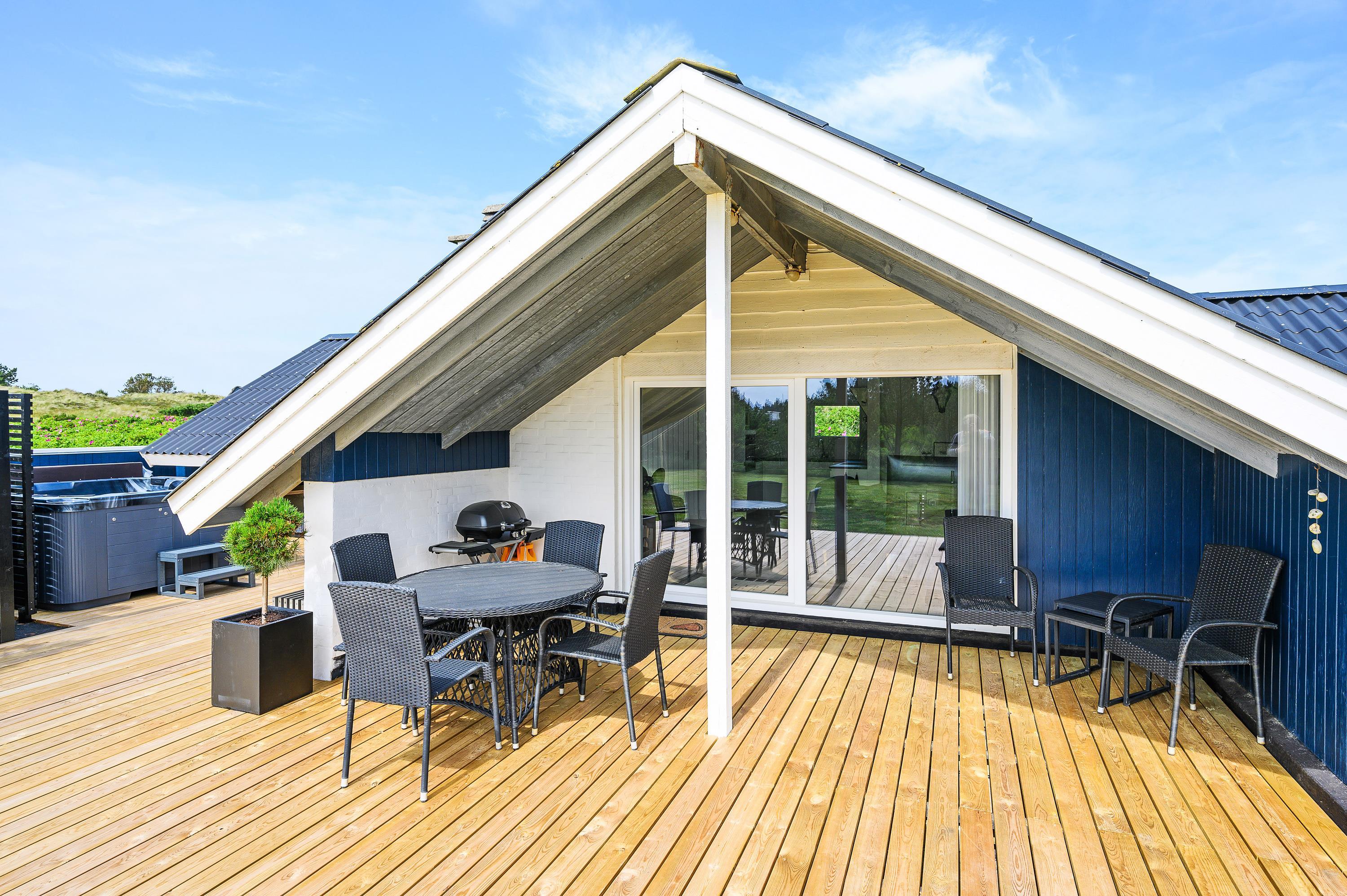 Den flotte udsigt og den friske havluft kan passende nydes på feriehusets store træterrasse. Terrassen har både en åben, afskærmet og overdækket del, så ligegyldigt om I foretrækker sol eller skygge, har I et sted at være.