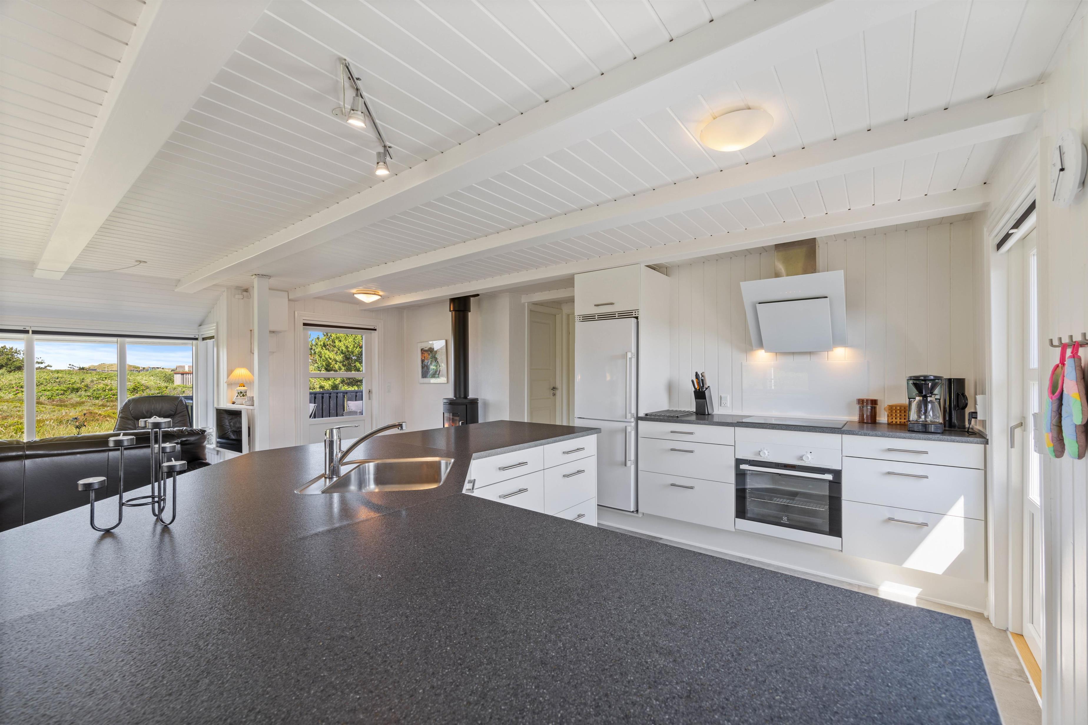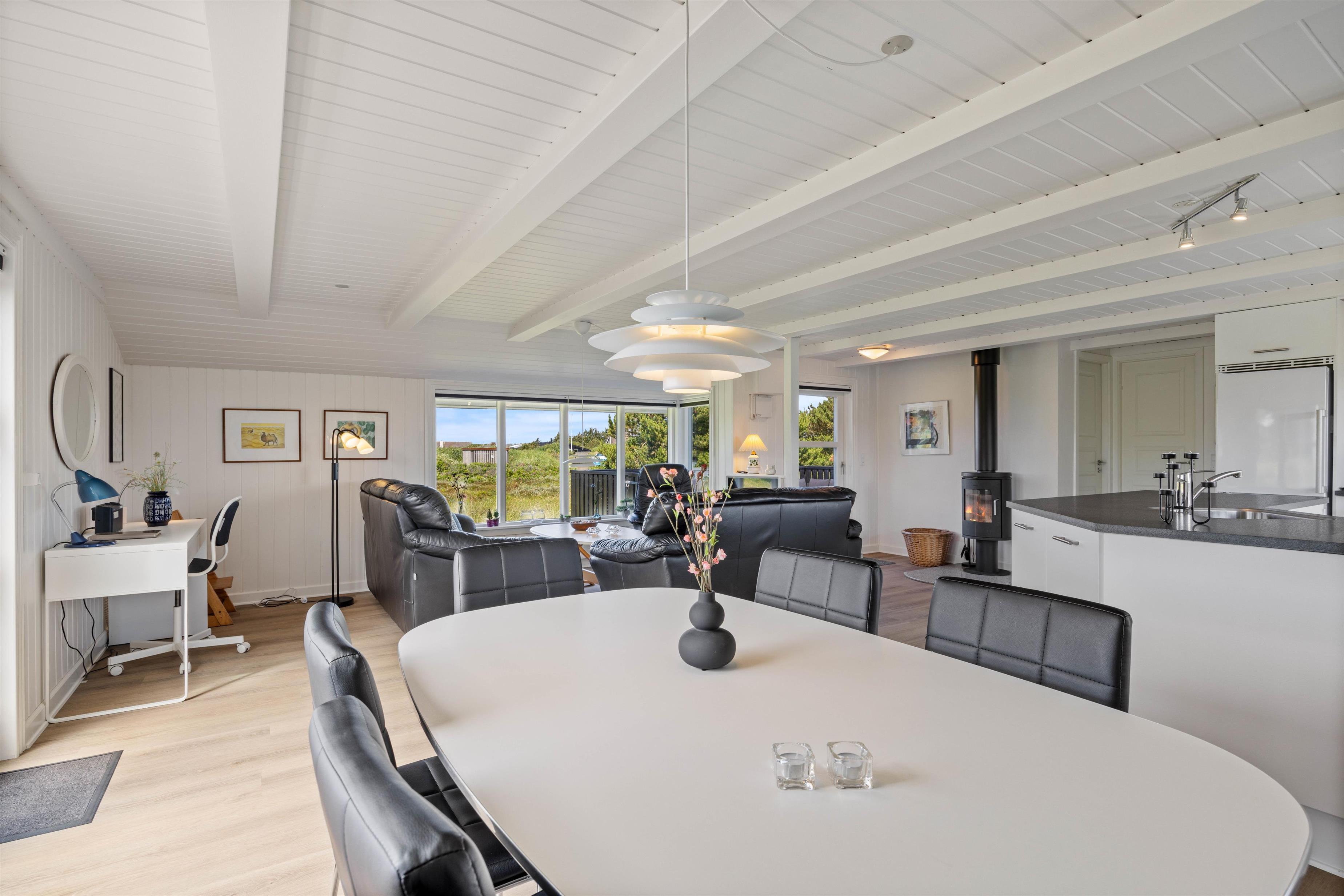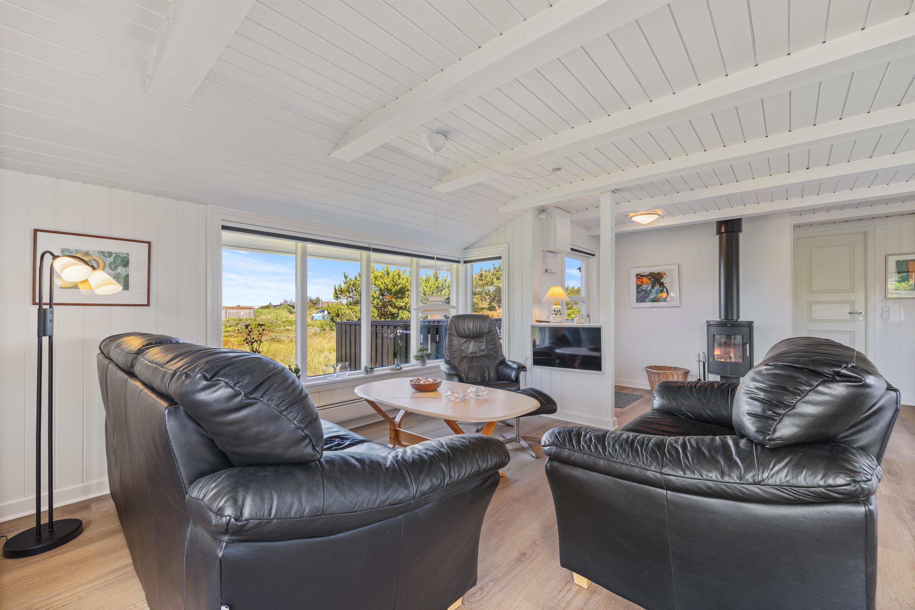 Sommerhuset på Wolle Friks Vej 37 indeholder et stort fællesrum, der forener stue, spiseafdeling og køkken med hinanden. Her kan I alle samles om madlavningen, hyggelige spilaftener og mange andre gode ferieøjeblikke, mens brændeovnen knitrer i baggrunden. Sommerhuset er på i alt 75 kvadratmeter, og er hele tiden løbende blevet renoveret. Derfor fremstår huset som utrolig velholdt og flot. Sommerhuset størrelse er helt ideelt til en lille familie eller en gruppe venner. Moderne bekvemmeligheder som en luft-til-luft varmepumpe sikrer en behagelig temperatur hele året rundt.