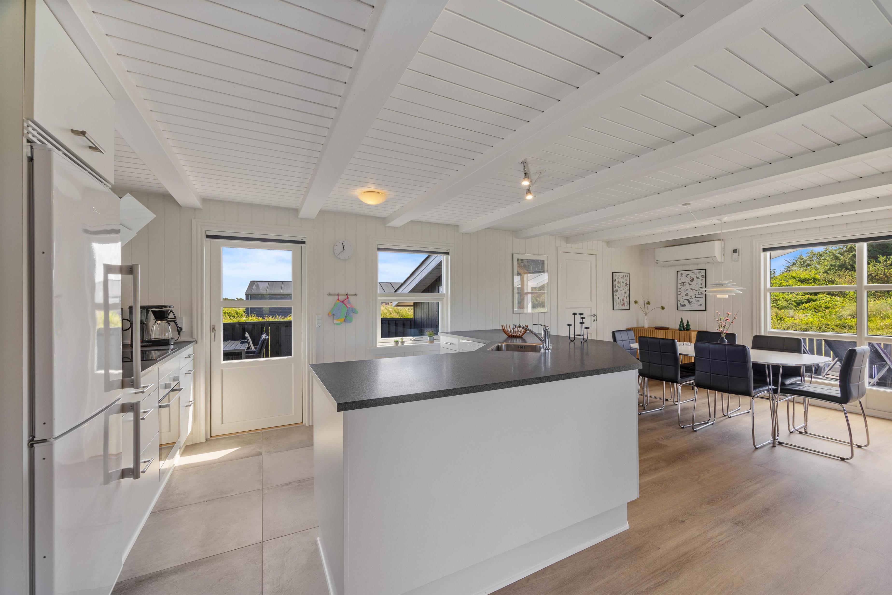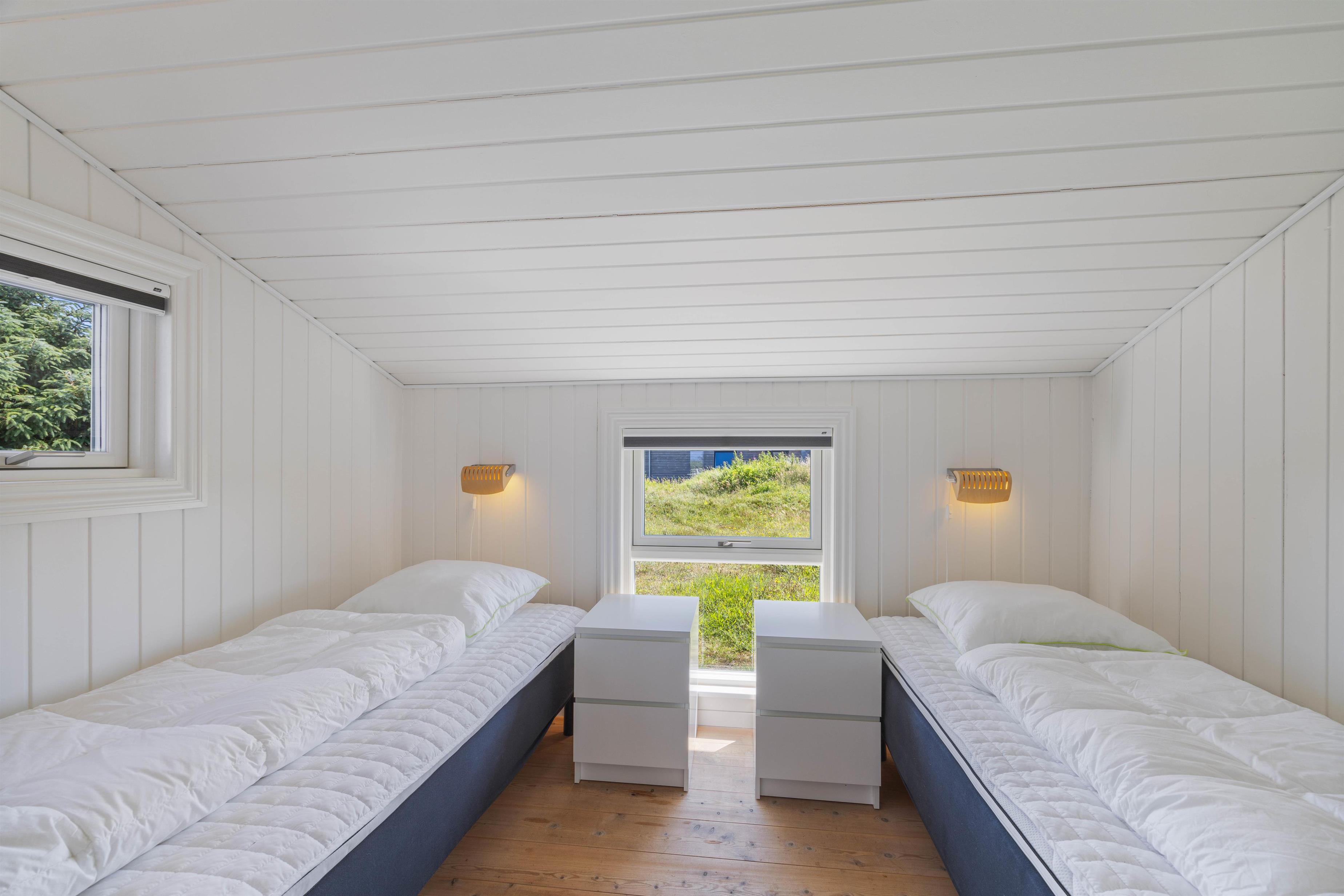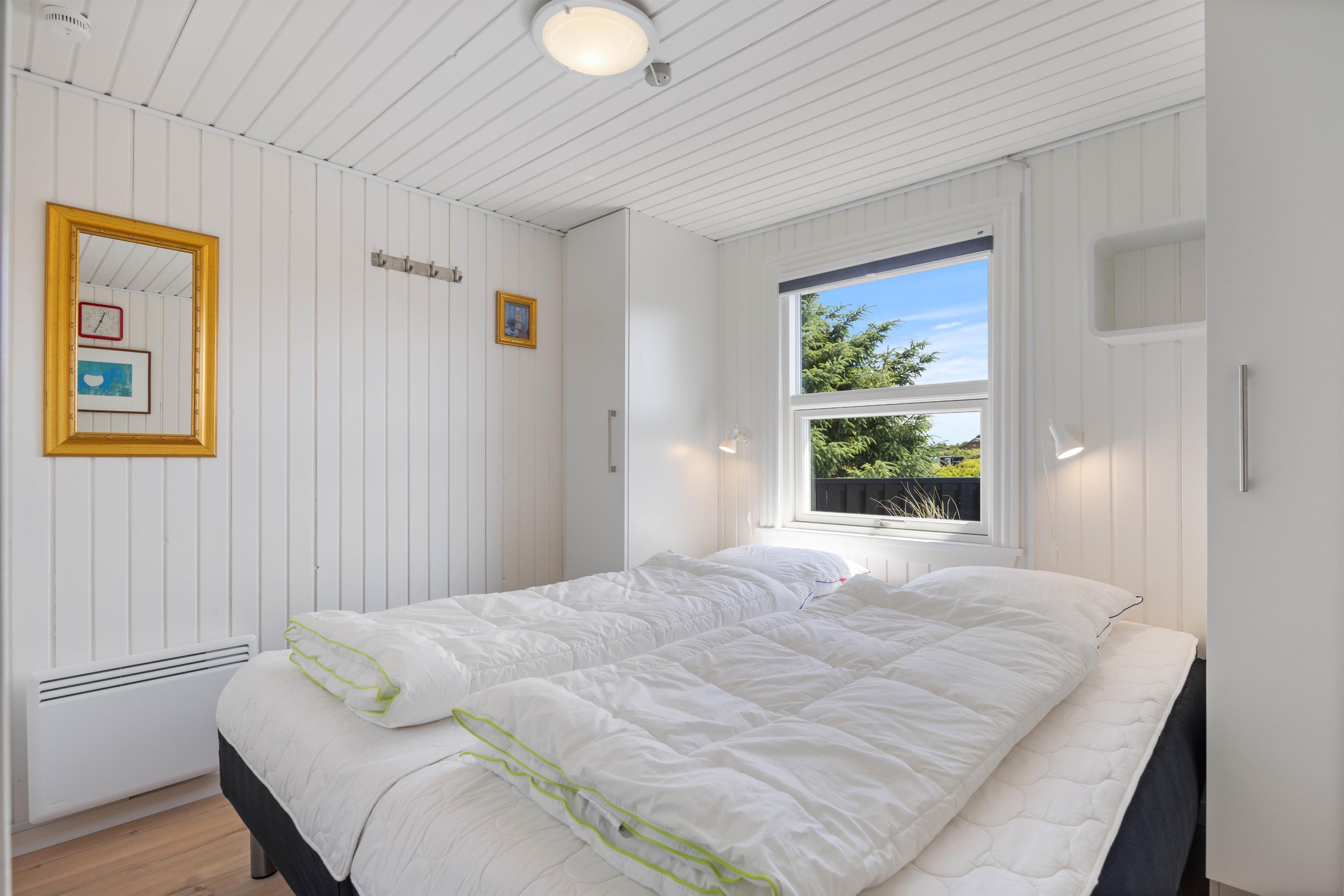 De to soveværelser er indrettet med henholdsvis en dobbeltseng og 2 enkeltsenge, perfekt til den lille familie. Badeværelset er udstyret med gulvvarme, så I ikke får kolde fødder, når der skal børstes tænder om morgenen. Derudover er der en vaskemaskine og tørretumbler, så I kan holde jeres tøj friskt under hele opholdet. Med gratis internet har I mulighed for at holde kontakten med omverdenen, eller måske streame en film foran brændeovnen efter en lang dag ved stranden. Her kommer I ikke kommer til at mangle nogen praktiske faciliteter på ferien.