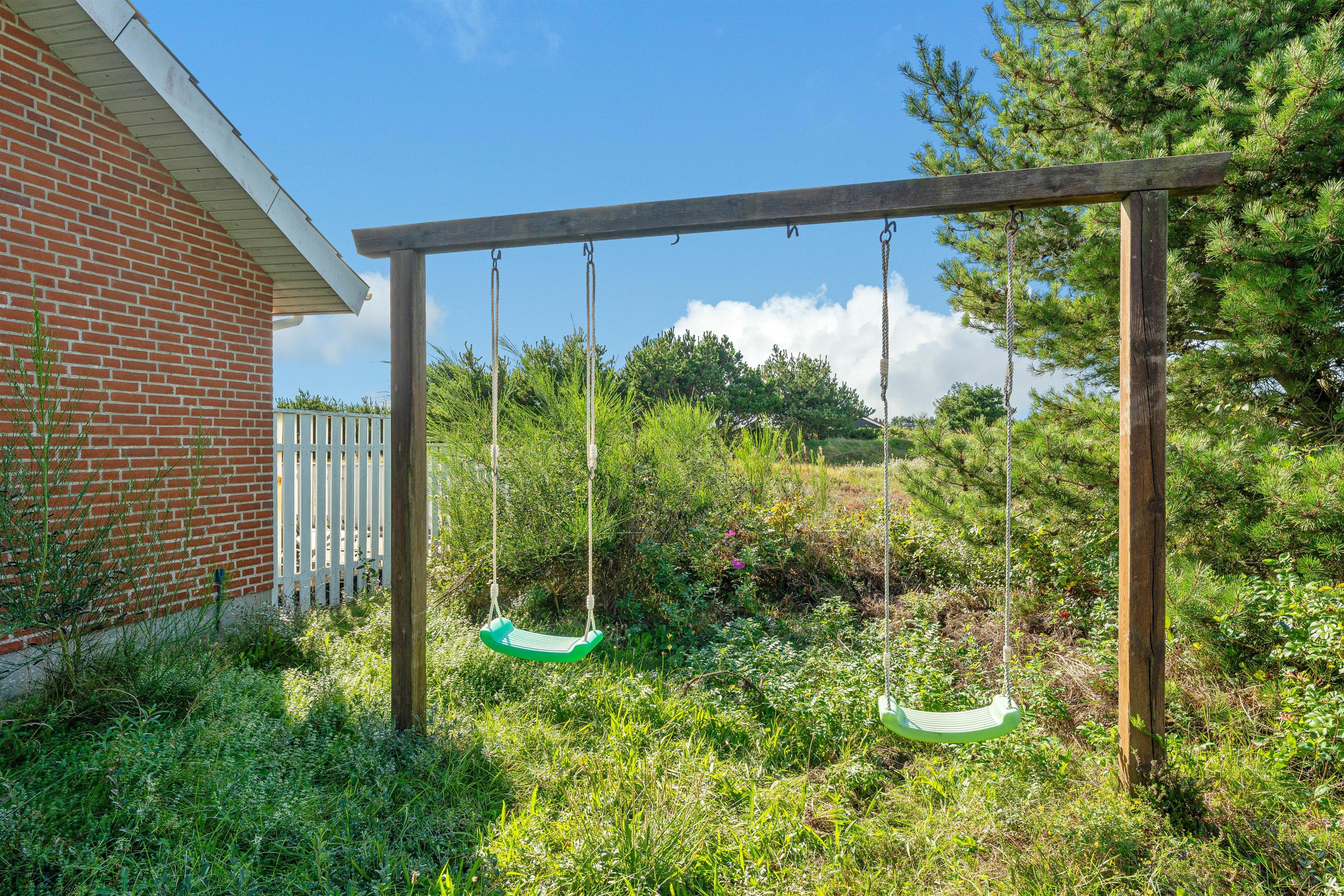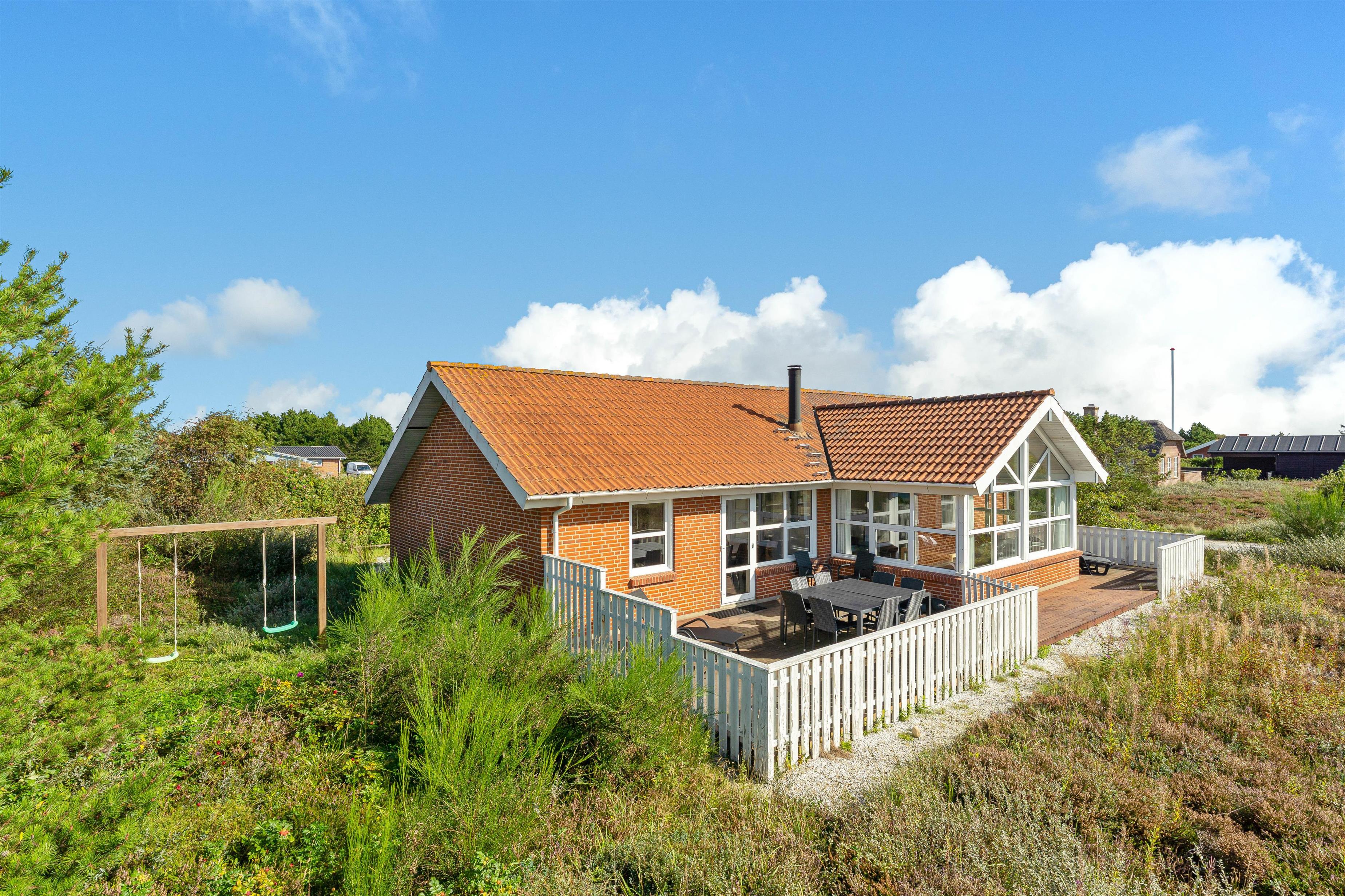 Sommerhuset byder også på en stor grund på 2550 m2, hvor der er masser af plads til udendørs aktiviteter. Børnene vil elske gynge og sandkasse, mens de voksne kan nyde afslappende stunder i de komfortable havemøbler på terrassen. Sommerhuset har en skøn terrasse der er fint afskærmet og meget læfyldt. De udendørs facilitieter er helt ideele, hvis I har små børn med på ferie. Fra terrassen er der er også en smuk udsigt over den lyngbeklædte naturgrund. Et syn, der sidst på sommeren kan betage enhver, og det betagende udsyn kan selvfølgelig nydes fra de dejlige havemøbler.