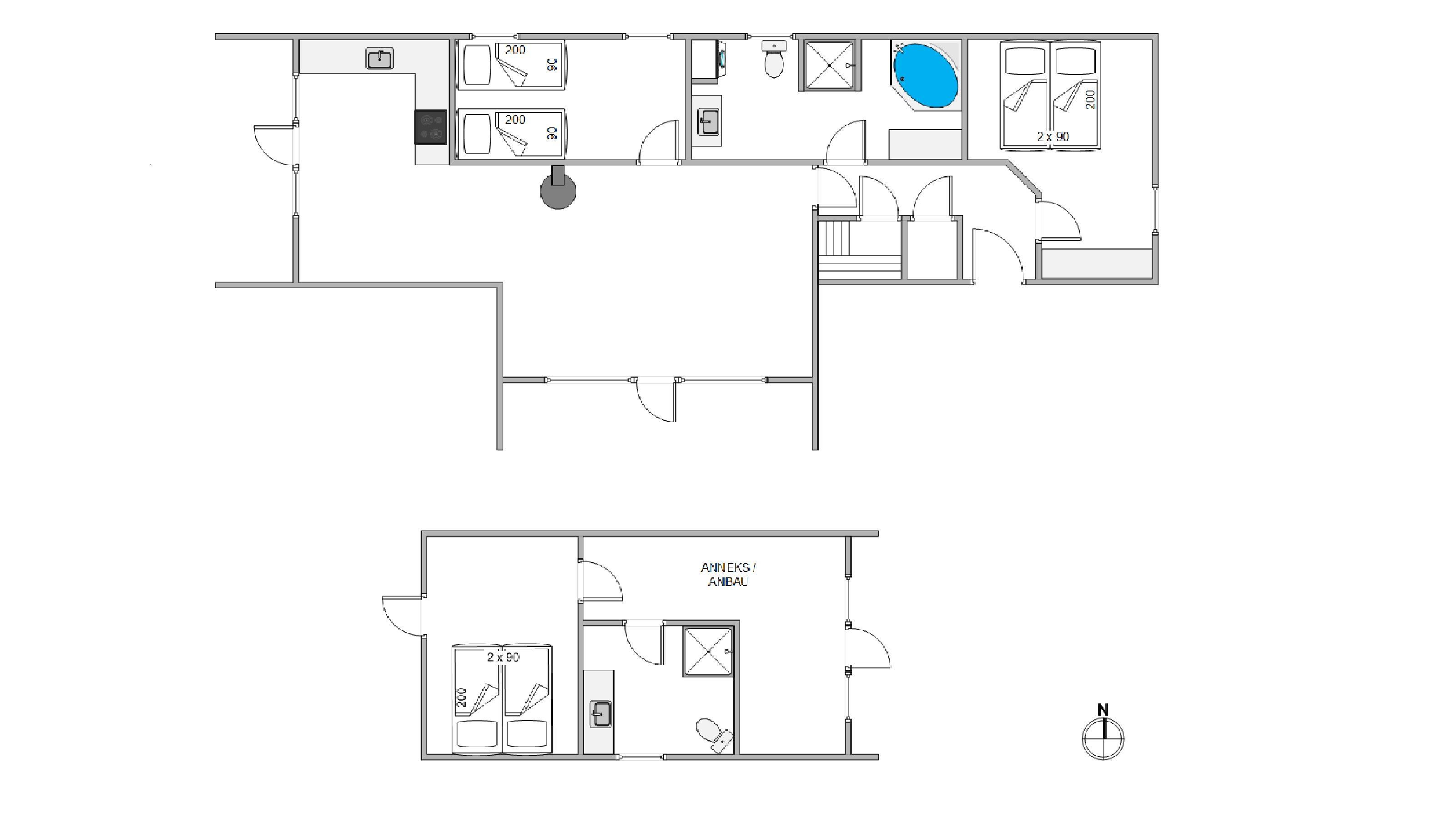 Sommerhuset har 3 soverum, hvoraf de 2 er med dobbeltsenge. Der er 2 lækre badeværelser med moderne hjælpemidler som tørretumbler og vaskemaskine. Fra det ene badeværelse har I adgang til sommerhusets sauna og spa, som giver en følelse af wellness og afslapning på ferien.