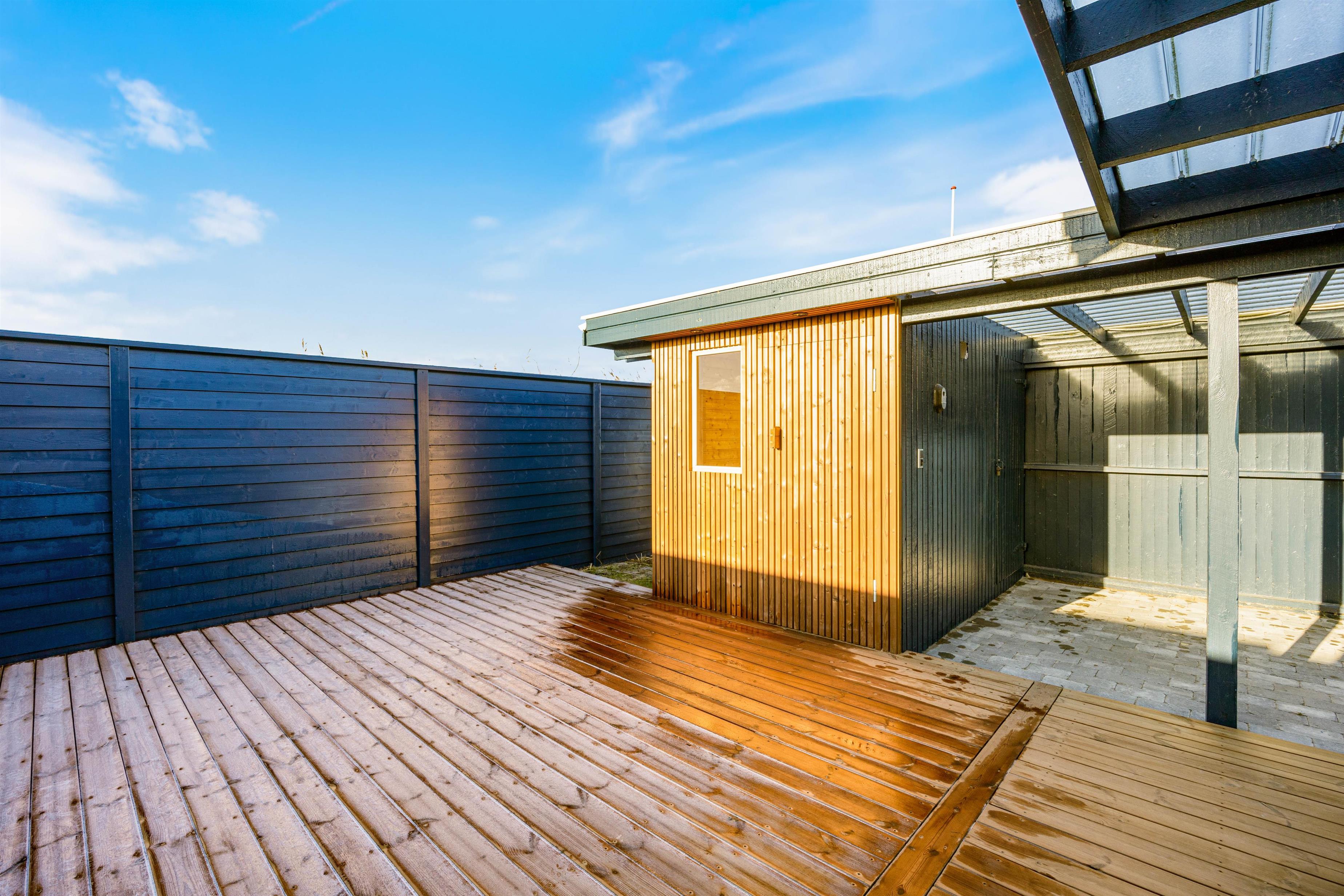 Det charmerende sommerhus, byder på flere skønne terrasseområder hvilket betyder, at I altid vil kunne finde en hyggekrog med mulighed for at grille et lækkert måltid på sommerhusets grill, og nyde hinandens selskab uanset vejret. Derudover er der installeret en udesauna, som giver jer en ægte wellnessoplevelse og mulighed for total afslapning.