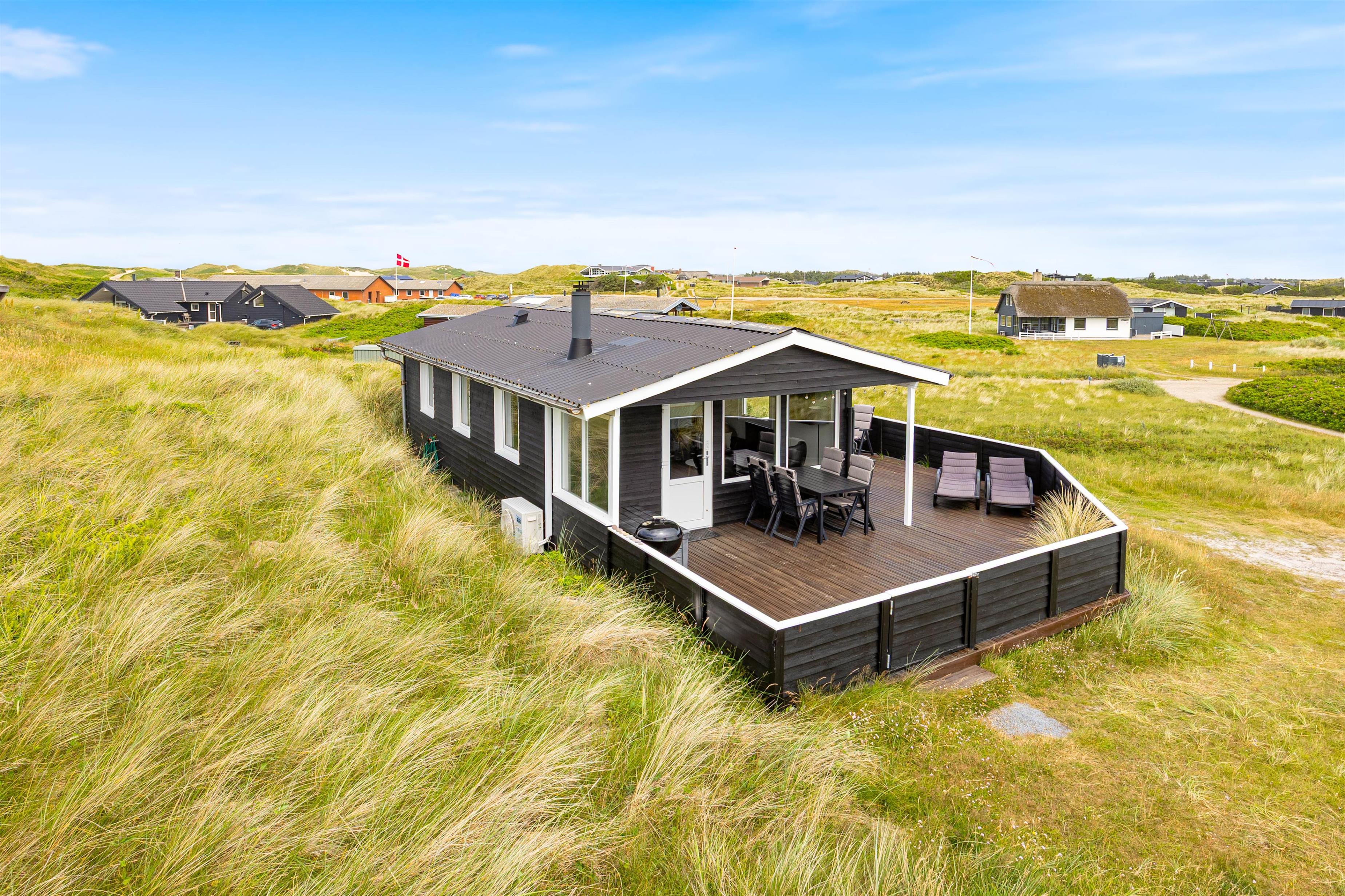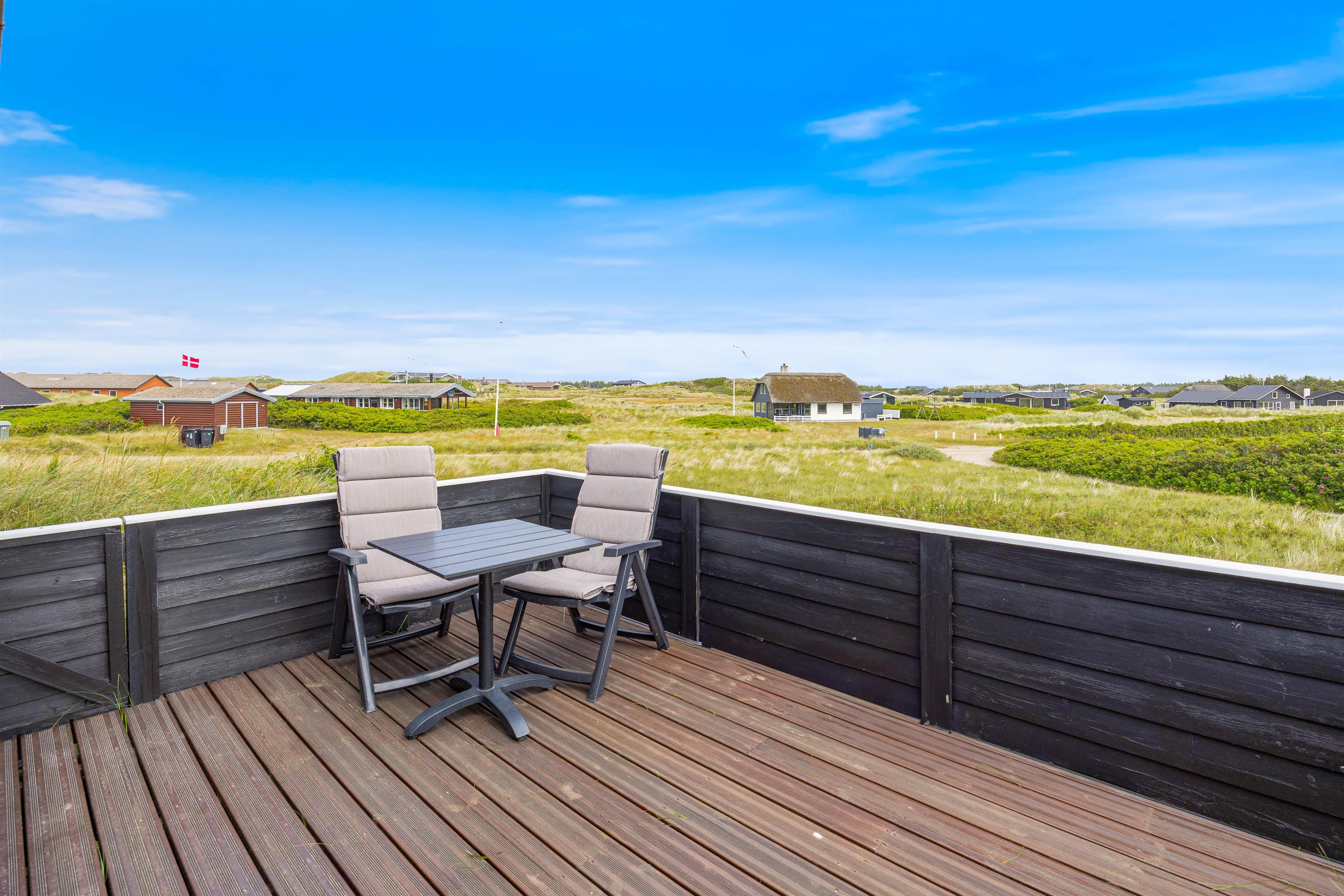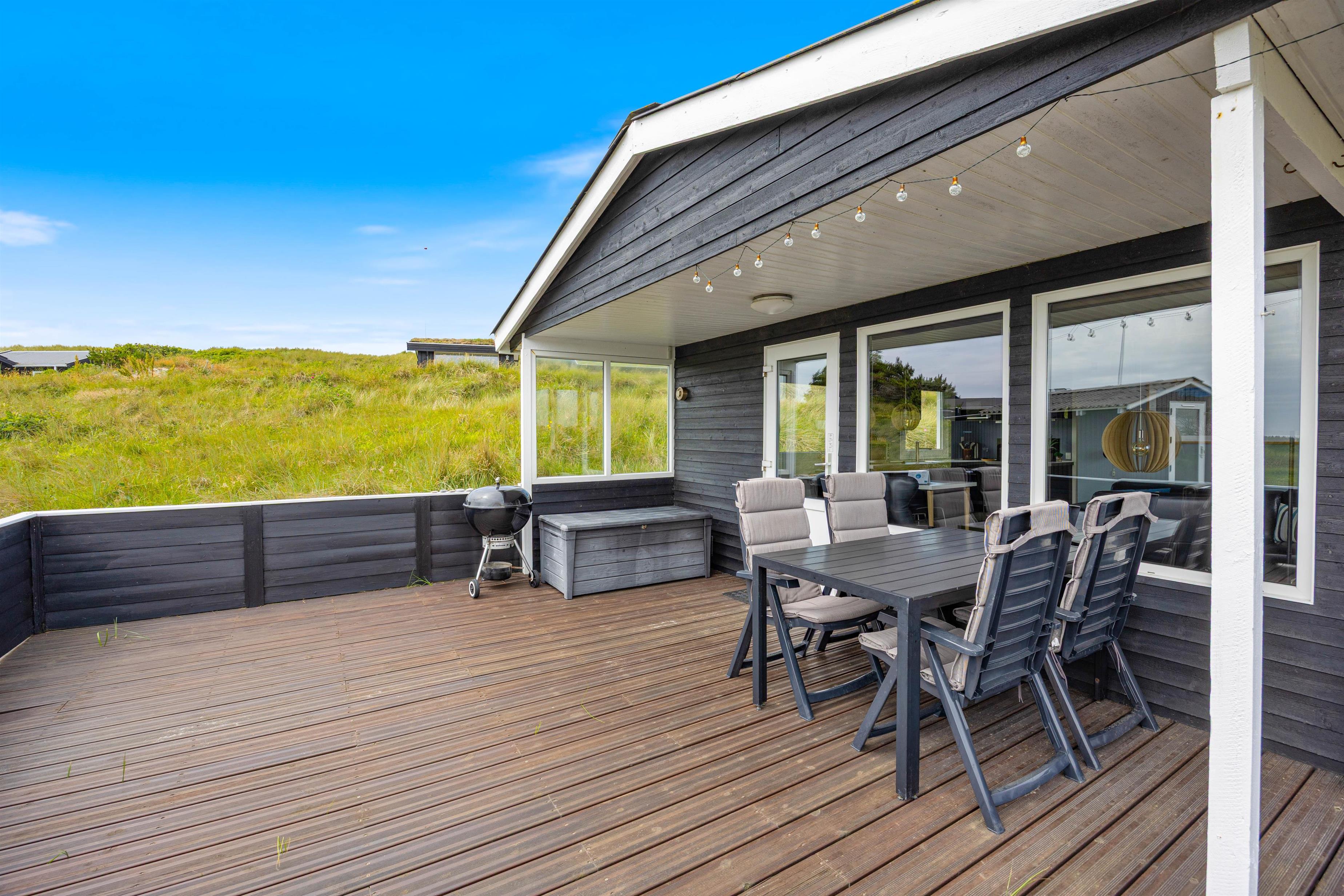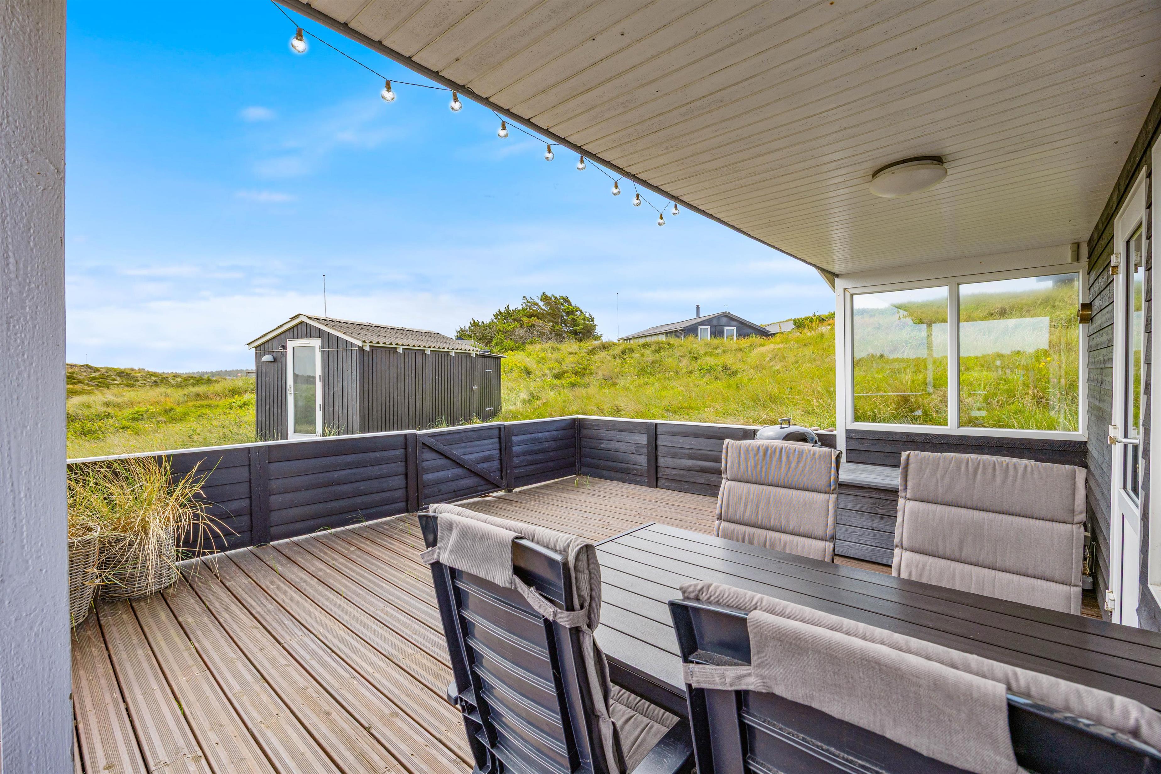 En del af den dejlige, lukkkede terrasse er overdækket. Det holder på varmen på gode sommeraftener, så I kan sidde ude lidt længere. Hele terrassen er indhegnet, så I kan roligt sætte jer tilbage i terrassemøblerne, imens børnene helt uforstyret kan lege her på terrassen. Sommerhuset ligger på en 2.500 m2 stor naturgrund, hvor børnene også kan boltre sig med fodbold og masser af udeleg. Kun fantasien sætter grænserne. Sommerhuset befinder sig kun 300 meter fra det brusende Vesterhav. En gåtur gennem det unikke klitlandskab til stranden er hvert et skridt værd - Også uanset hvilken tid på året I besøger den danske vestkyst.