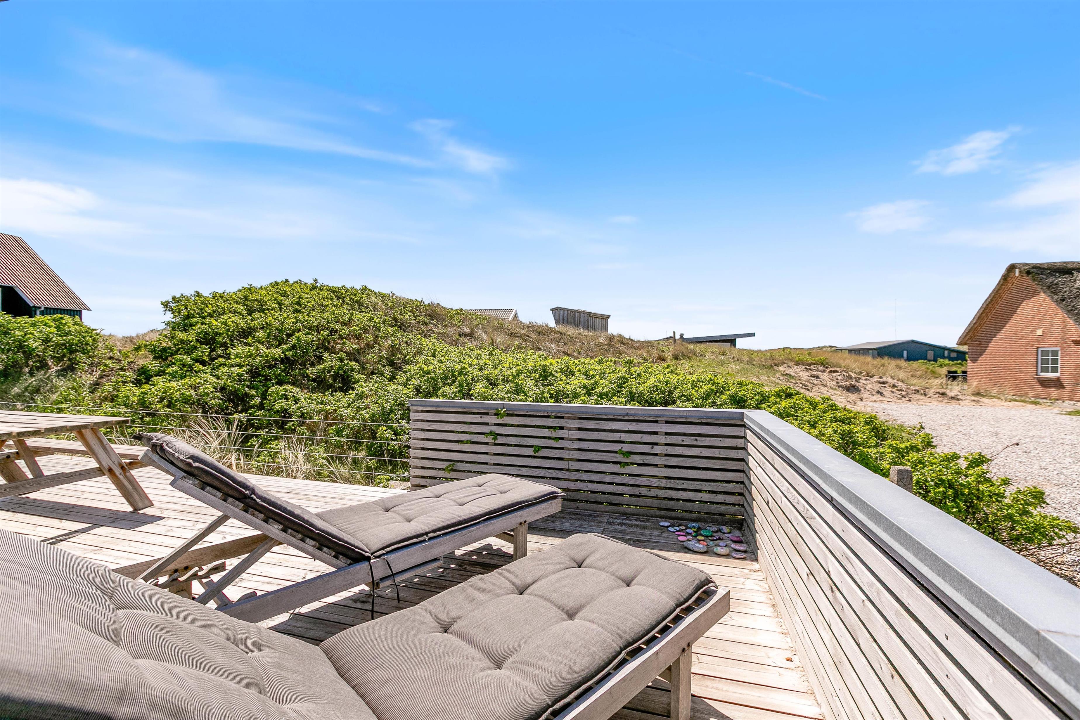 Feriehuset har en skøn terrasse, der både er afskærmet og lukket. Her er der altid læ at finde, og I kan nyde de varme sommerdage og den flotte natur, mens I slapper af på liggestolene, får en kold drink ved havebordet eller hygger i vildmarksbadets varme vand. Ved siden af vildmarksbadet, finder i feriehusets udebruser, som er åben fra april-november.