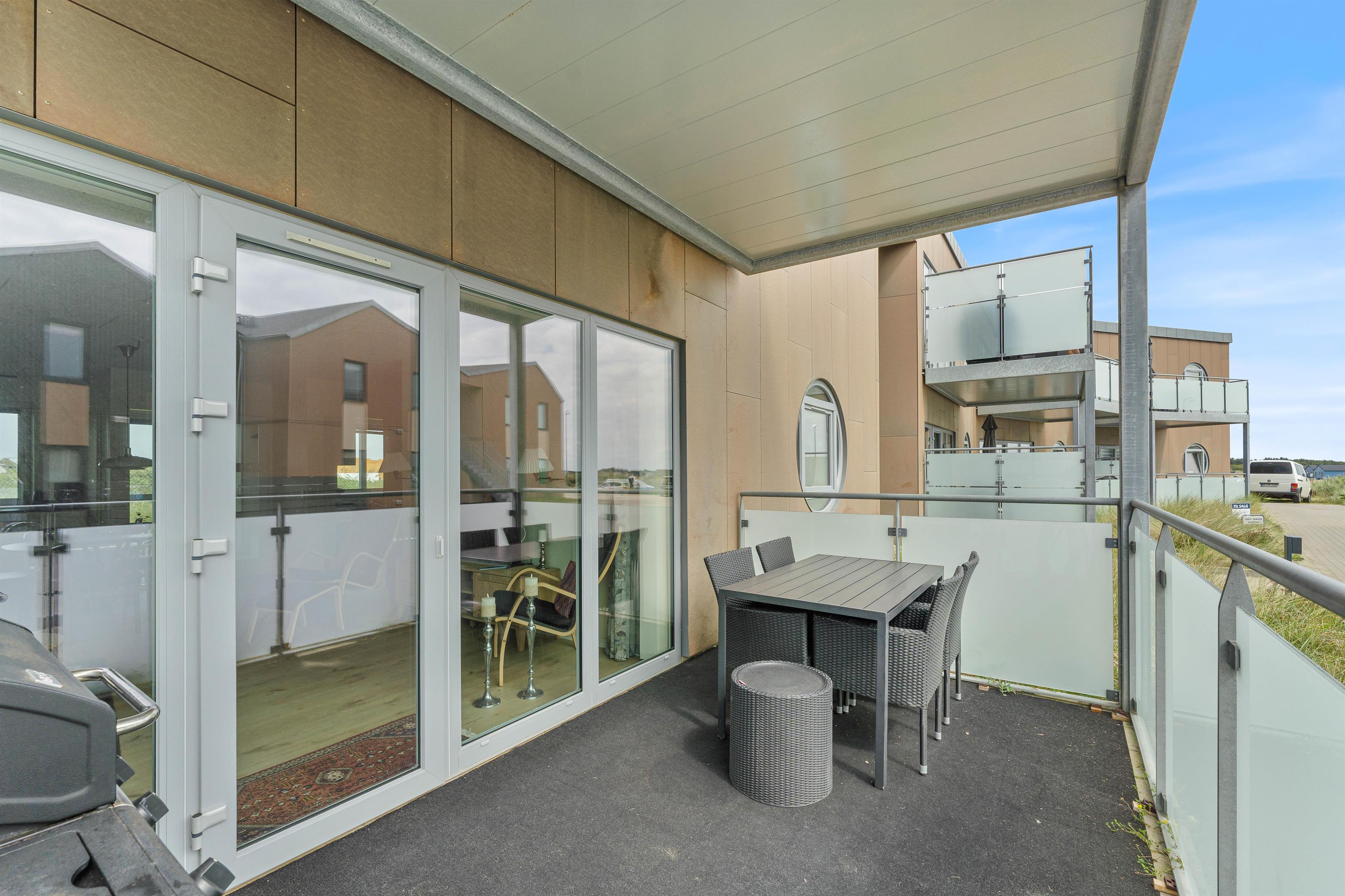 Med til ferielejligheden hører en lukket og overdækket terrasse til, hvor I kan nyde feriedagene i den friske havluft. Terrassen er selvfølgelig udstyret med gode havemøbler og en gasgrill, så duI nemt og hurtigt kan tænde op og tilberede en ægte feriemiddag på grillen. Her kan I uden problemer sidde ude i lang tid på en sommeraften og bare nyde hinandens samvær.