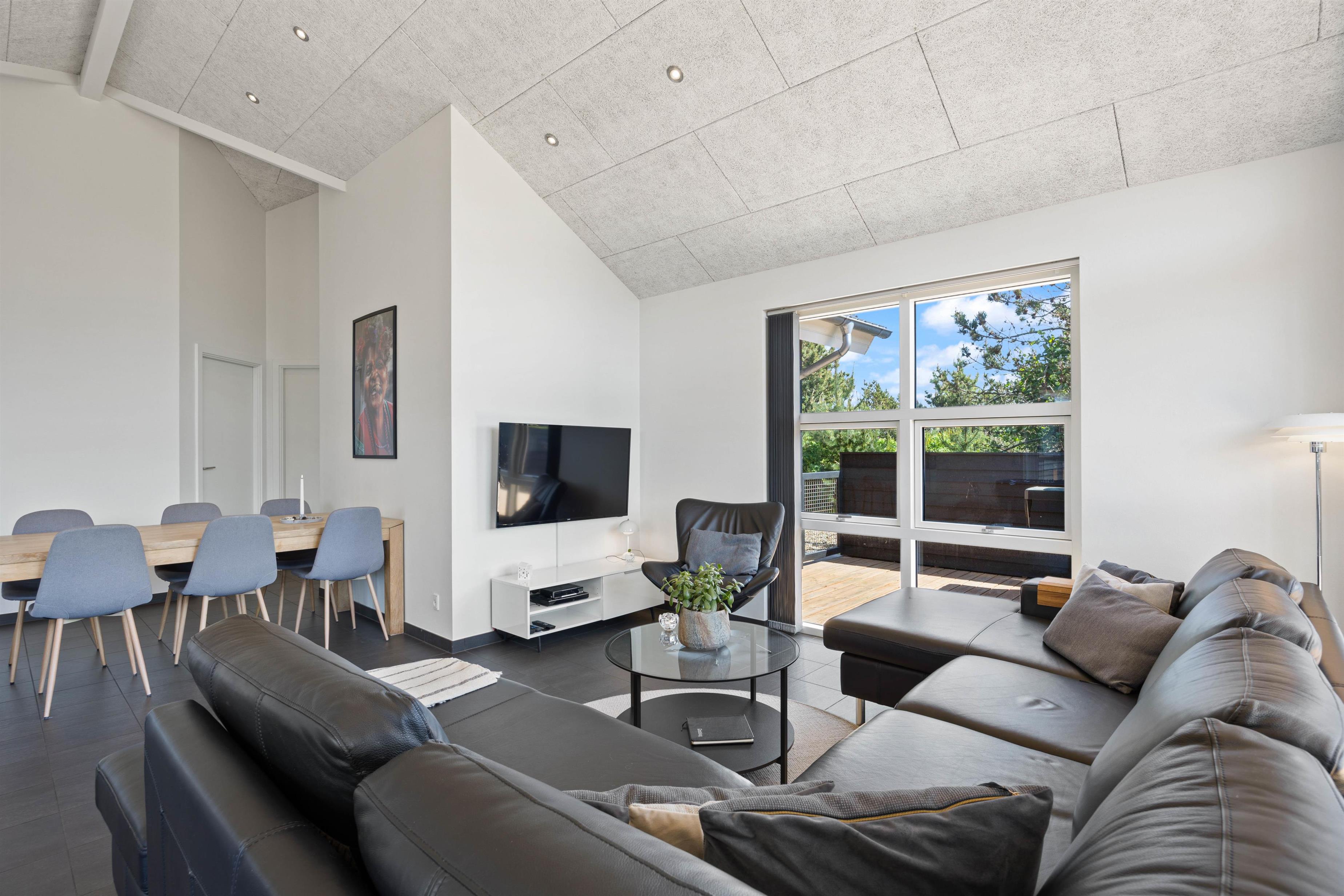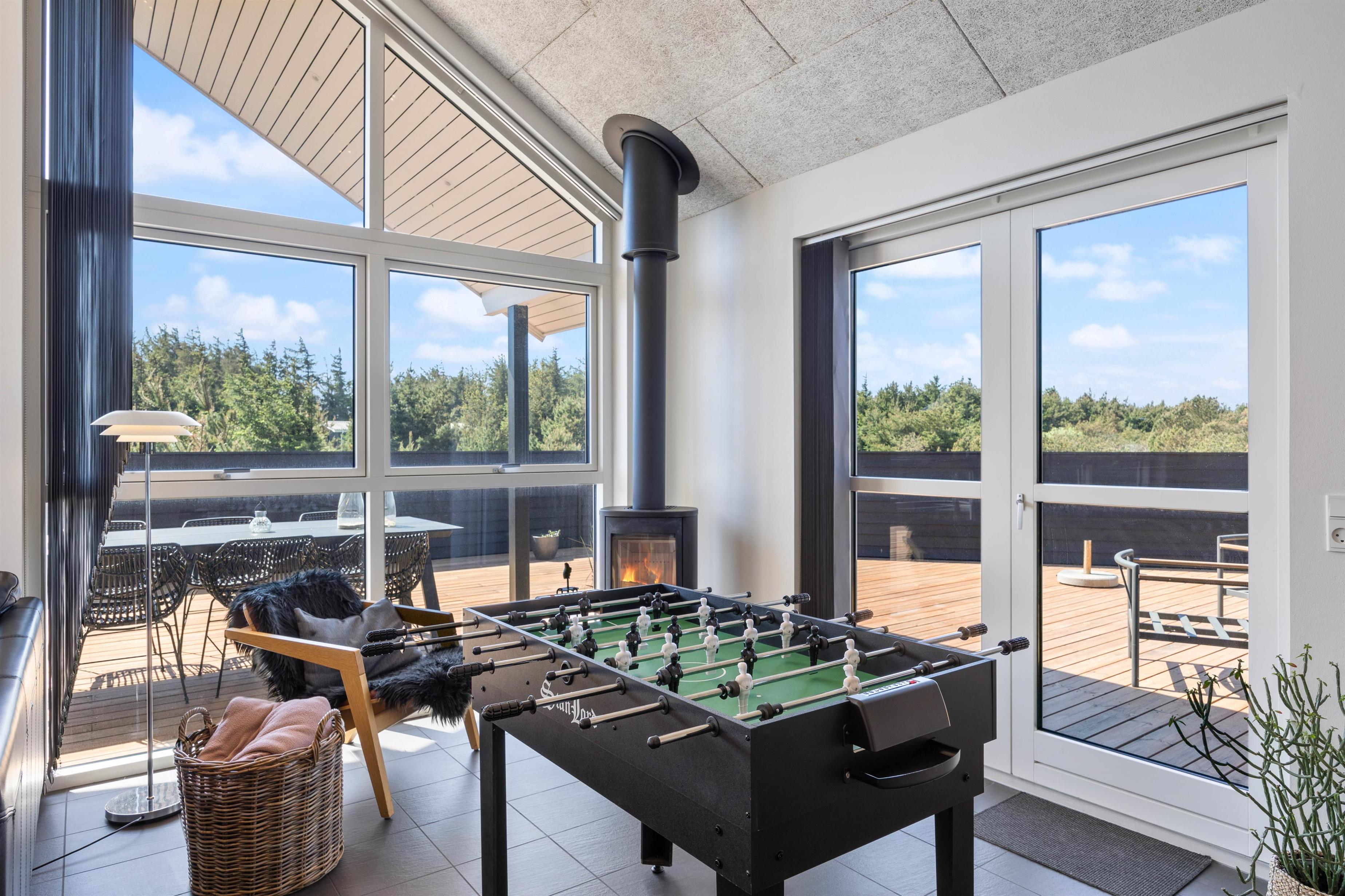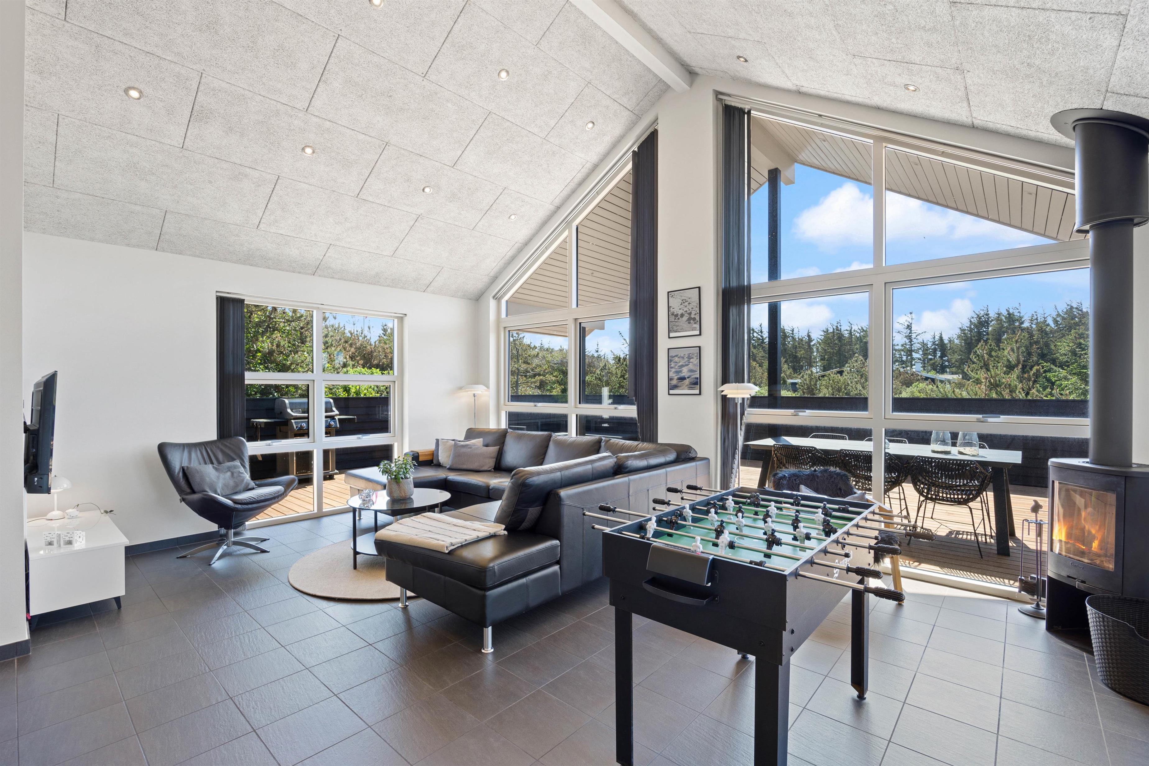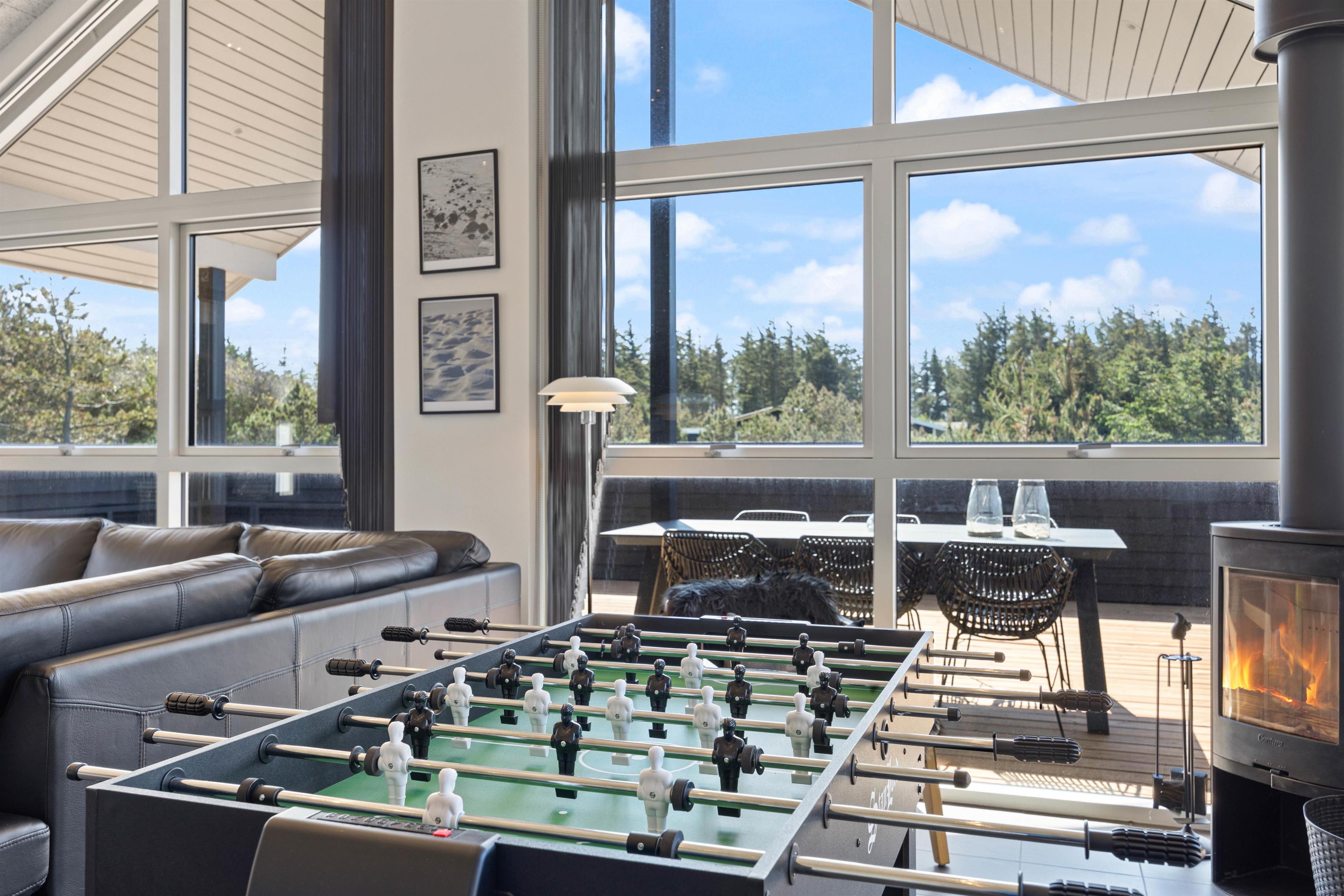 Opholdsstuen har højt til loftet, og her er det perfekt at samles til mange hyggelige stunder sammen på ferien. Lav mad sammen i køkkenet, spil sjove brætspil omkring spisebordet eller se en god film i tv’et, mens I slænger jer i sofaerne. Brændeovnen knitrer i baggrunden og sætter prikken over i’et for feriestemningen. I stuen står også et bordfodboldbord, hvor I både kan konkurrere i bordfodbold, bordtennis og billard.