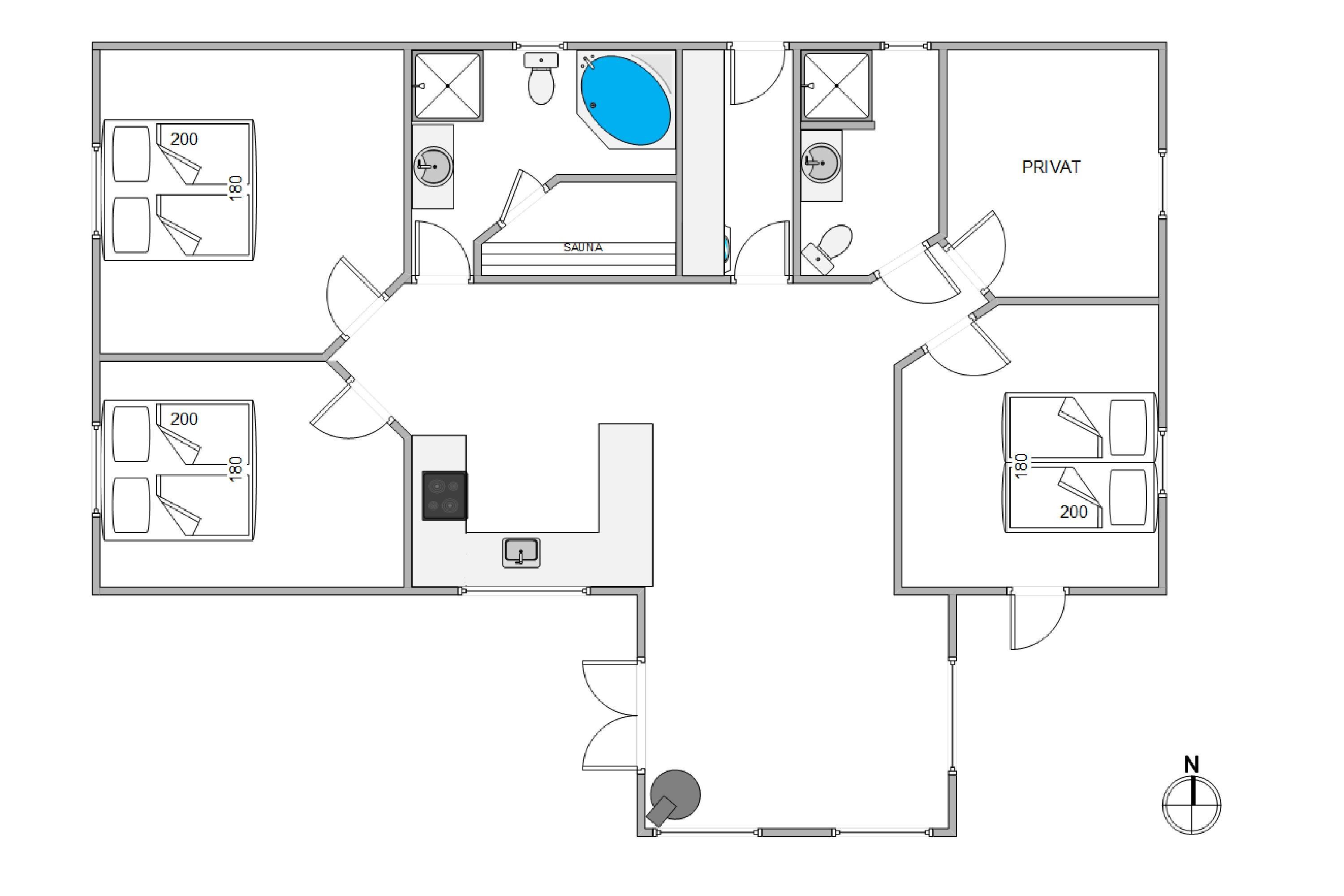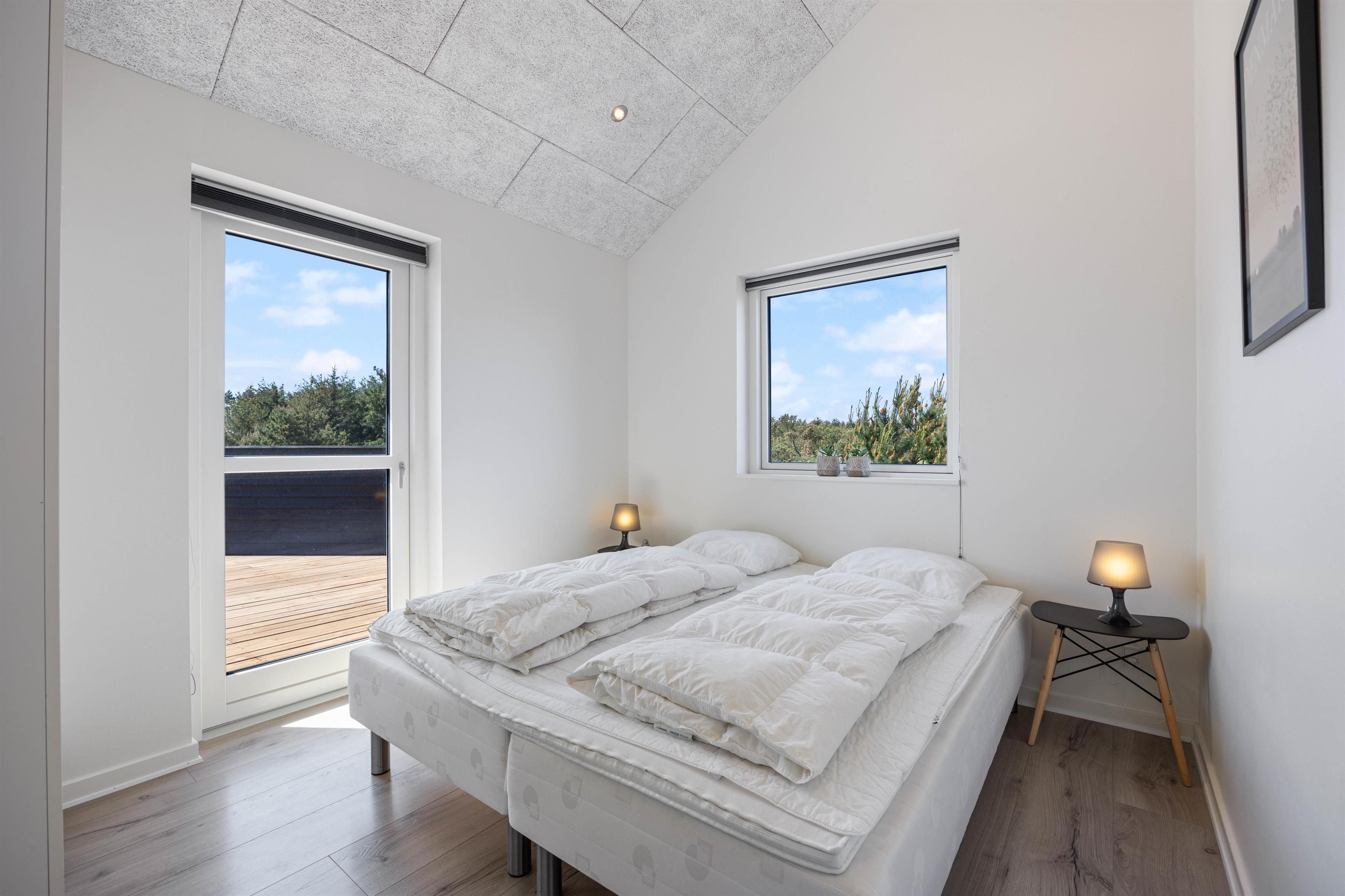 Til feriens 6 gæster er der 3 soveværelser, hvoraf 2 er placeret i den ene ende af sommerhuset, og 1 er placeret i den anden ende af sommerhuset, hvilket gør det perfekt for to familier. I hver af de to afdelinger i sommerhuset er også der et badeværelse med gulvvarme – ingen skal hverken fryse tæerne eller stå i kø til toilettet om morgenen.