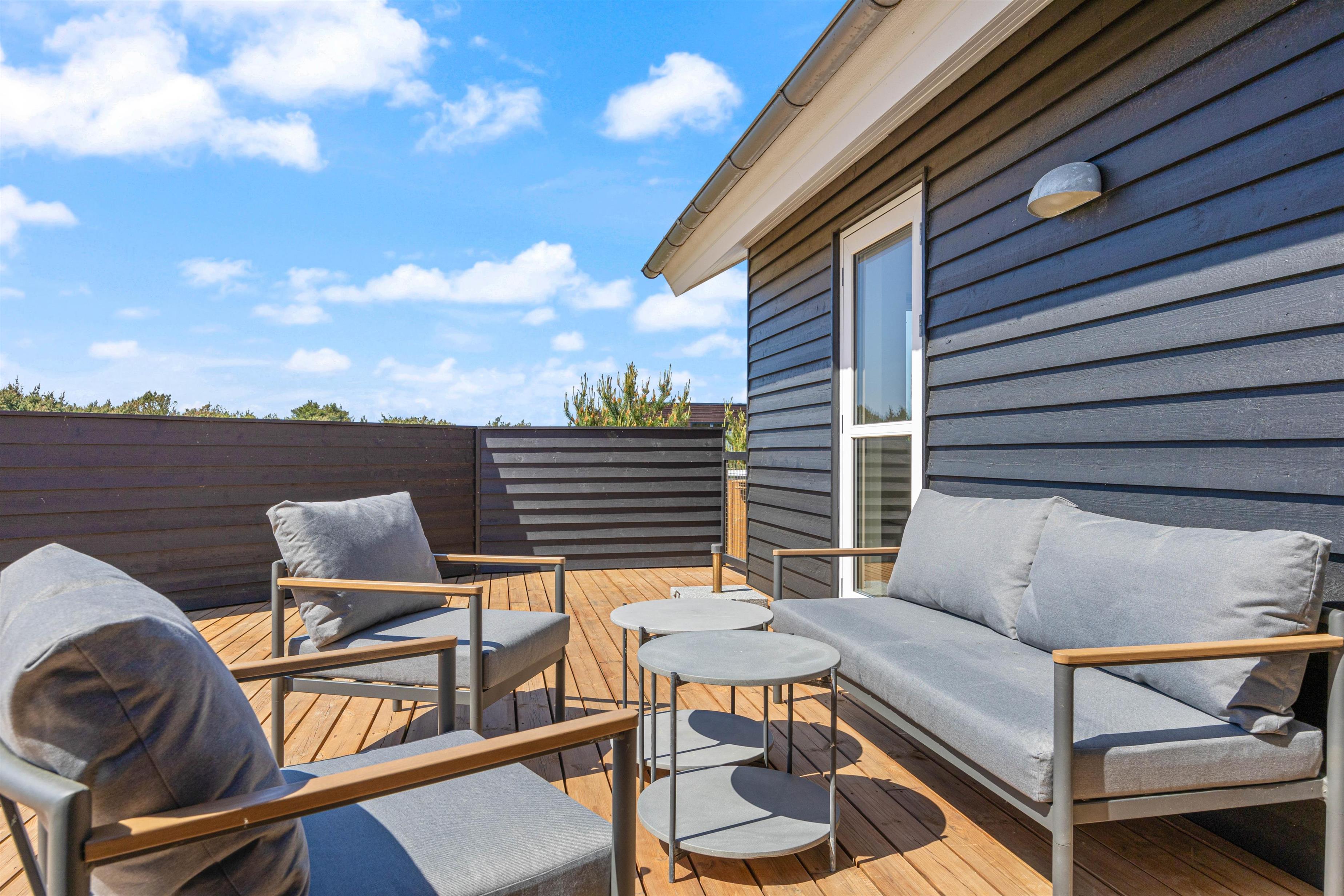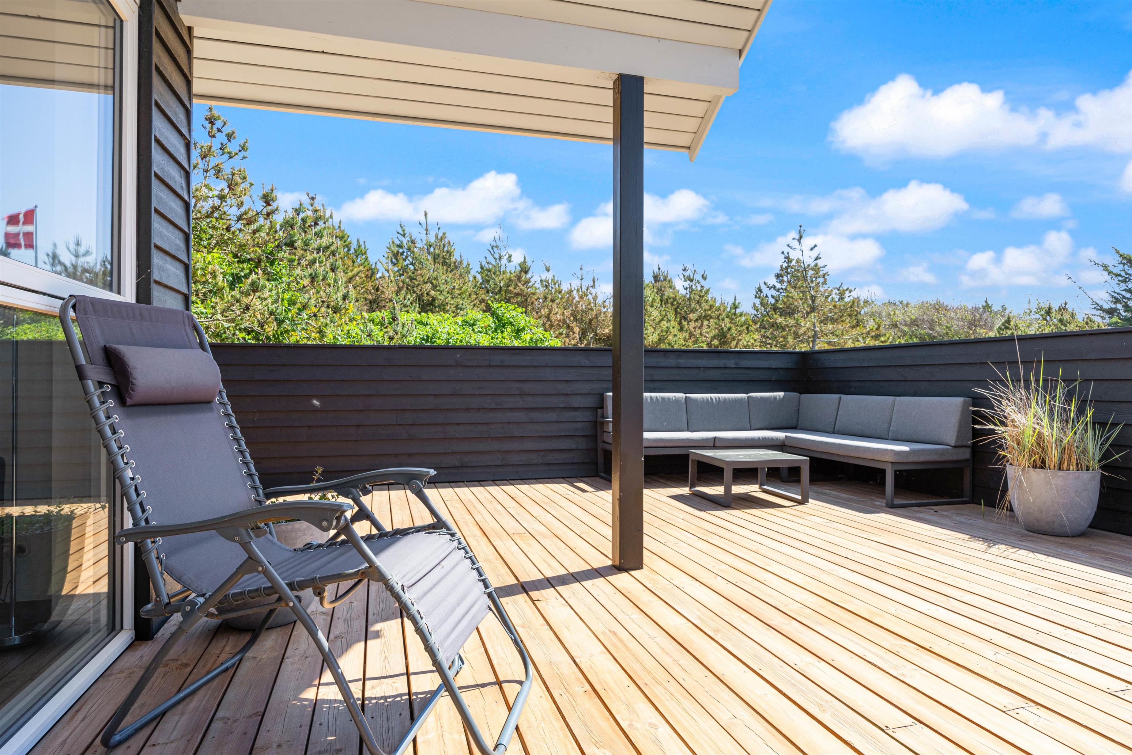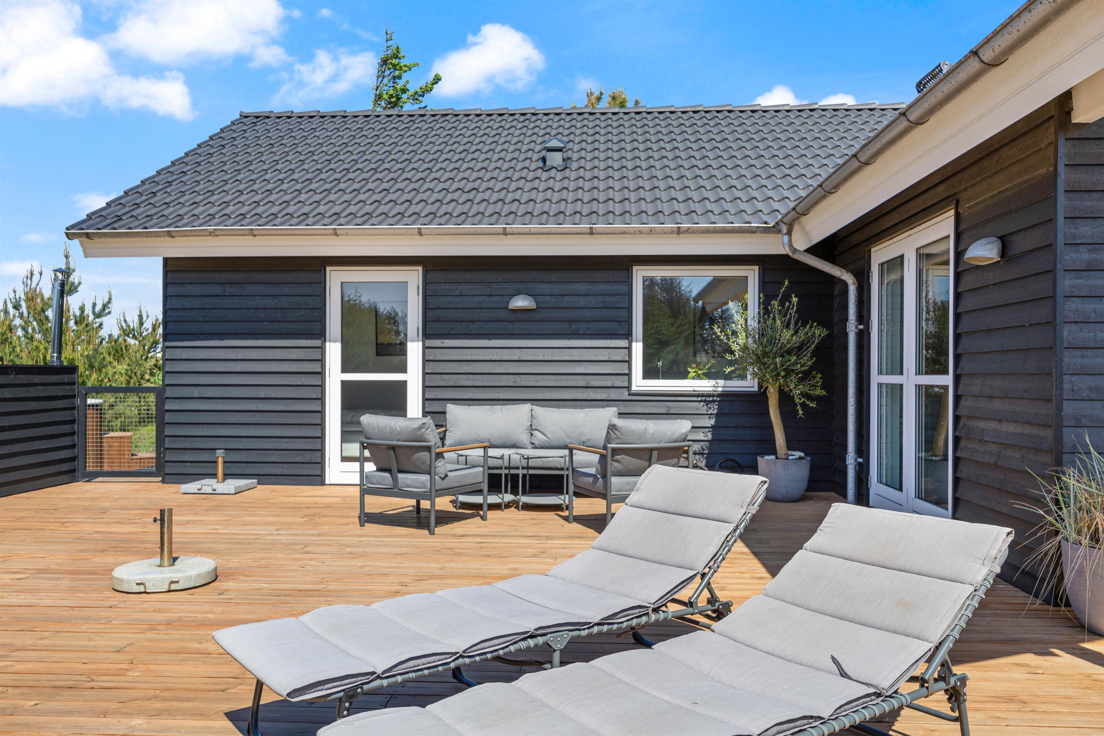 På sommerhusets øst-, syd- og vestside løber en stor, delvist overdækket træterrasse, som I kan tilbringe de solskinsfyldte feriedage fra. Her kan I altid finde jer en god plads i solen, hvor I kan sætte jer godt til rette i havemøbler og liggestole. Er i til ekstra welness, kan i benytte sommerhusets vildmarksbad, hvori I kan nyde naturen omkring feriehuset, imens i bliver varmet godt igennem.