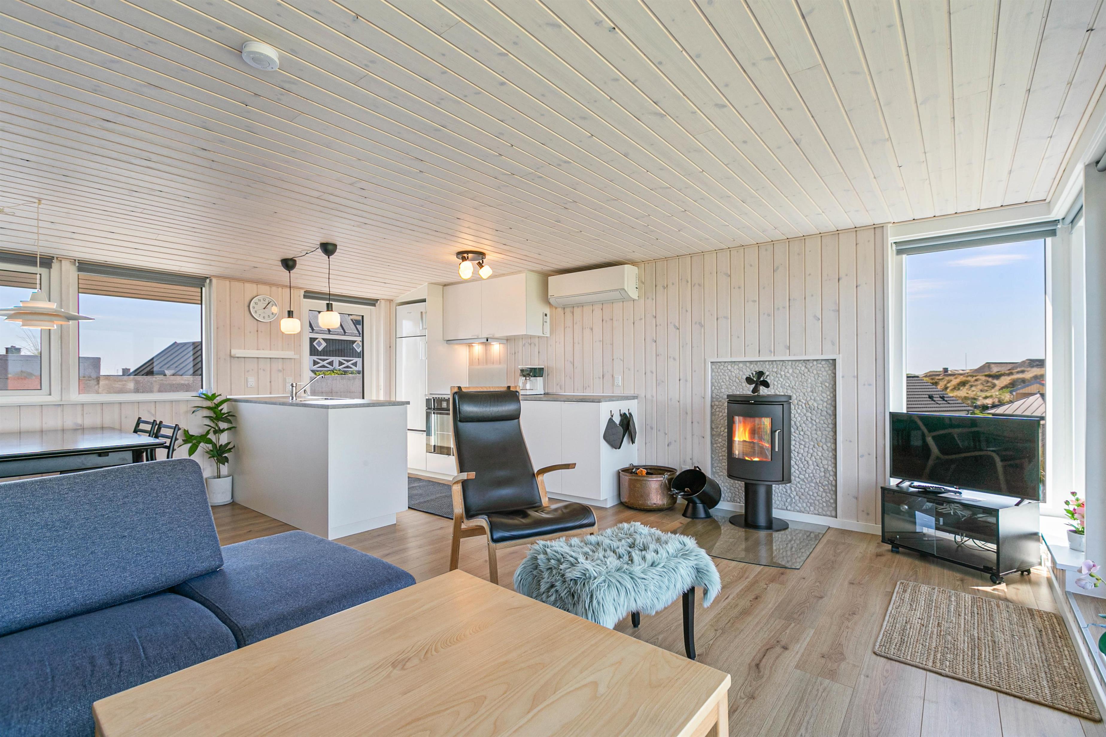 Vægge og lofter i stuen er malet helt hvide, og det giver en god lethed i indretningen, der ellers er personligt indrettet med bløde møbler. Uanset hvornår på sæsonen, du besøger huset, er her plads til afslapning og hygge for hele familien. Fra huset er der både havglimt og fjordglimt. I feriehuset finder I også en energibesparende luft-til-luft varmepumpe, som bidrager til et behageligt indeklima hele året rundt, samt gulvvarme på badeværelset der gør morgenerne ekstra behagelige. Husets brændeovnen bidrager også til den hyggelige stemning på de køligere aftener eller morgener.
