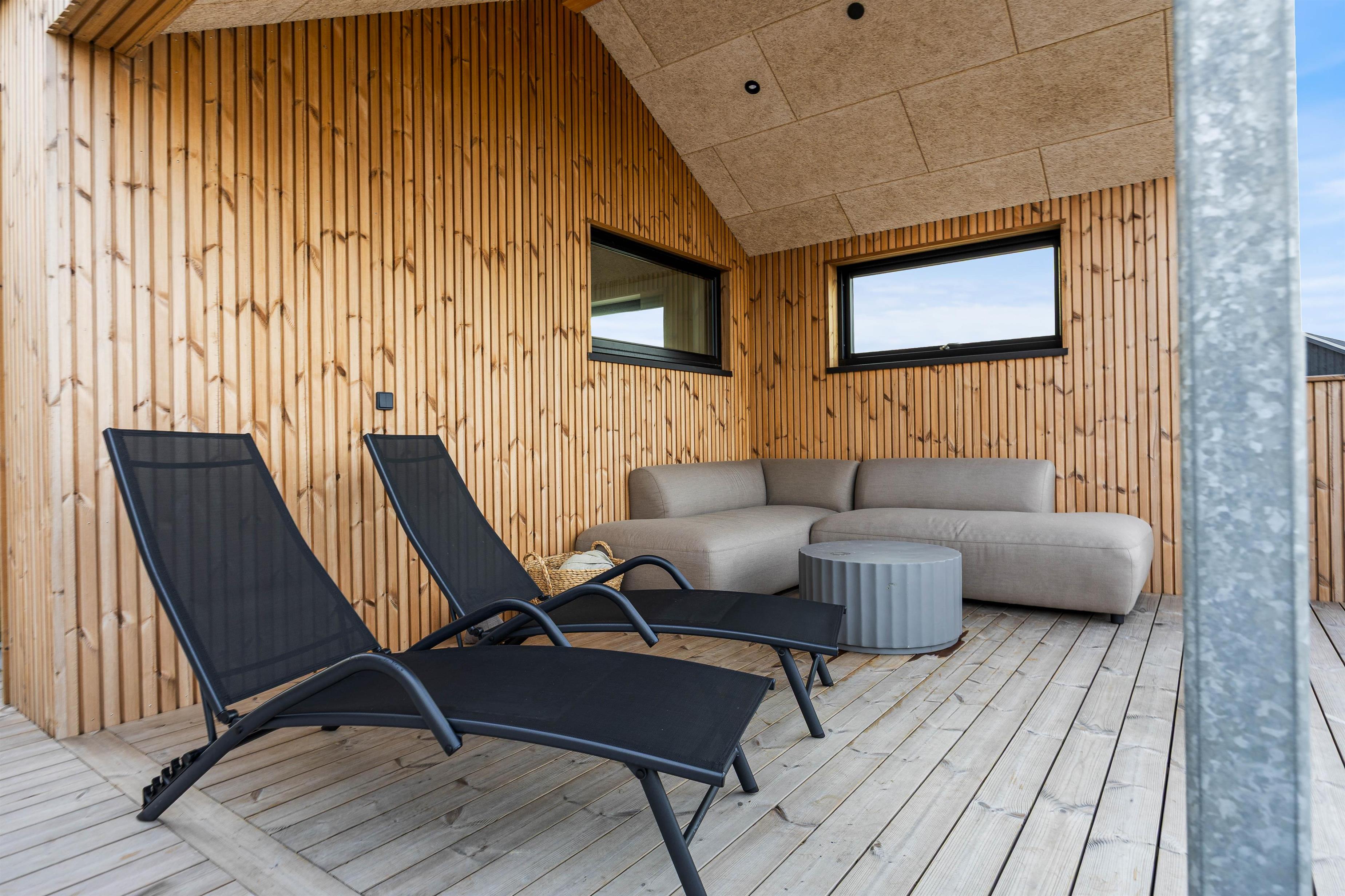 Fra stuen er der direkte adgang til den lukkede og overdækkede terrasse – et oplagt samlingspunkt, når vejret tillader det. Her kan I synke ned i det komfortable loungesæt og nyde roen, mens aftenen langsomt falder på. Tænd op i sommerhusets gasgrill og forkæl jer selv med et glas kolde bobler, mens duften af grillmad breder sig, og I samtidig kan nyde den smukke panoramaudsigt fra terrassen.