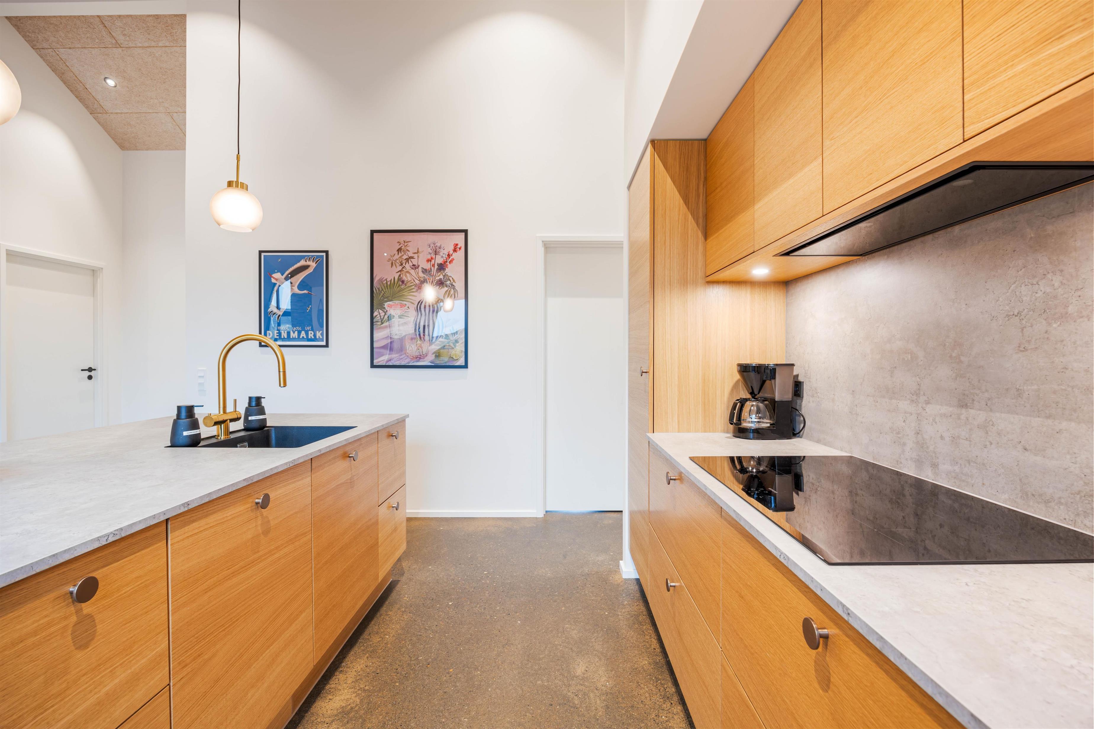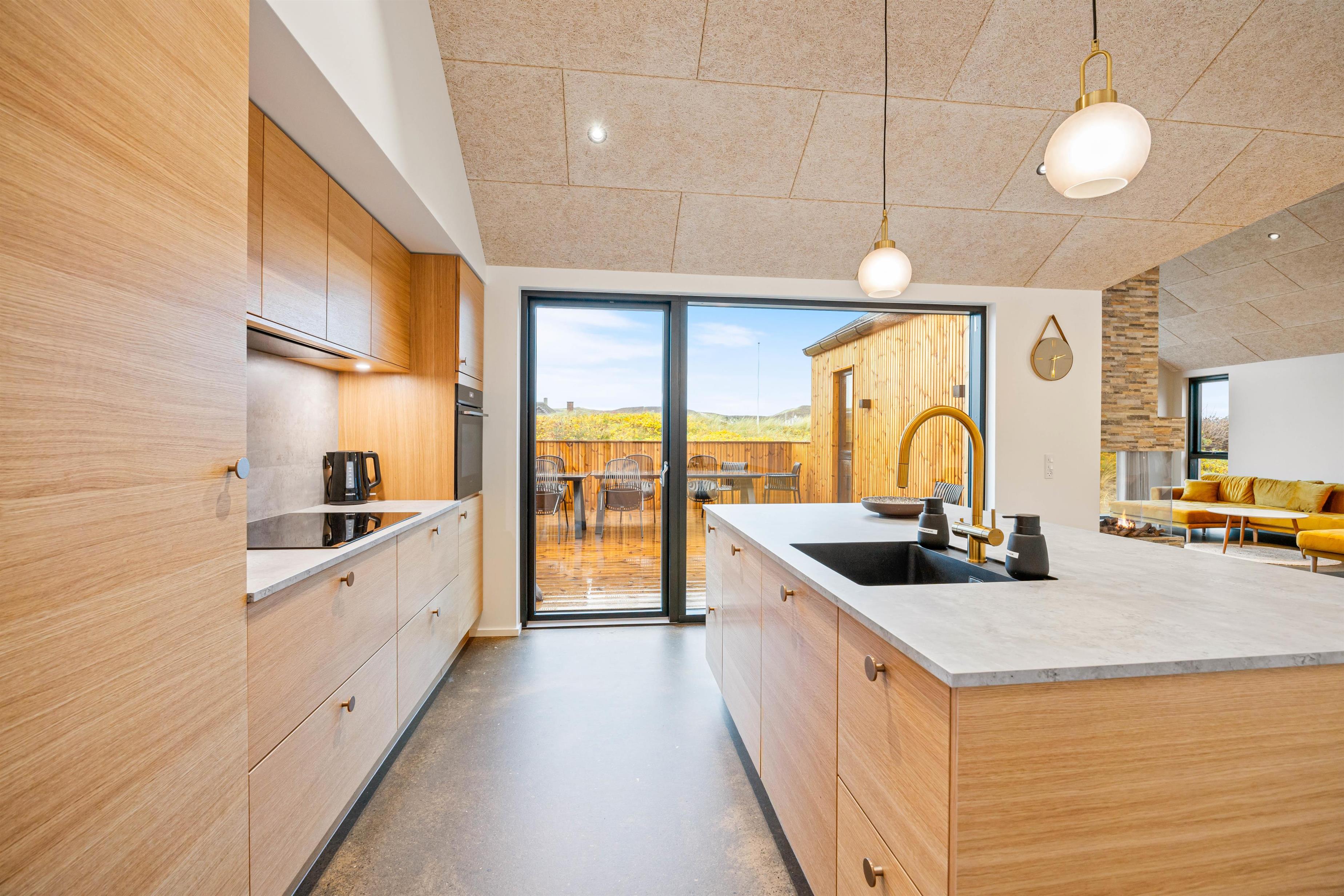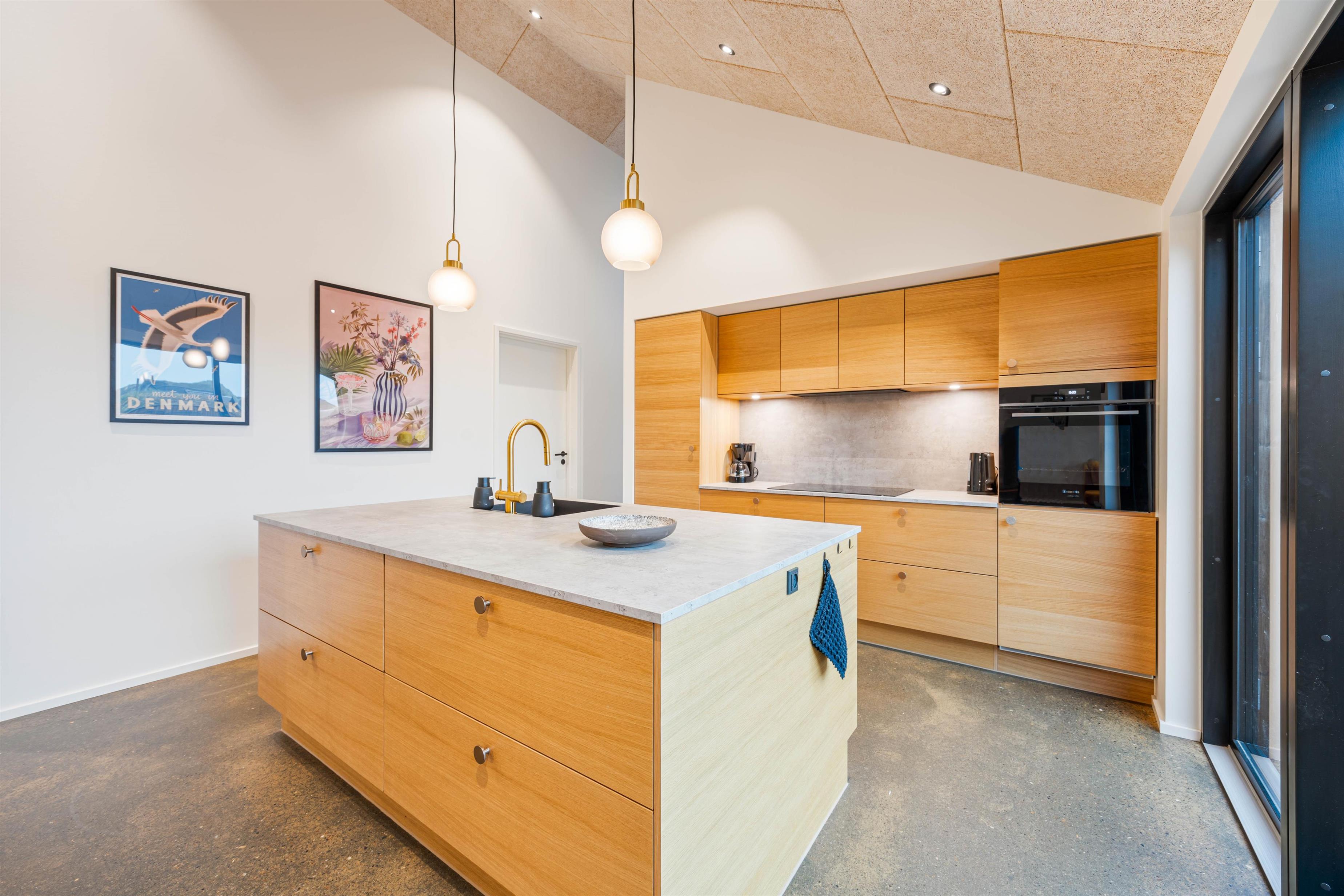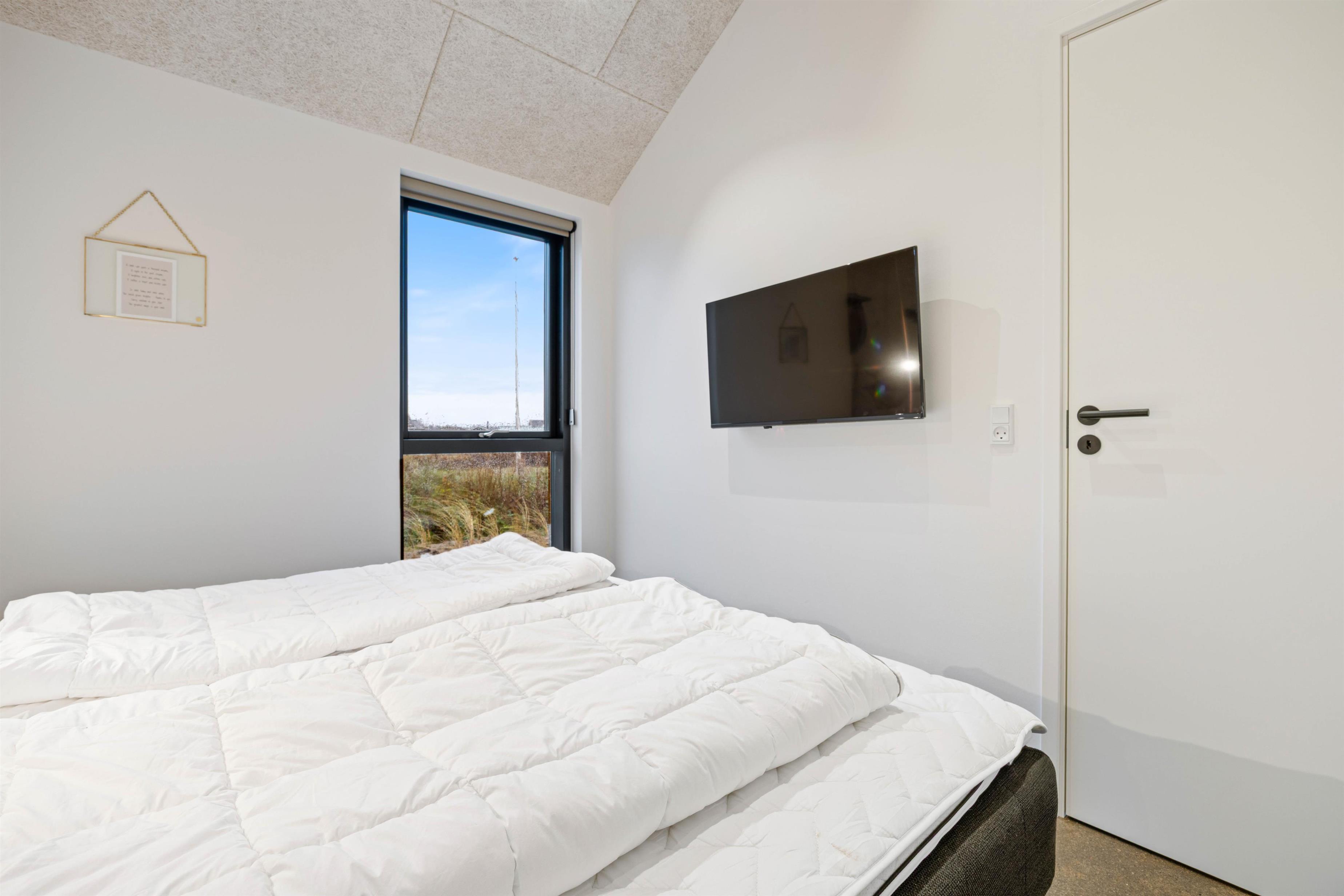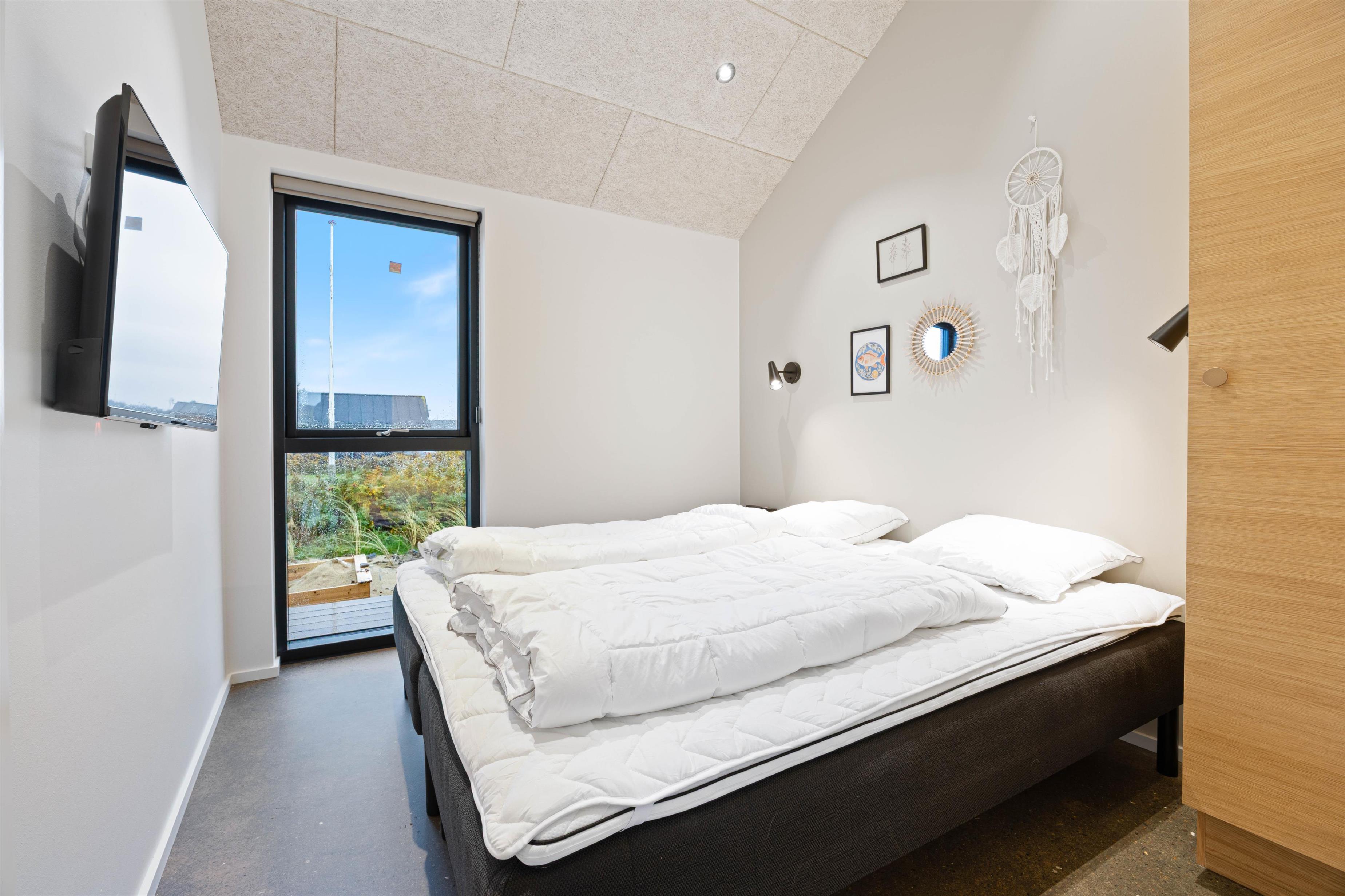 Det moderne køkken gør madlavningen enkel og bekvem med både opvaskemaskine og en 85-liters fryser – ideelt, når ferien skal være afslappende og praktisk. Efter dagens oplevelser venter de 4 lyse soveværelser: 3 med dobbeltsenge og 1 med 2 køjesenge, hvor store vinduer sikrer et roligt og behageligt lysindfald, der skaber de perfekte rammer for en god nats søvn.