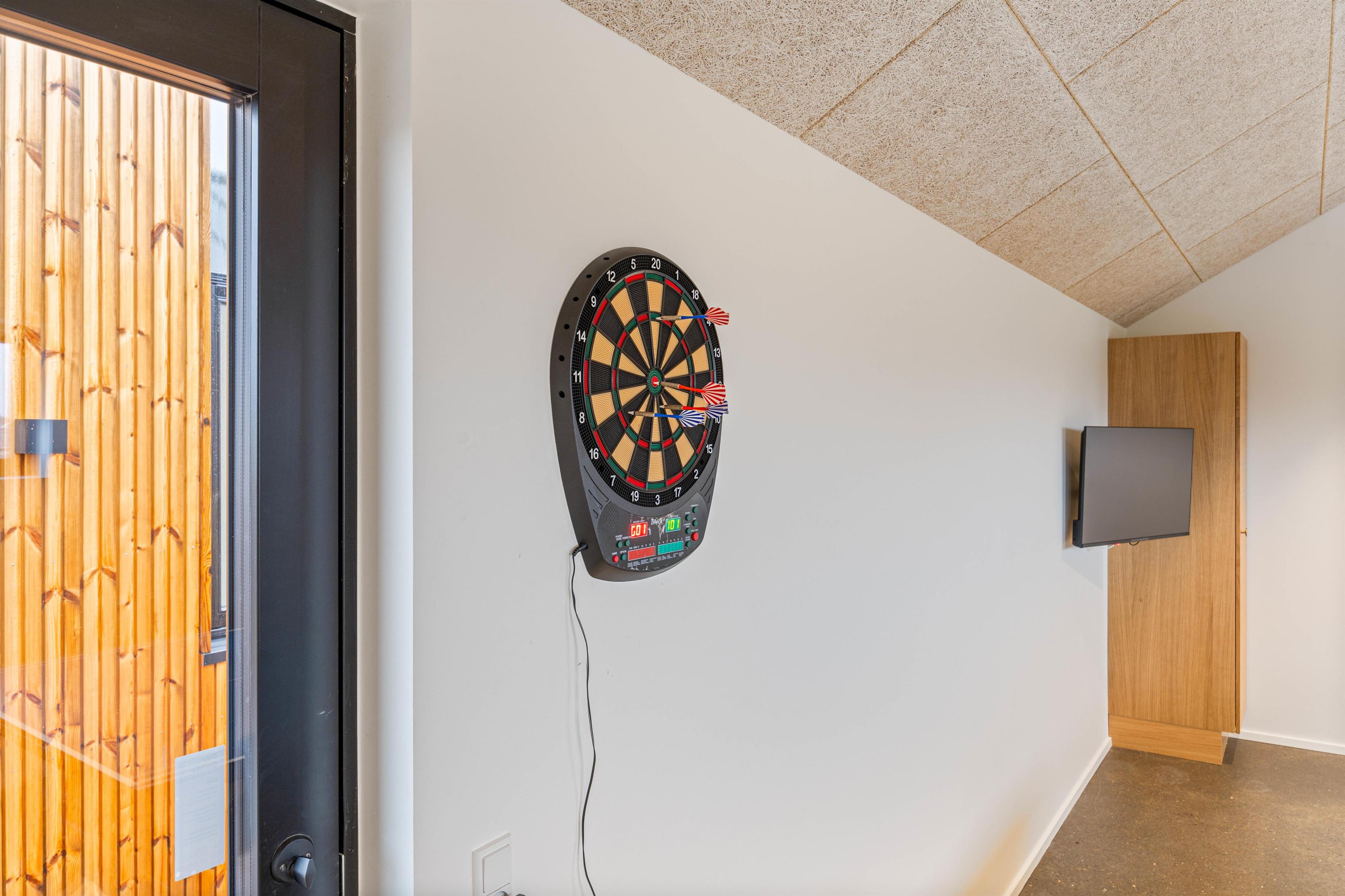 Trænger I til en pause fra afslapningen, byder sommerhuset også på et aktivitetsrum med bordtennis og dartspil, der skaber masser af sjov og spænding for både børn og voksne.