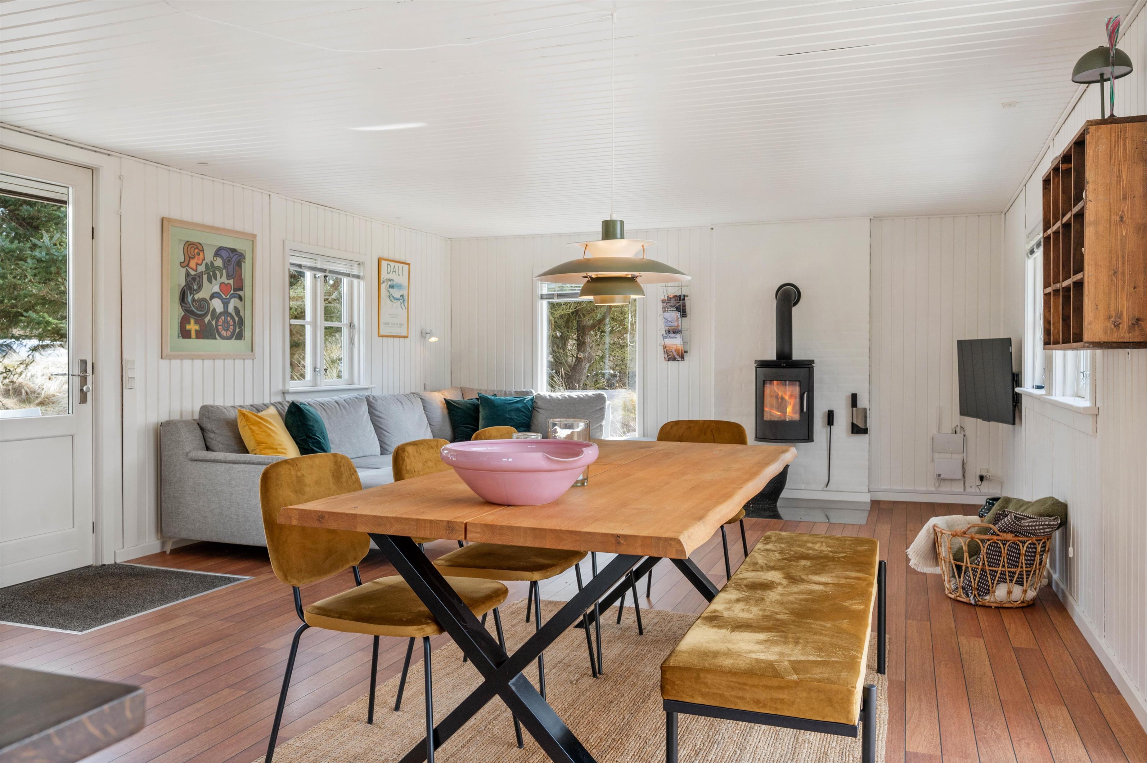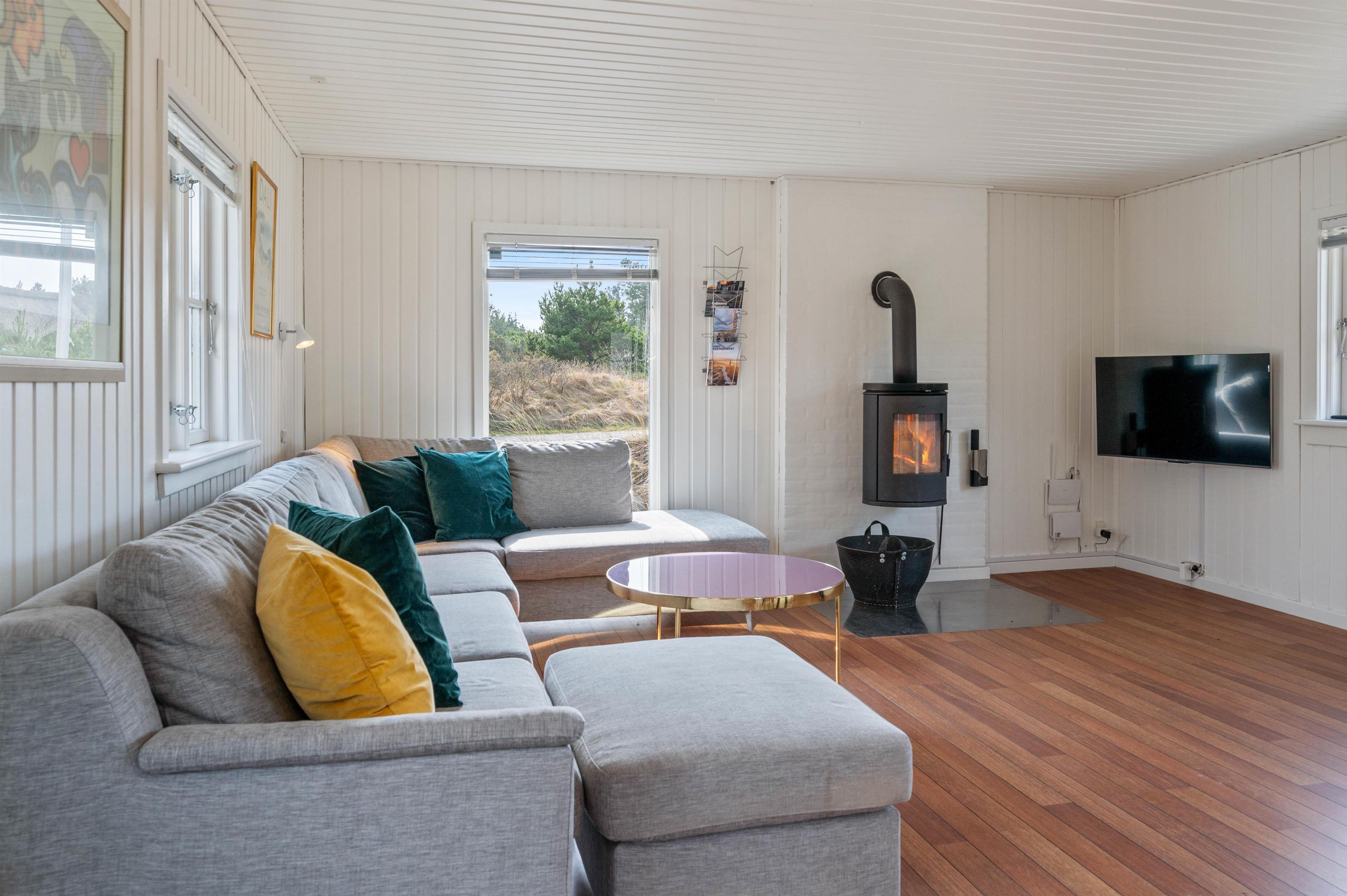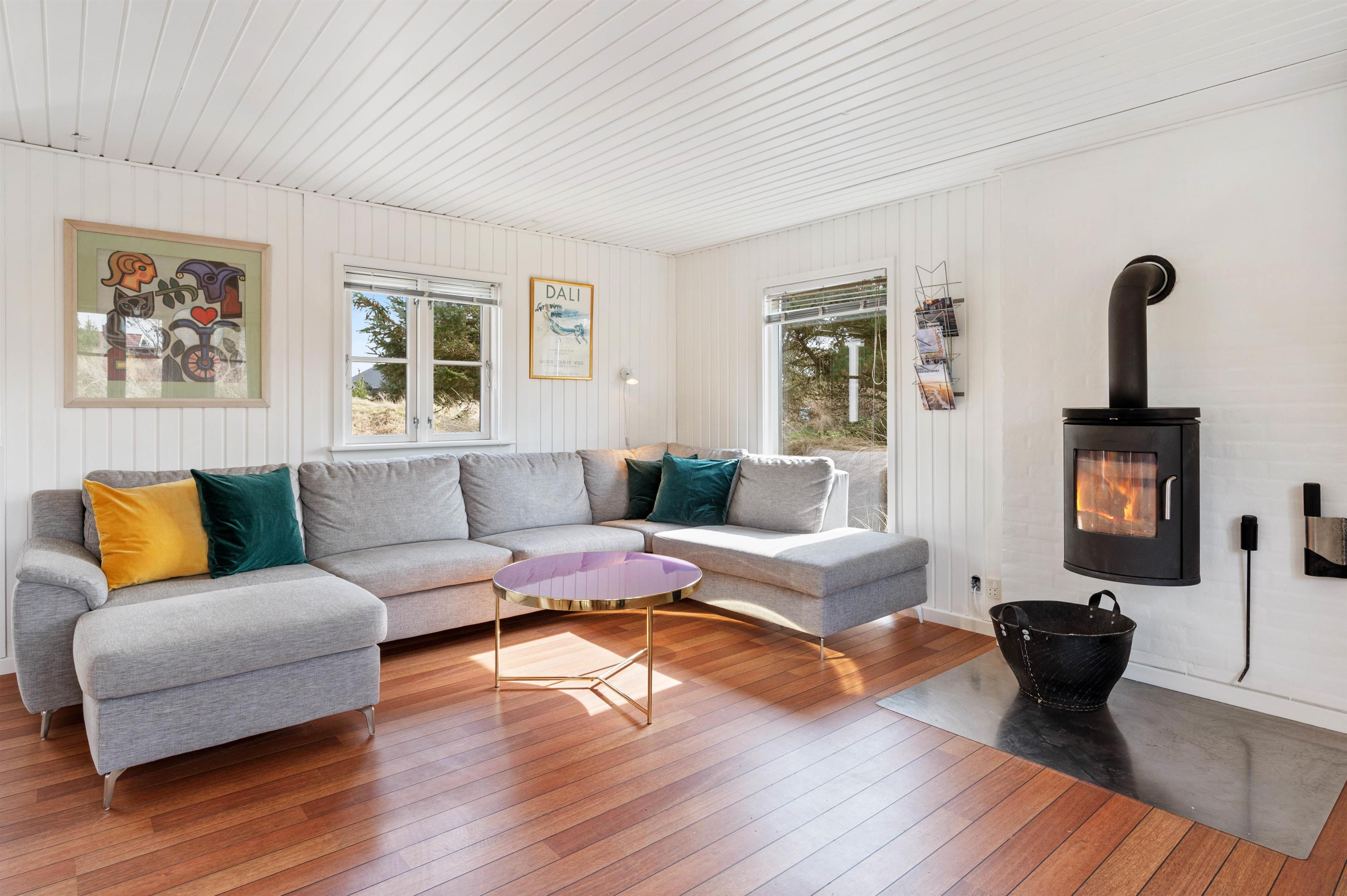 Lige så snart I træder ind ad hoveddøren her, vil I straks føle jer hjemme og godt tilpas. Her har man virkelig lyst til at holde ferie og komme helt ned i gear. Opholdsrummet byder på en hyggelig atmosfære, og på de koldere feriedage har I mulighed for at tænde op for brændeovnen, som bidrager til en ekstra god feriestemning. Er brændeovnen ikke i gang, har I mulighed for at benytte jer af den energibesparende luft-til-luft varmepumpe eller elvarme.
