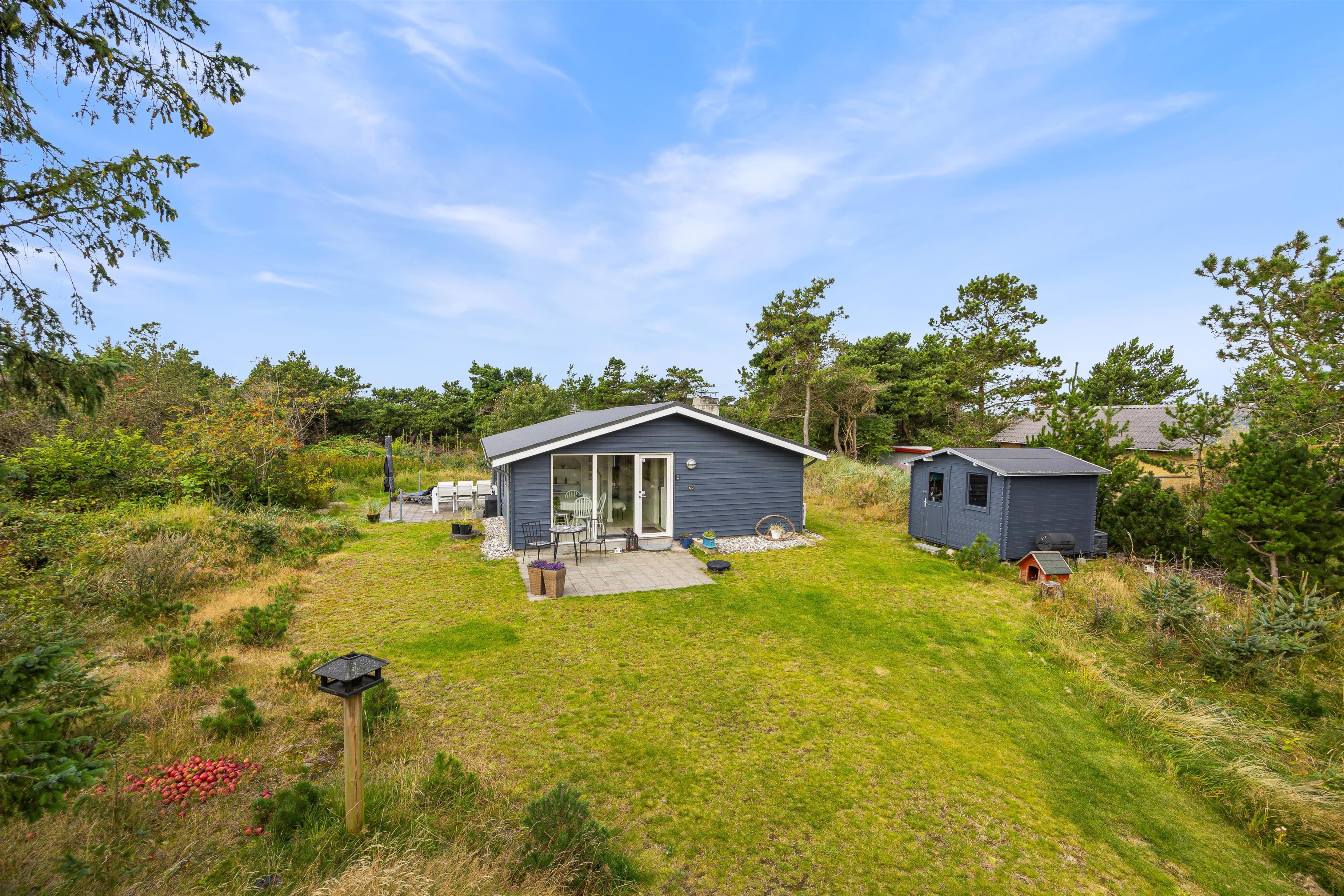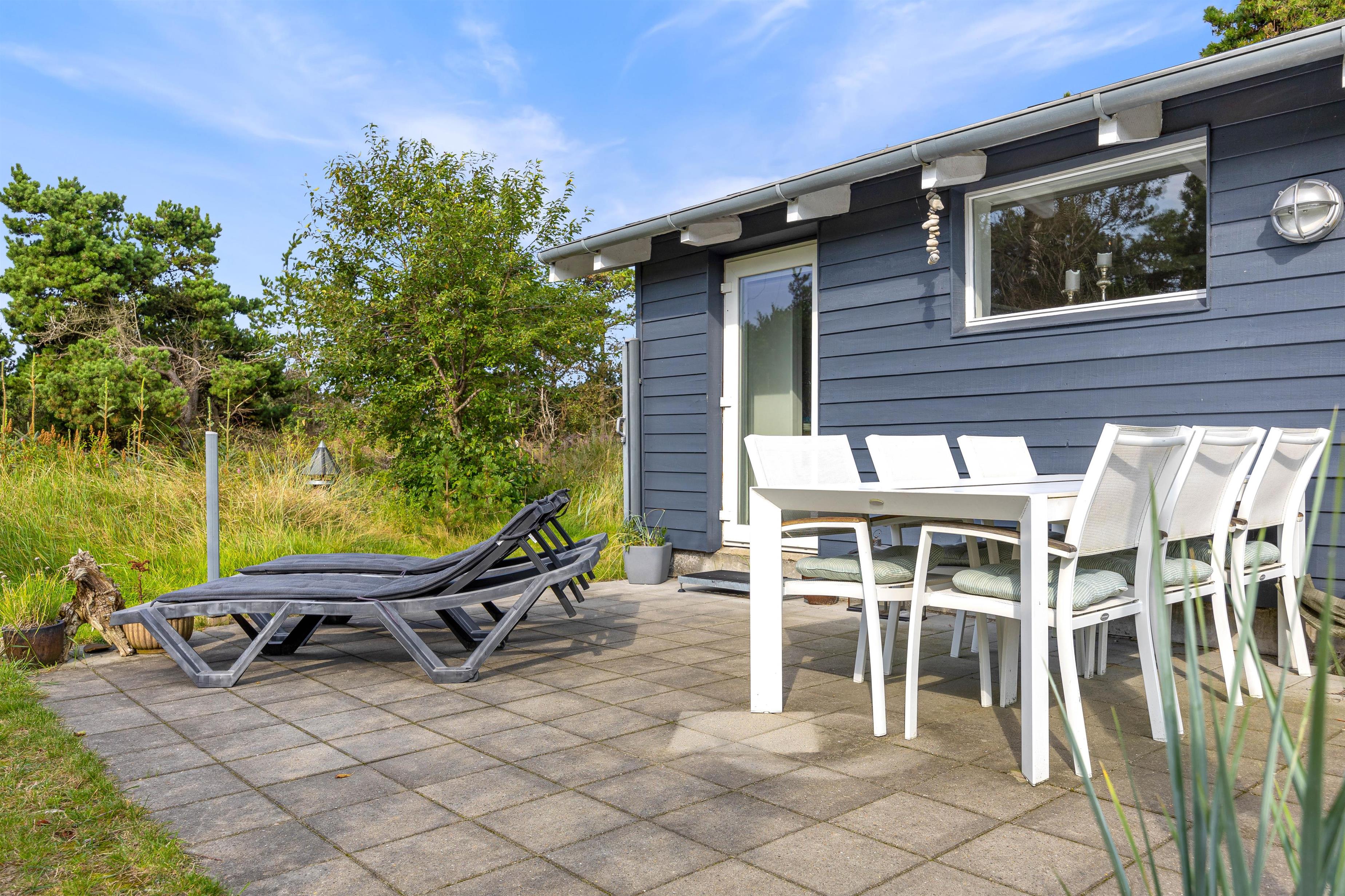 Fra stuen er der direkte udgang ud til en lille terrasse. På den dejlige terrasse kan der rigtigt hygges – der er god mulighed for at finde den perfekte plads i solen eller skyggen til hele familien og naturligvis familiens hund. Her sidder I midt i naturen og er helt og aldeles uforstyrret. En dejlig hyggeaften på terrassen med grillen tændt og feriestemningen er garanteret.