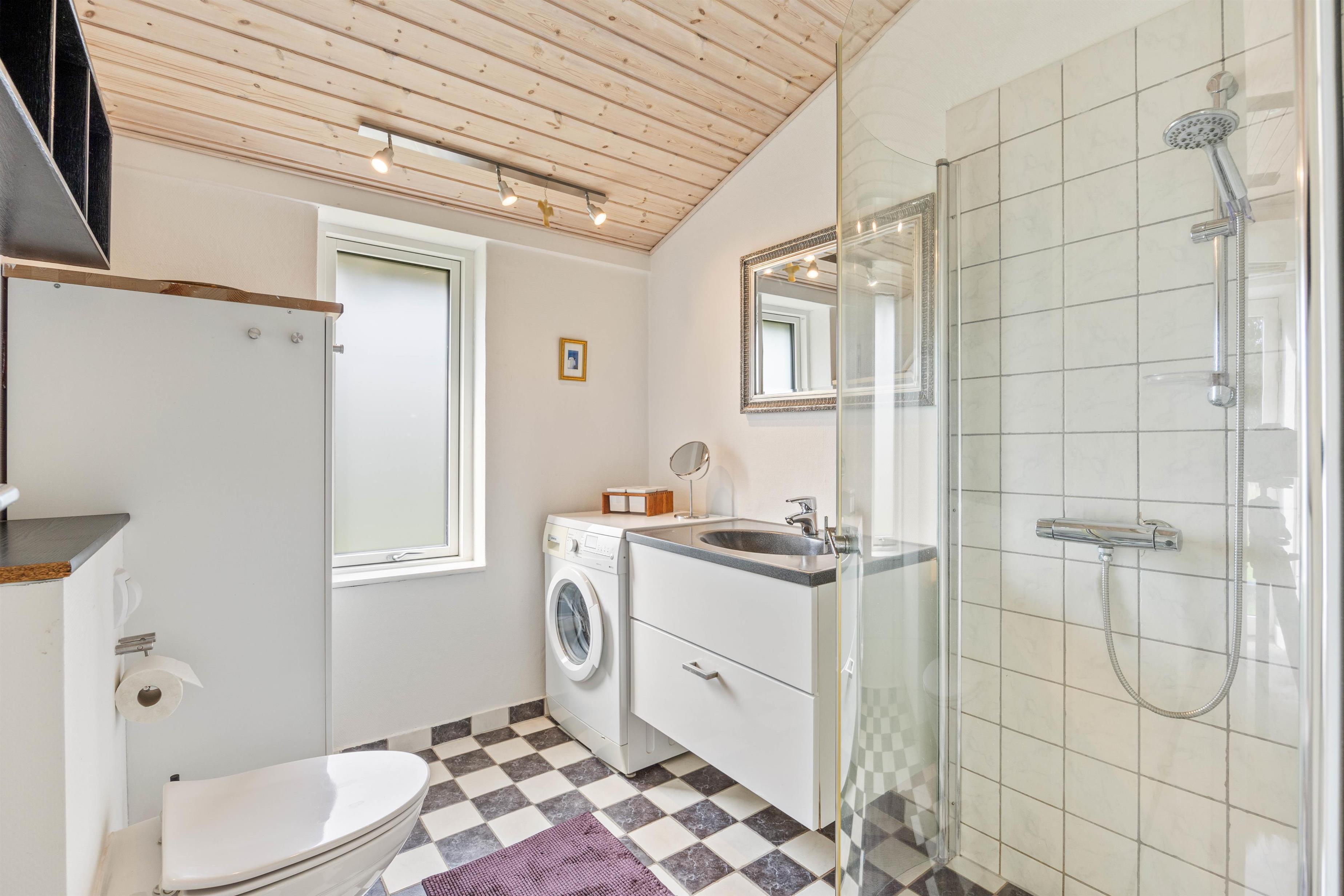 Sommerhuset er indrettet med opvaskemaskine. I det fine badeværelse er der gulvvarme og i hele huset er der en god internetforbindelse. Den energibesparende varmepumpe sikrer også på køligere dage lave ferieomkostningerne.