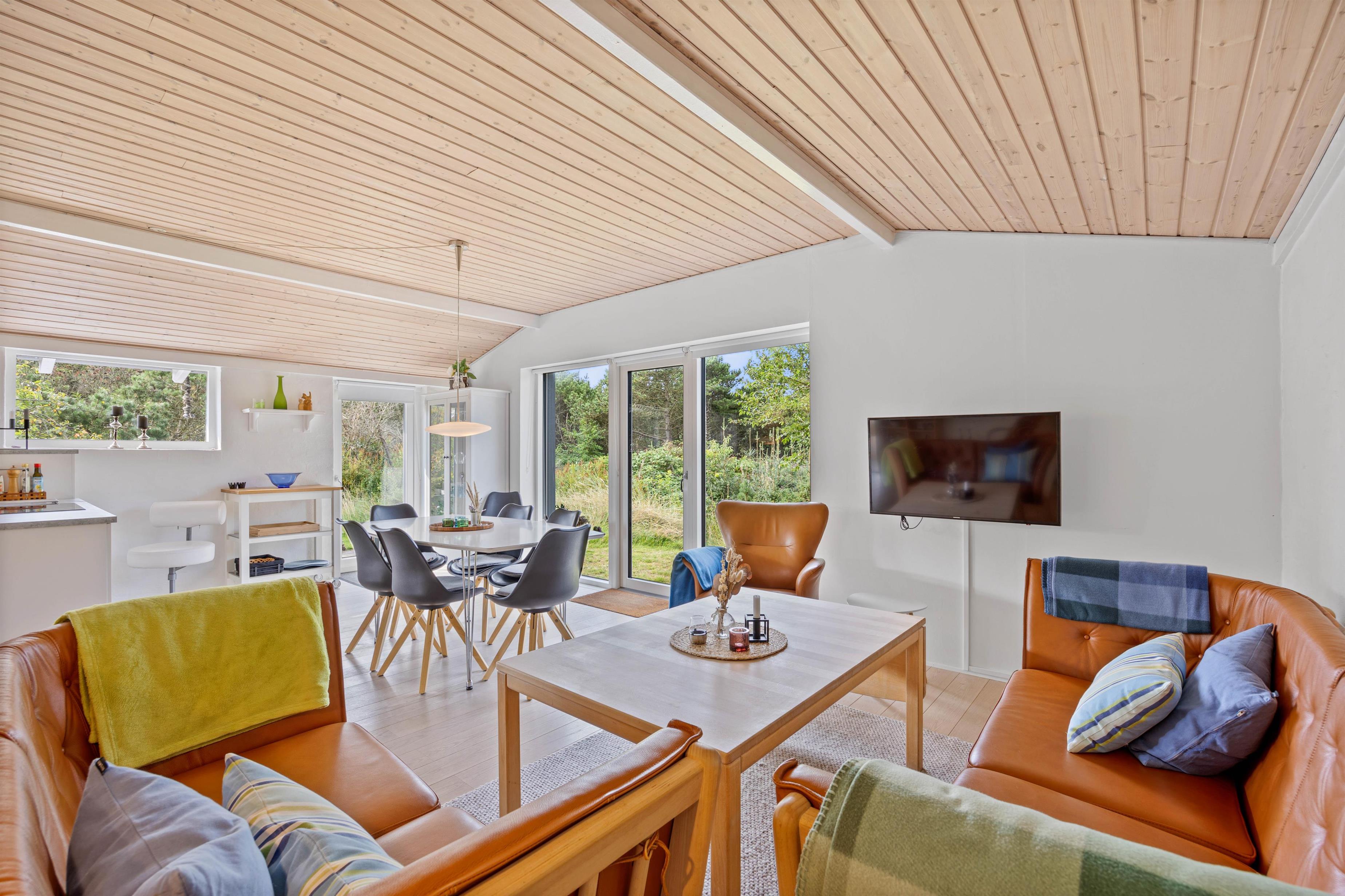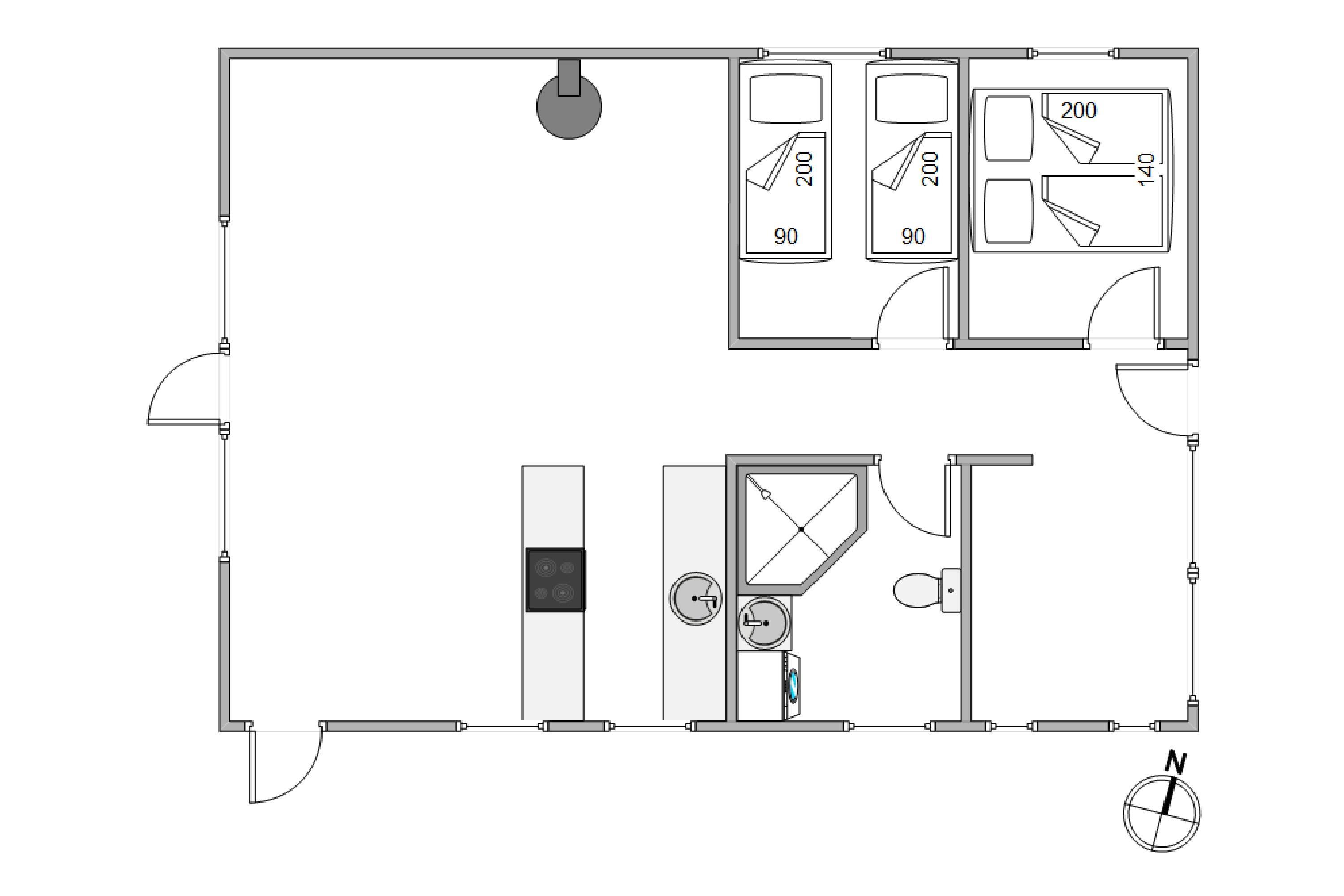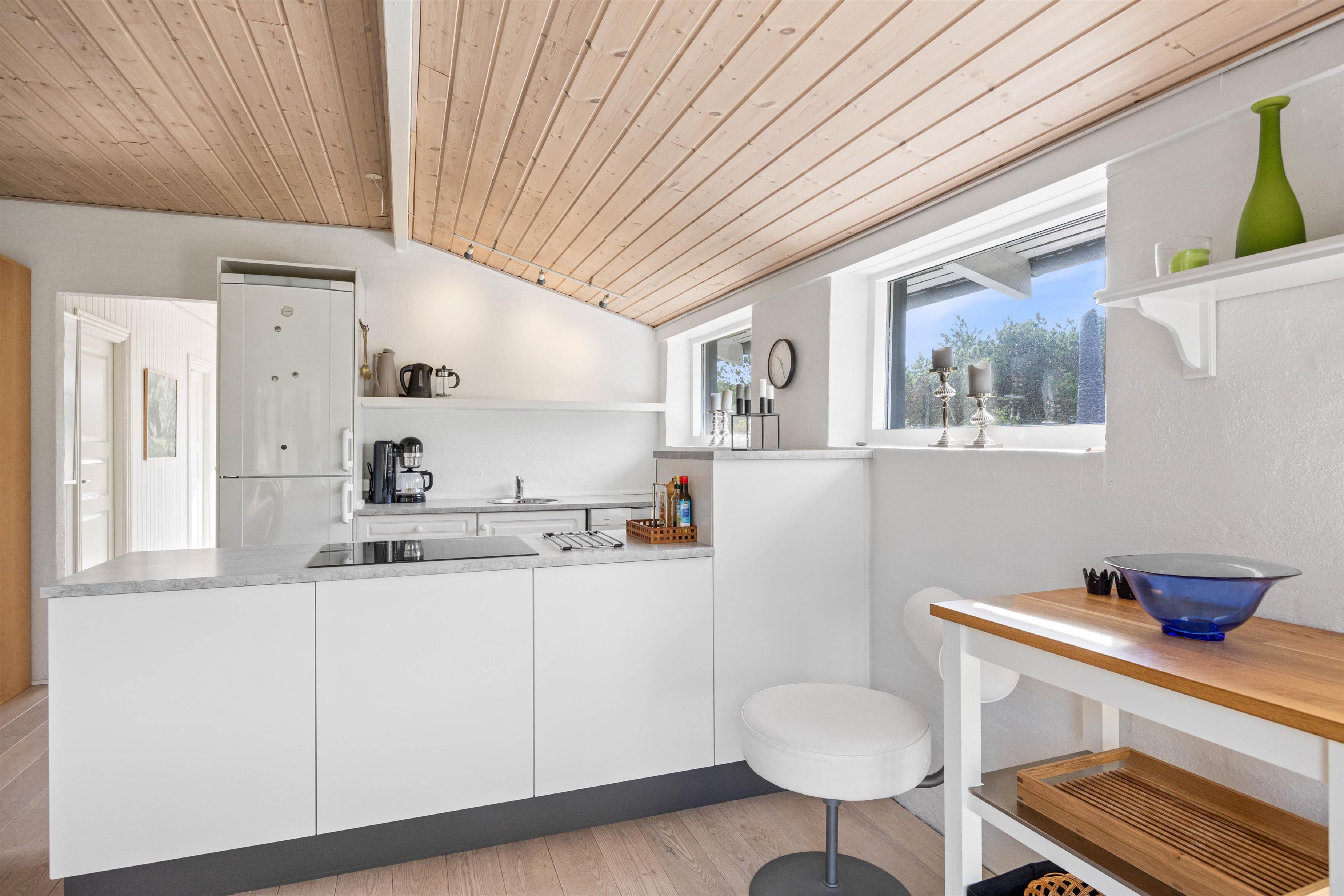 Sommerhuset byder på 80m2, der omhyggeligt er indrettet for at give jer maksimal komfort og hygge. Her er to hyggelige soverum, der indeholder en dobbeltseng og to enkeltsenge, og derved sikrer god nattesøvn uanset fordelingen. I kan nyde den hjemlige atmosfære i stuen, hvor en brændeovn skaber varme og hygge på køligere aftener. Sommerhuset er også udstyret med en opvaskemaskine og vaskemaskine, så I kan nyde mere tid sammen uden at tænke på praktiske gøremål.