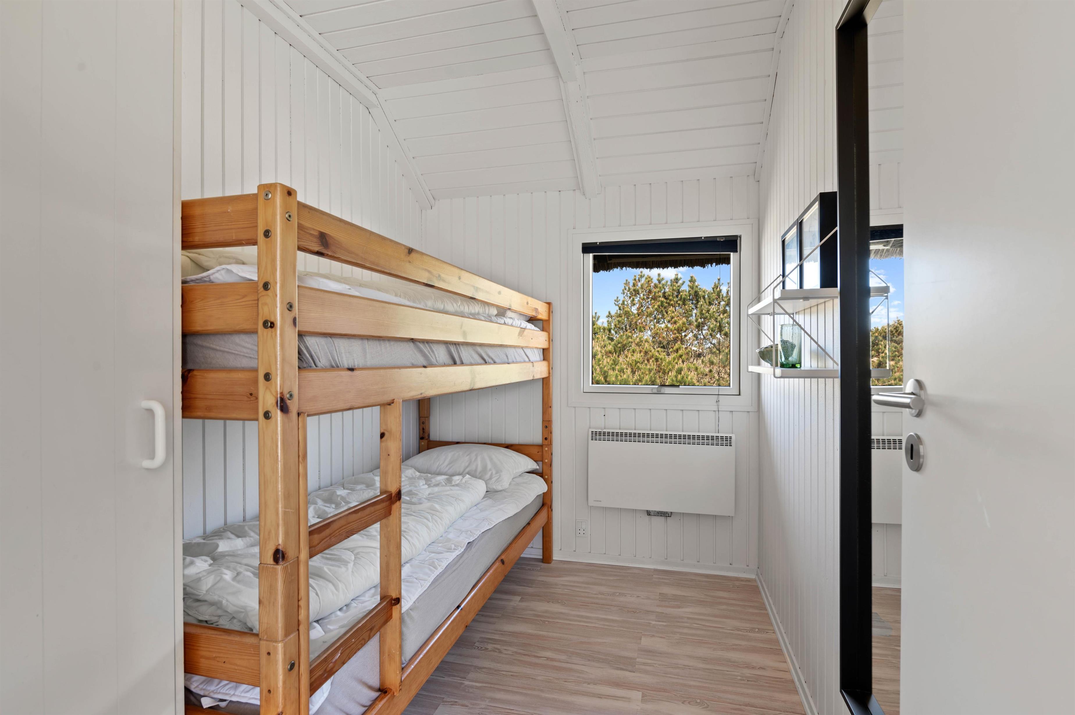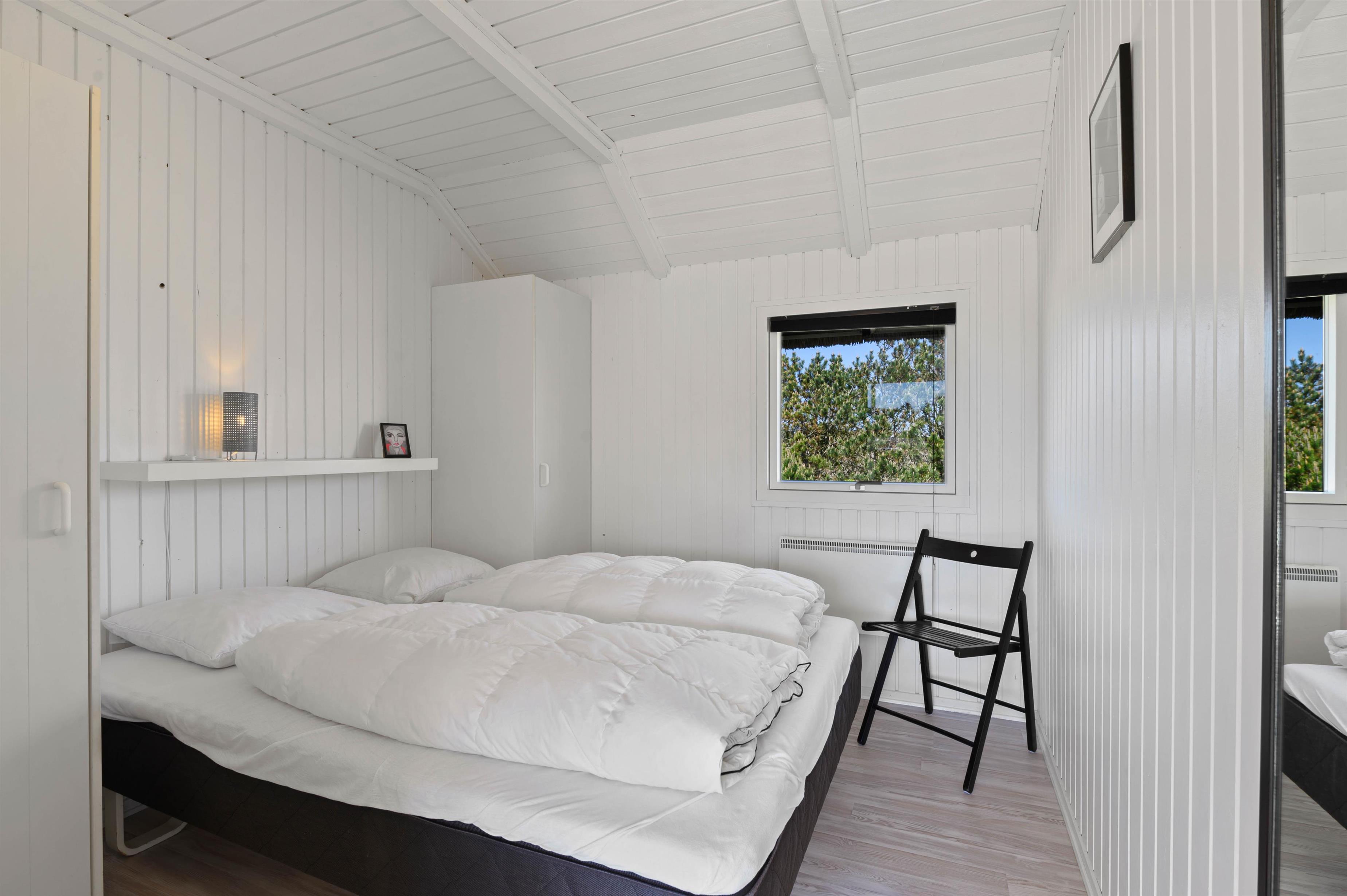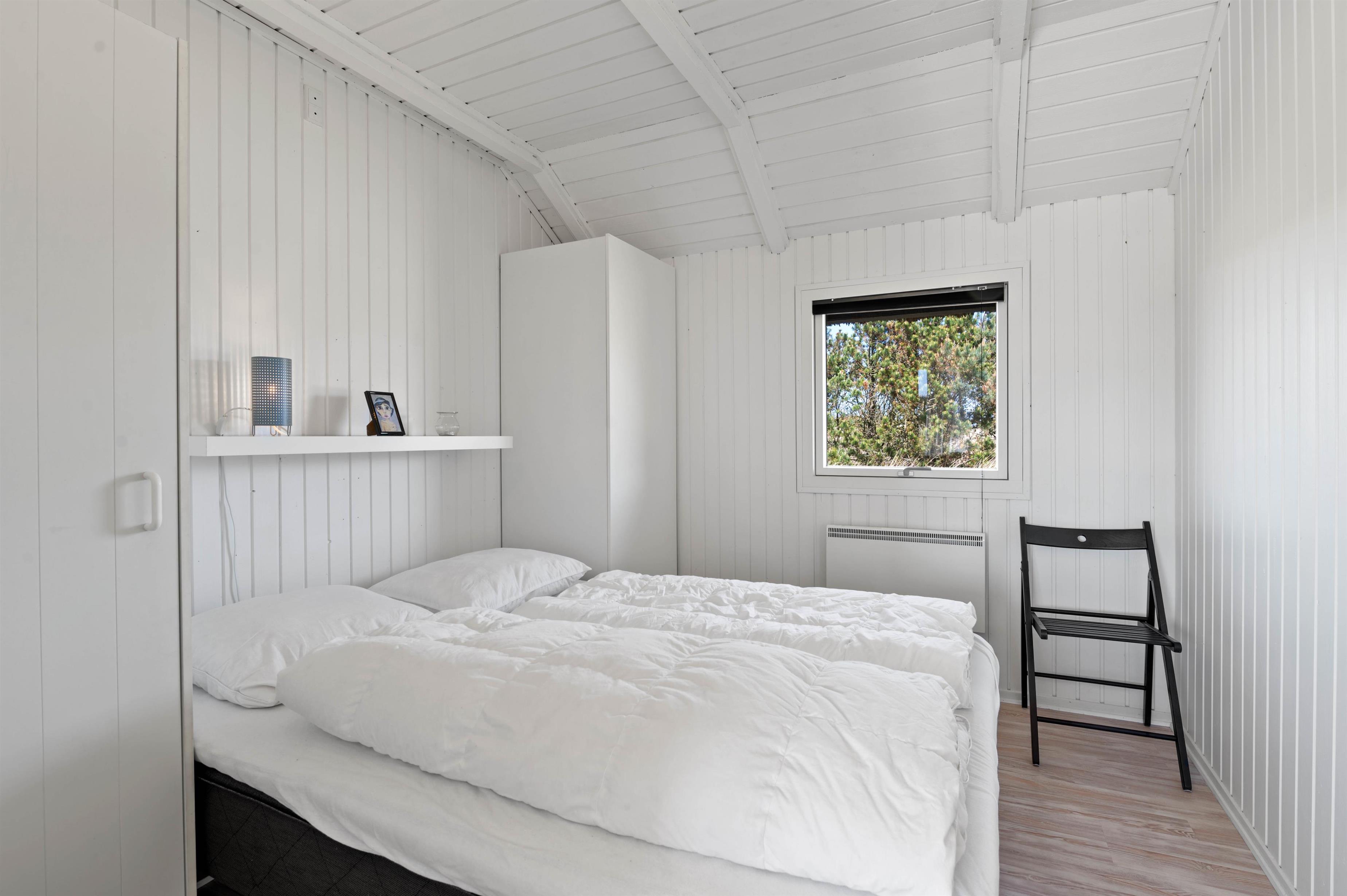 På sommerhusets 98 kvadratmeter finder I 3 gode soveværelser, som alle har hvidmalede trævægge og trælaminatgulve. 2 af soveværelserne er indrettet med en dobbeltseng hver, og det tredje soveværelse er indrettet med en etageseng.
