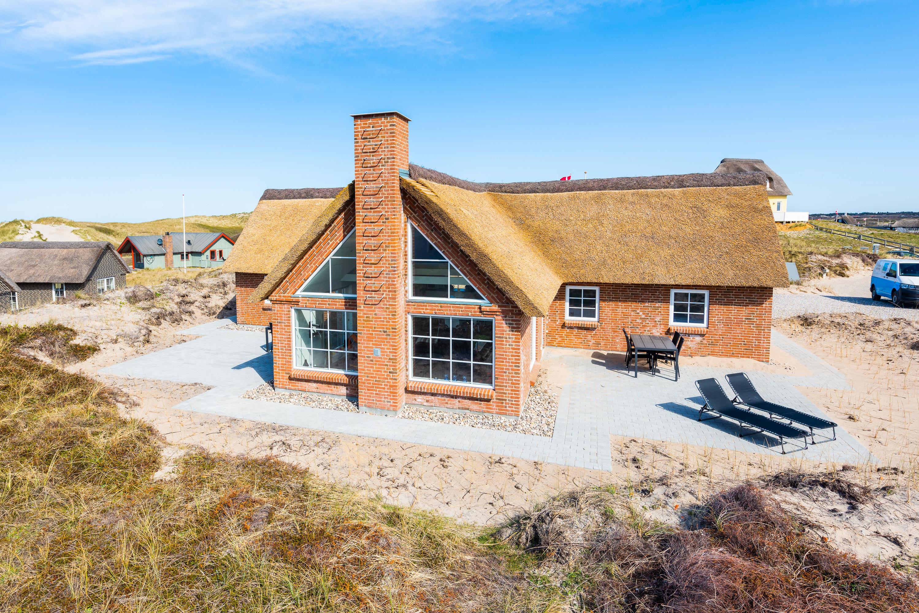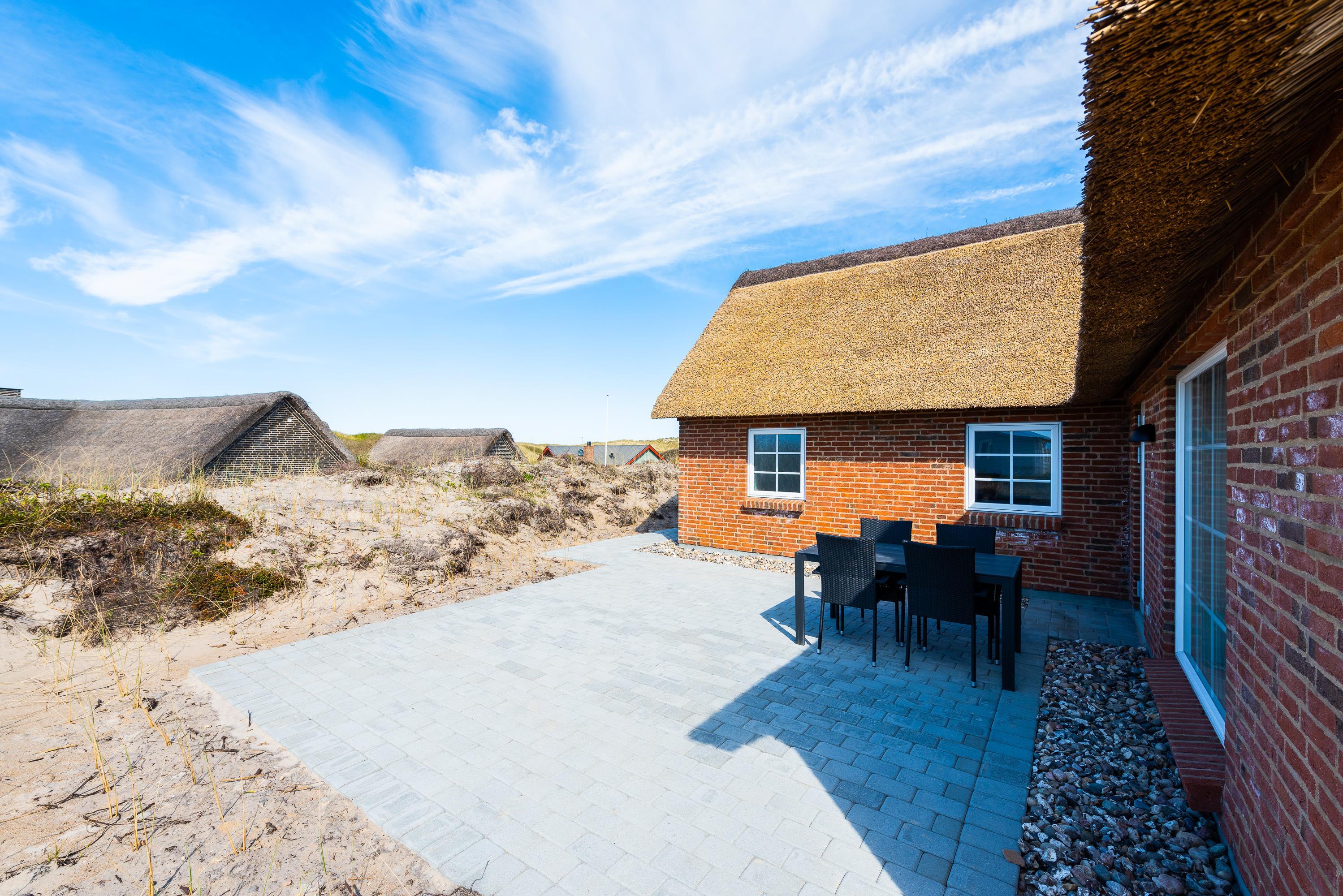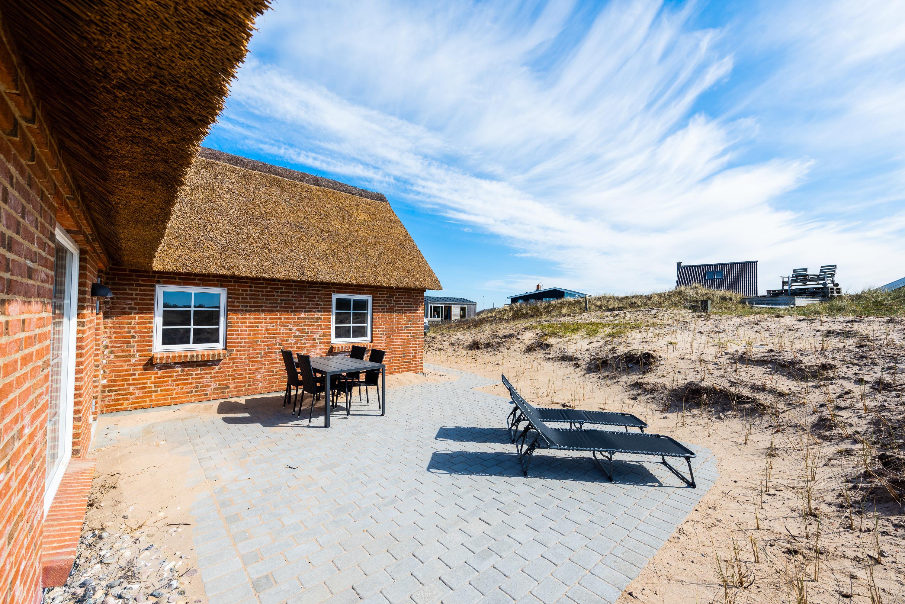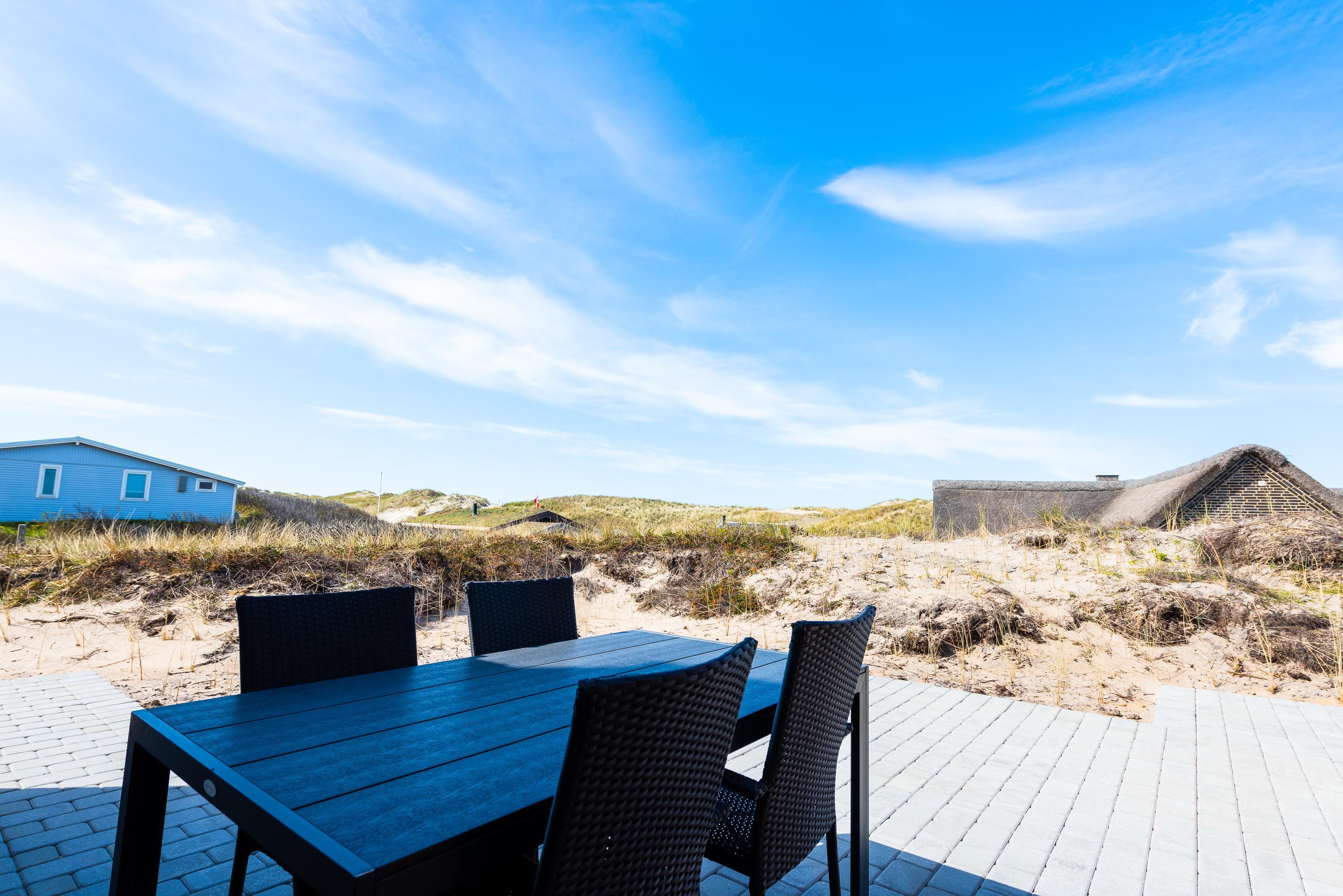 Rundt om sommerhuset går en dejlig terrasse til solbadning i liggestolene. Der er selvfølgelig en grill, så I kan spise en lækker middag rundt om havebordet på de dejlige lune sommeraftener. Sommerhusets beliggenhed er helt fantastisk. Vesterhavet ligger kun 150 meter væk, og på en stille dag kan I nærmest høre bølgernes brusen, når I sidder på terrassen. Den kilometerlange sandstrand indbyder til lange gåture i den friske havluft, og både børnene og hundene vil elske at udforske stranden.