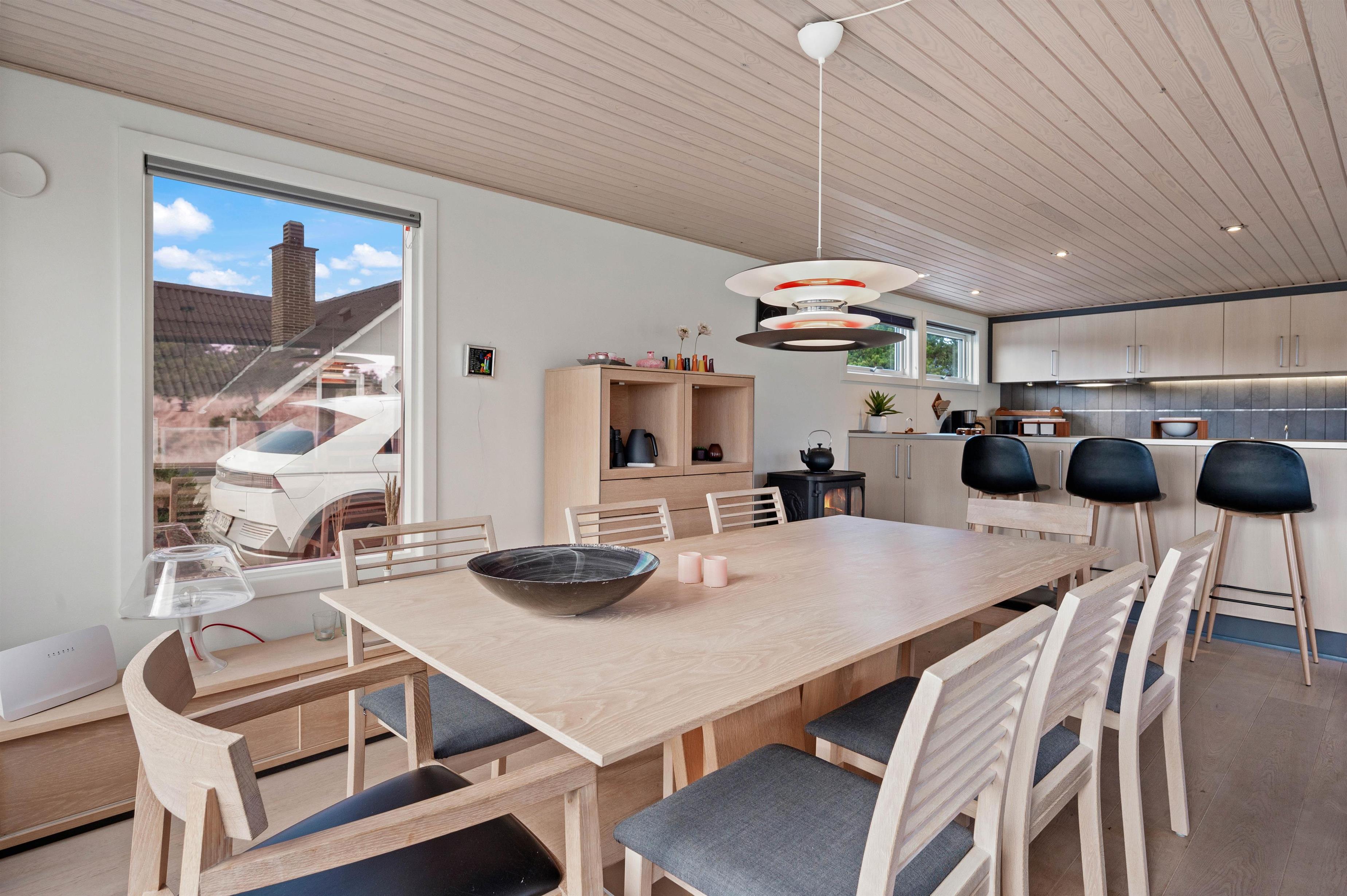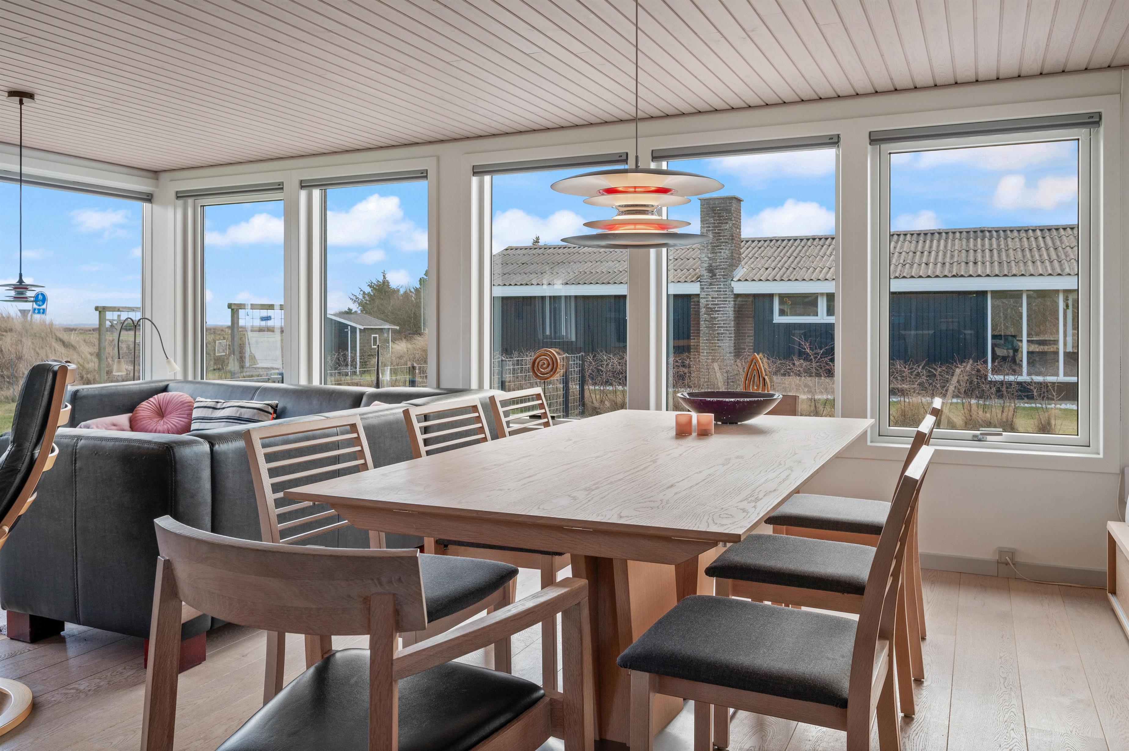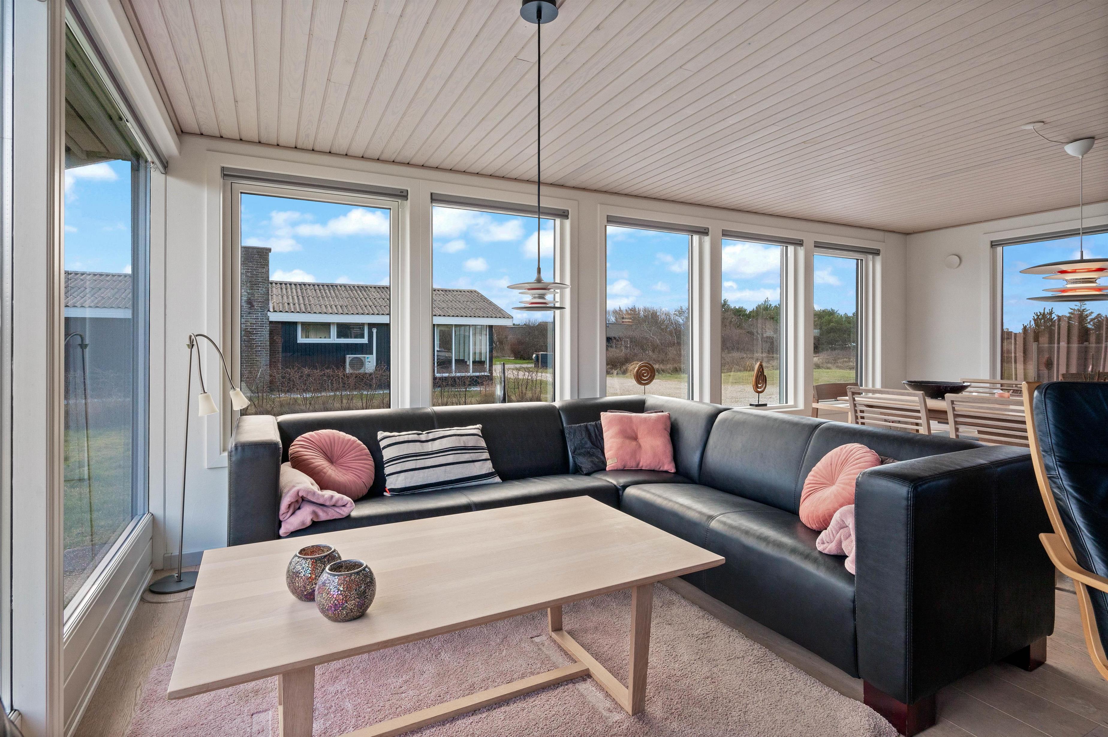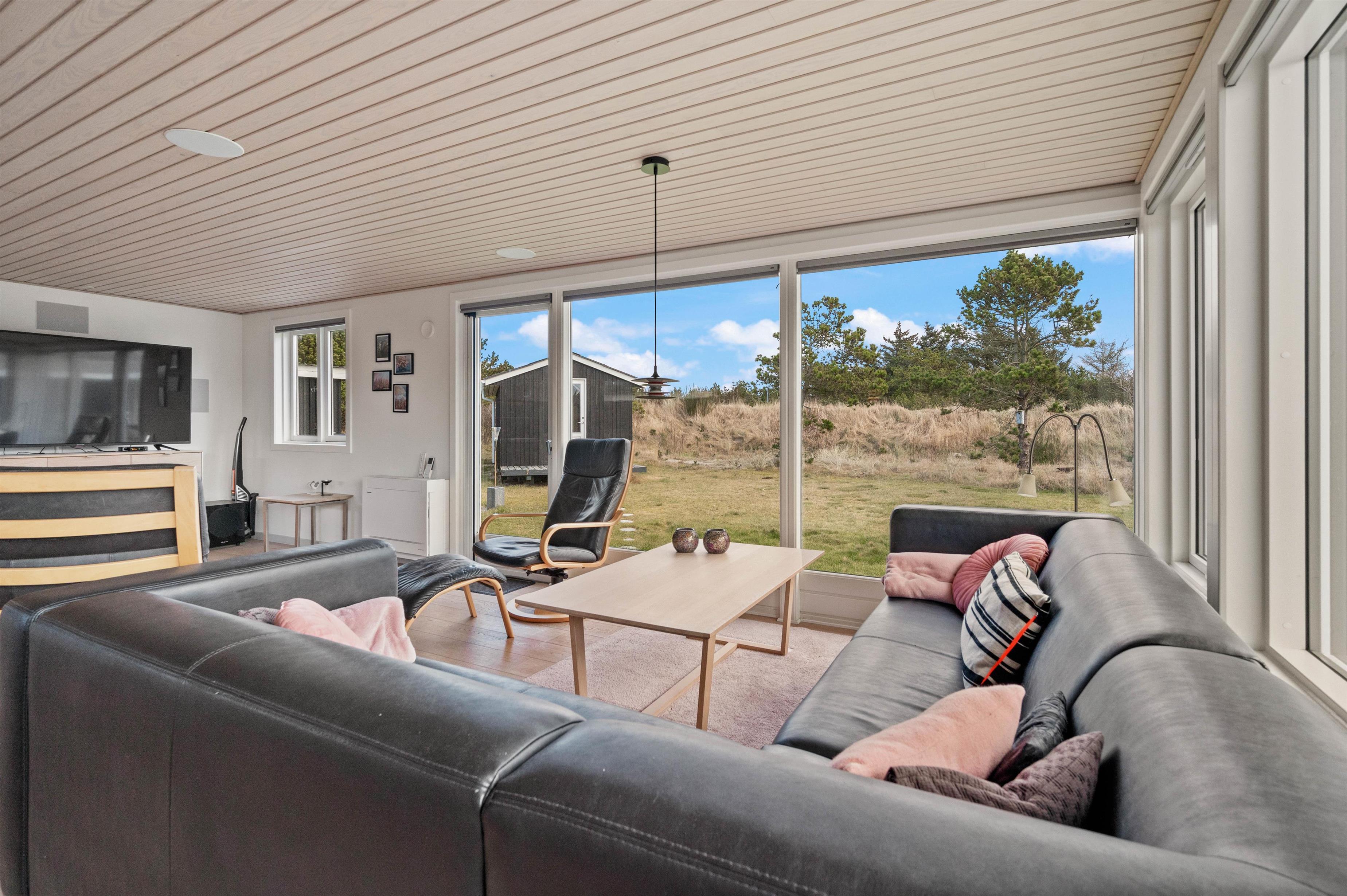 Feriehusets hjerte er det åbne alrum, der uden tvivl kommer til at danne rammer om en masse mindeværdige feriestunder. Mens de store vinduesfronter giver jer et dejligt lysindfald og inviterer den vestjyske natur indenfor, sørger brændeovnens knitrende ild for både varme og idyllisk feriestemning.