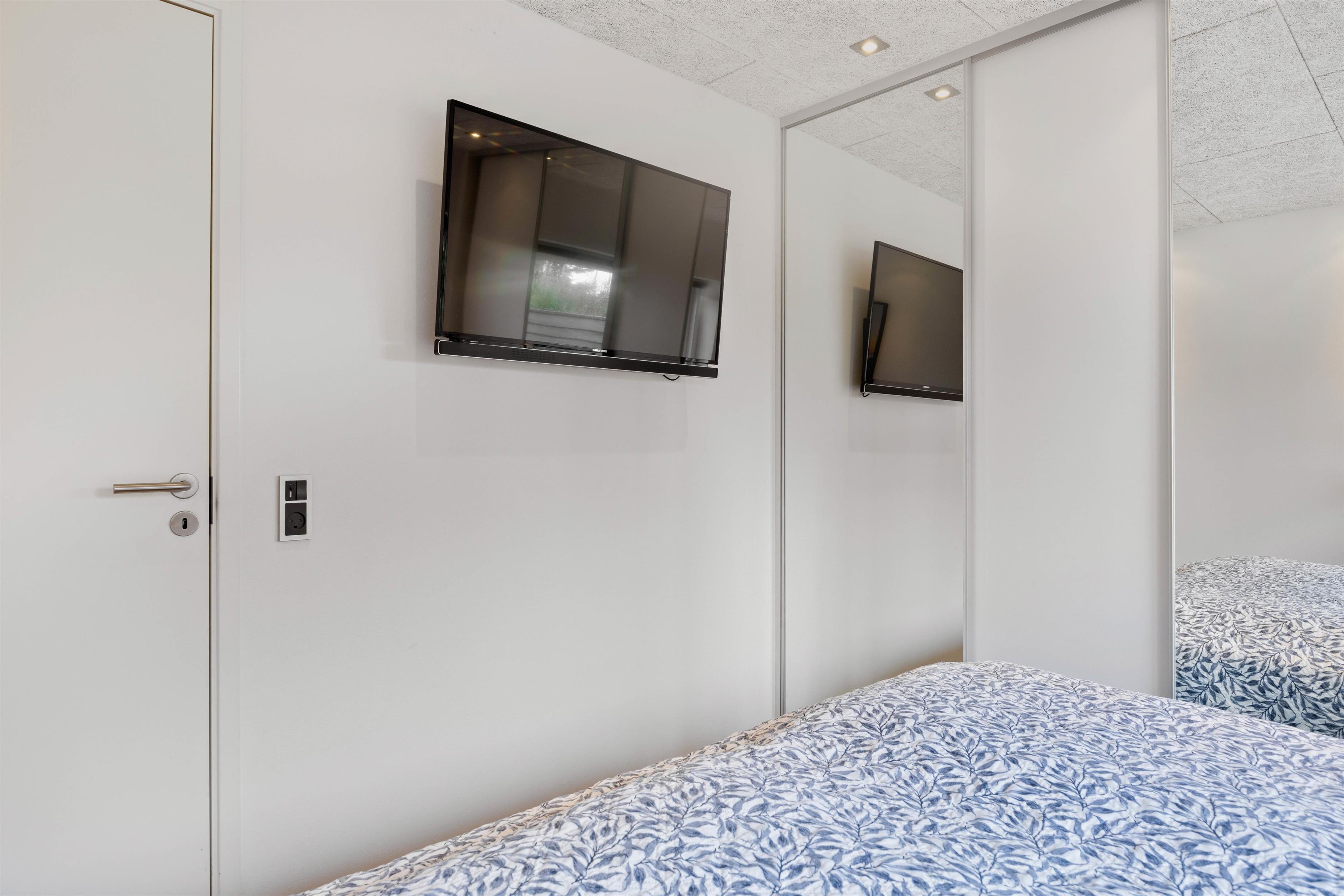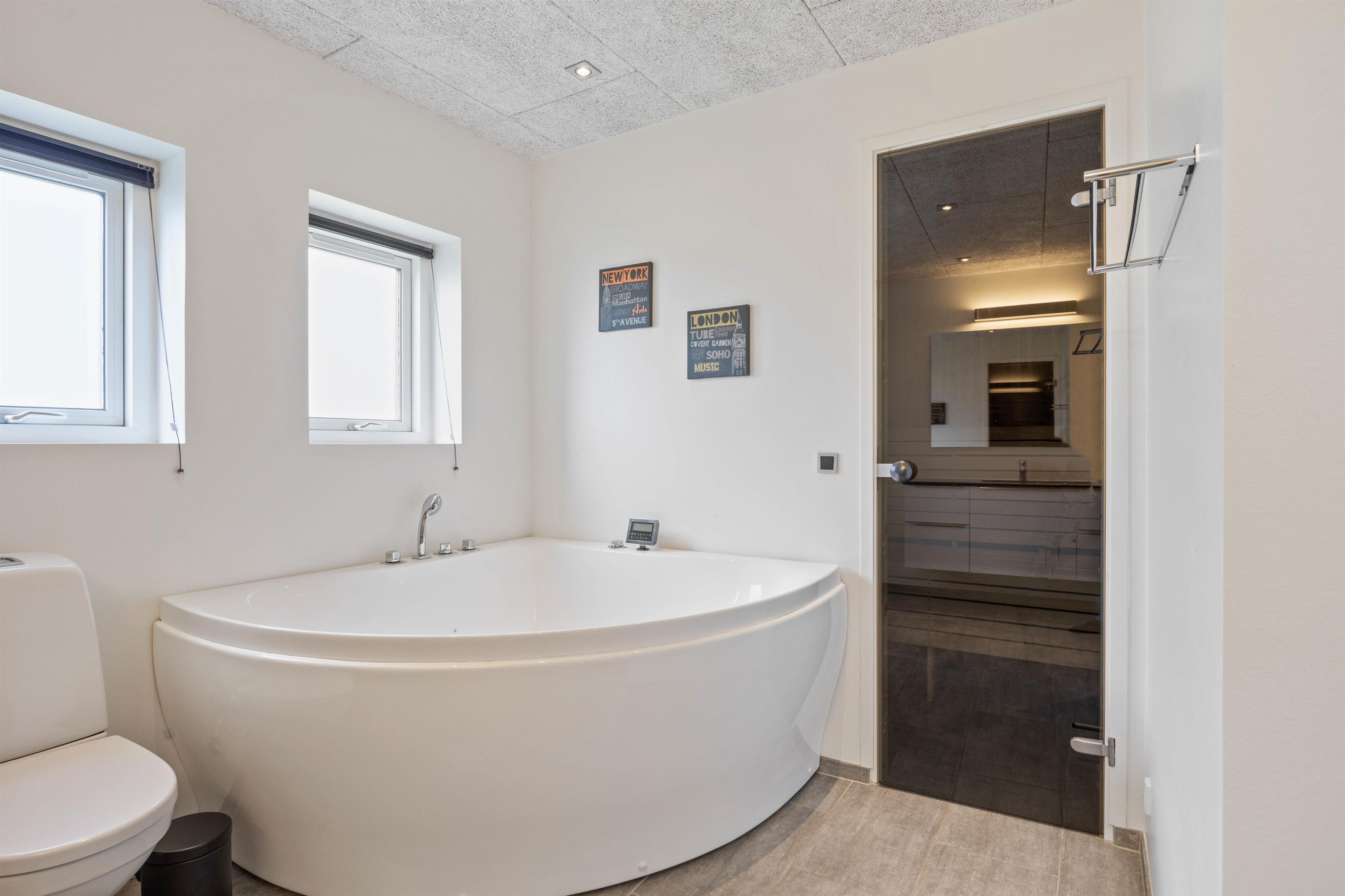 To af de tre soveværelser har eget tv, og huset har to badeværelser, det ene med direkte tilgang fra soveværelset. På det største badeværelse finder I den lille wellnessoase med sauna og spabad, hvor I kan tanke nye kræfter efter en gåtur langs vandet.