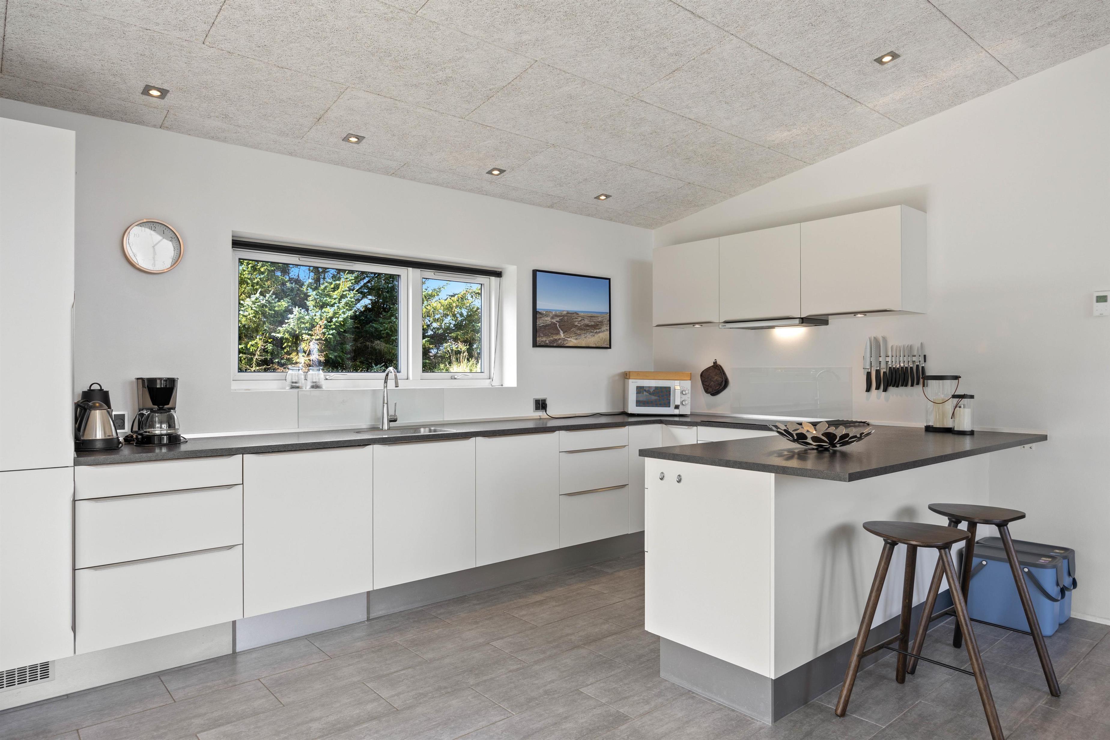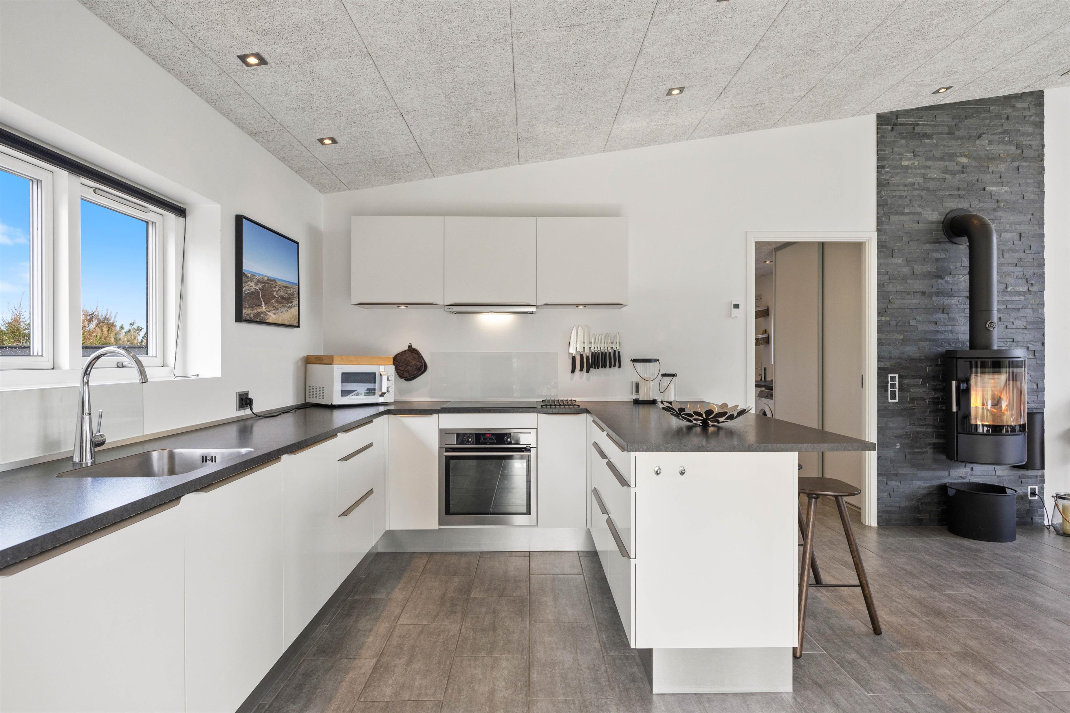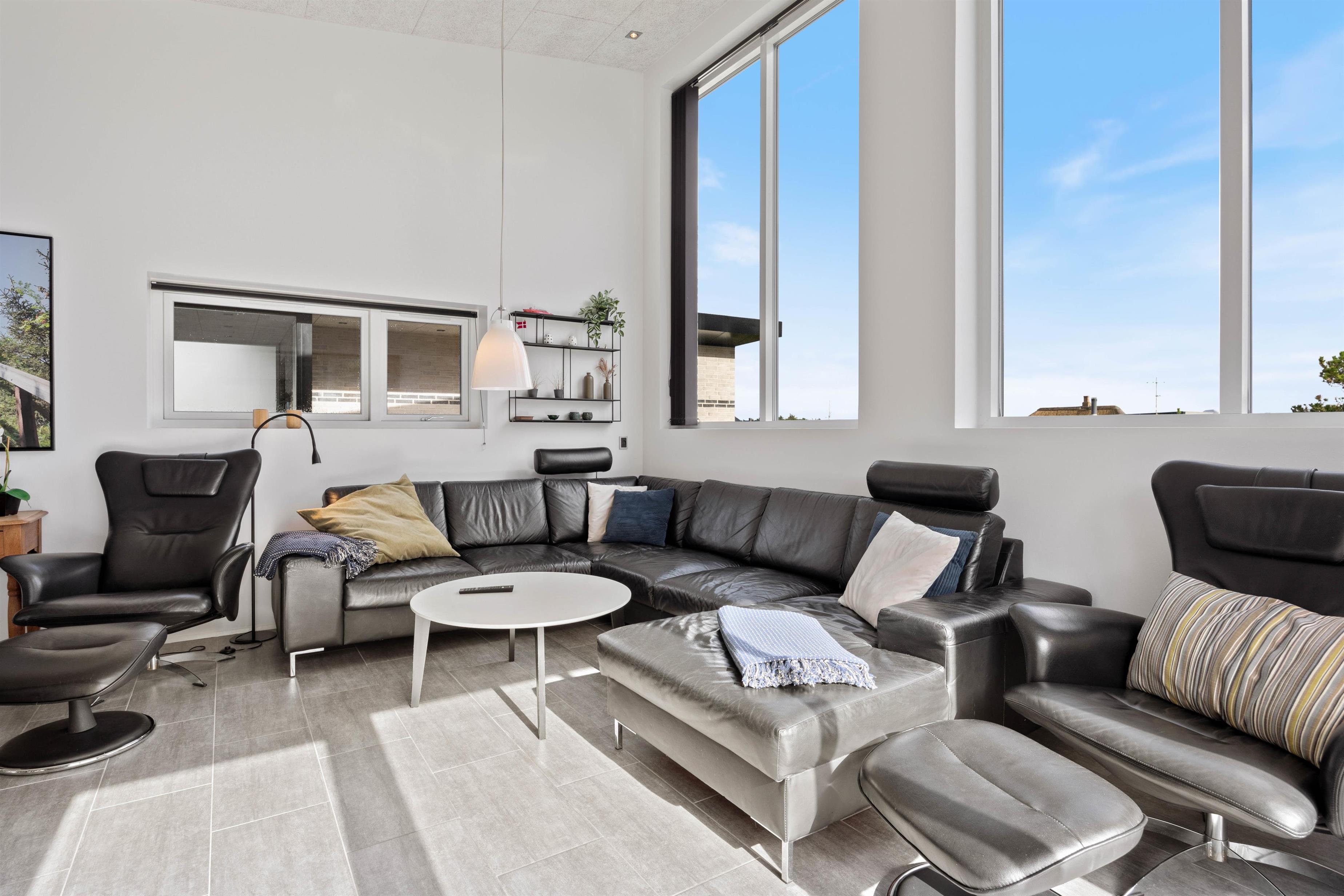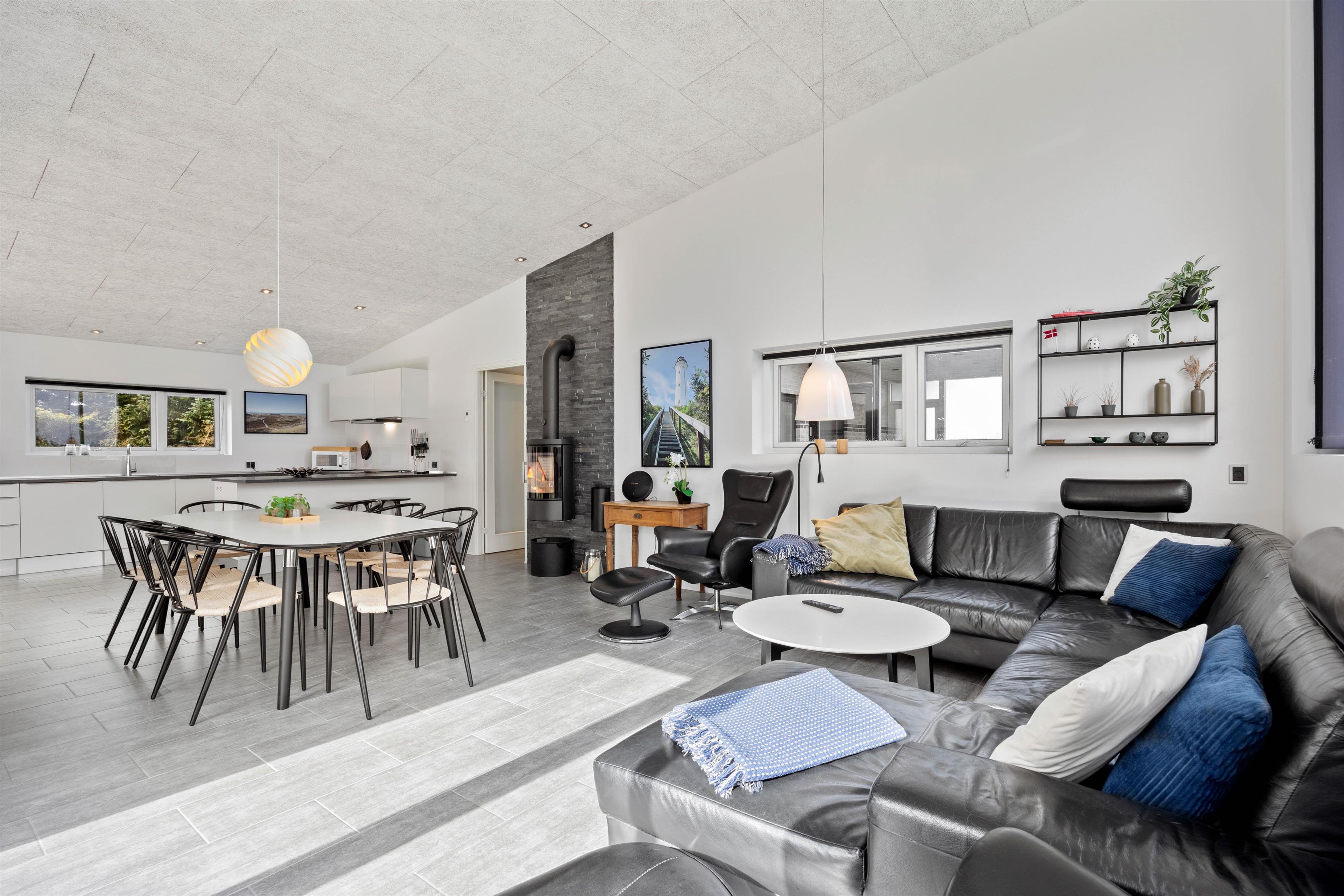 Stuen ligger i forlængelse af køkkenalrummet, hvilket skaber et stort fællesrum, hvor I kan samles til et hav af hyggelige feriestunder. Den klassiske brændeovn spreder varme og hyggelig feriestemning i de kolde feriemåneder, og i det veludstyrede køkken har I alt, hvad I skal bruge, for at lave en lækker feriemiddag.De mange store vinduespartier i stuen er med til at skabe en wow-effekt, som I ikke kan opleve i mange huset. De lukker samtidig også en masse lys ind, som bidrager til den positive og gode atmosfære der er i huset.