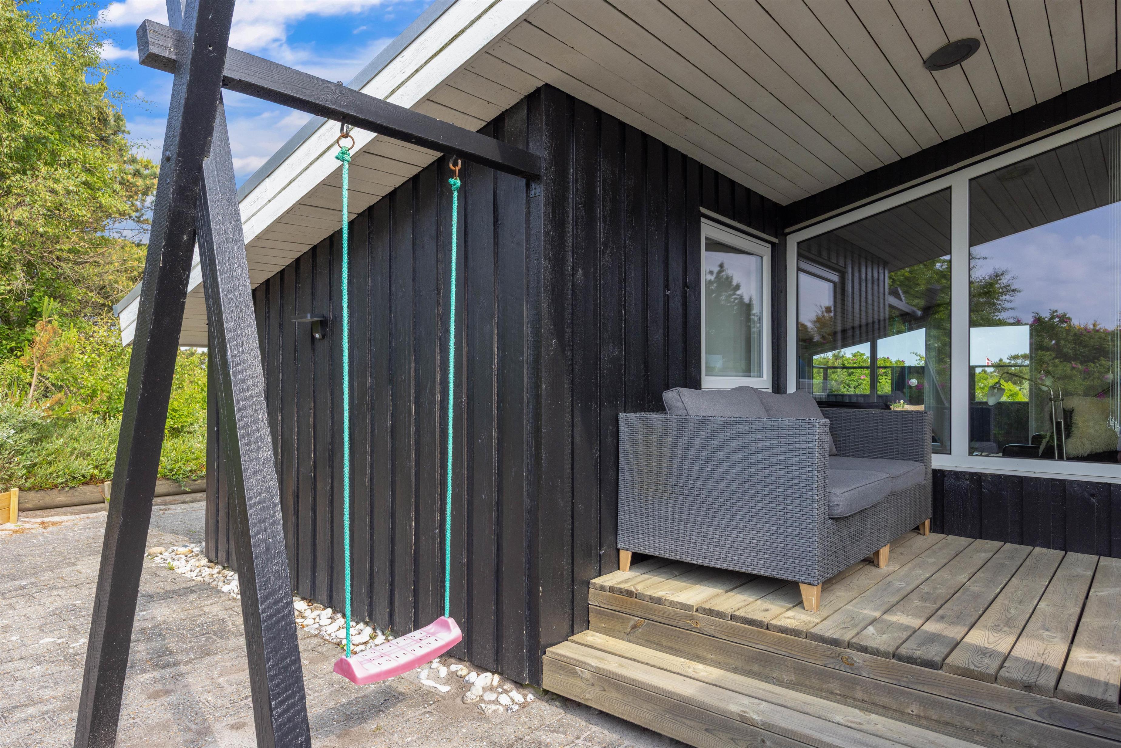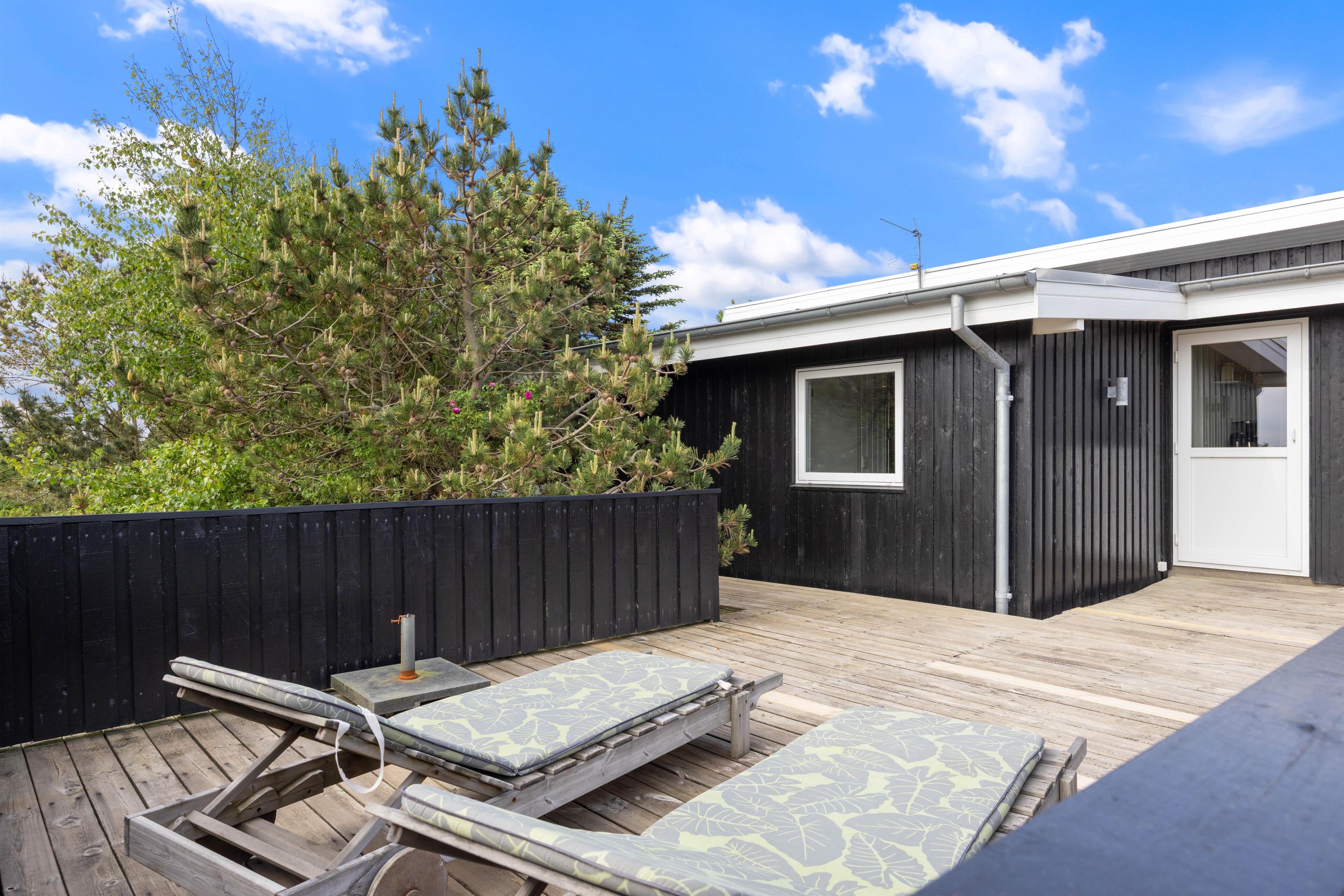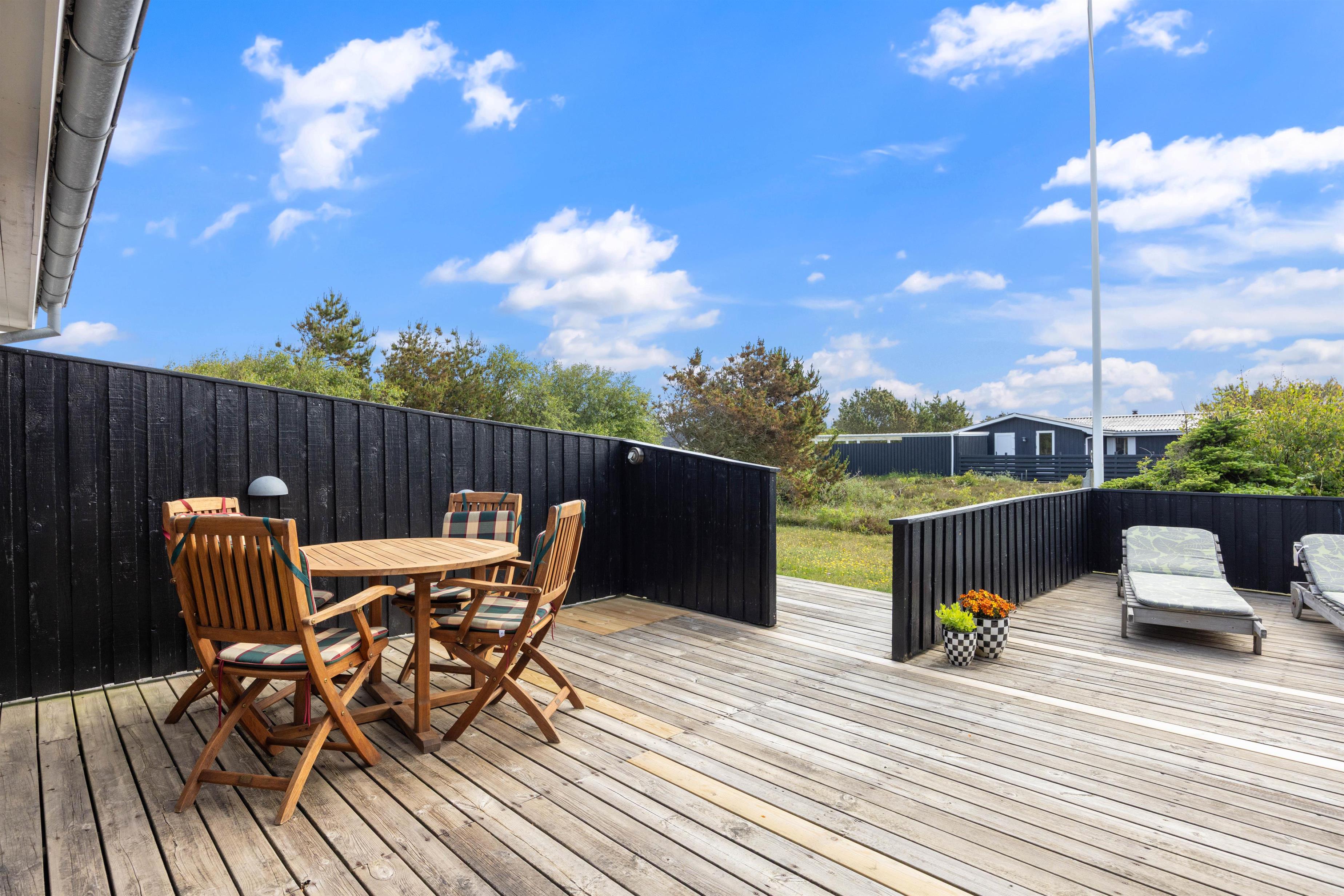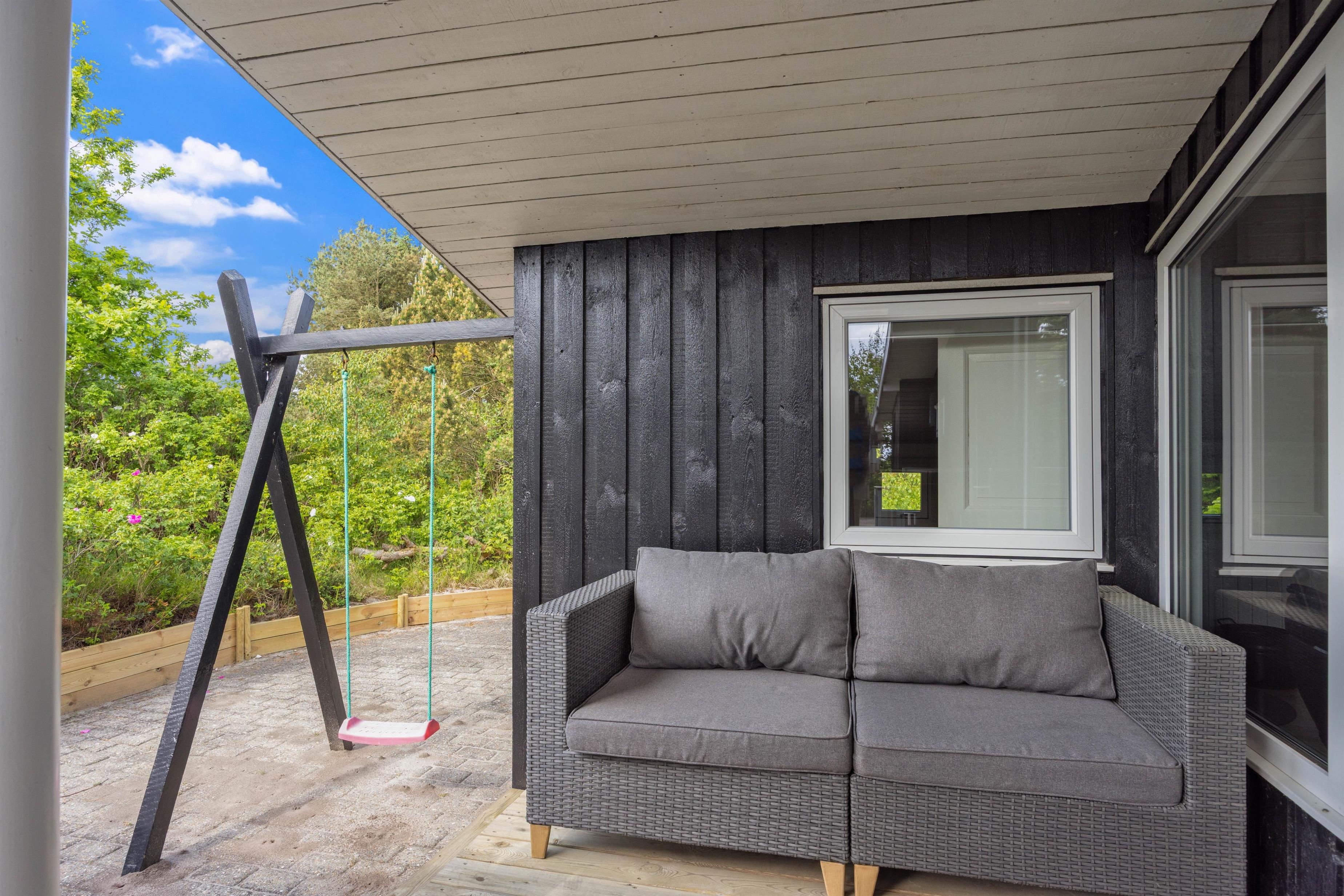Rundt om huset finder I flere skønne terrasser, så der er rig mulighed for at nyde det flotte klitlandskab fra liggestolene. Tilmed er et stykke afskærmet, så I har gode læforhold, og den overdækkede del af terrassen gør, at I hurtigt kan komme i ly, hvis der skulle komme et uventet regnskyl. Havemøbler, grill og en gynge sørger for, at der er masser af muligheder for både afslapning og udendørs leg.