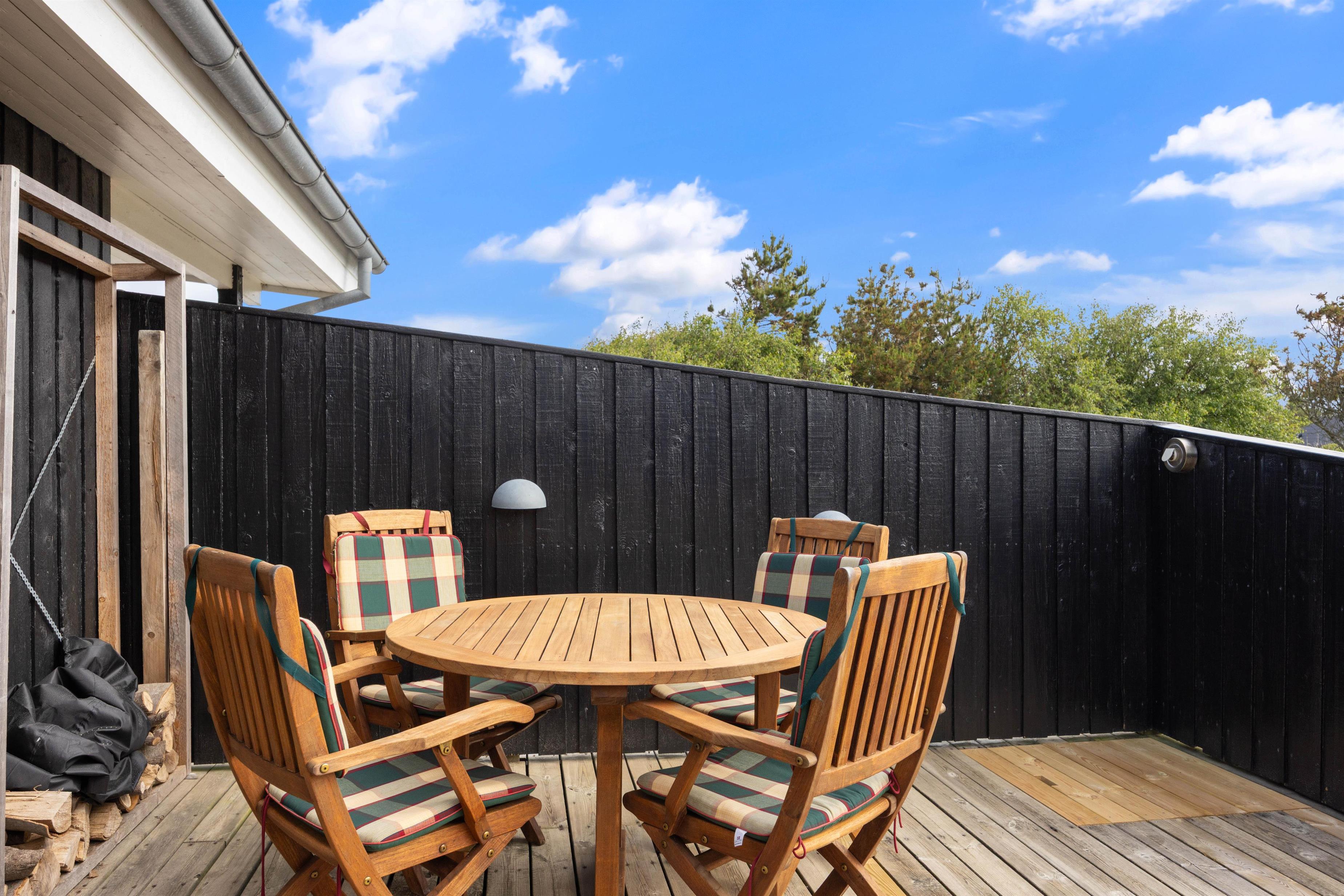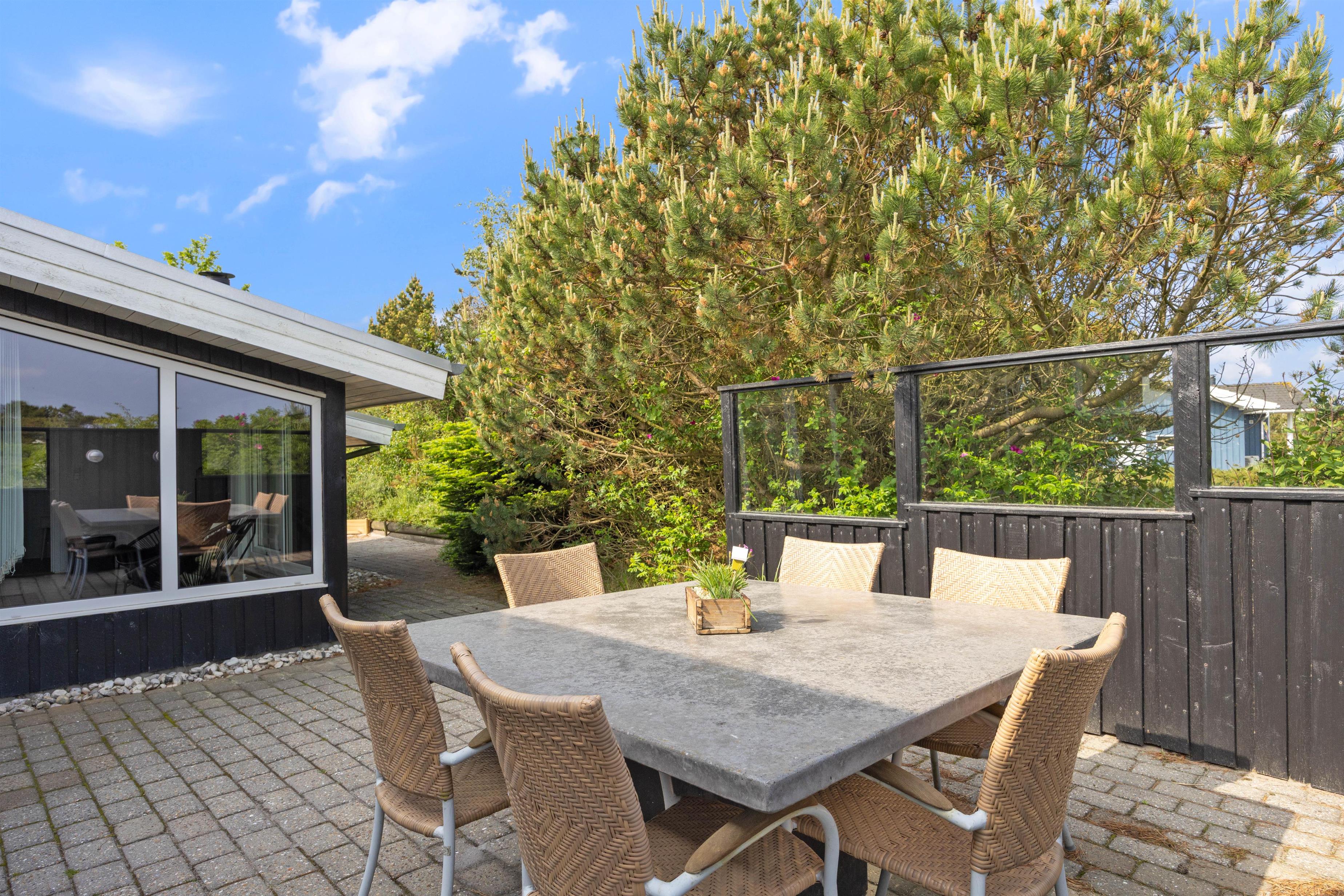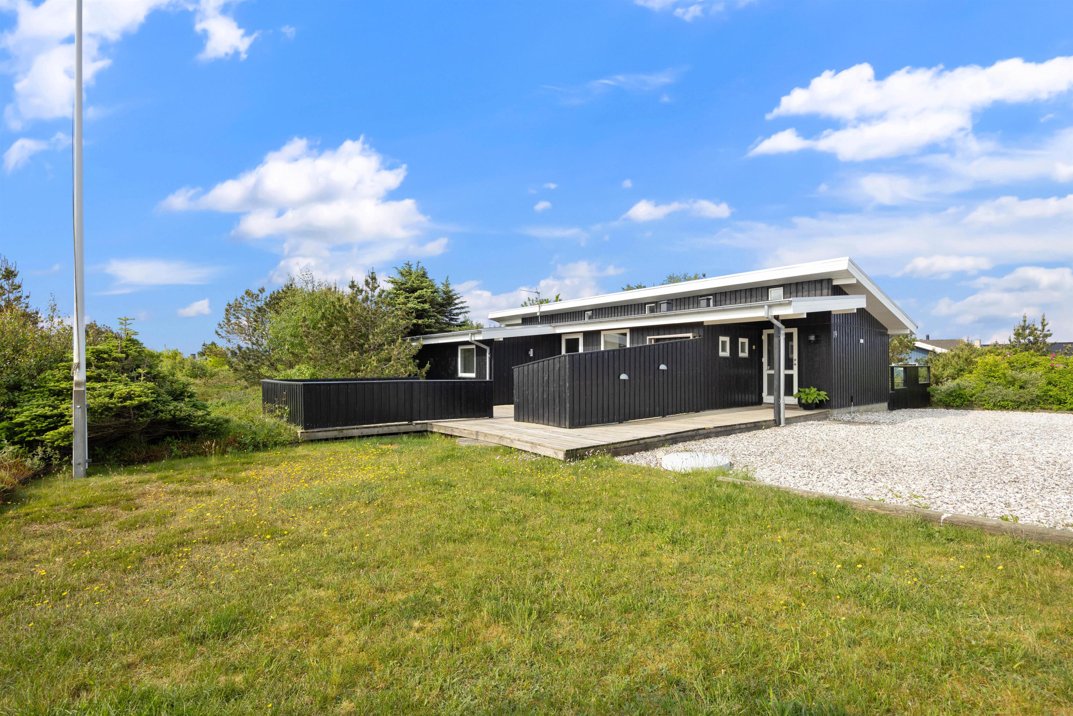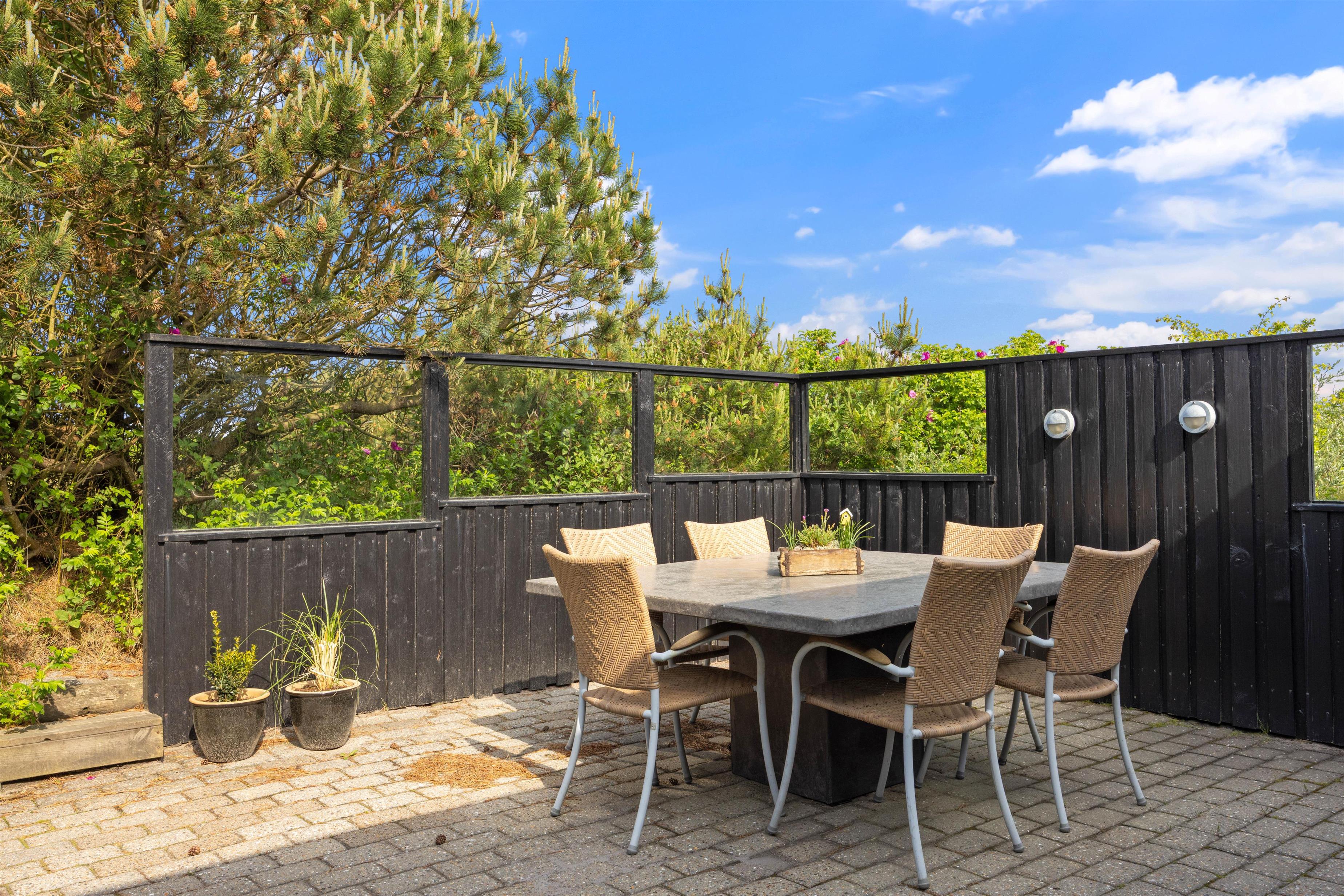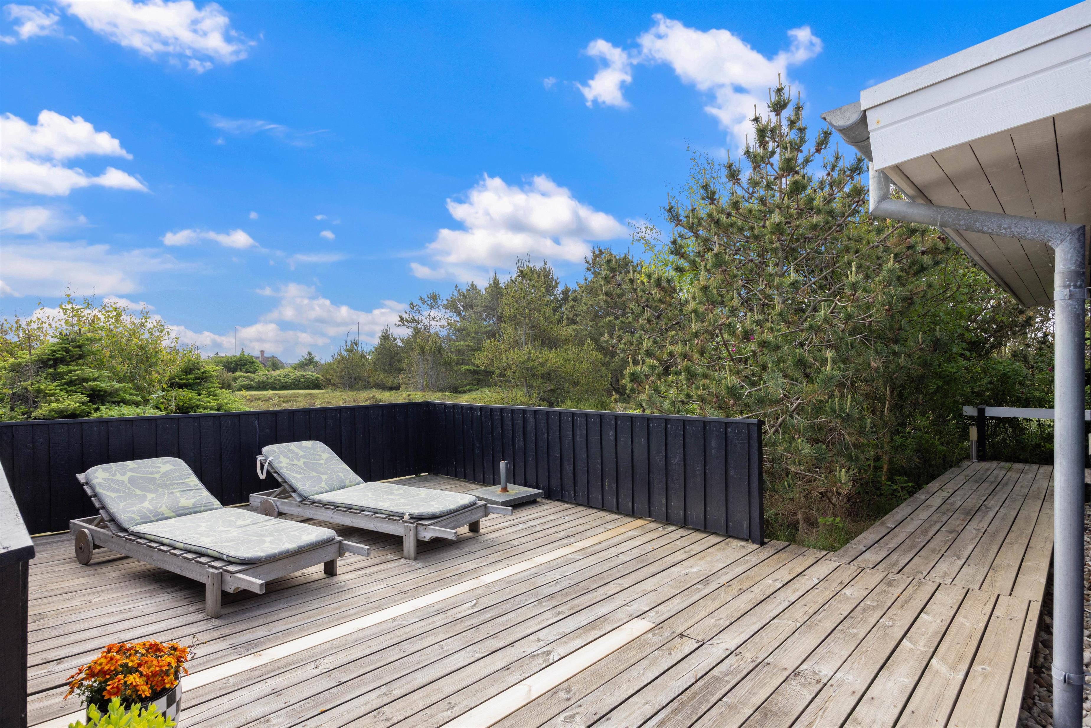 Rundt om huset finder I flere skønne terrasser, så der er rig mulighed for at nyde det flotte klitlandskab fra liggestolene. Tilmed er et stykke afskærmet, så I har gode læforhold, og den overdækkede del af terrassen gør, at I hurtigt kan komme i ly, hvis der skulle komme et uventet regnskyl. Havemøbler, grill og en gynge sørger for, at der er masser af muligheder for både afslapning og udendørs leg.