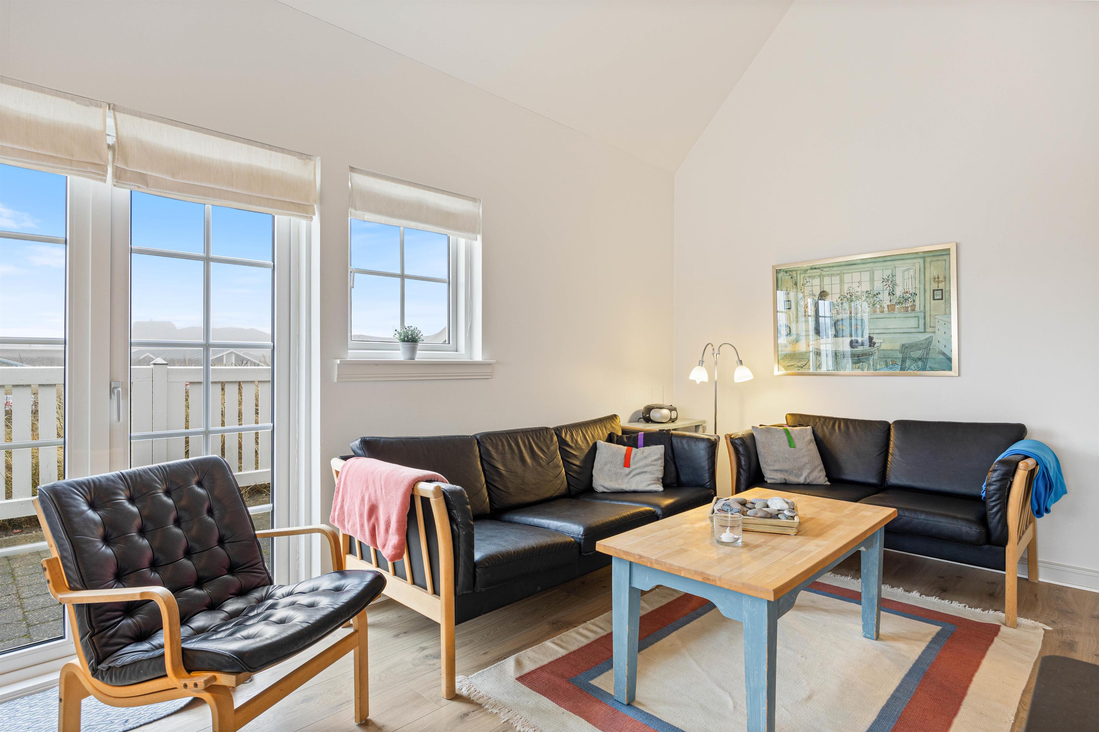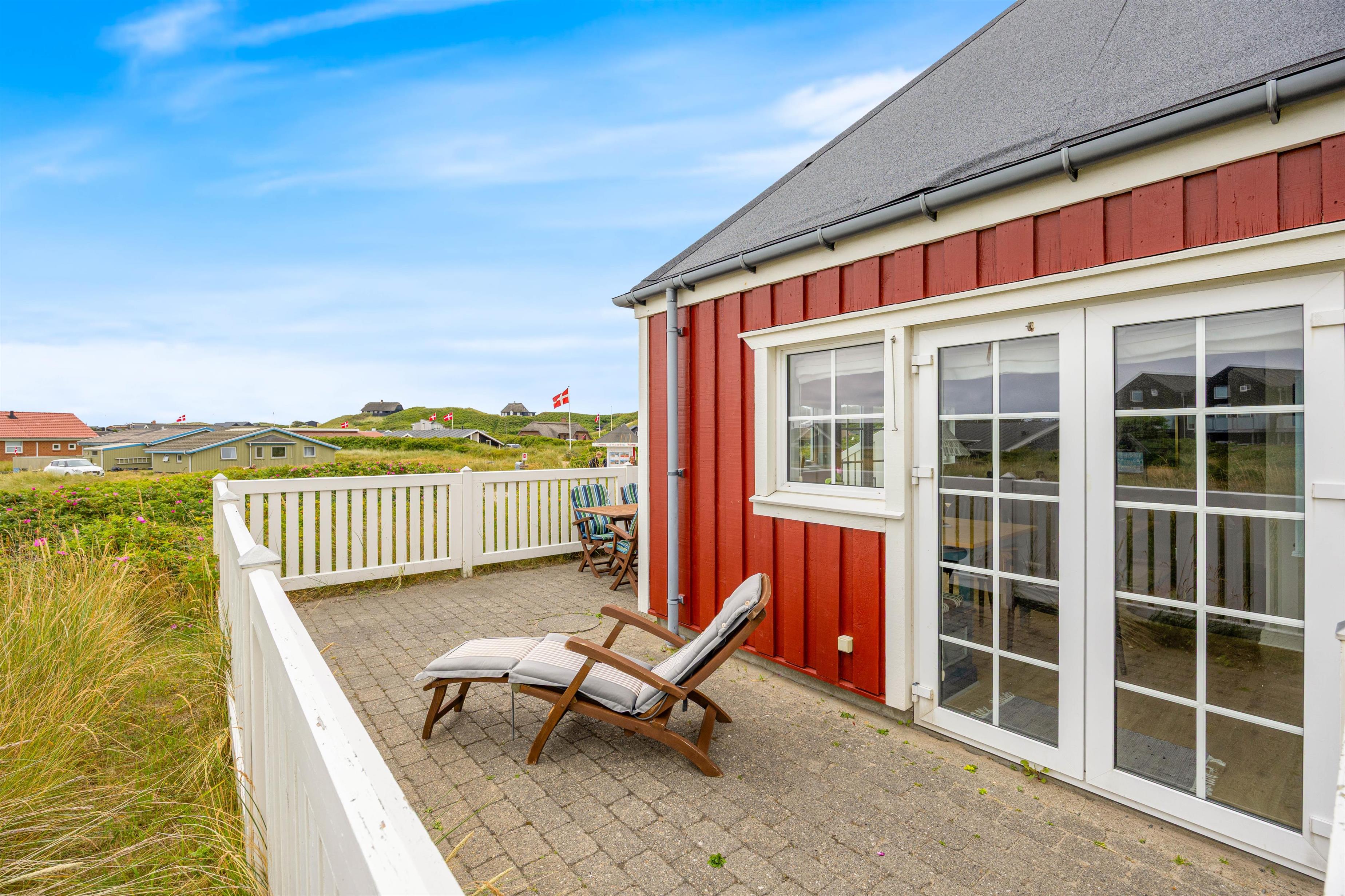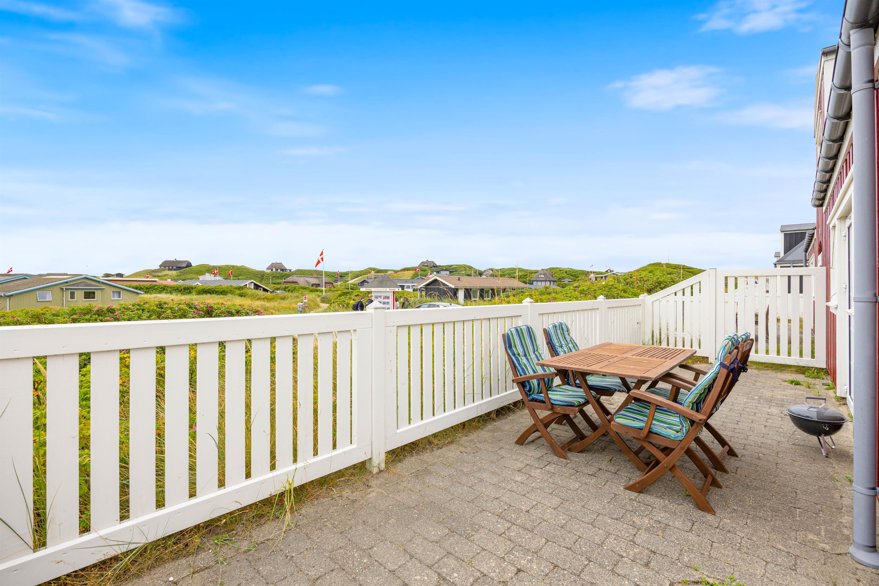 Når vejret tillader det, og solen står højt på himlen, kan I træde ud på terrassen, nyde det gode vejr og mærke den friske Vesterhavsluft. Terrassen er godt indrettet med havemøbler og solvogne, så der er rig mulighed for afslapning i solen. Bliver solen for skarp, kan I slå parasollen op for lidt skygge.