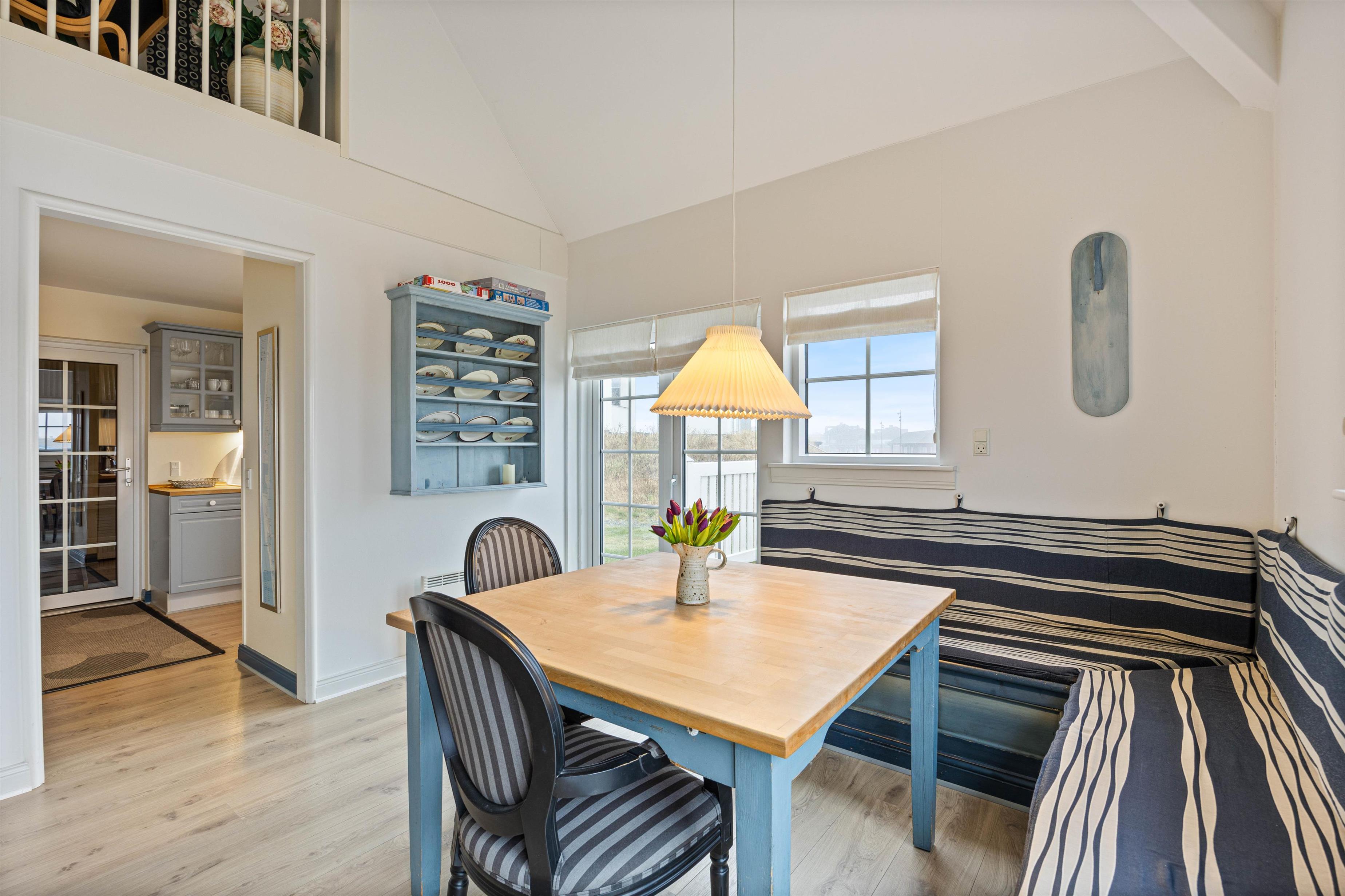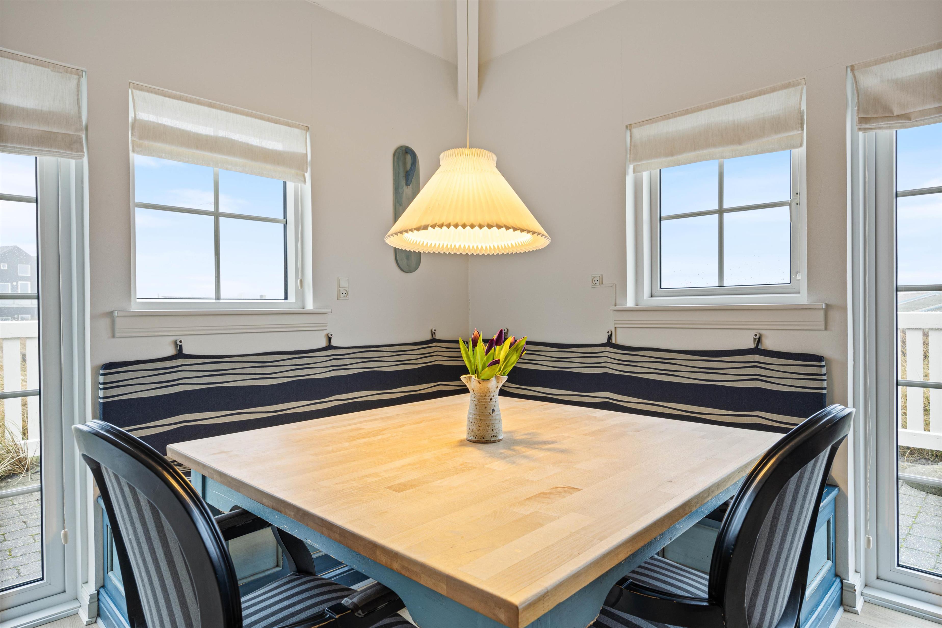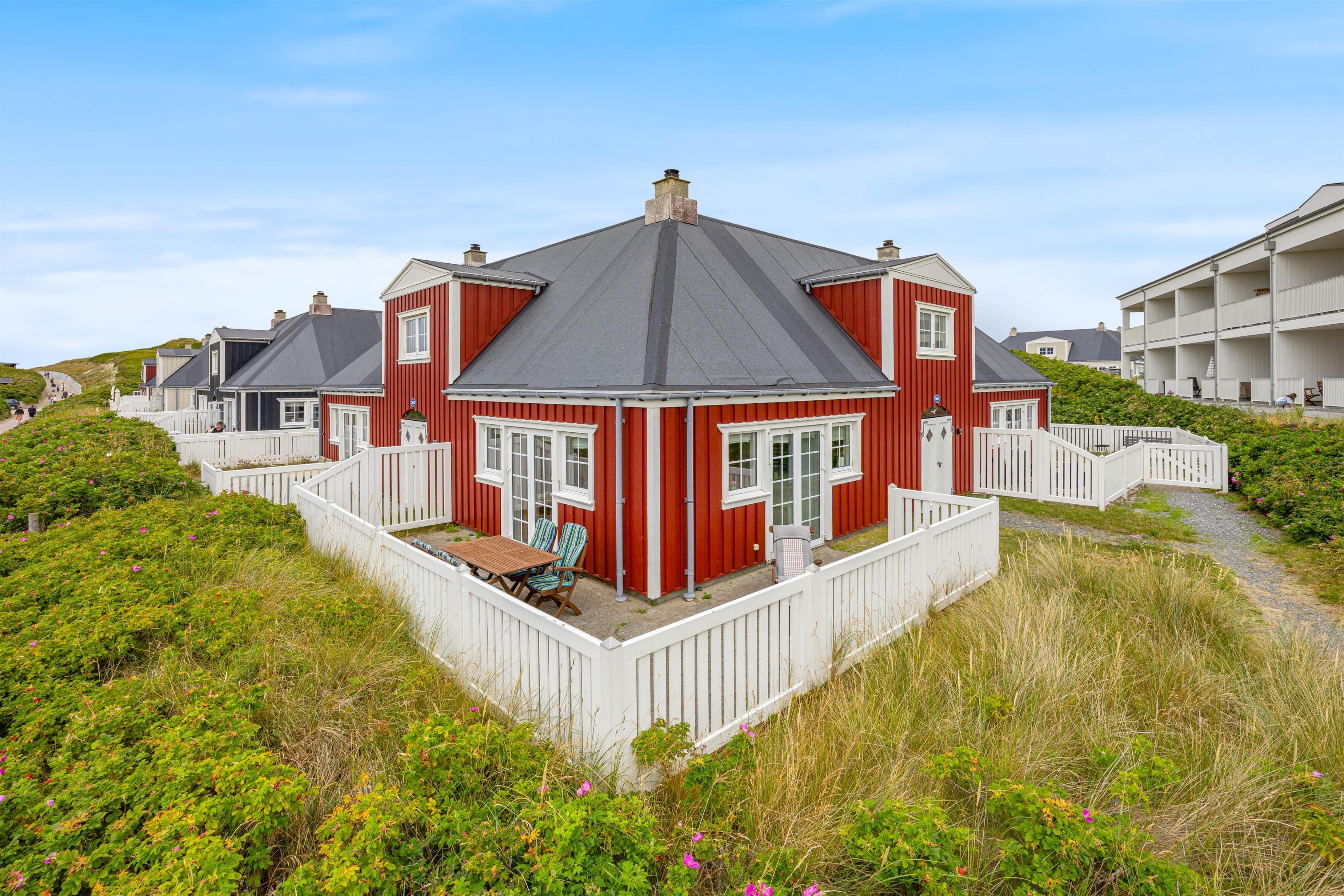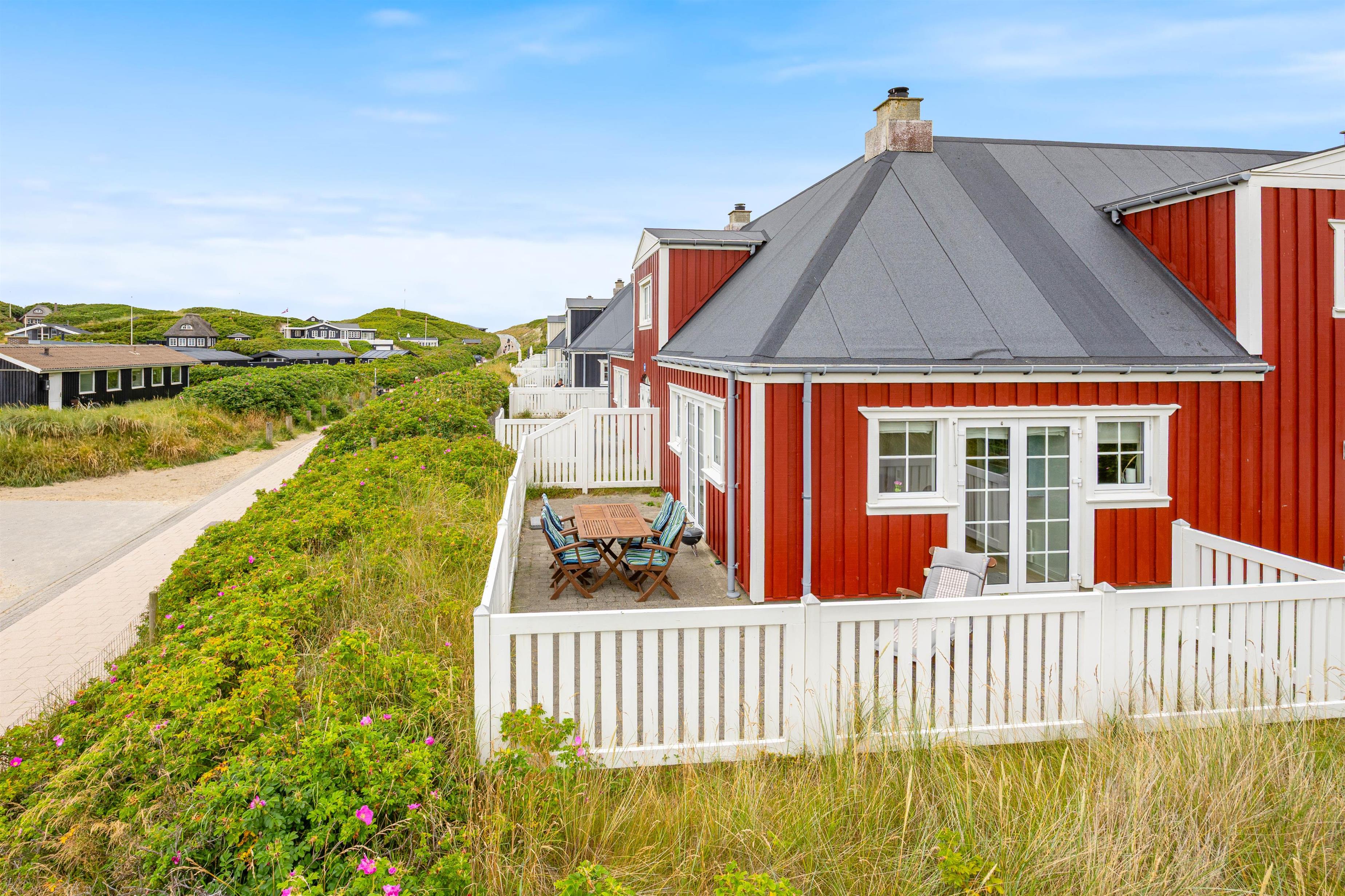 Når vejret tillader det, og solen står højt på himlen, kan I træde ud på terrassen, nyde det gode vejr og mærke den friske Vesterhavsluft. Terrassen er godt indrettet med havemøbler og solvogne, så der er rig mulighed for afslapning i solen. Bliver solen for skarp, kan I slå parasollen op for lidt skygge.
