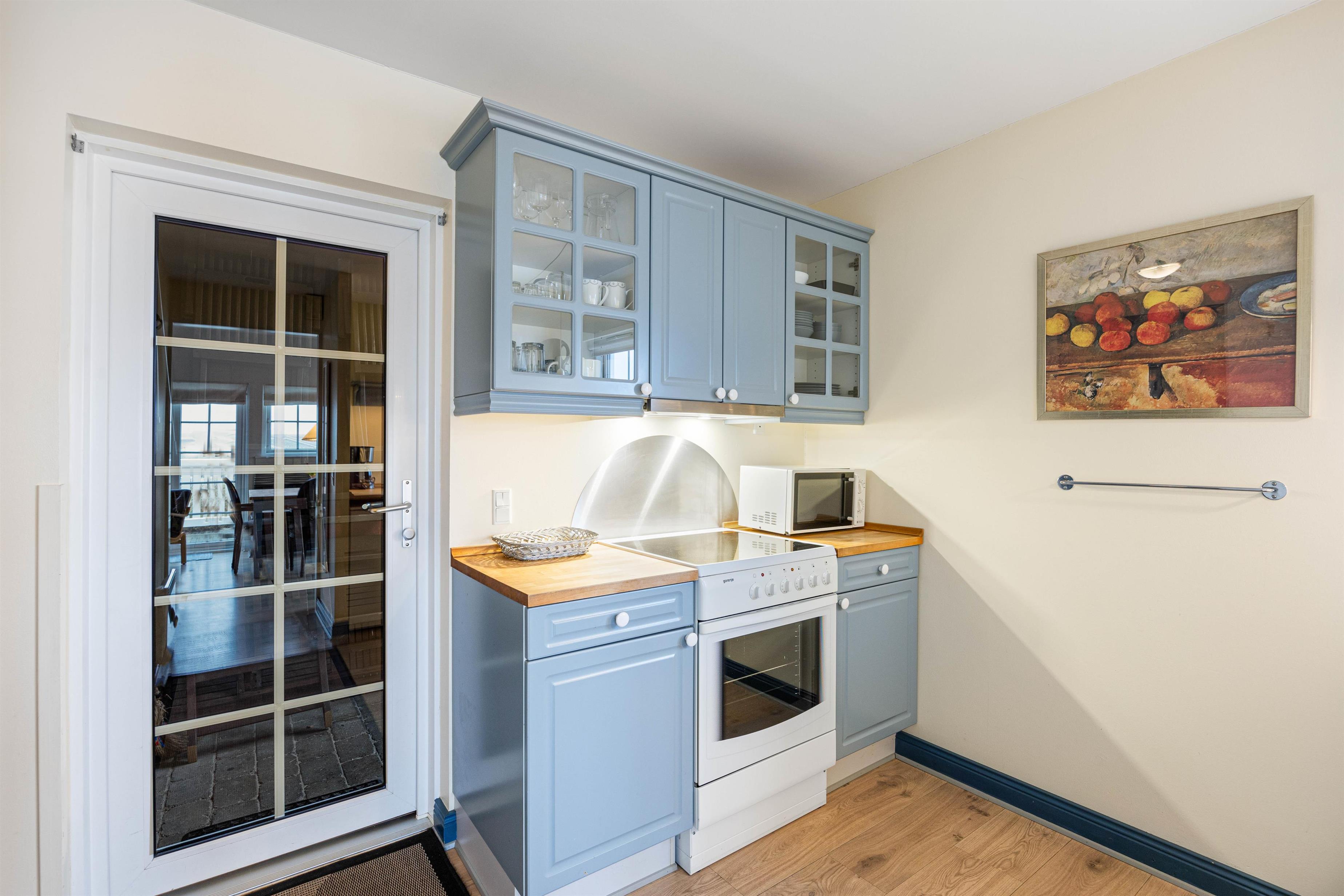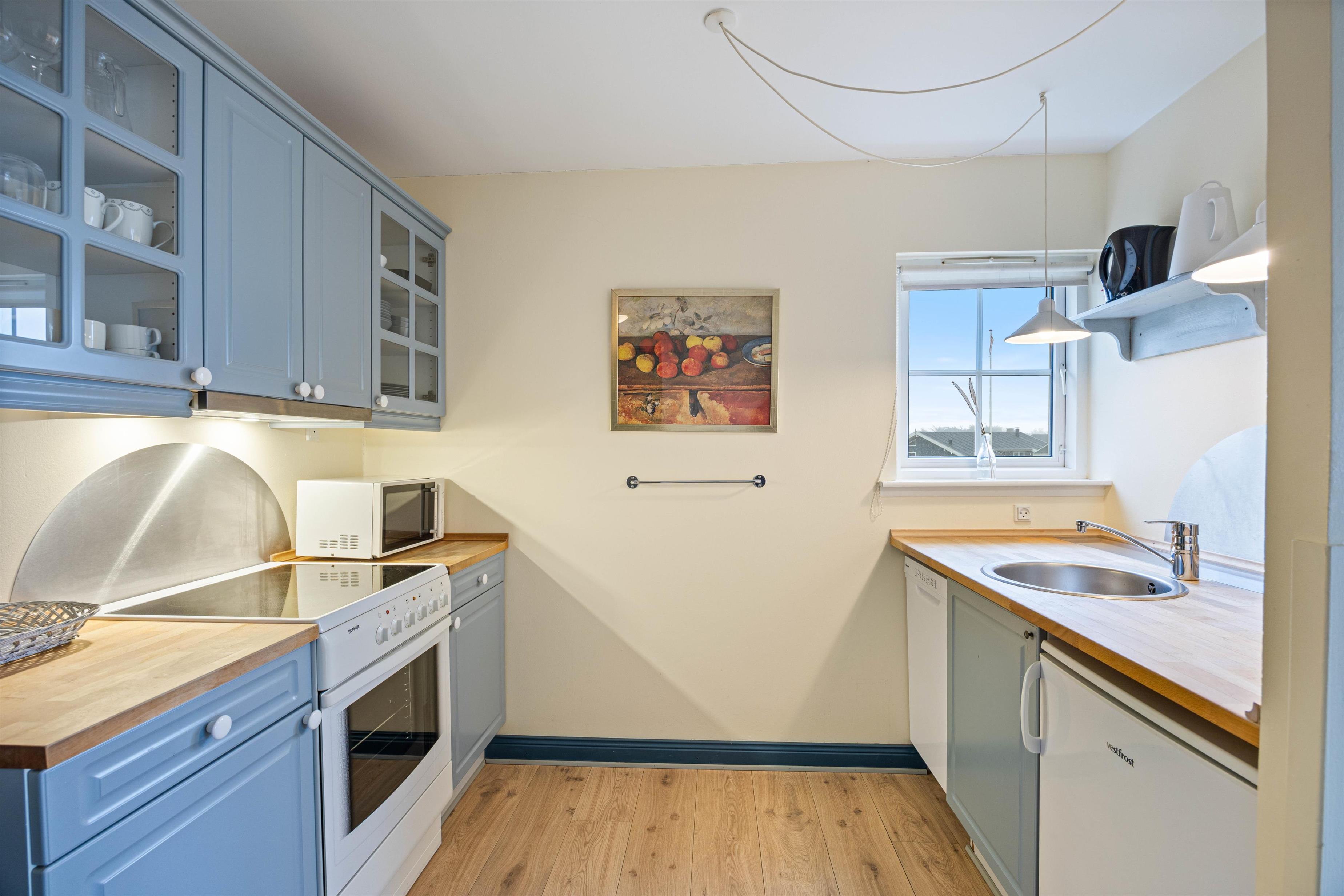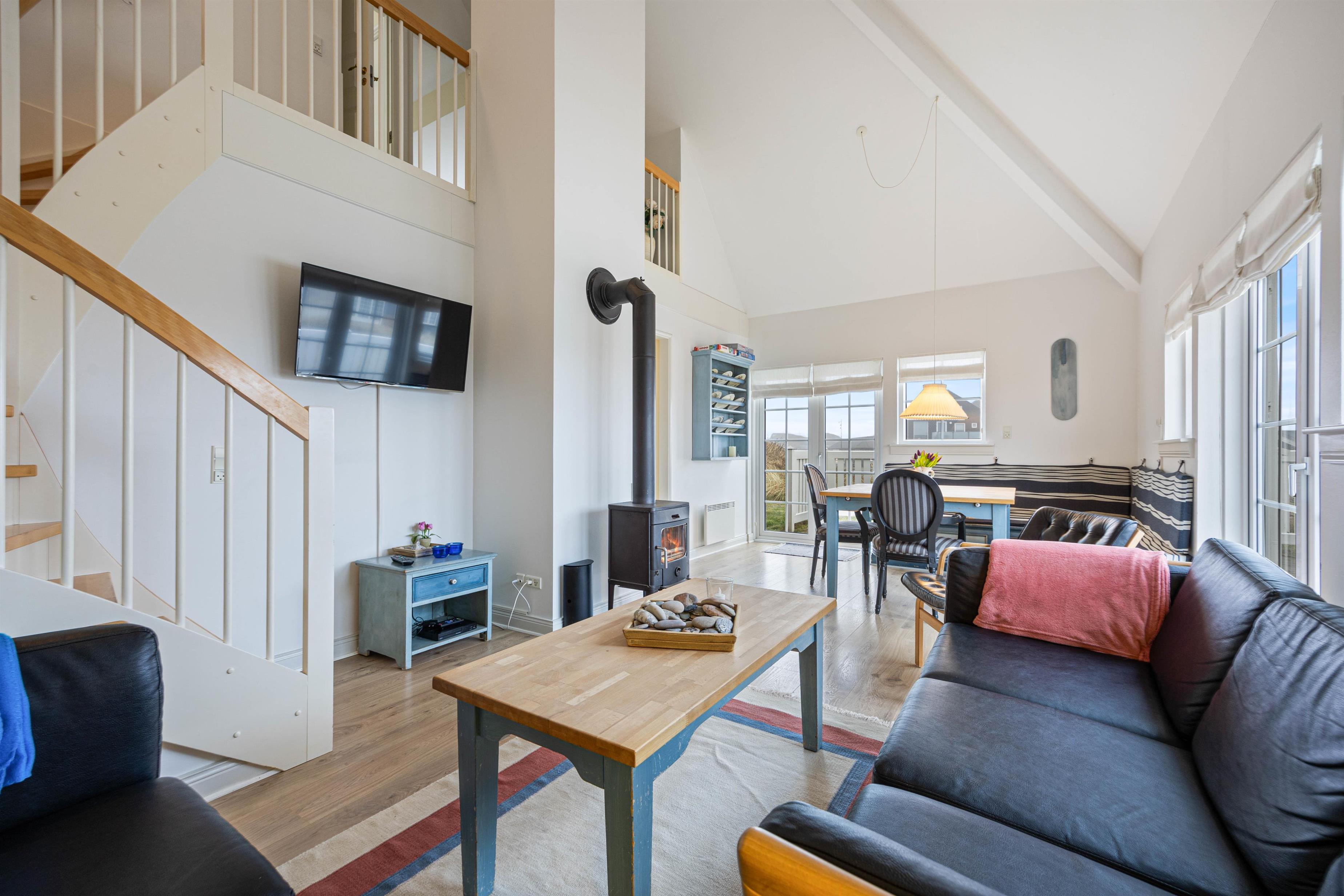 Der er også vaskemaskine og tørretumbler, så I slipper for at bekymre jer om beskidt tøj. Ferielejlighedens samlingspunkt er stuen, hvor der er plads til, at hele familien kan samles og hygge sig. For ekstra feriehygge kan det anbefales at tænde op for brændeovnen på de koldere feriedage. Er brændeovnen ikke i gang, har I mulighed for at benytte elvarme.