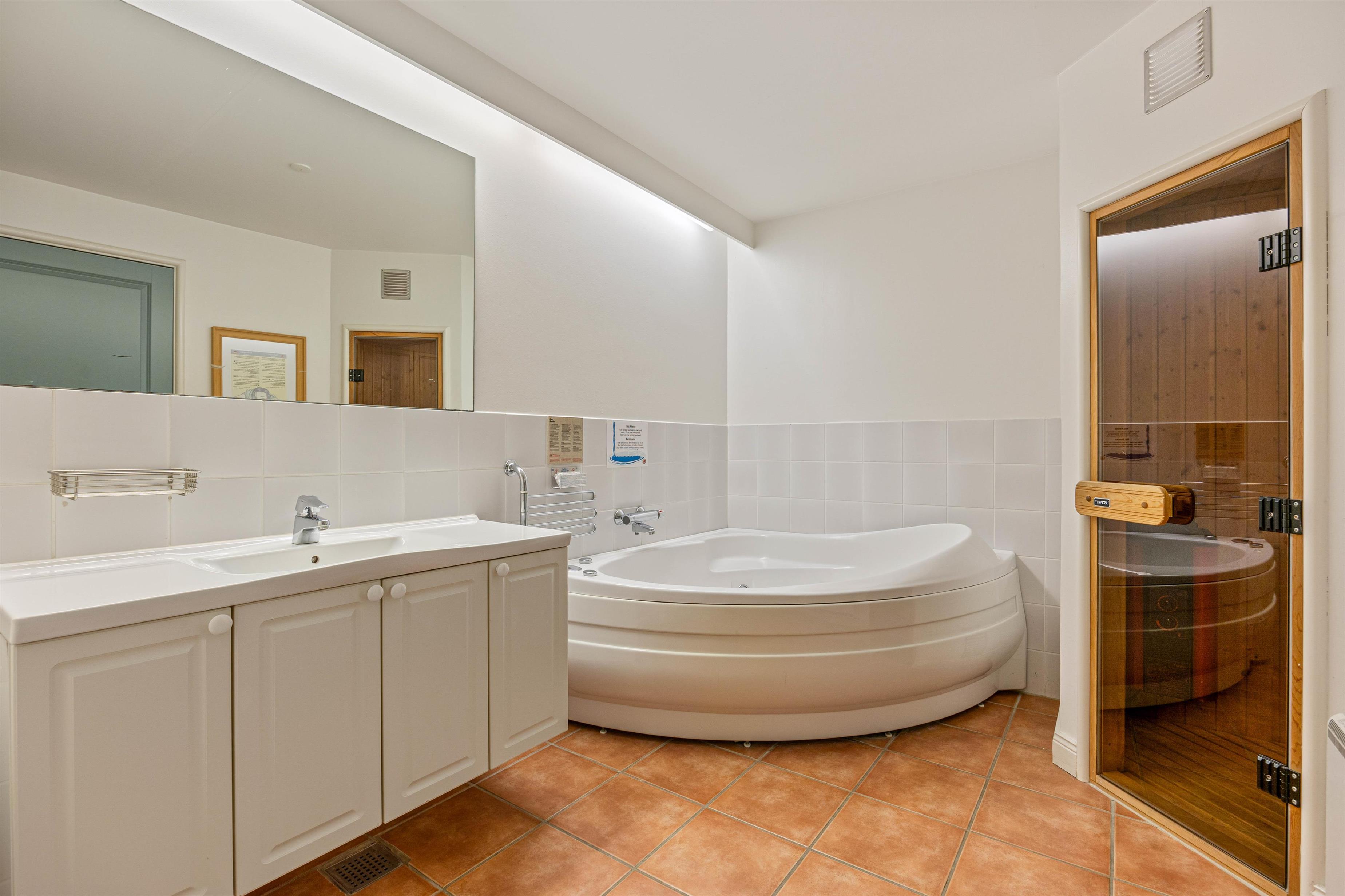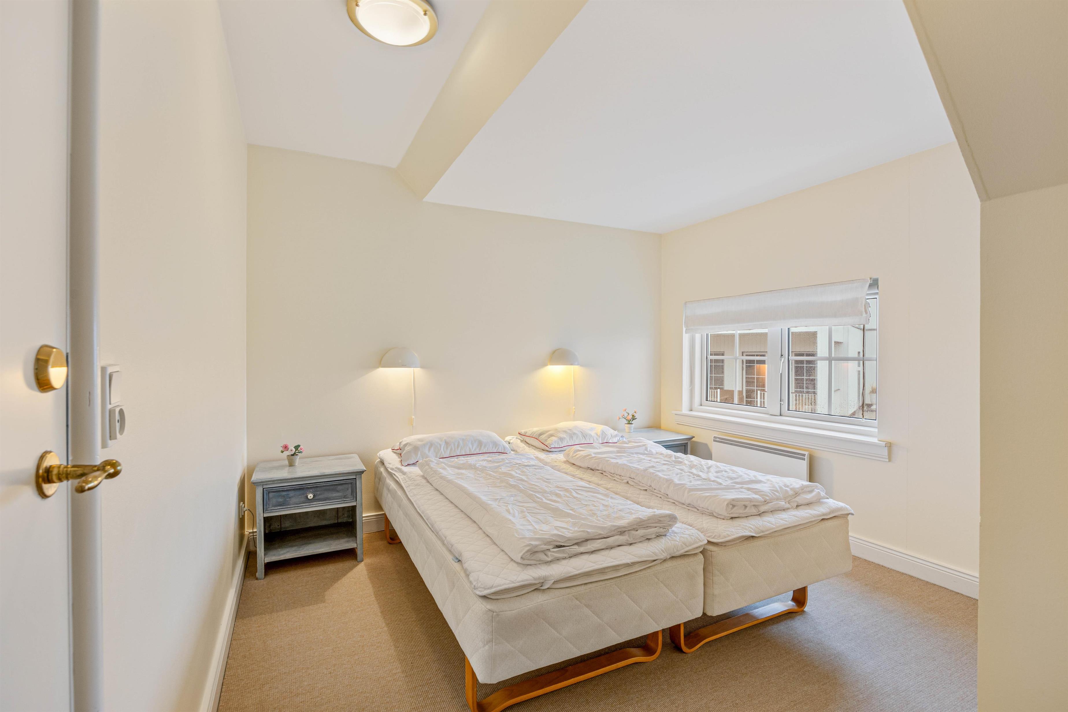 Lige så snart I træder ind adf hoveddøren, bliver I mødt af en hyggelig feriestemning, og I vil straks føle jer hjemme. Den 76 m² store ferielejlighed rummer 2 gode soveværelser og 1 badeværelse. De to soveværelser er begge indrettet med 2 enkeltsenge, der er sammensat til dobbeltsenge. I stueetagen finder I ferielejlighedens badeværelse, hvor der er indlagt gulvvarme, så I skal ikke bekymre jer om kolde fødder. På badeværelset finder I også en sauna og et spabad, så her er rig mulighed for at komme helt ned i gear og blive varmet godt igennem.