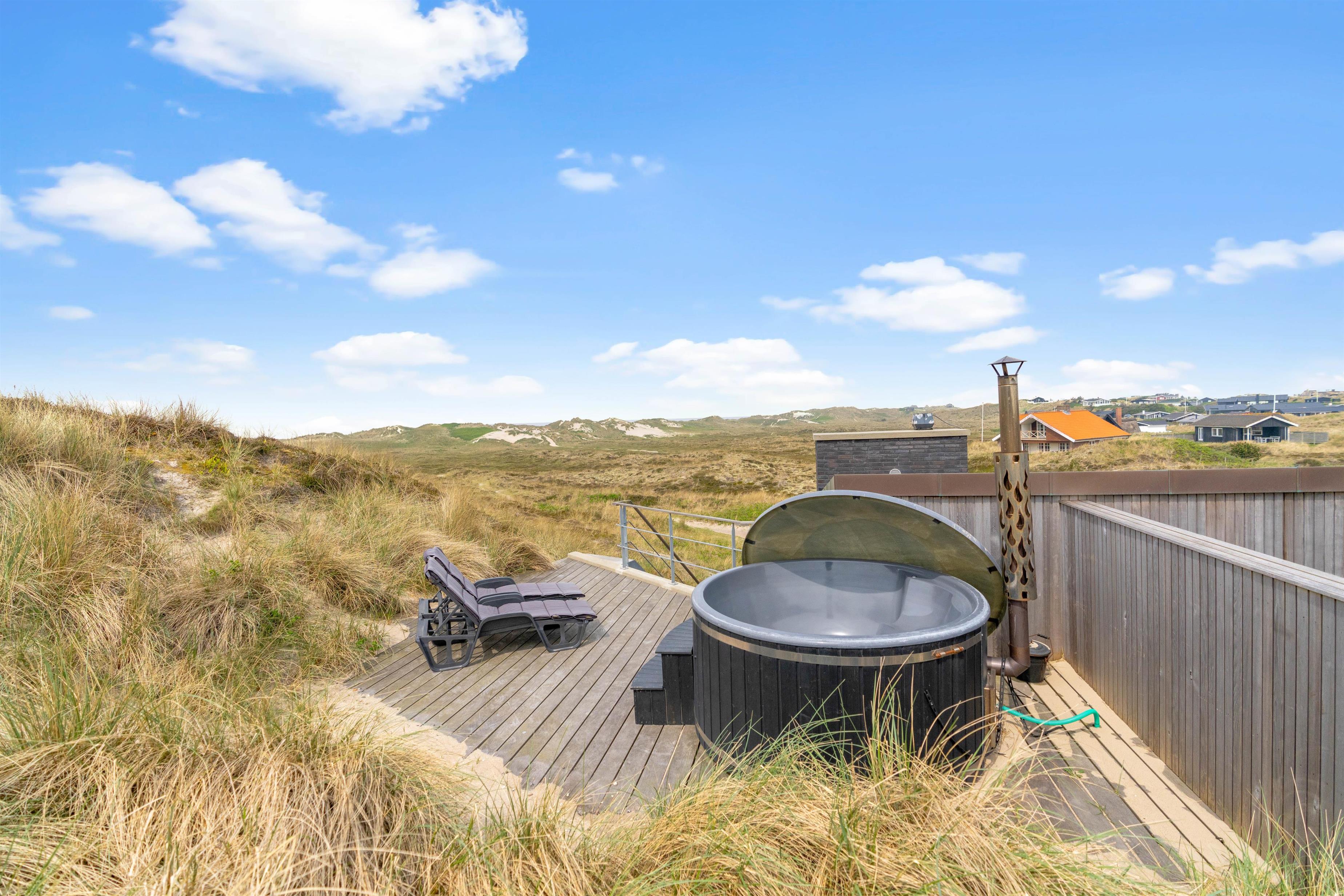 Der er en højt beliggende, åben terrasse med vildmarksbad og en flot udsigt. Fra stueplan har I direkte adgang til den afskærmede terrasse med udebruser. Udebruseren kan benyttes i perioden april til november. Der er selvfølgelig sørget for gode havemøbler, liggestole og en grill, så I kan nyde de dejlige solskinsdage i fulde drag.