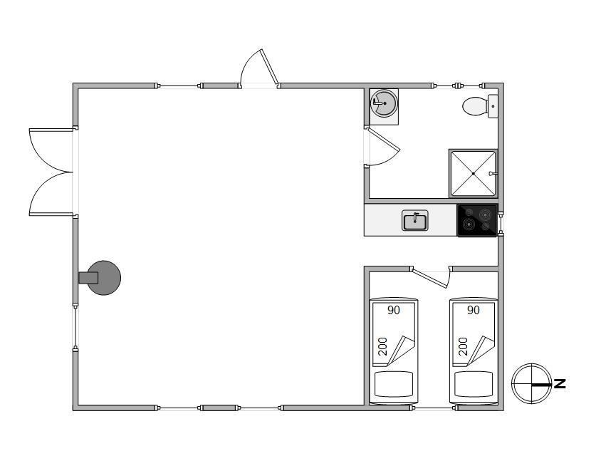 Køkkenet er udstyret med en miniovn og en kogeplade, og spisestuen og stuen er slået sammen. Når mørket falder på, kan I sætte jer til rette i sofaen med et glas rødvin og tanke nye kræfter i skæret fra brændeovnens knitrende flammer. Det er ren idyl! Der er også mulighed for at streame film på tv'et.