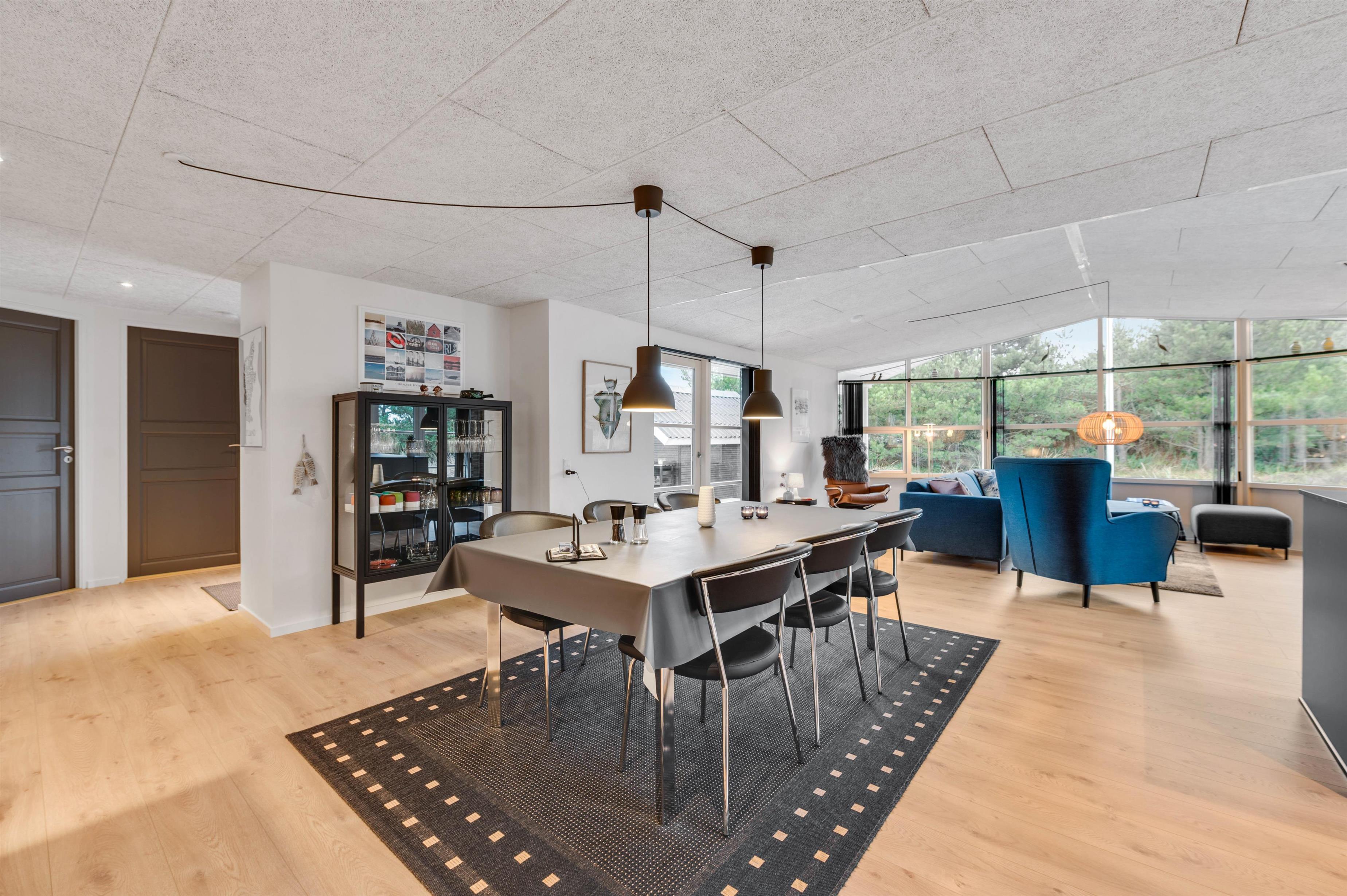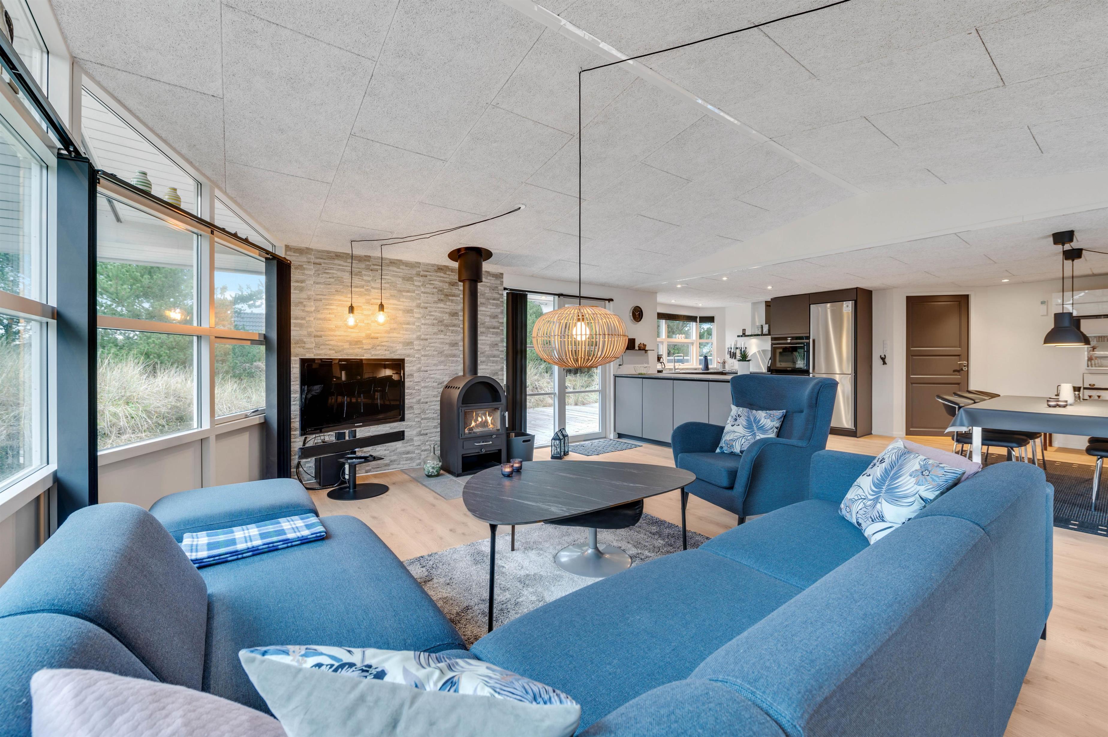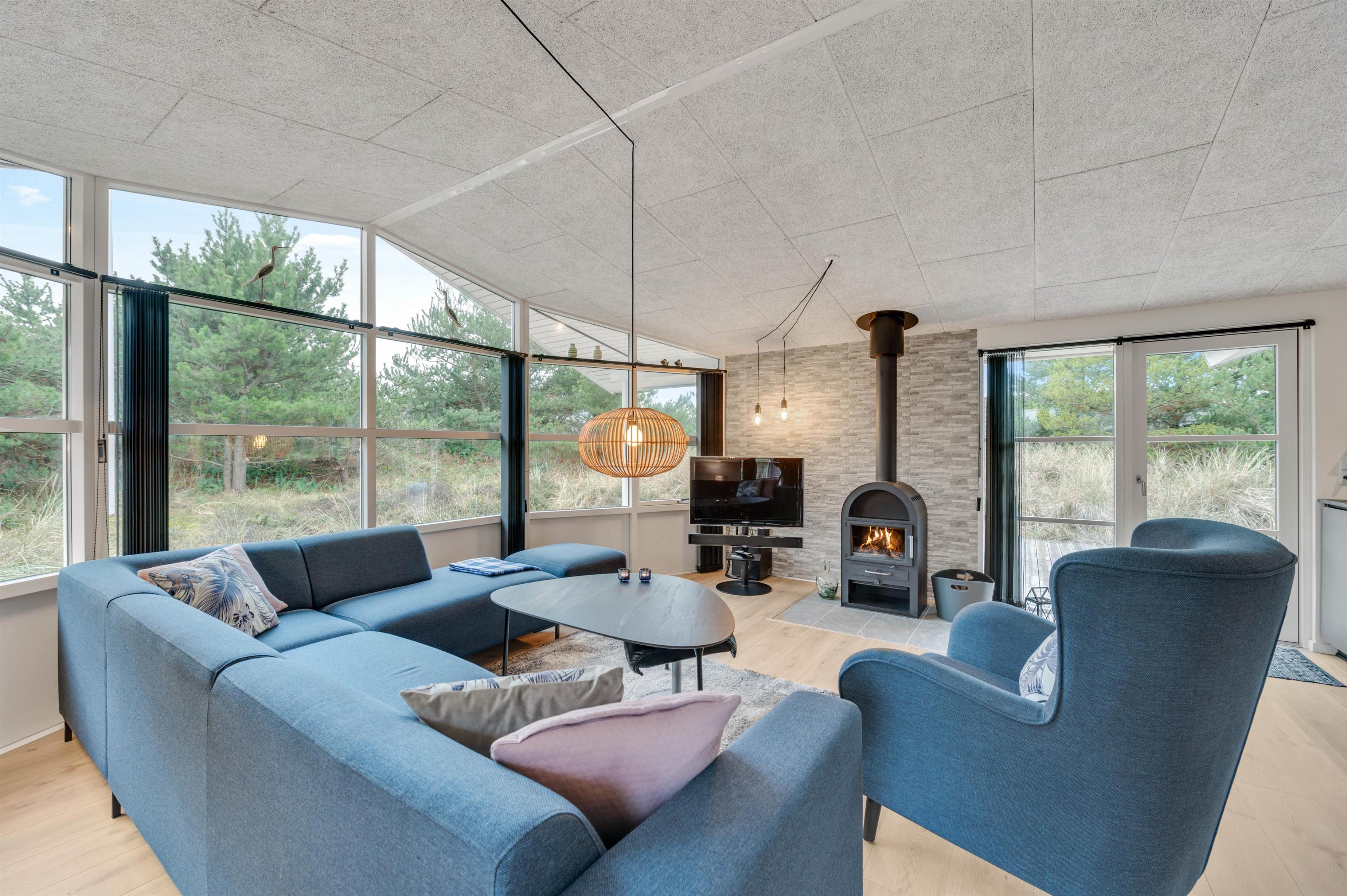 De store vinduespartier sørger for rigeligt med lys og gør, at man hele tiden kan se den dejlige natur udenfor. Brændeovnen sørger desuden for den helt rigtige feriestemning og hygge på køligere dage. Fra stuen er der også direkte udgang til den store, skønne terrasse, der går hele vejen rundt om sommerhuset.