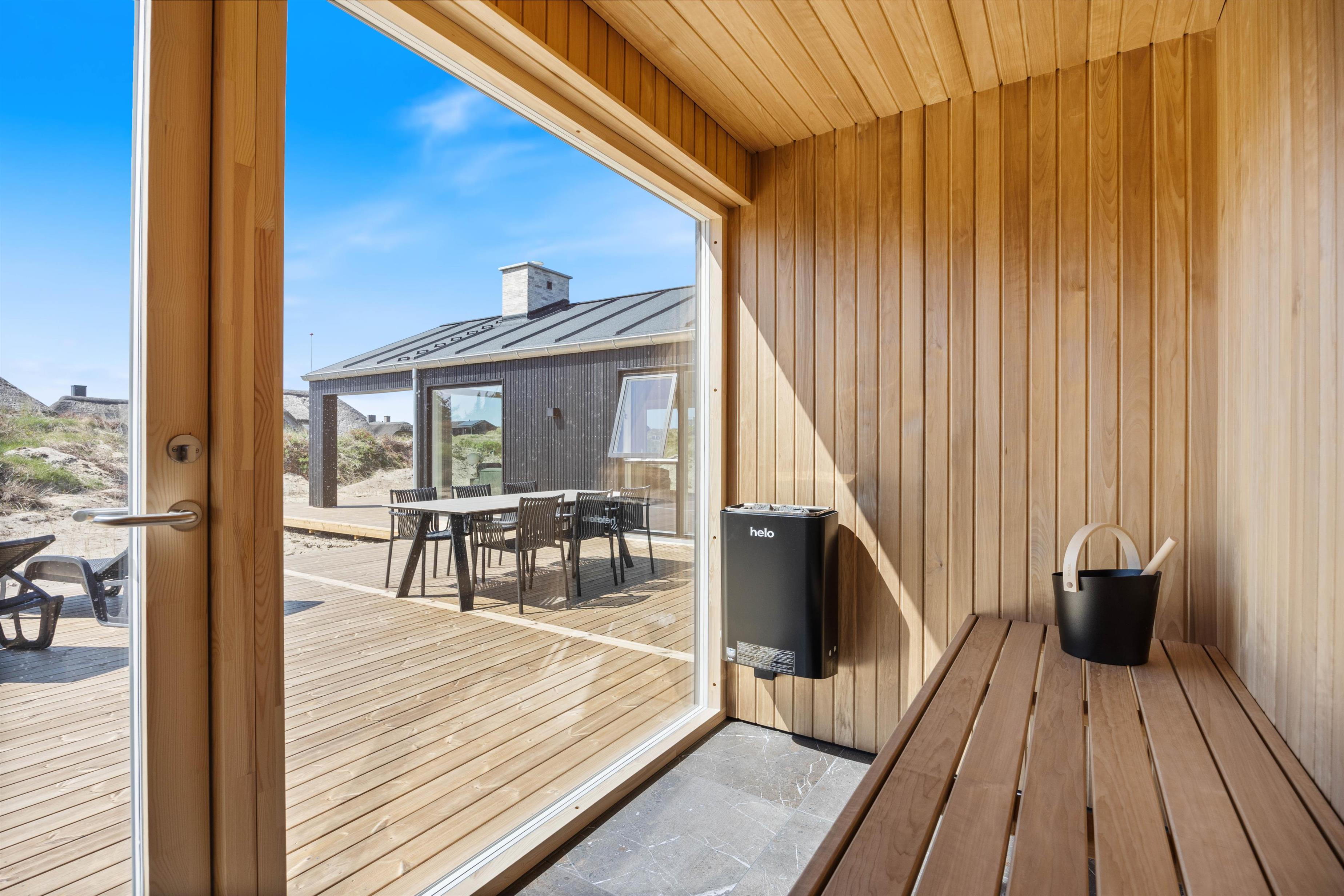 På et af feriehusets badeværelser finder i en sauna, som indbyder til wellness og afslapning. Her kan I virkelig slappe af, og nyde at I har ferie. Har I været en tur på stranden, har I mulighed for at tage skyller, under feriehusets tilhørende udebruser. Denne udebruser er til rådighed hele året rundt.