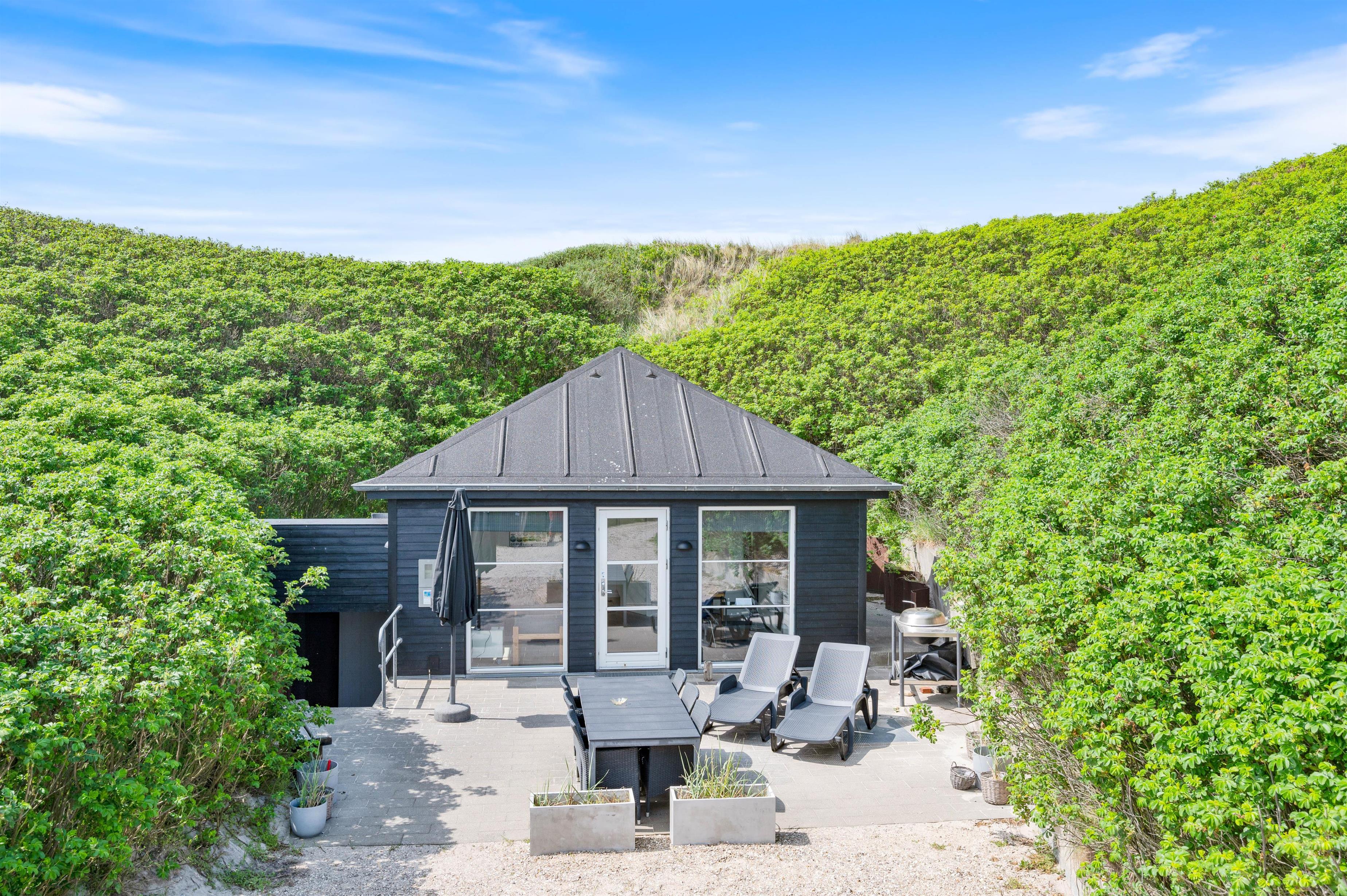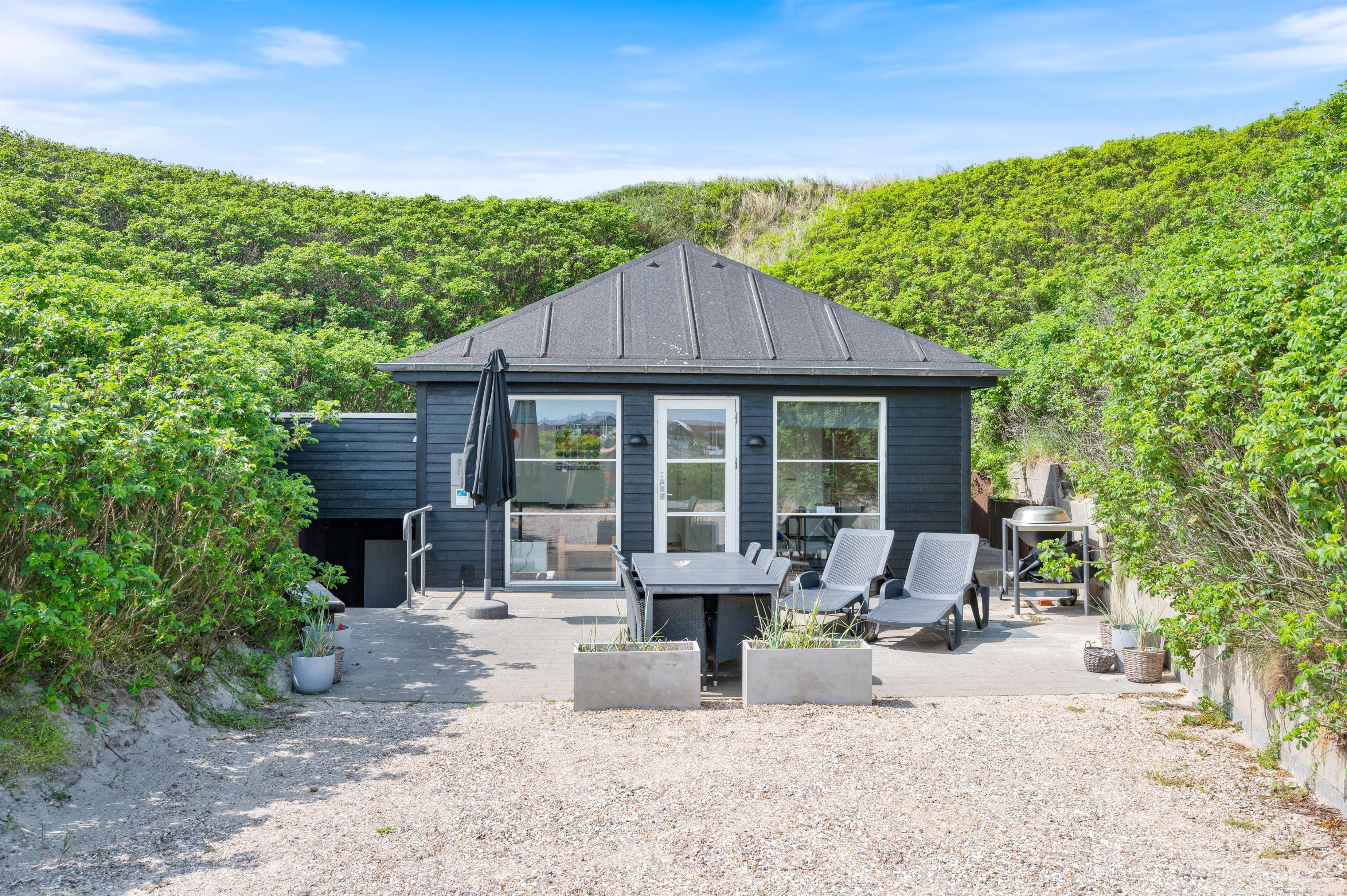For at komme ned til sommerhuset skal du ned ad en lille grusvej. På en vindstille dag kan du sidde på terrassen helt uforstyrret og lytte til det brusende vand på den anden side af klitten. Terrassen er naturligvis møbleret med havemøbler, liggestole og grill. Perfekt til hyggelige grillaftener i godt selskab med familien.