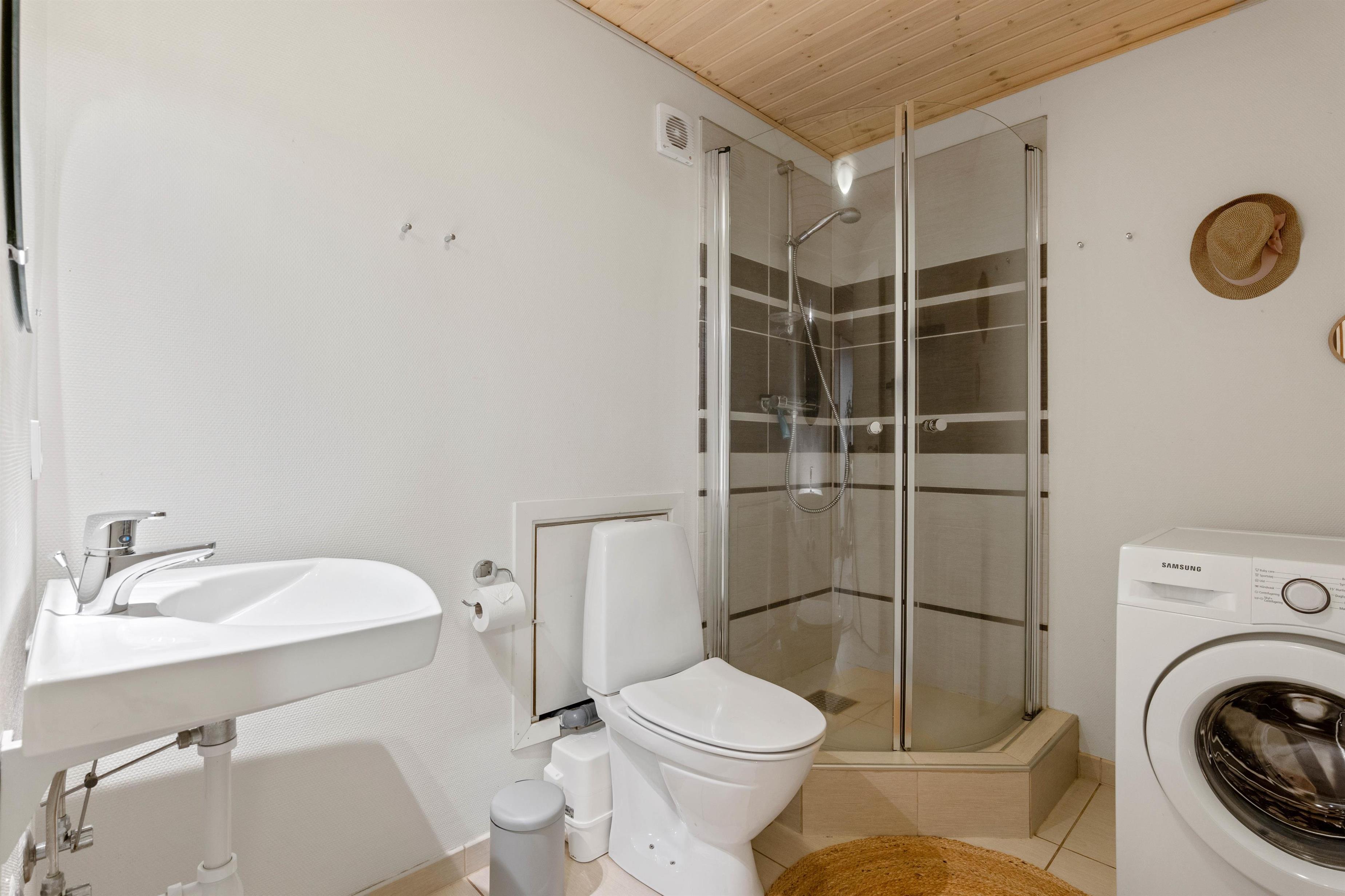 Indenfor vil du finde to moderne badeværelser, hvilket gør det ideelt for både par og små familier. I kælderen kan I også finde en lækker sauna, der sikrer en dejlig form for afslapning, og mulighed for at komme væk fra hverdagens stress og jag. For at gøre ferien endnu mere bekvem, er sommerhuset også udstyret med en opvaskemaskine og en vaskemaskine, så I kan nyde en uforstyrret ferie uden at bekymre jer om daglige gøremål.