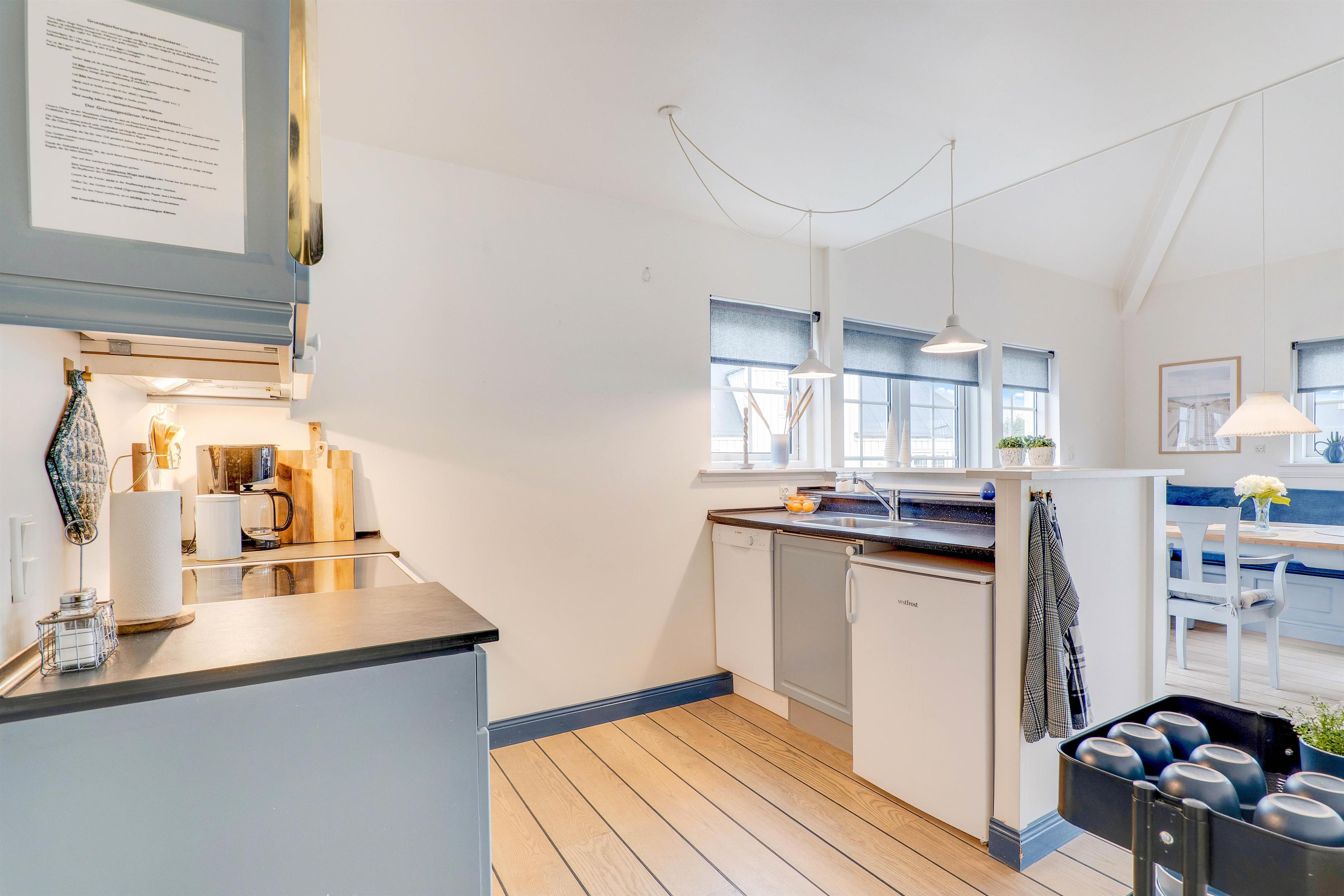 I stueetagen finder I et lille, fint køkken med komfur, opvaskemaskine og køleskab med 15 liters frysekapacitet. Fra køkkenet er der adgang til en hyggelig spisekrog i opholdsrummet, der er indrettet med indbygget bænk i klassisk stil. Fra pladsen på bænken er der et flot kig op til lejlighedens første etage. I opholdsrummet finder I også et hyggeligt hjørne med en knitrende brændeovn, behagelig sofa og fladskærms-tv.