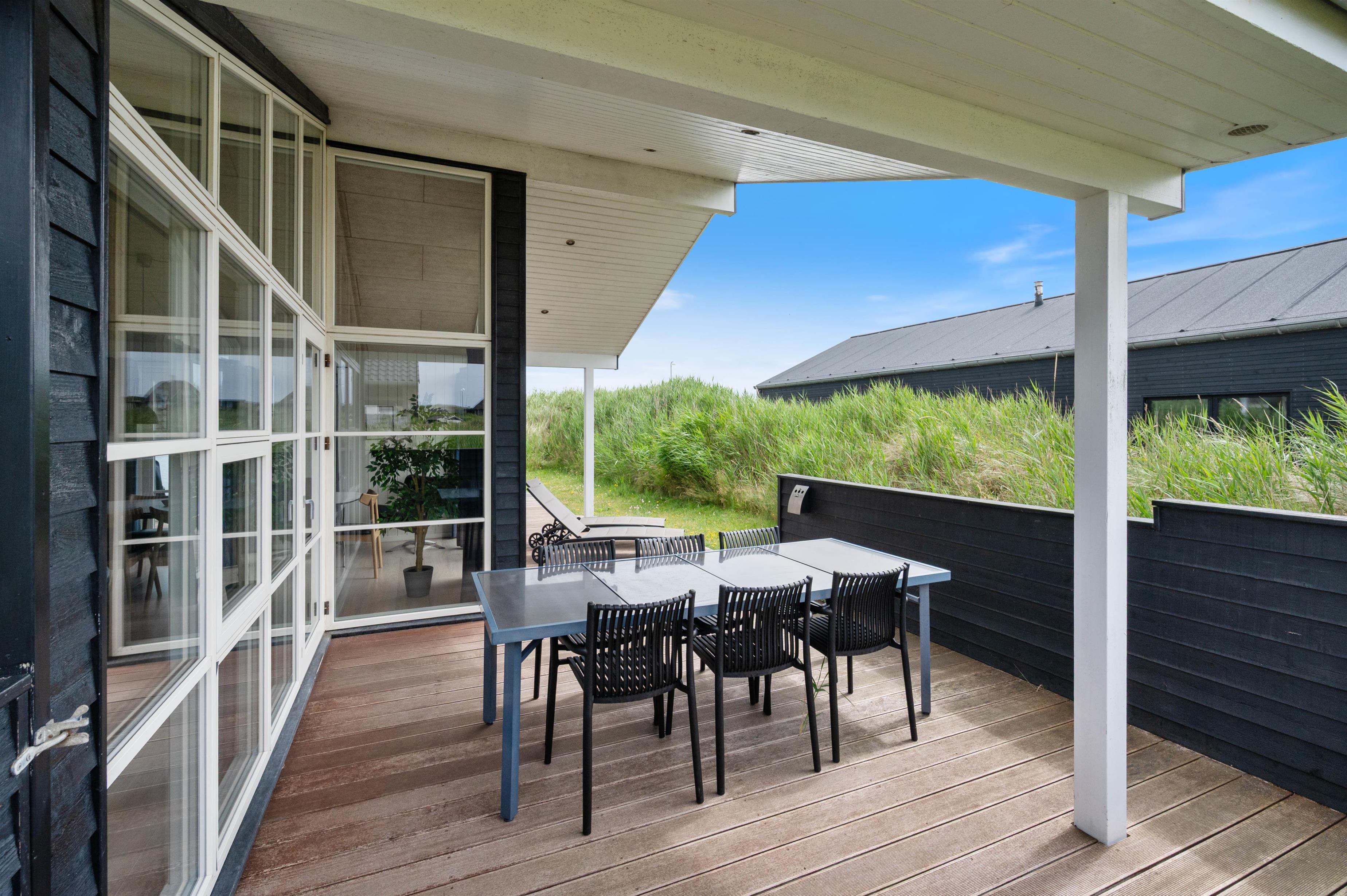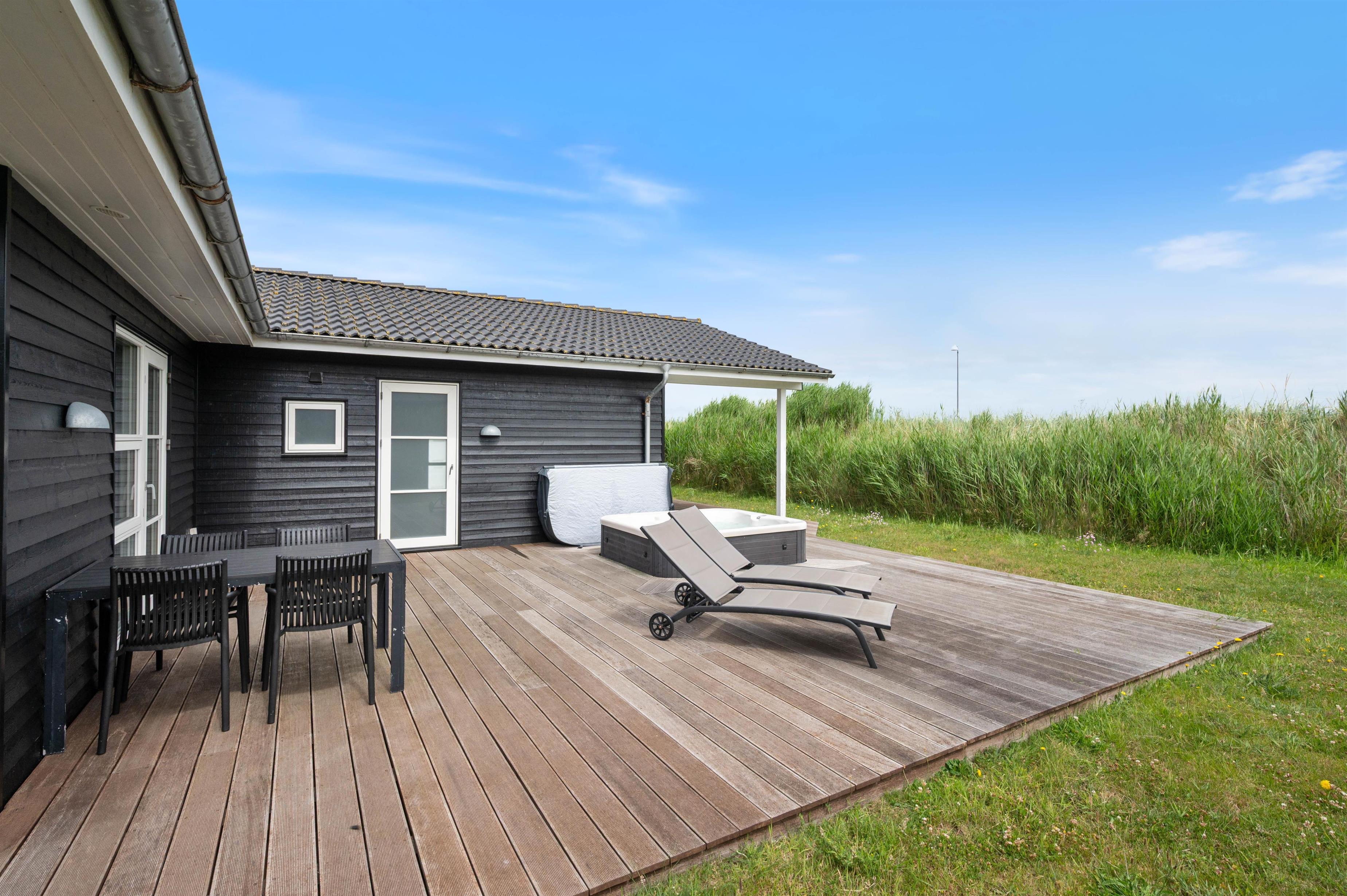 Dette hus har gode terrasser, som strækker sig rundt langs det meste af huset. Den er delvist overdækket, delvis lukket, og delvist afskærmet. Så her er det altid muligt at opholde sig på terrassen og nyde den friske luft og en hyggelig grillaften med familie eller venner. På terrassen er der også en udespa, som er særdeles hyggelig for både børn og voksne hele året rundt. Huset ligger tæt på byens 18-hullers golfbane - kun er 2 km væk fra Lodbergsvej 72.