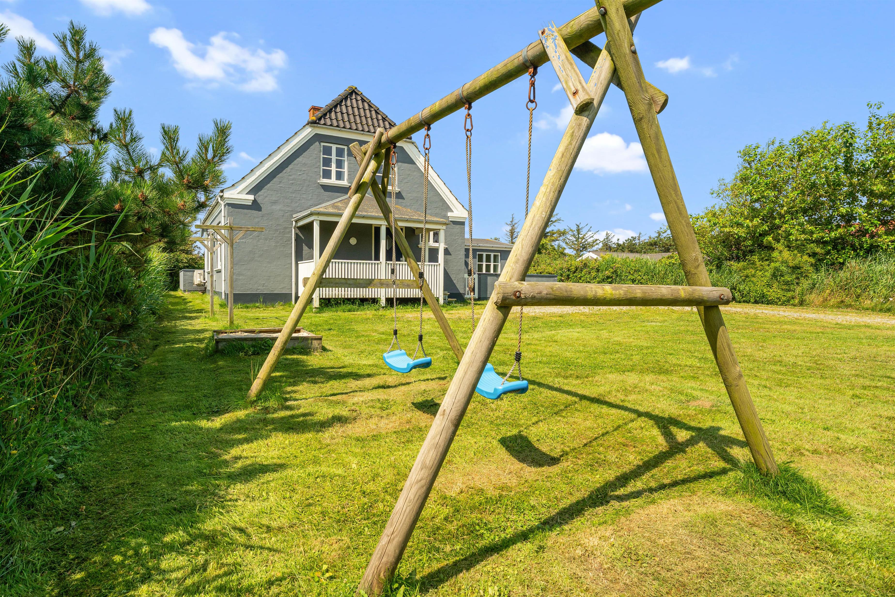 På begge sider af sommerhuset ligger en indhegnet og afskærmet terrasse, hvor I kan flytte liggestolene efter solen og nyde dejlige grillmiddage sammen. Fra den bagerste terrasse kan I se børnene, når de flyver højt til vejrs på gyngerne eller graver dybe huller i sandkassen. På plænen ved huset er der også plads til boldspil og fangeleg.