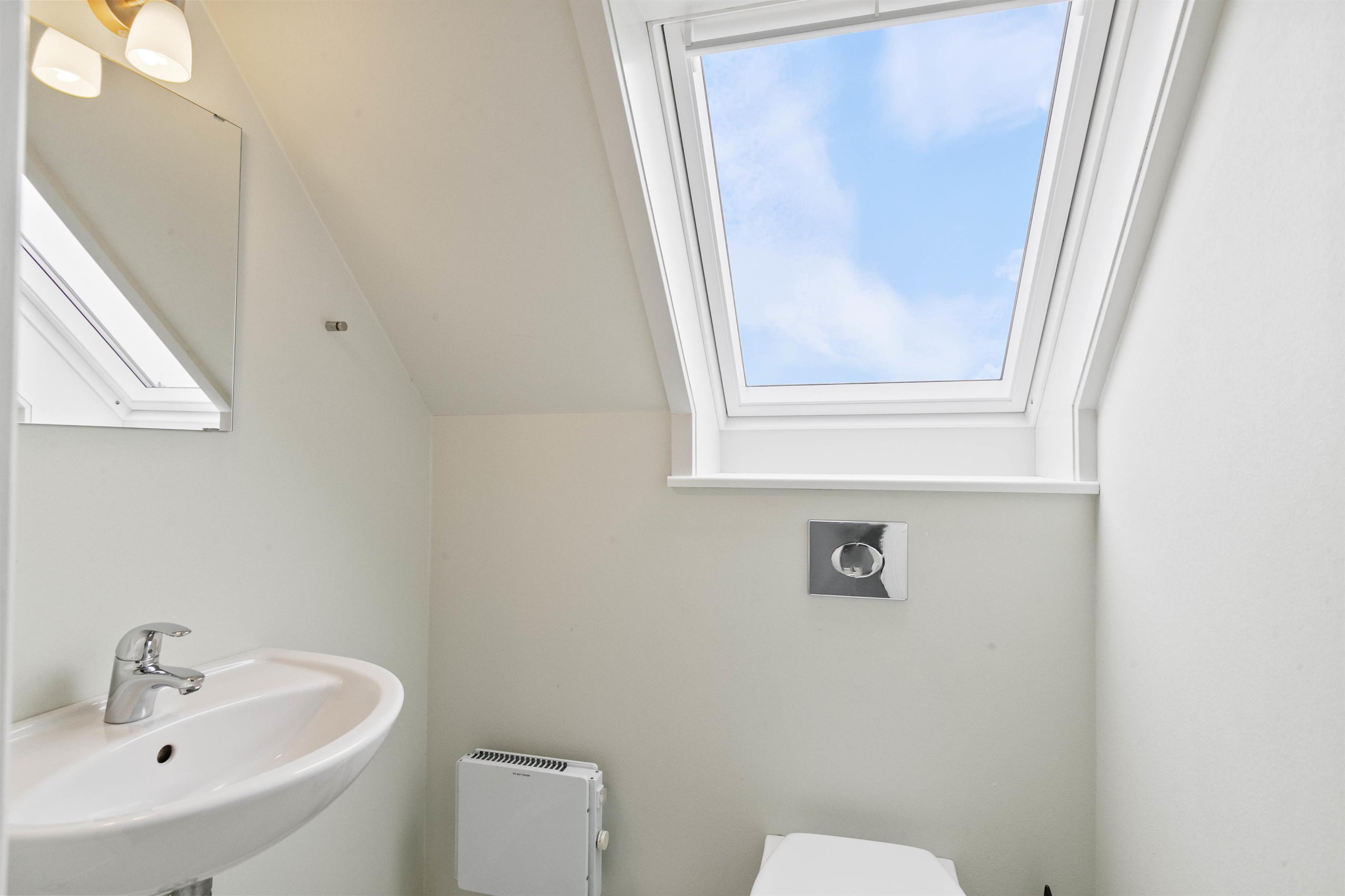 På 1. sal er der tre soverum og et gæstetoilet, mens badeværelset med gulvvarme og det fjerde soverum befinder sig i stueetagen.