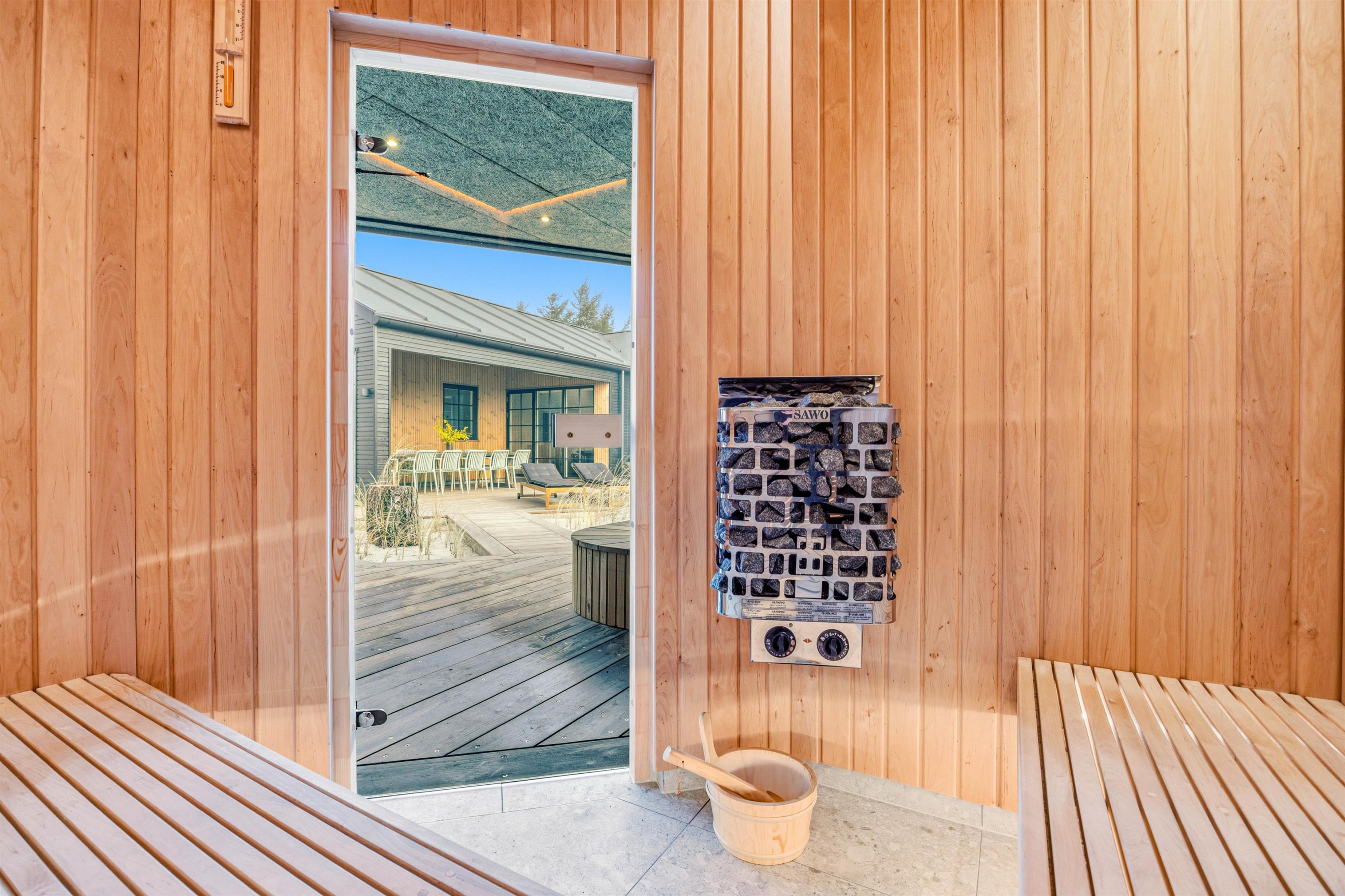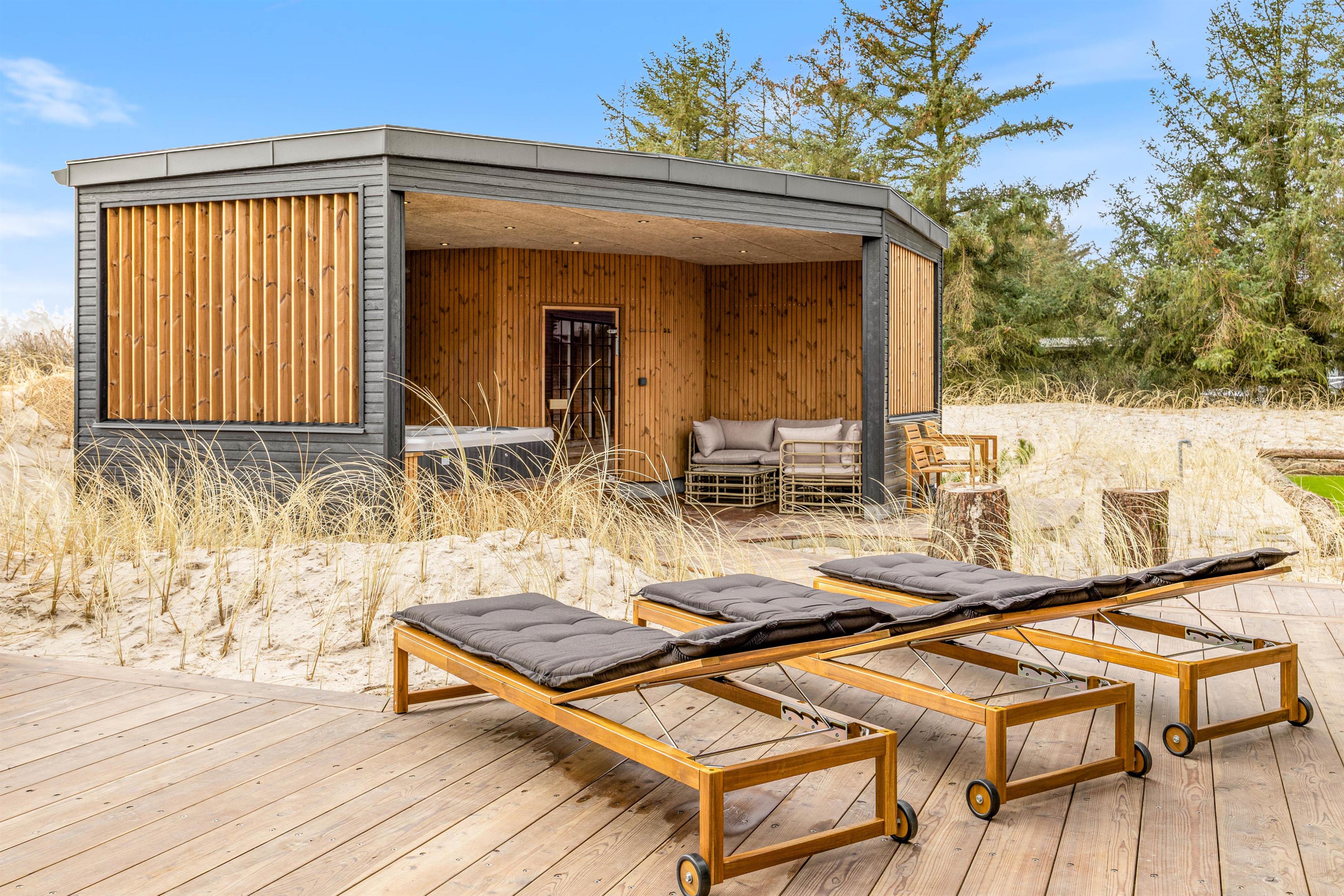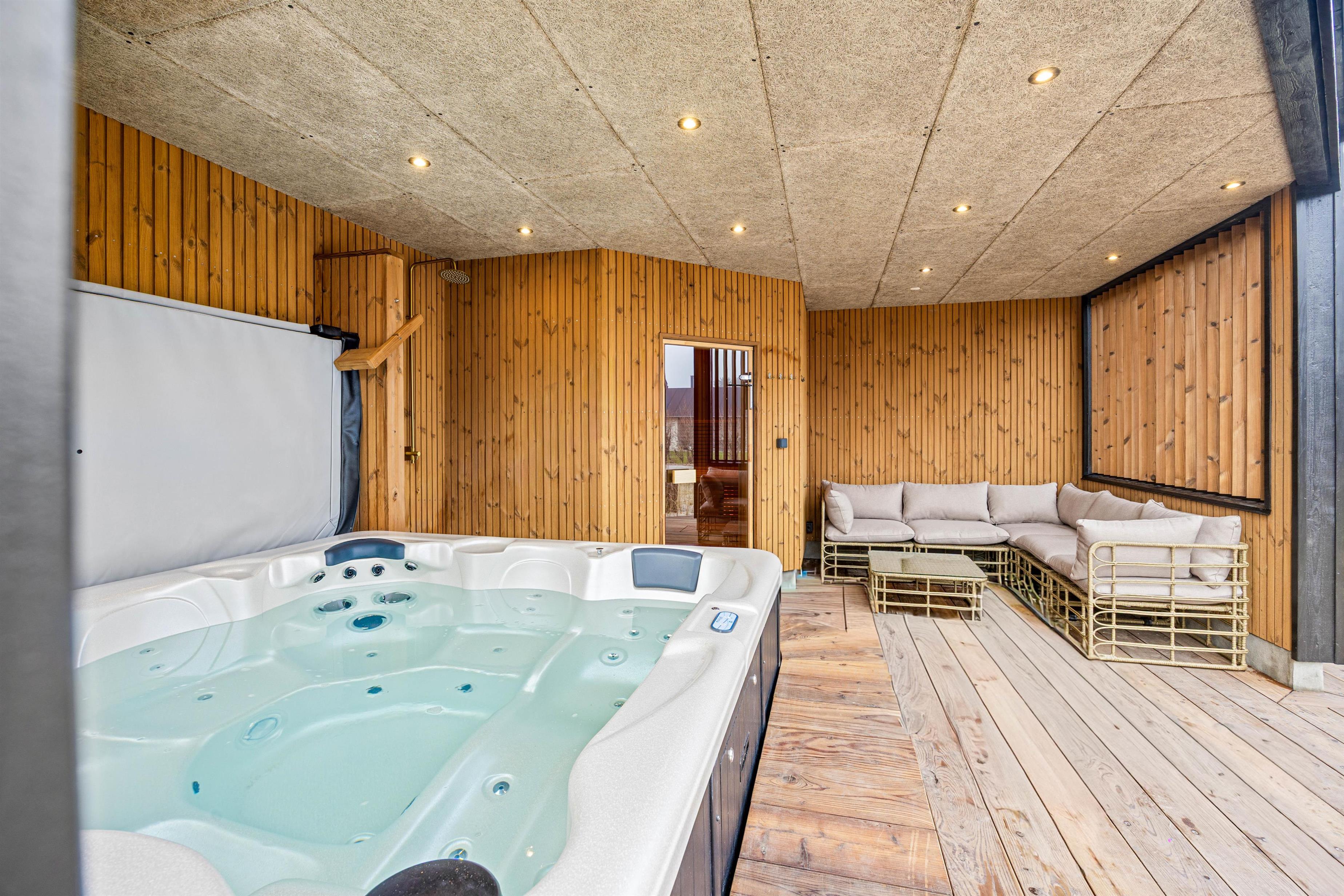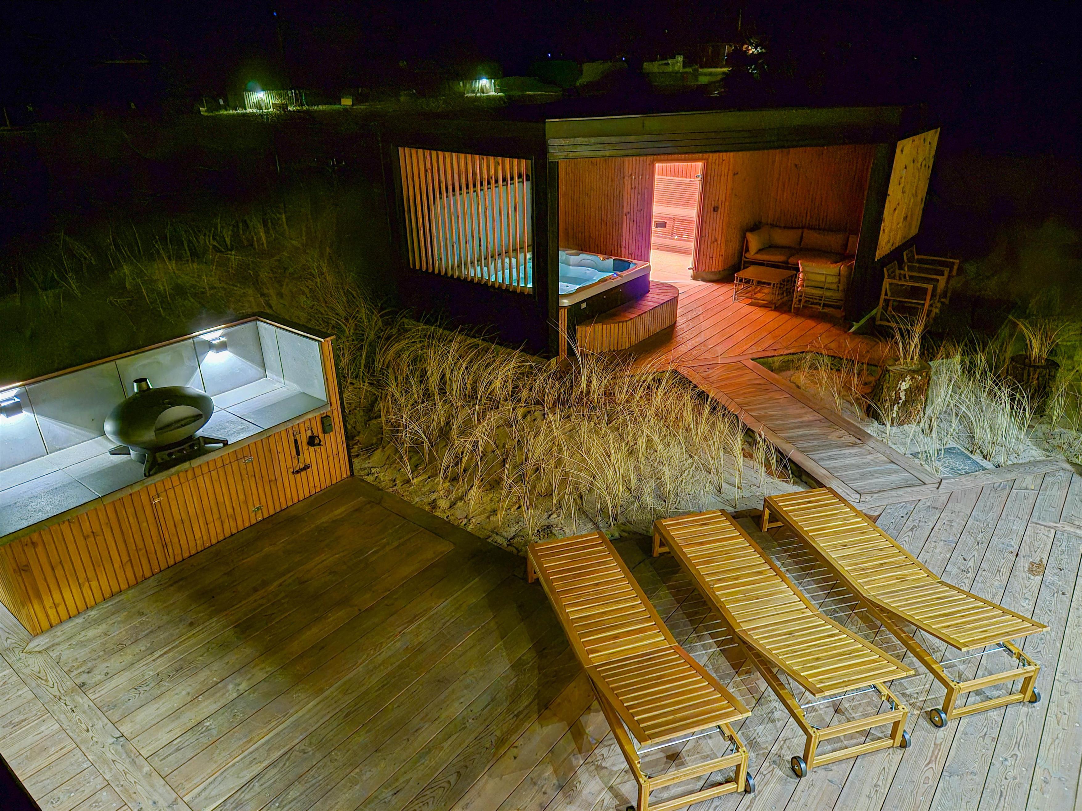 Et af sommerhusets højdepunkter finder I netop her på terrassen: en skøn udespa og en udesauna. Her kan I nyde lidt ekstra velvære – og uanset årstiden, er det skønt at sidde i spaen med noget koldt at drikke, mens I nyder stjernehimlen.