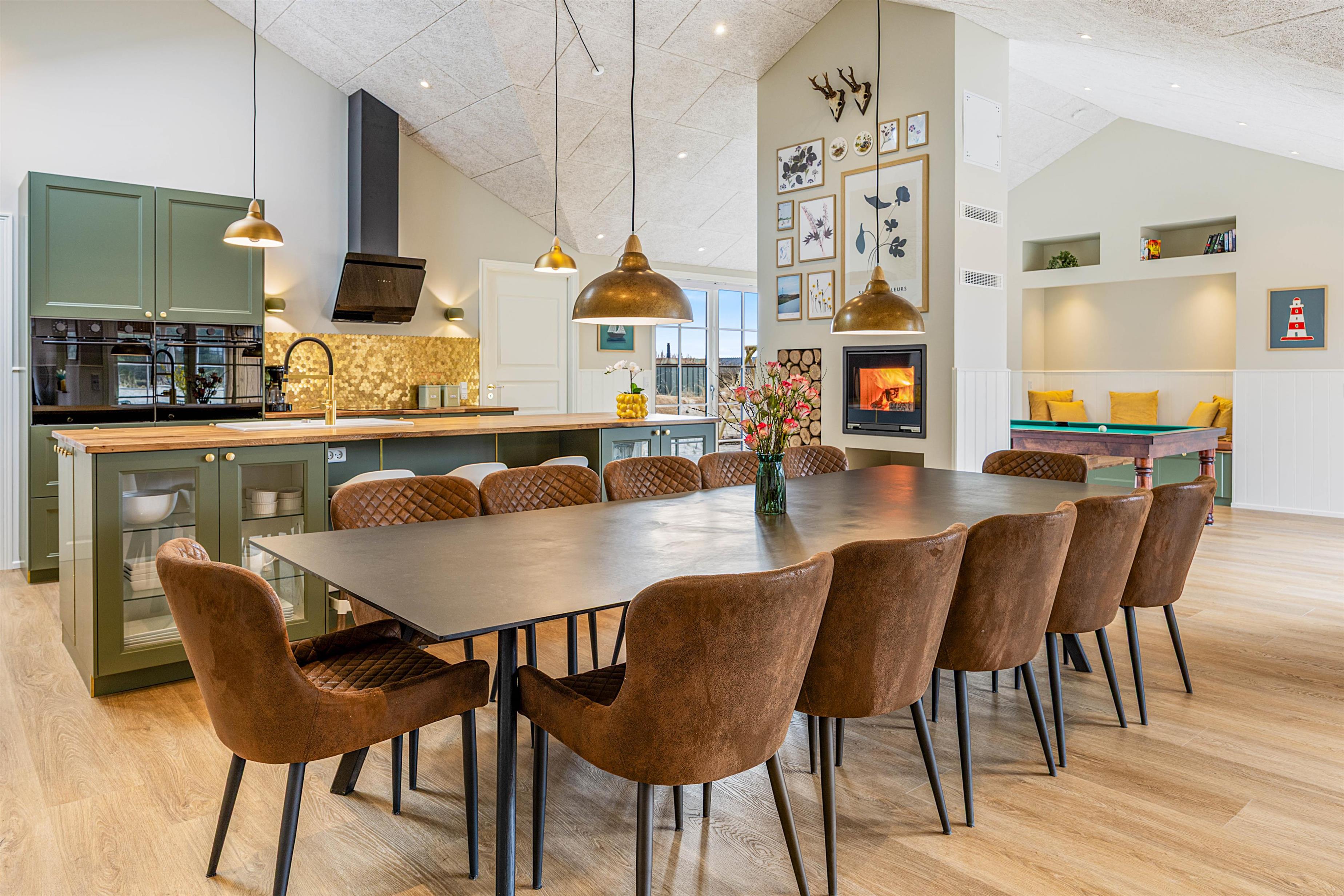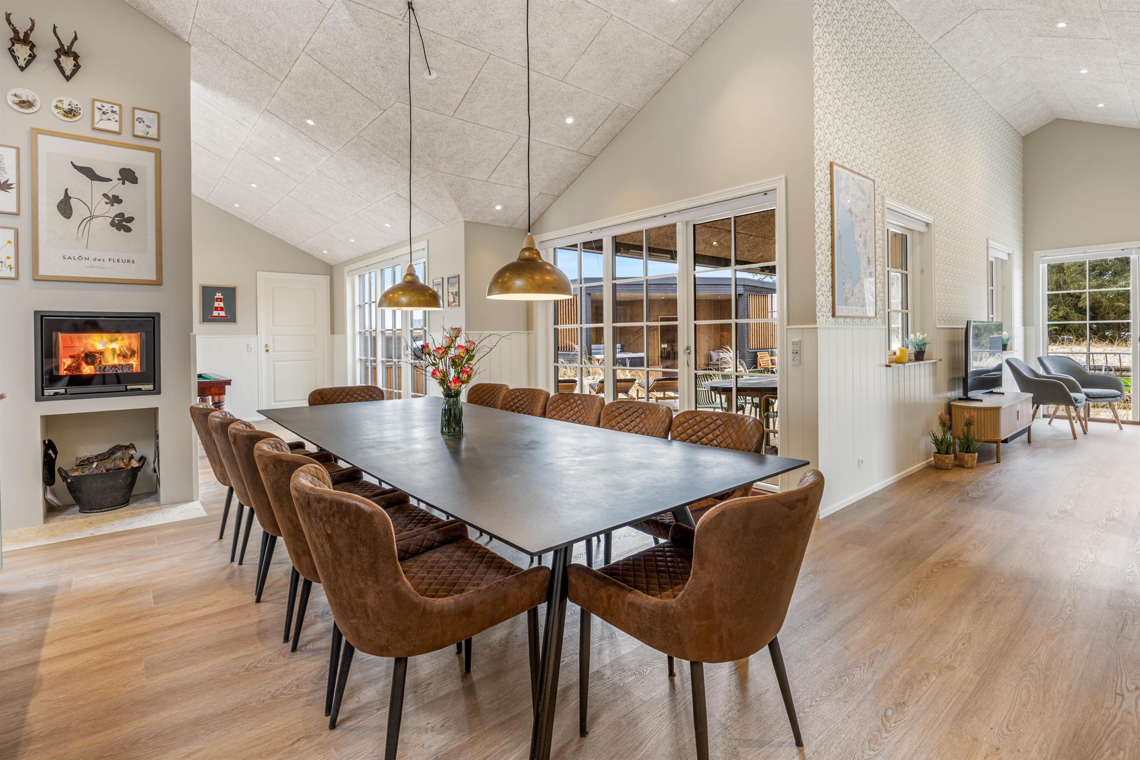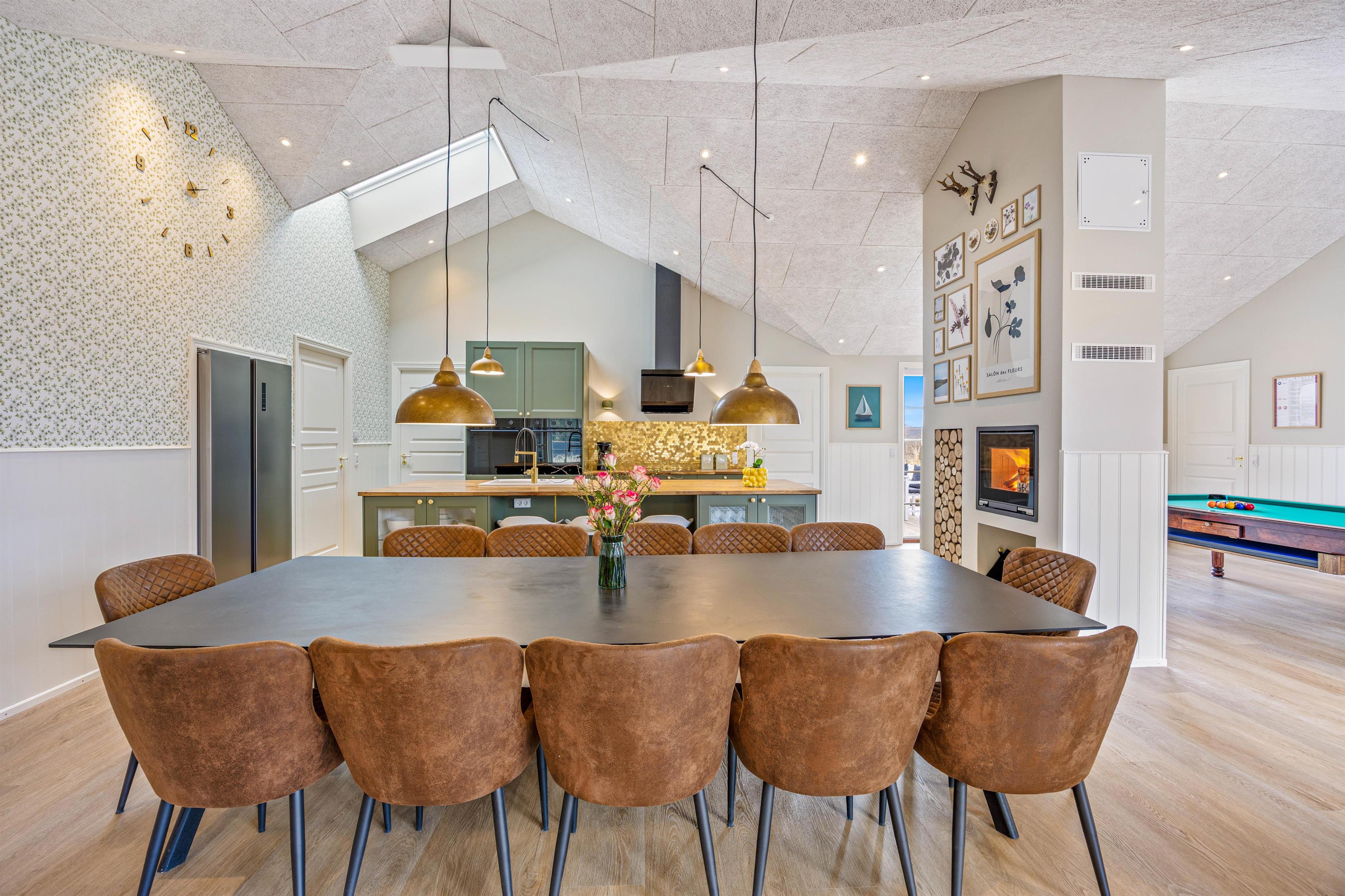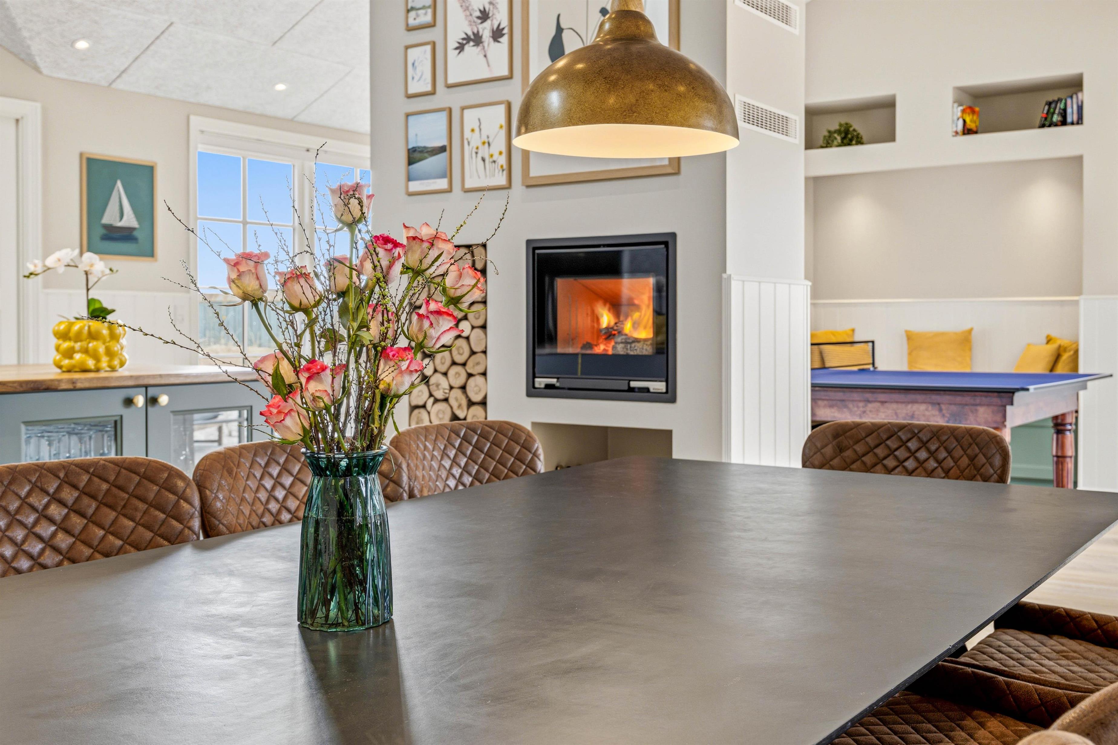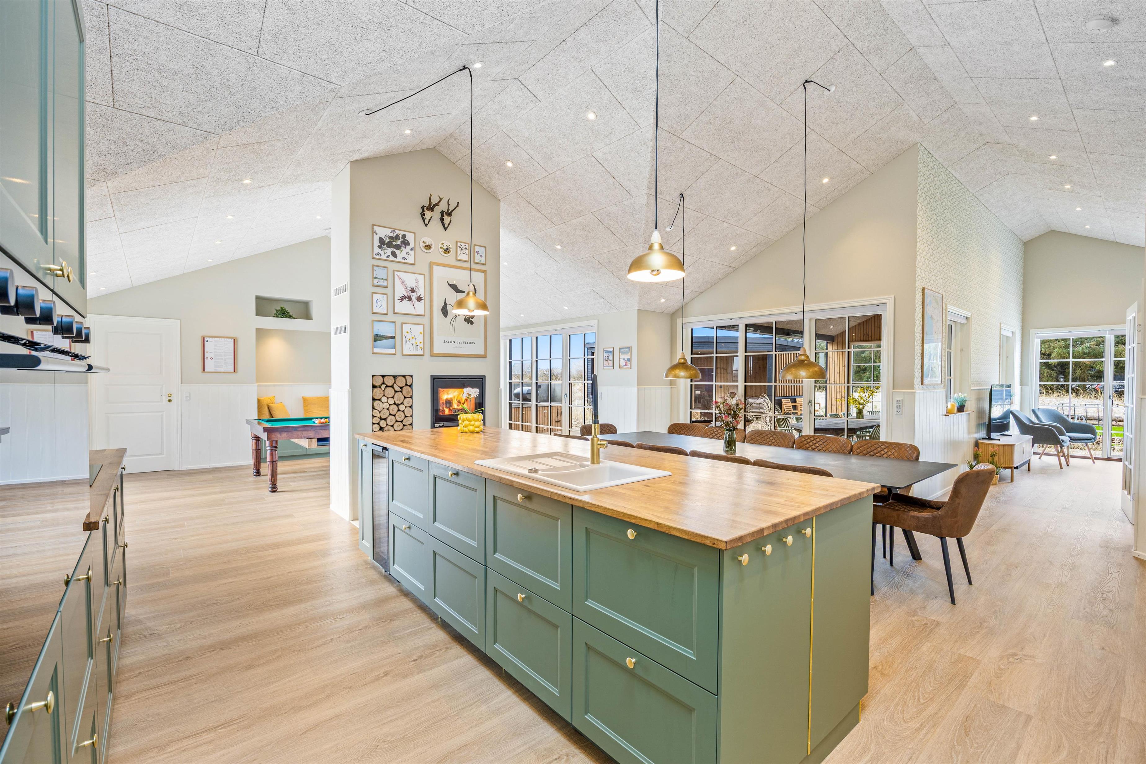 I sommerhuset er der også skabt et dejligt og åbent køkken-alrum, hvor der er lagt op til masser af samvær og hyggelige stunder med jeres medrejsende. I køkken-alrummet er der lyst og loft til kip, hvilket i samspil med de lækre materialer, skaber et rum med en fantastisk atmosfære, hvor I kan føle jer tilpas og komme helt ned i gear. Hvis I ønsker at skrue lidt ekstra op for hyggen, kan I tænde op i brændeovnen, som altid skaber en hyggelig og varm stemning.