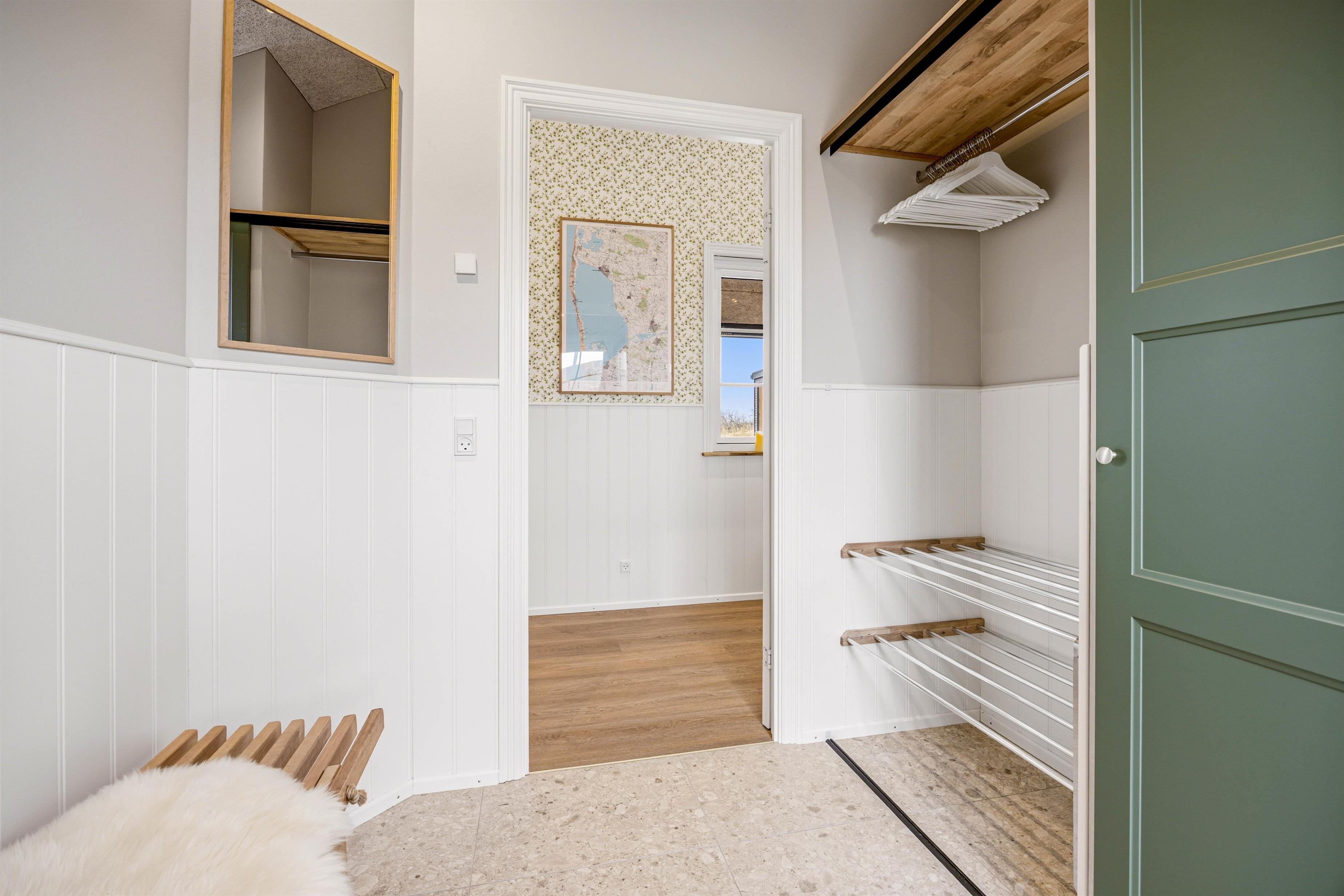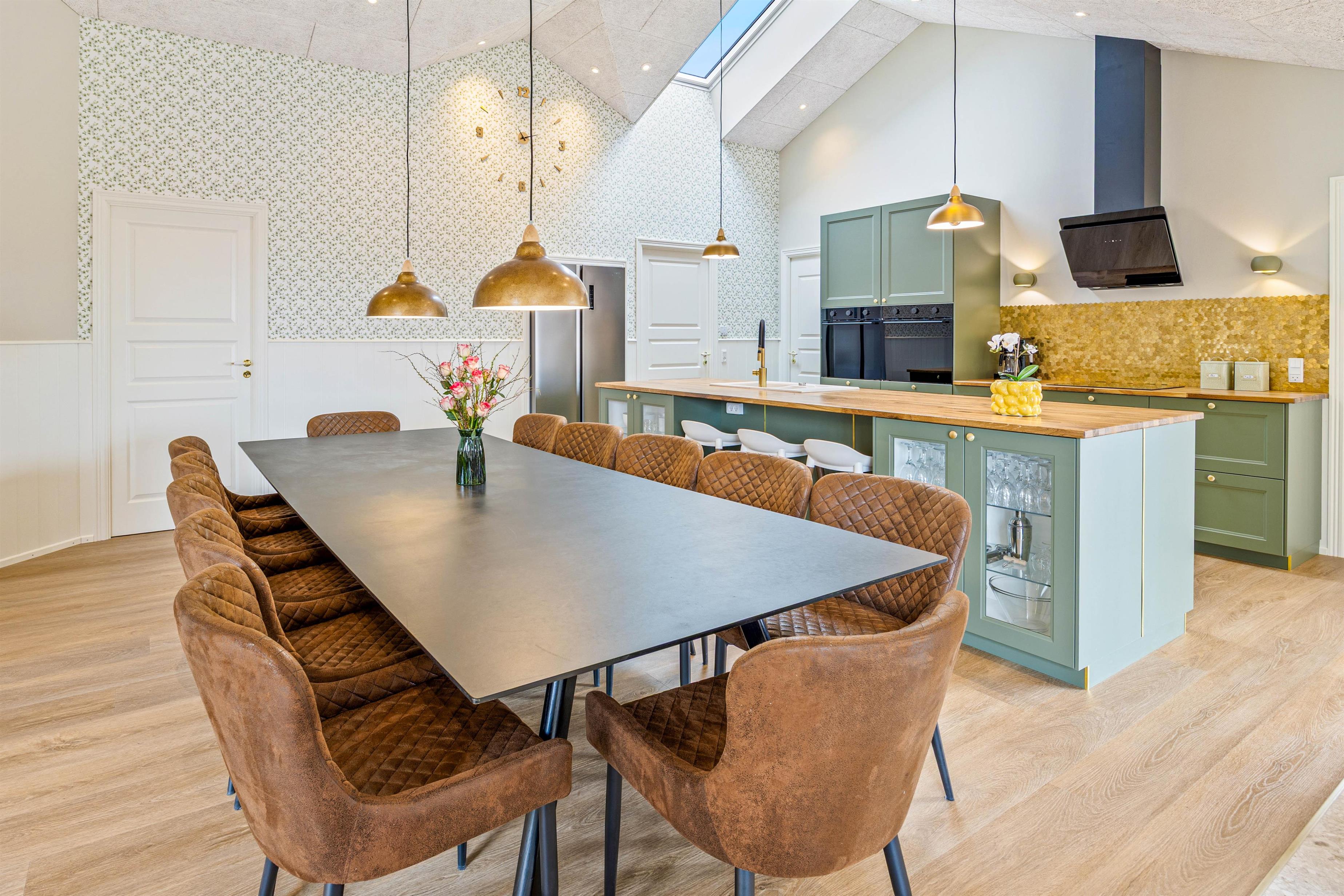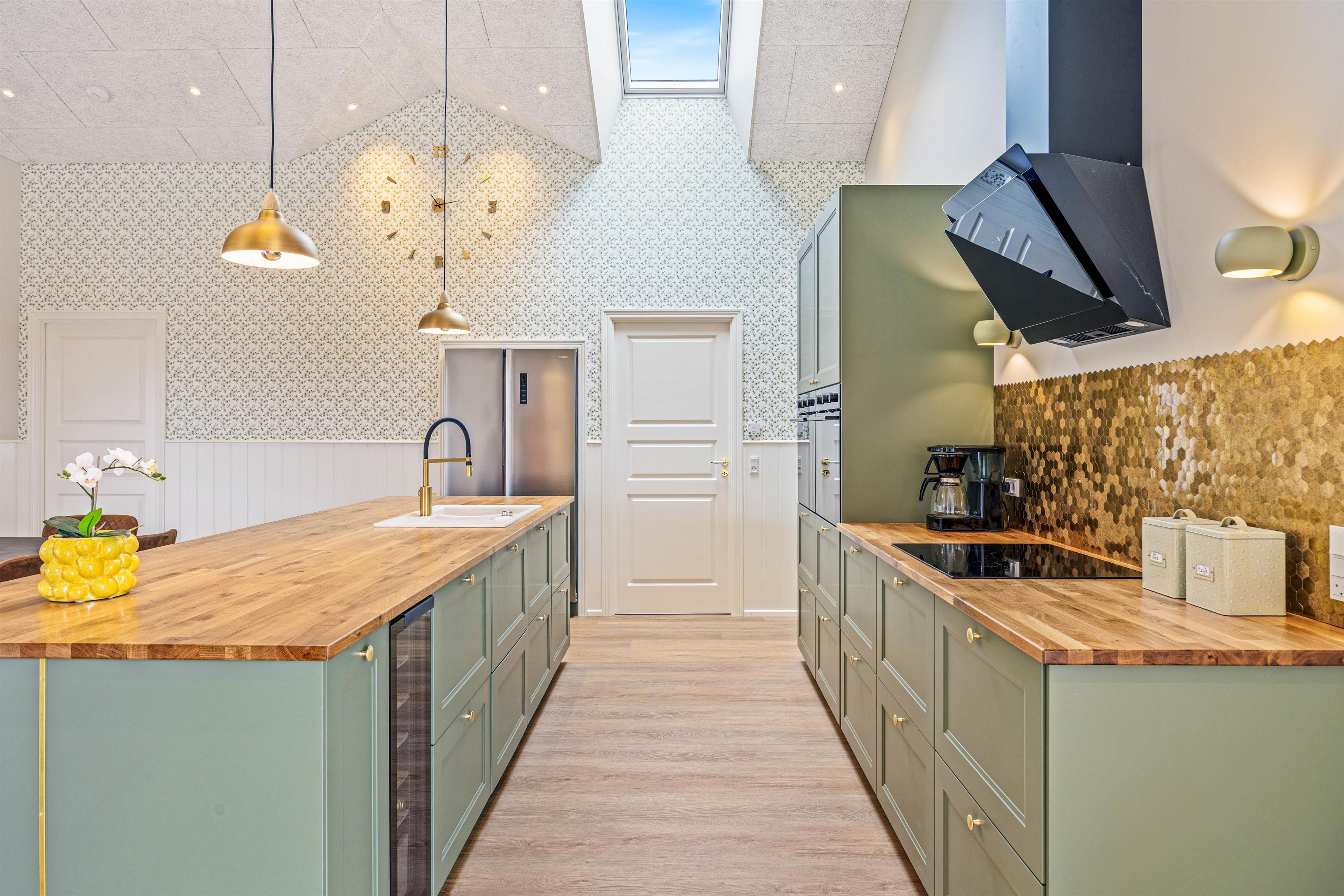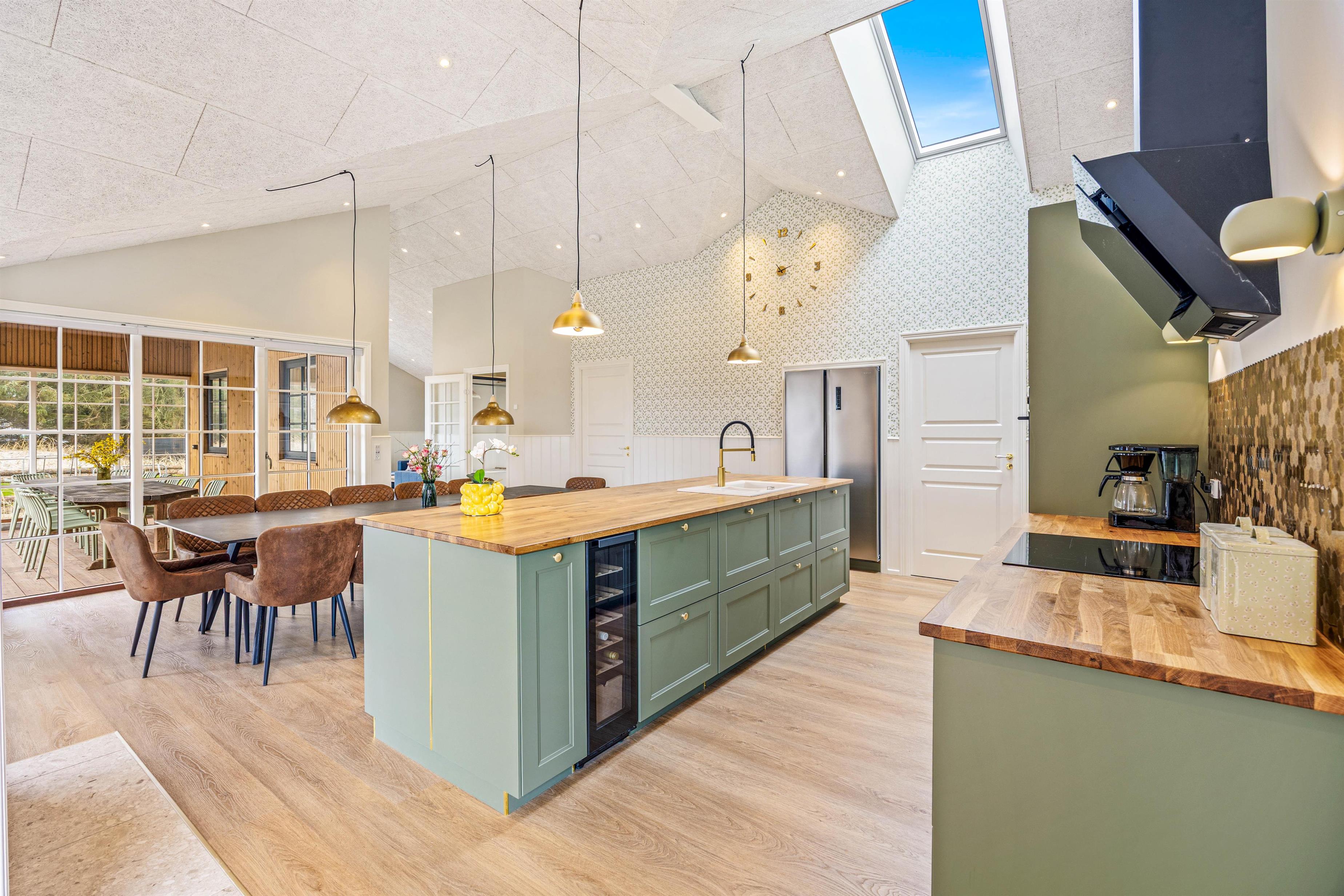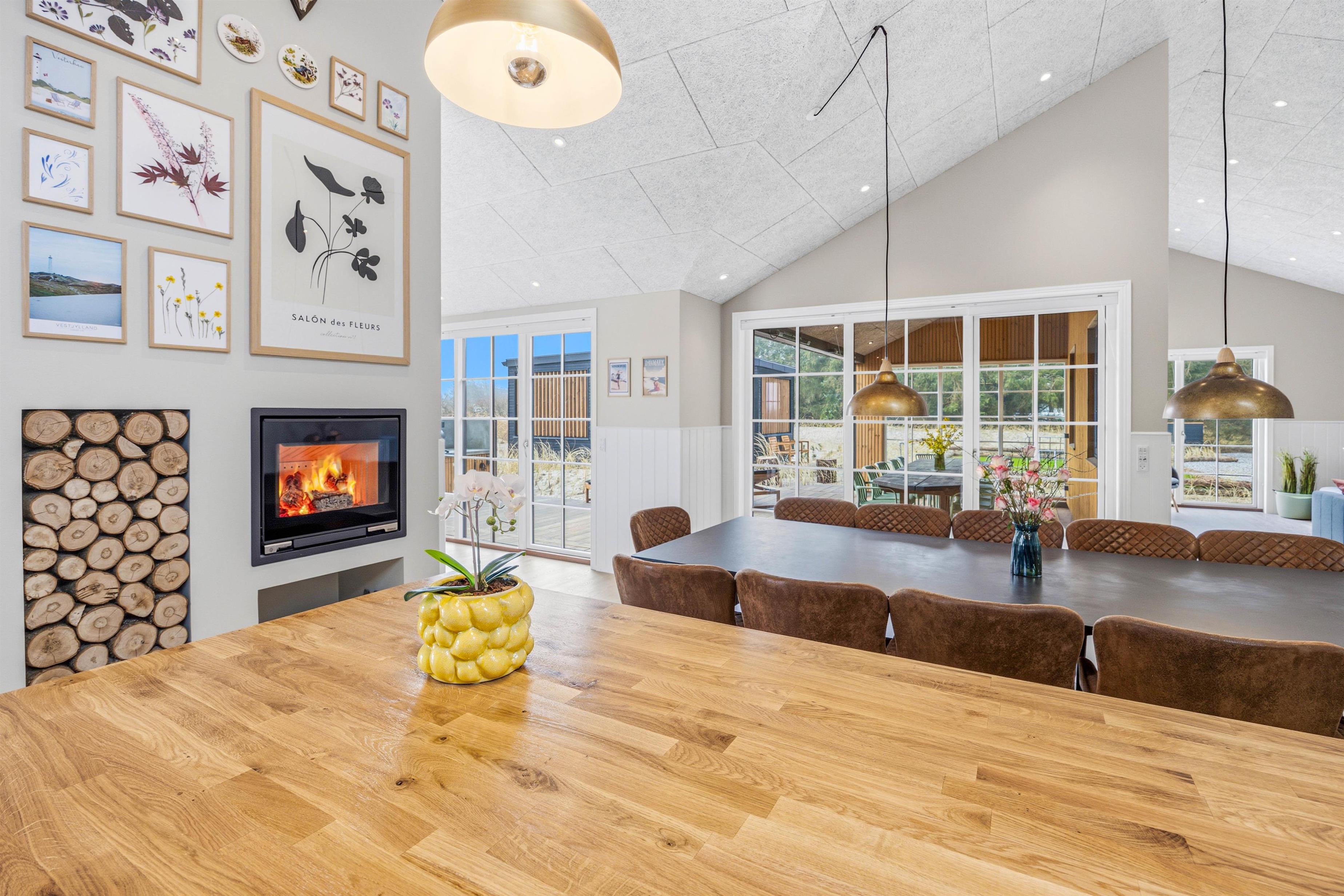 I sommerhuset er der også skabt et dejligt og åbent køkken-alrum, hvor der er lagt op til masser af samvær og hyggelige stunder med jeres medrejsende. I køkken-alrummet er der lyst og loft til kip, hvilket i samspil med de lækre materialer, skaber et rum med en fantastisk atmosfære, hvor I kan føle jer tilpas og komme helt ned i gear. Hvis I ønsker at skrue lidt ekstra op for hyggen, kan I tænde op i brændeovnen, som altid skaber en hyggelig og varm stemning.