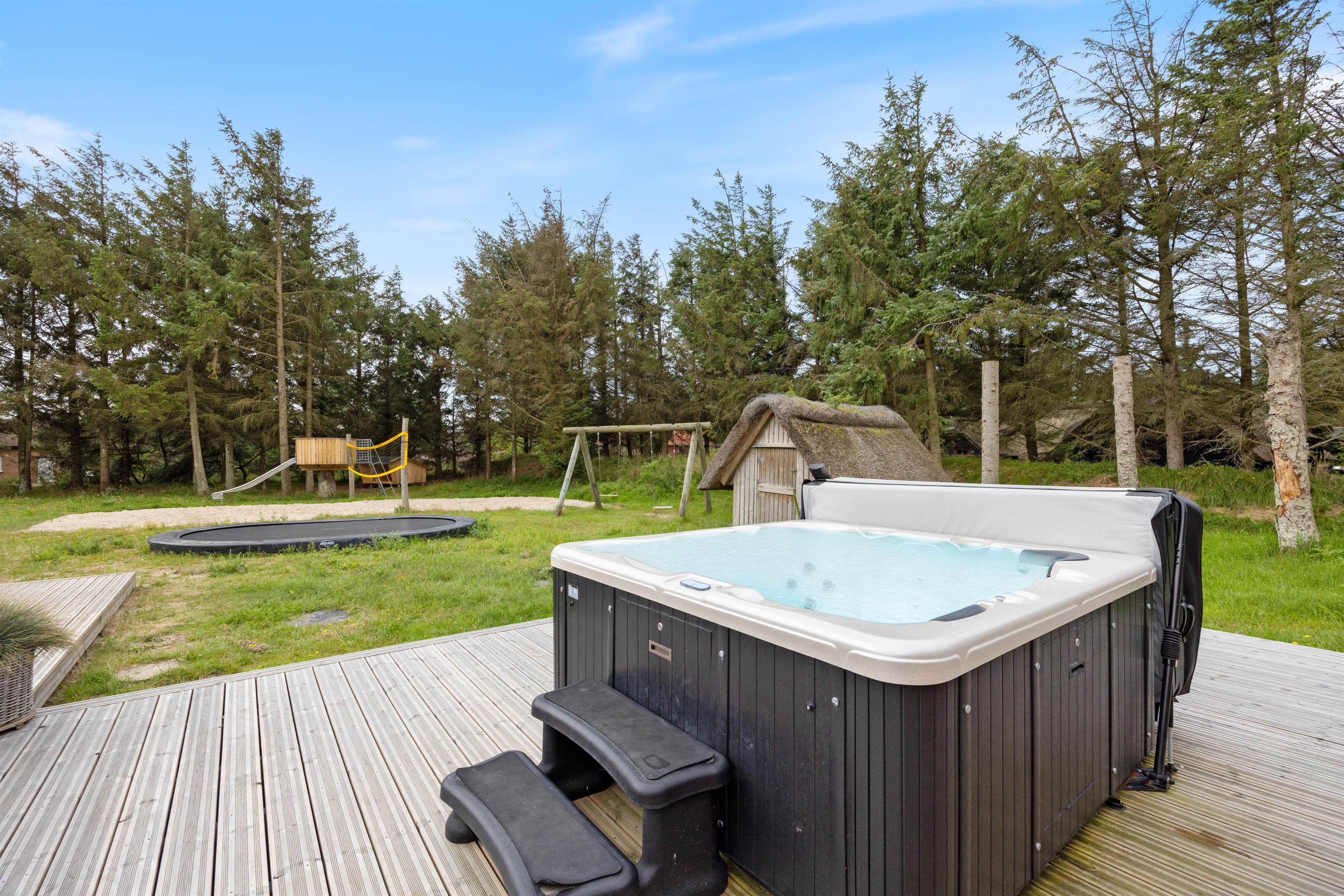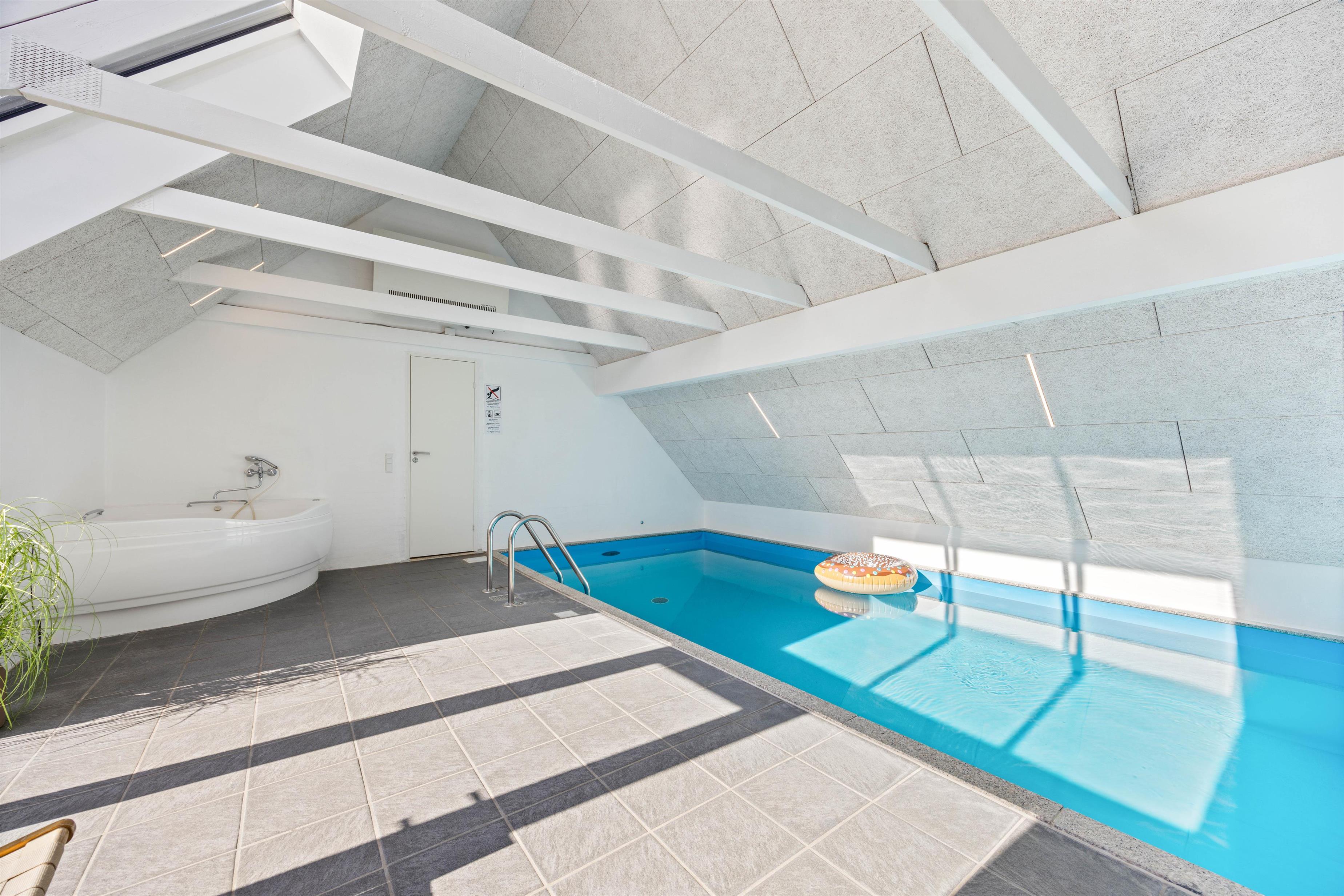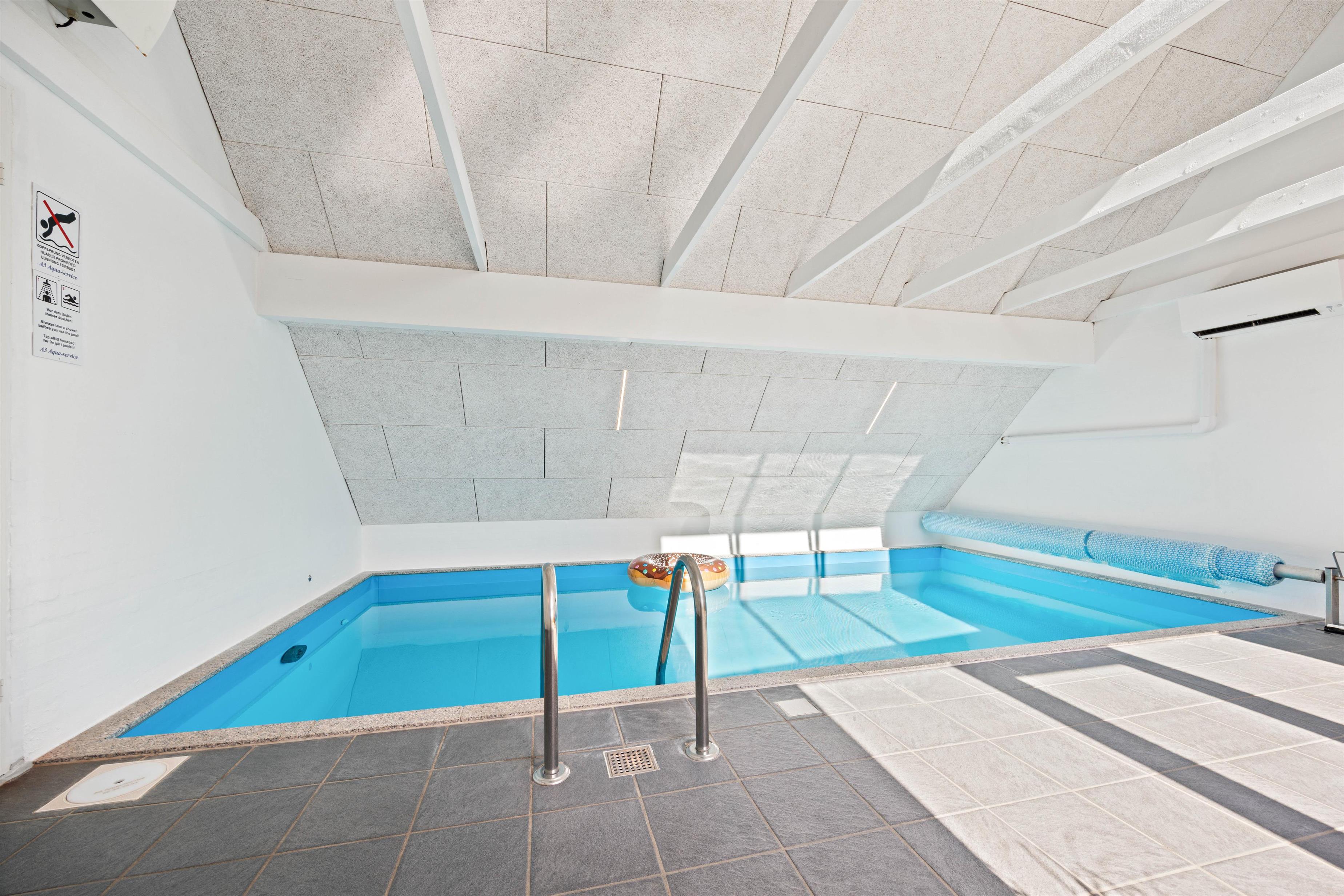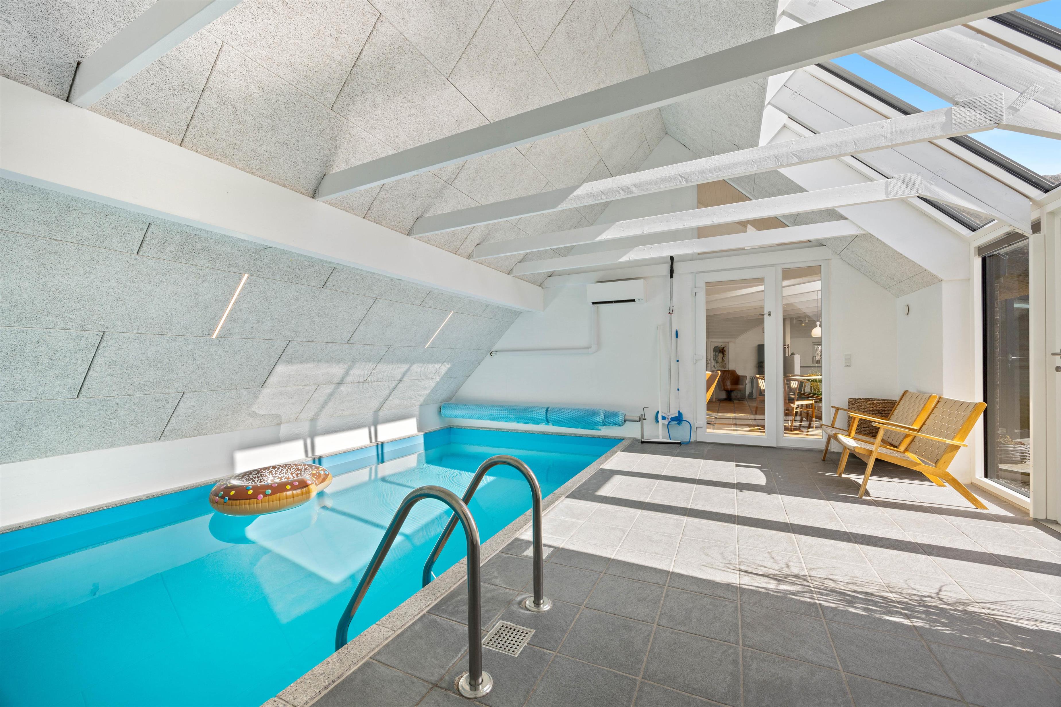Sommerhusets store højdepunkt er den 18 kvadratmeter saltvandspool med modstrømsanlæg og energivenlig varmepumpe, som holder strømforbruget nede og vandtemperaturen behagelig året rundt. Vandkvaliteten overvåges automatisk døgnet rundt, så forholdene altid er optimale.