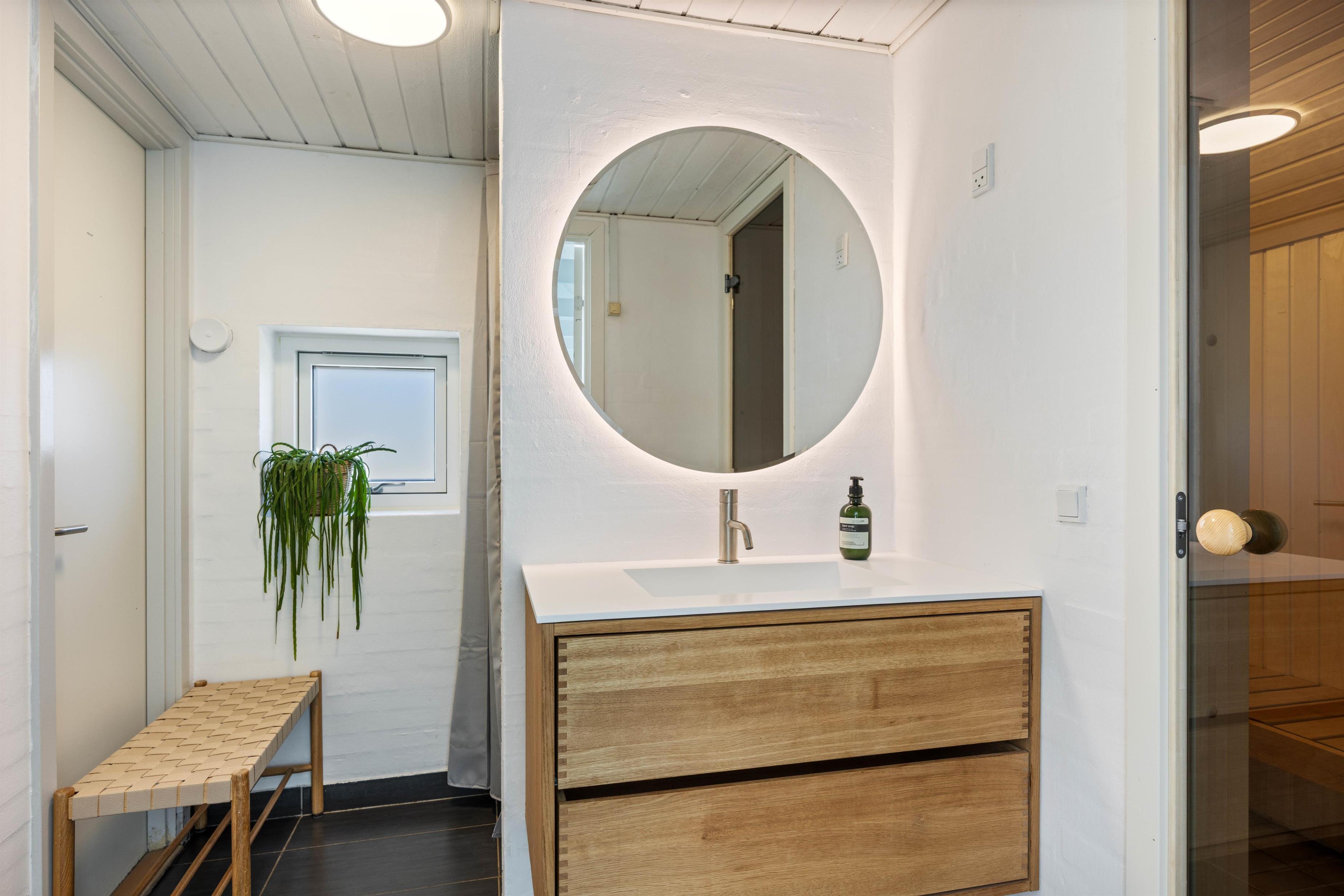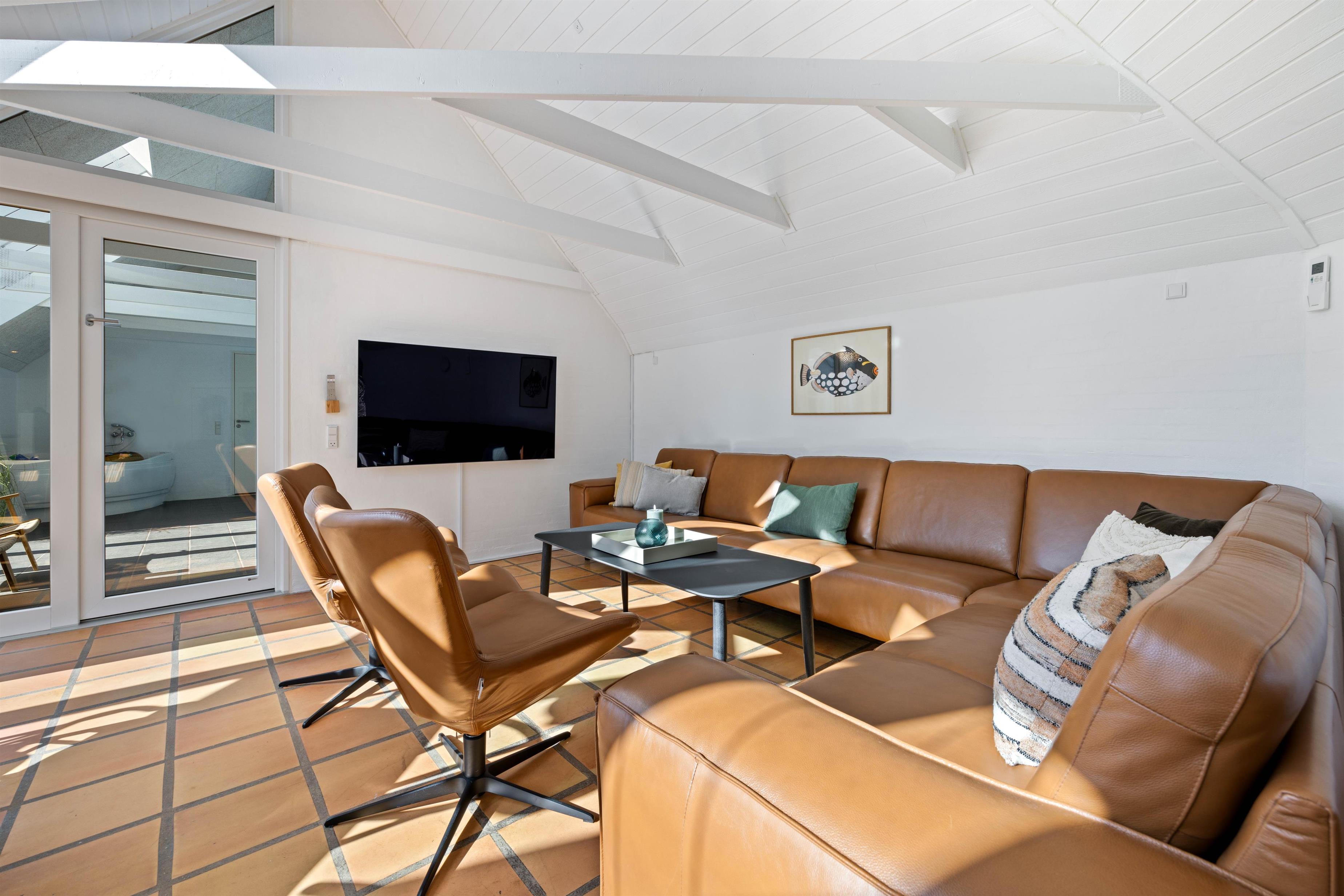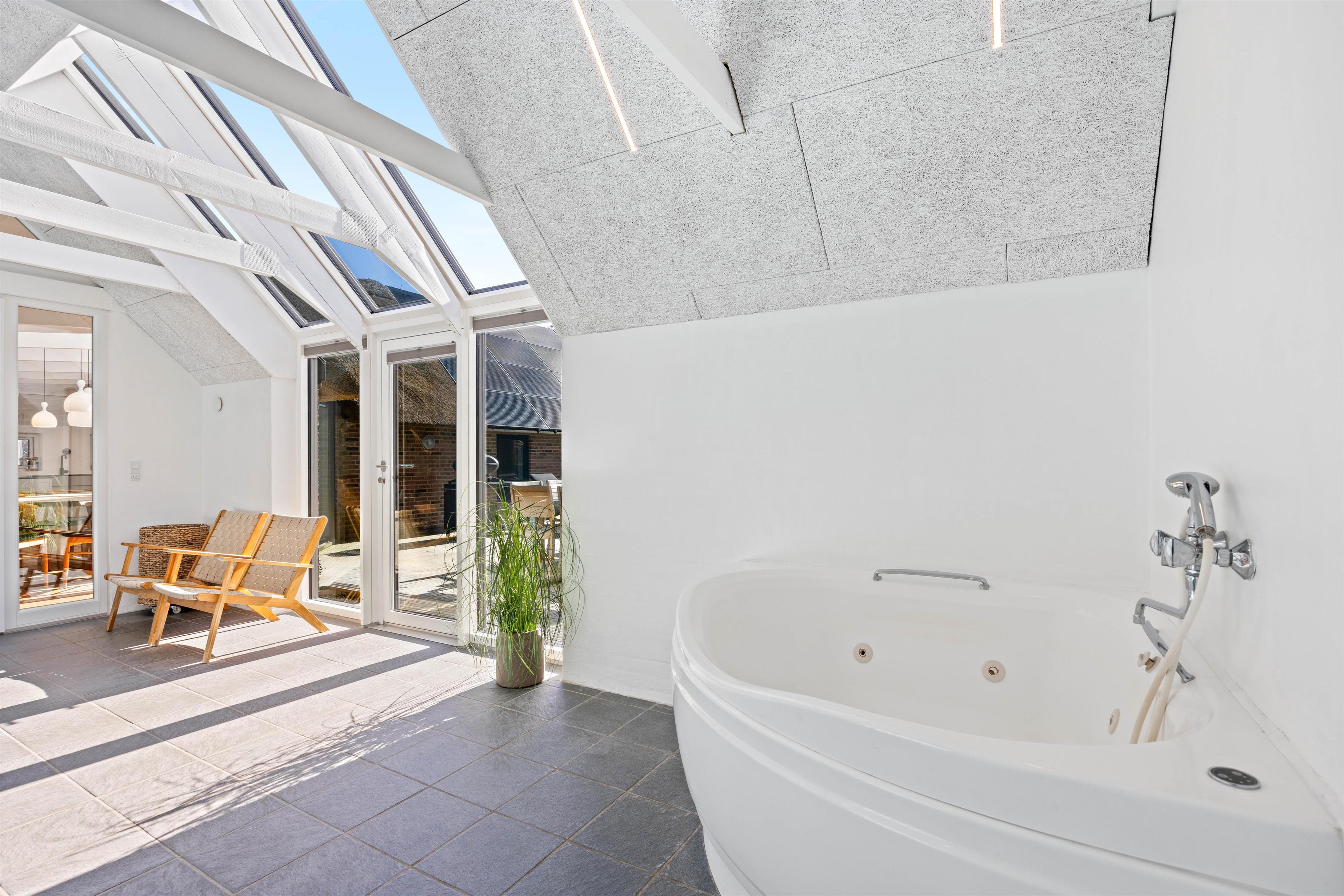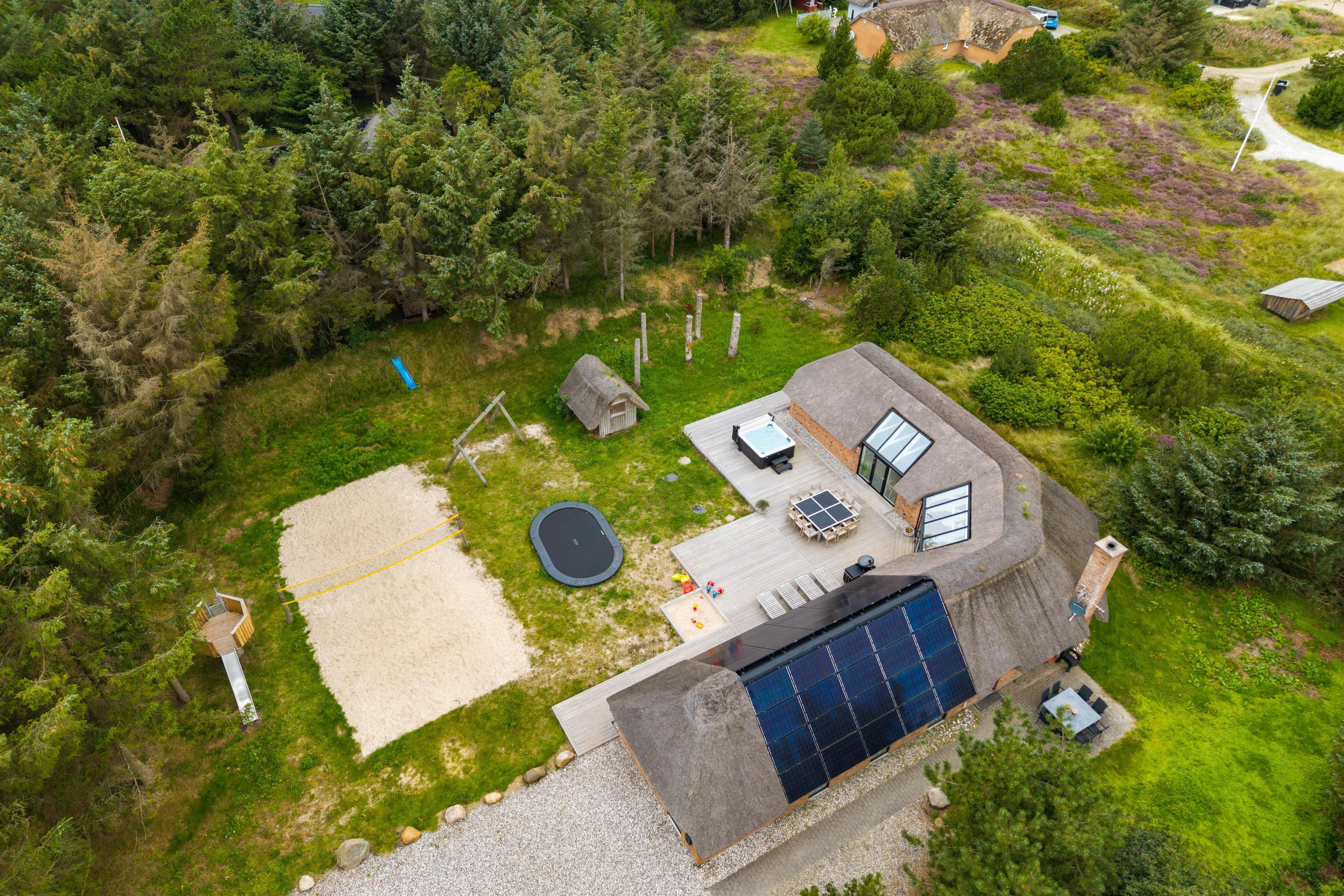 Sommerhusets store højdepunkt er den 18 kvadratmeter saltvandspool med modstrømsanlæg og energivenlig varmepumpe, som holder strømforbruget nede og vandtemperaturen behagelig året rundt. Vandkvaliteten overvåges automatisk døgnet rundt, så forholdene altid er optimale.