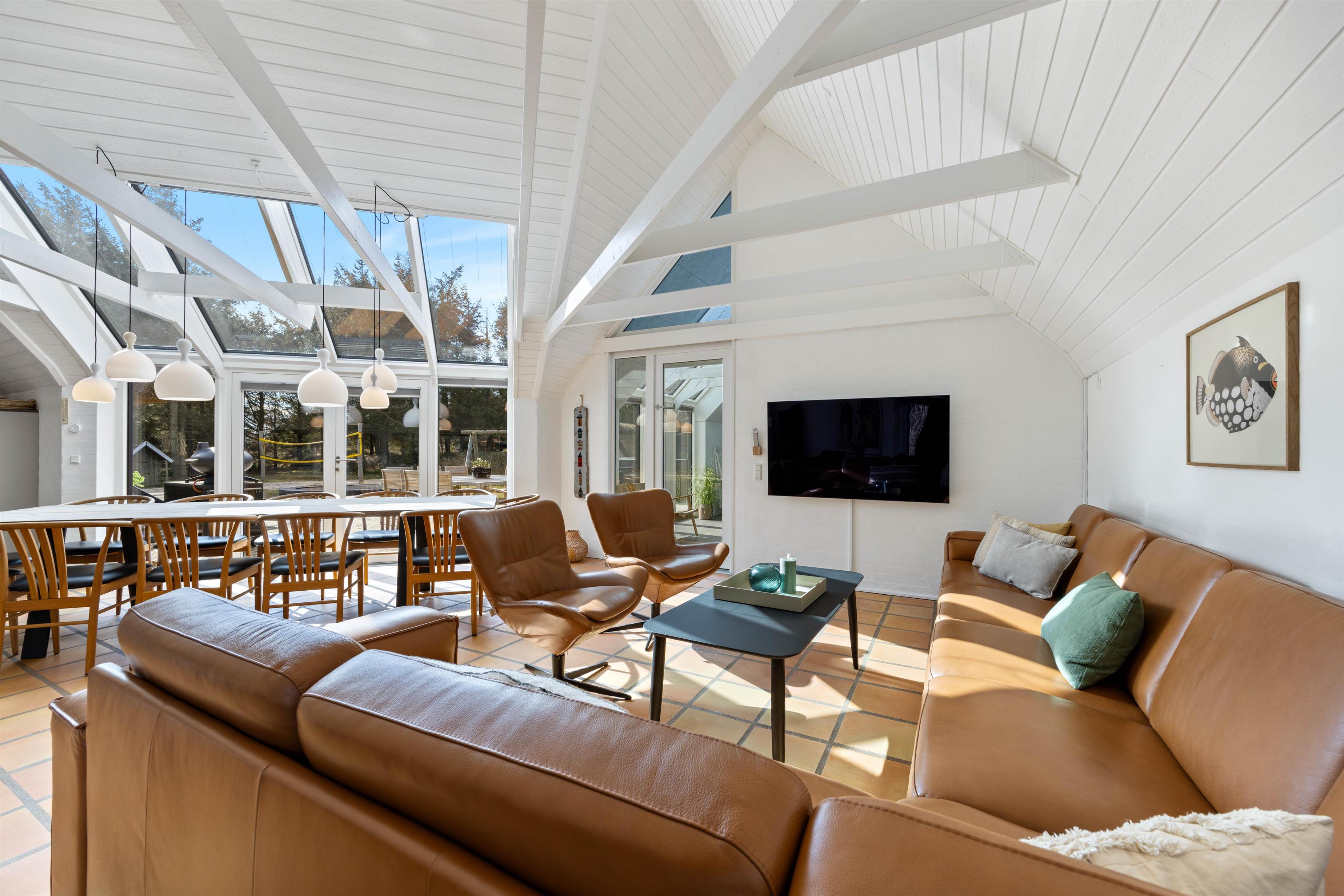 Det moderne køkken er fuldt udstyret med to indbygningsovne, induktionskomfur, stort køleskab, fryser og opvaskemaskine, mens stuen byder på komfortable møbler og et 65” smart-TV med Chromecast til hyggelige aftener.