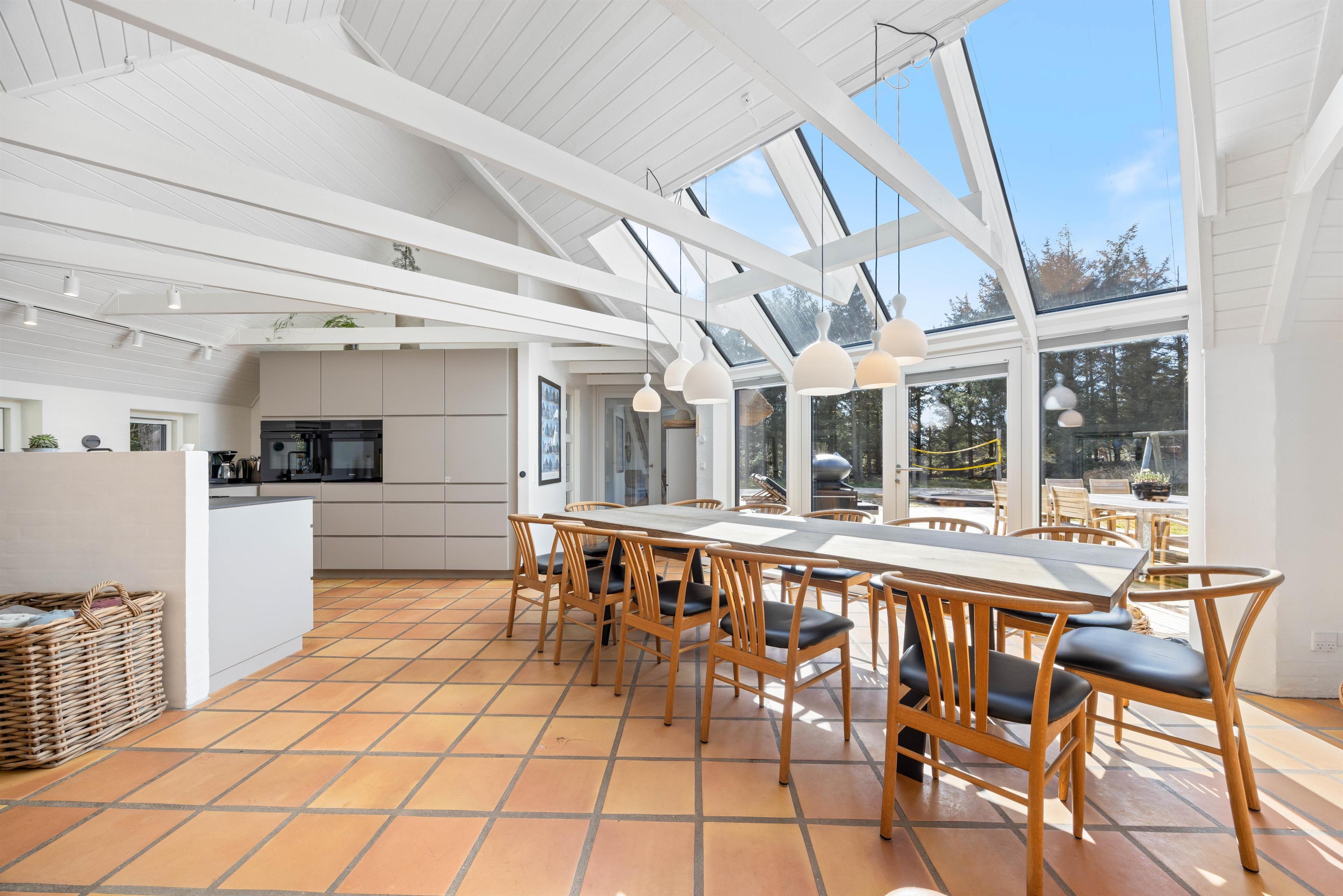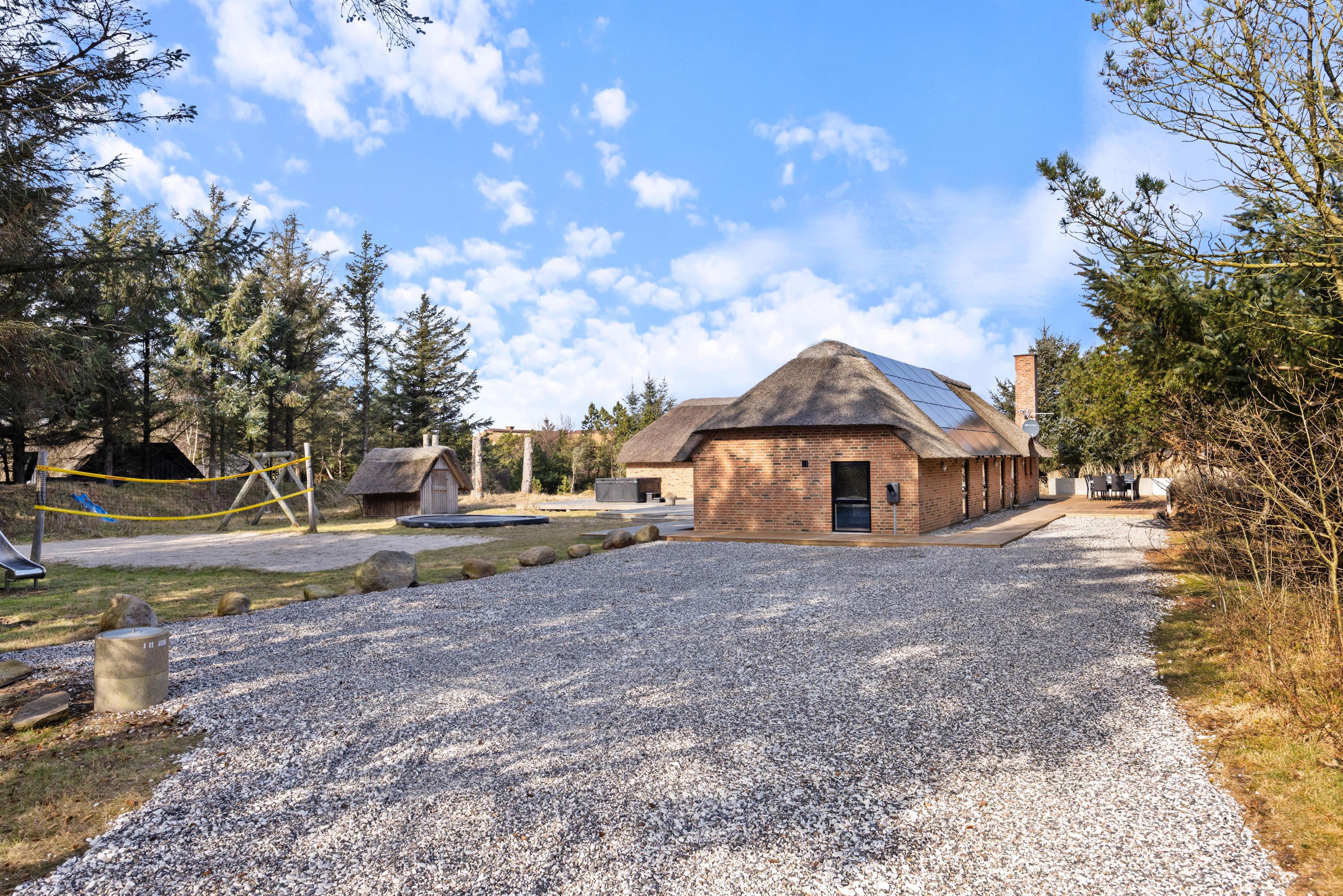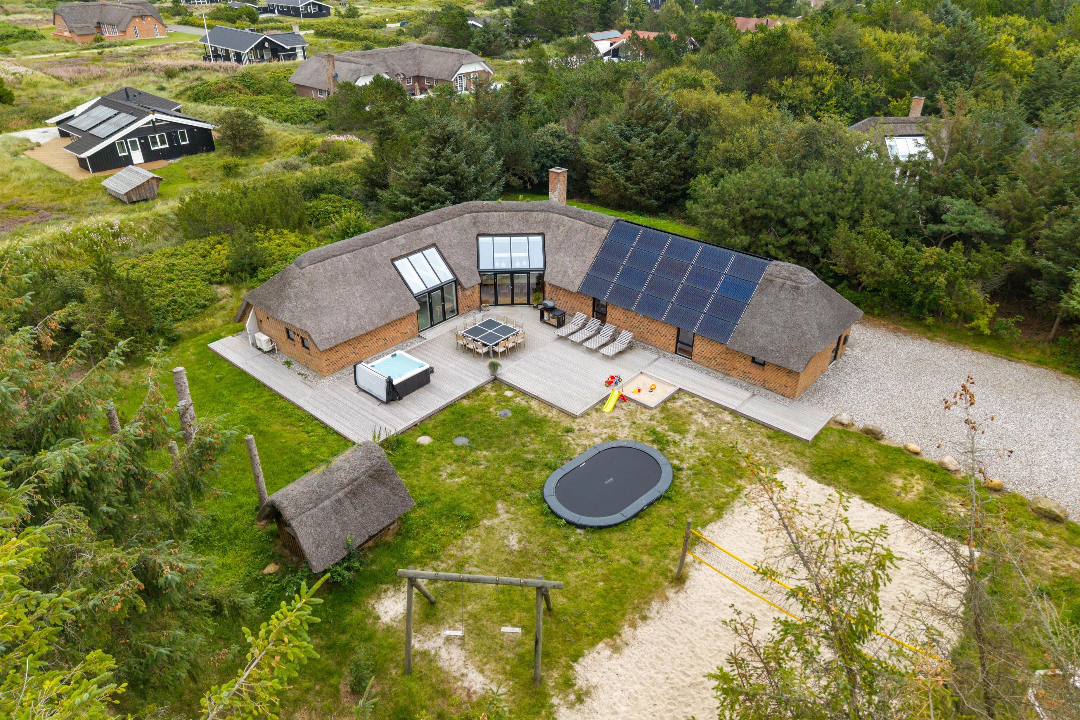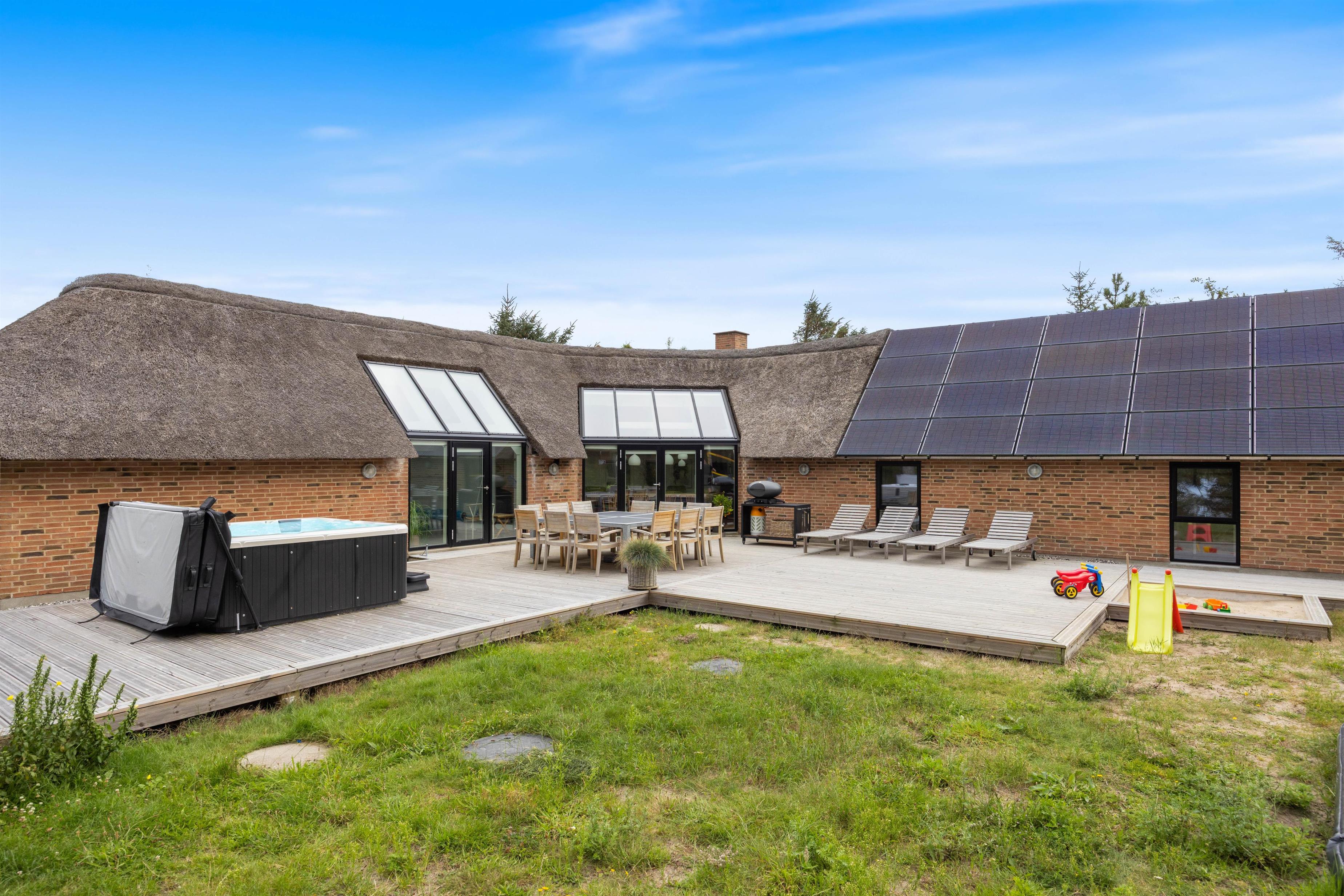 Velkommen til dette sommerhus på 220 kvadratmeter, beliggende på en fredelig 2.500 kvadratmeter stor naturgrund for enden af en stille vej. Huset er stråtækt, totalrenoveret i 2024 og indrettet med alt, hvad I behøver til en uforglemmelig ferie. Her er der plads til op til 12 personer og 2 kæledyr, og I kan se frem til masser af komfort og afslapning. Med brændeovn, gode faciliteter og mulighed for opladning af elbil direkte ved huset er rammerne sat for en ferie, I sent vil glemme.